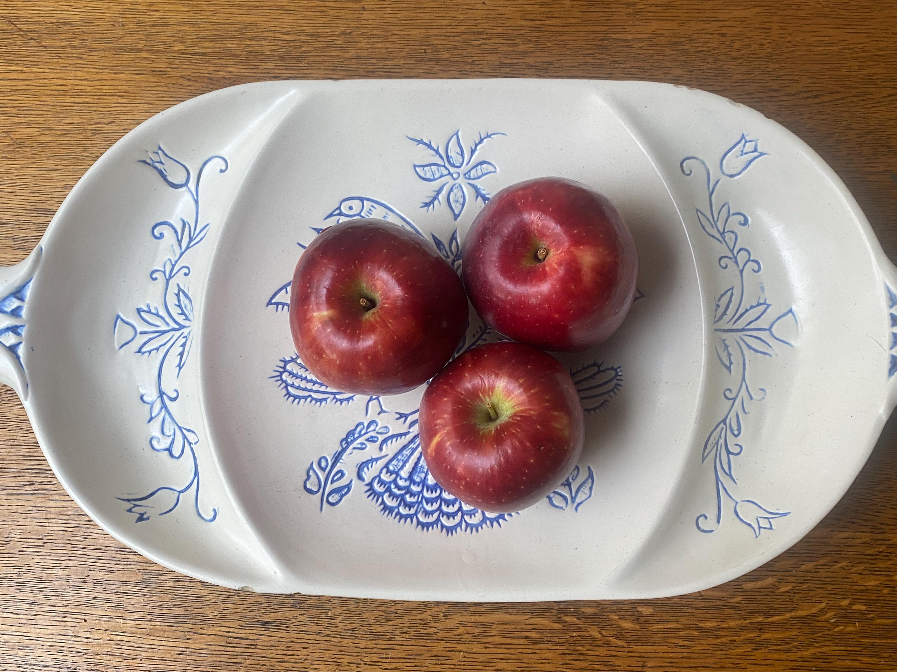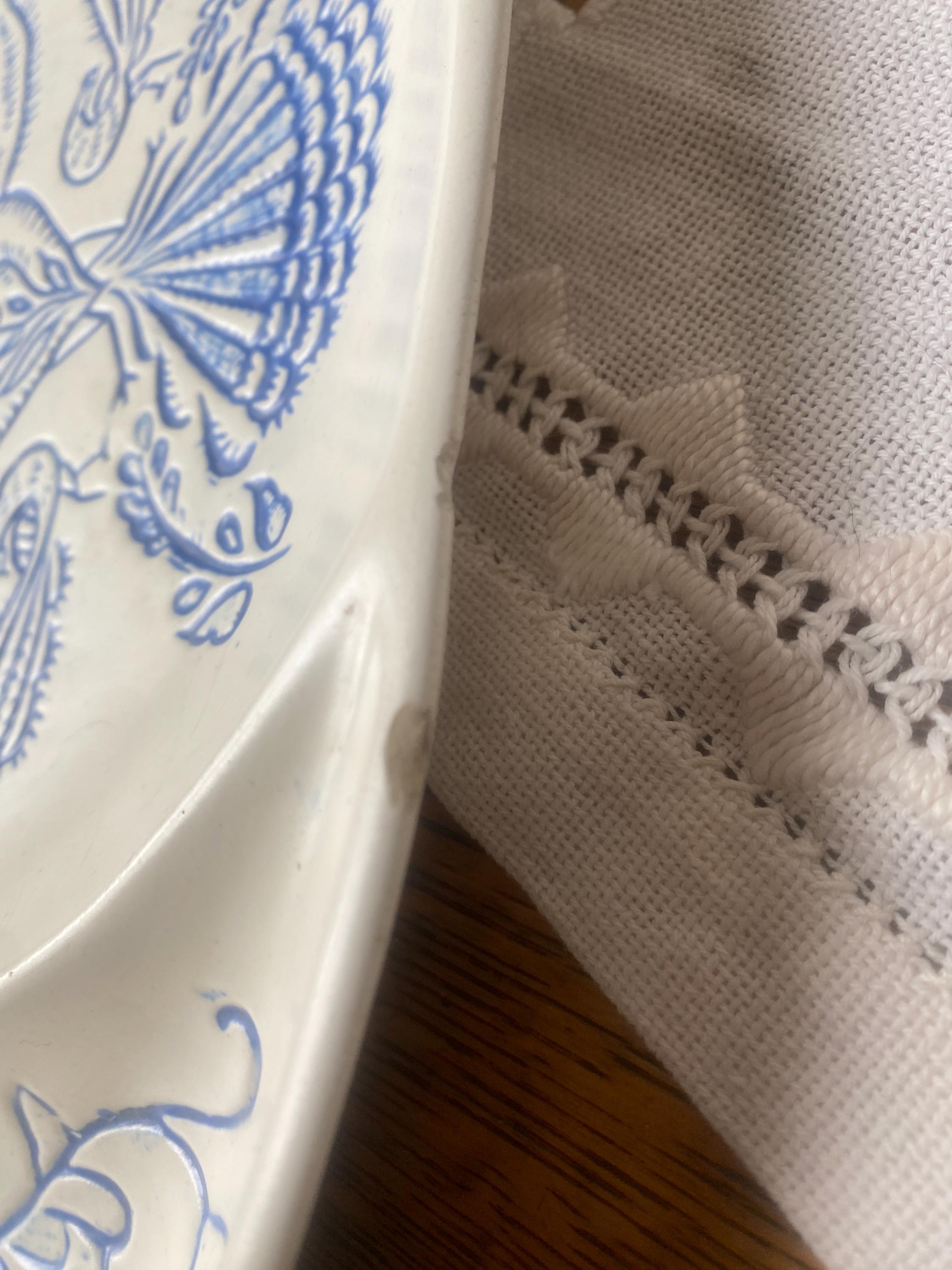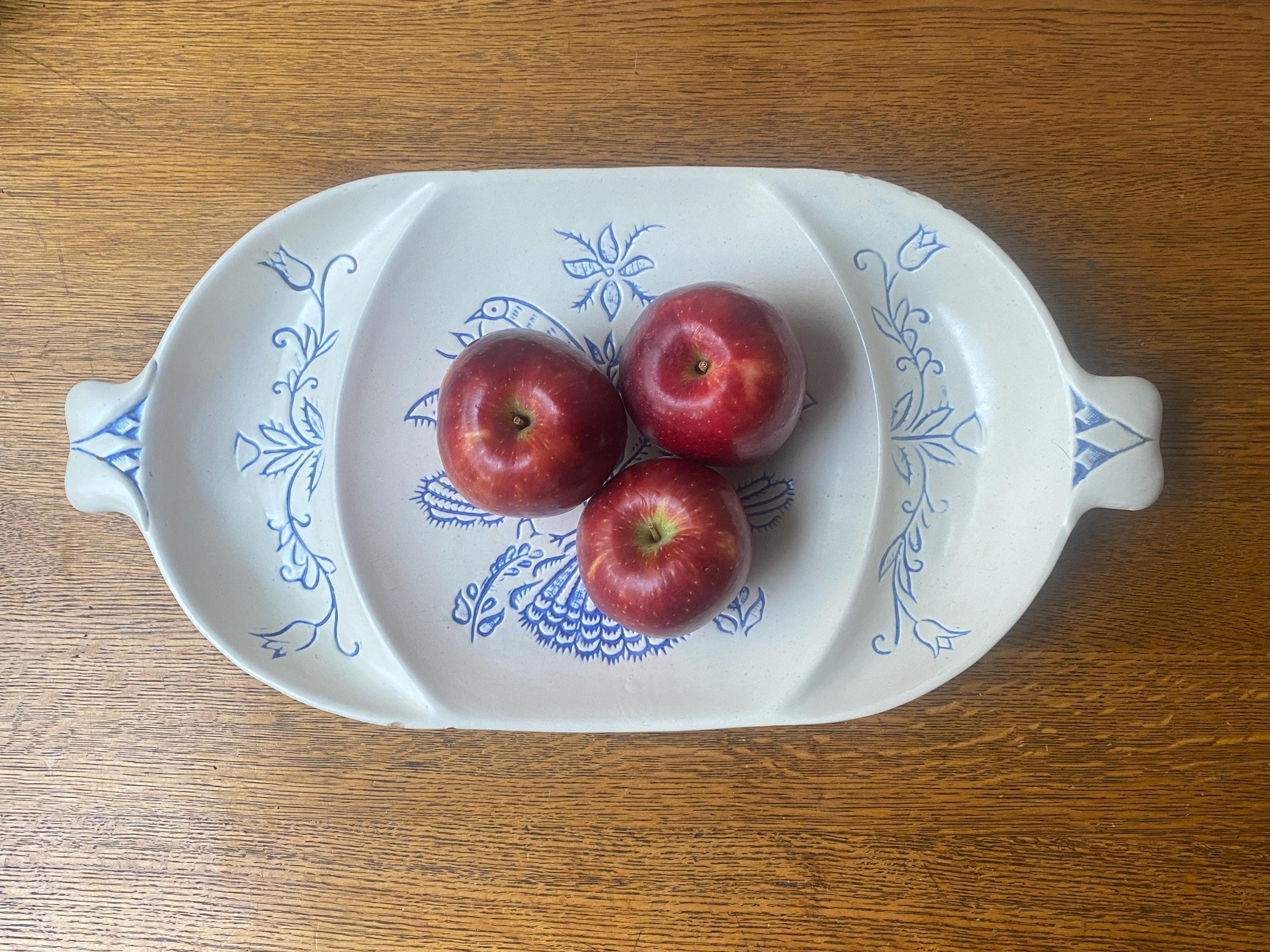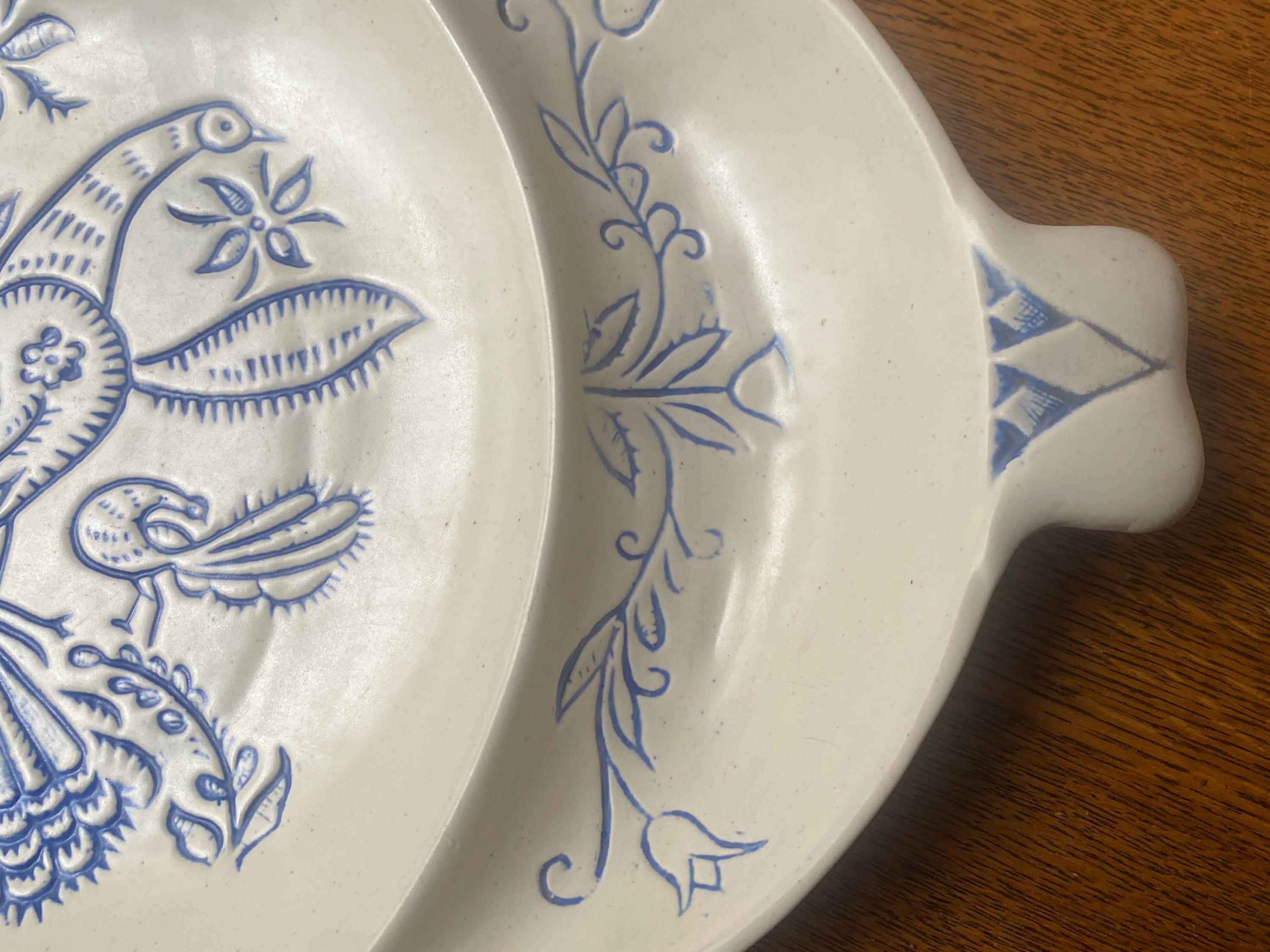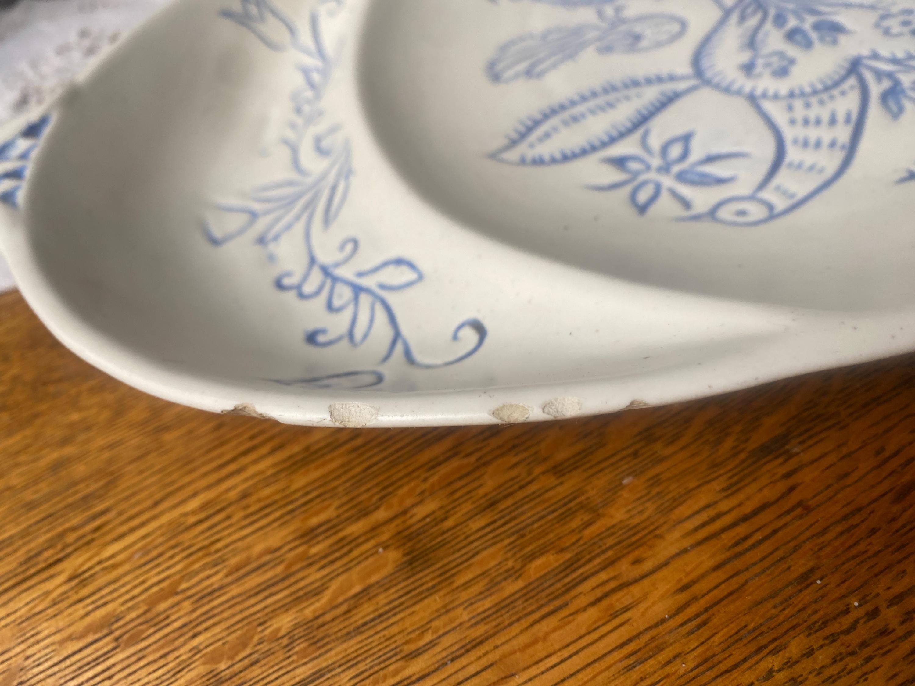 Cute vintage California Pottery platter (D901) in a folk art blue pattern on white background. It has some chips along edges and on bottom (please see photos). Approximately 20X10X1.5