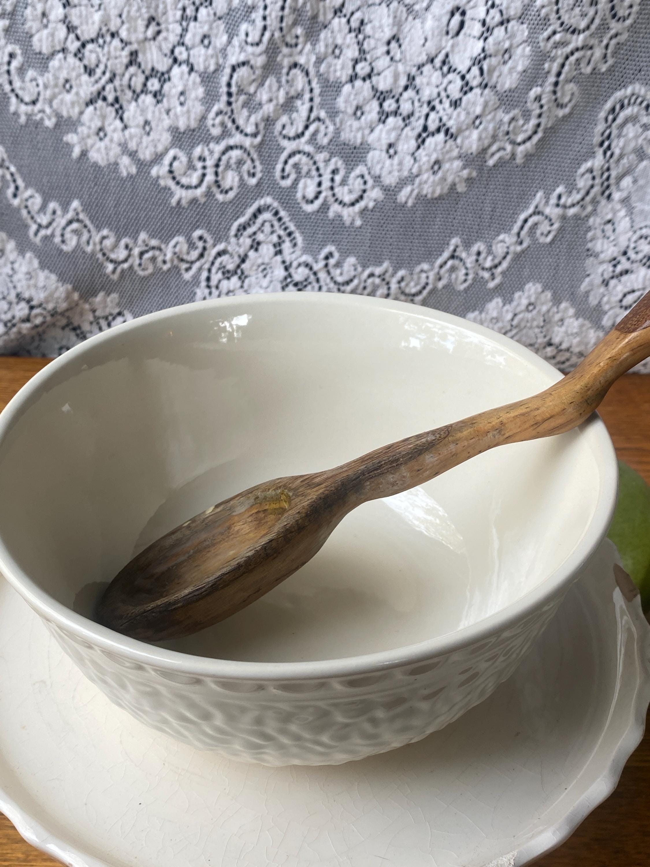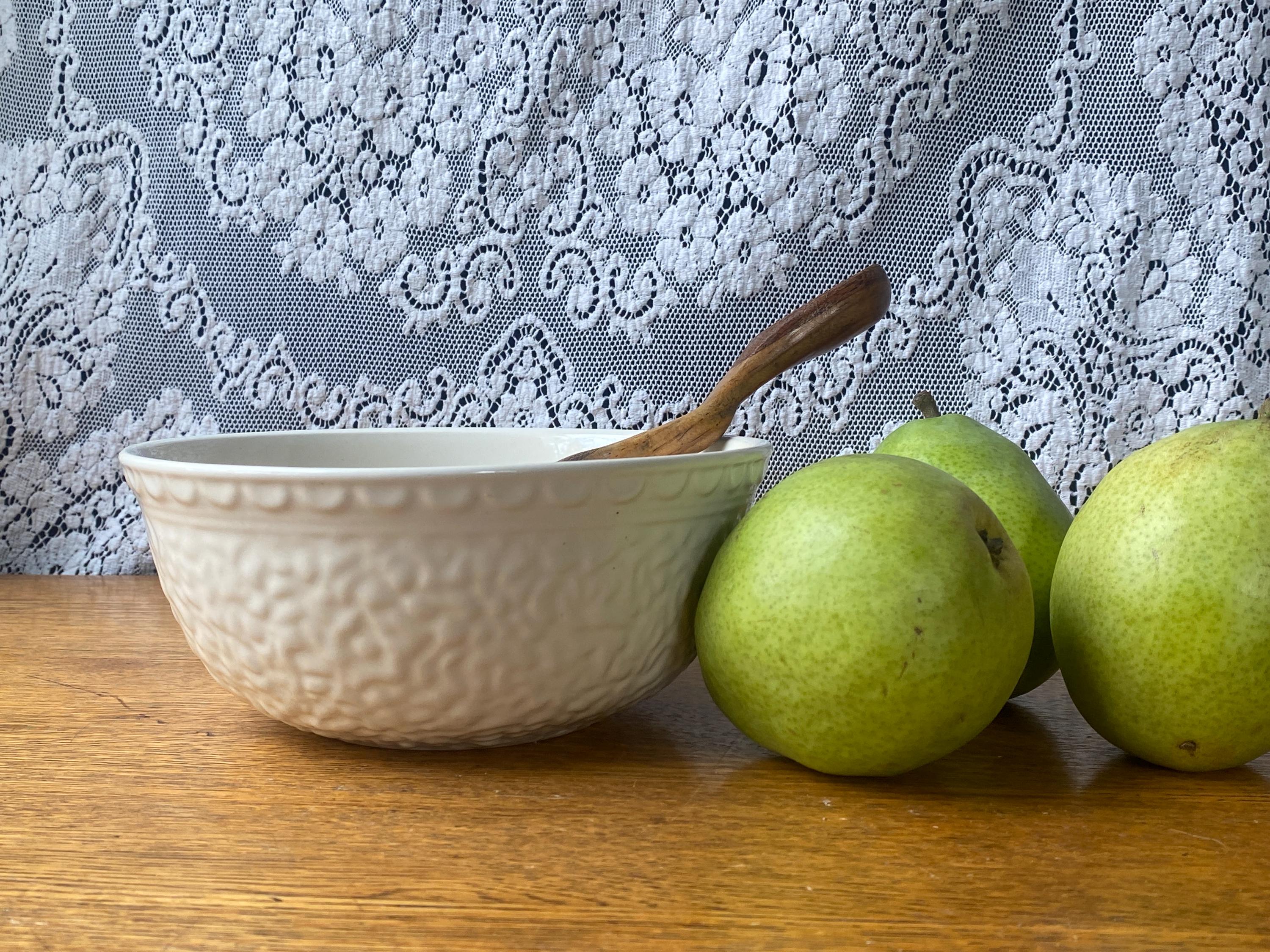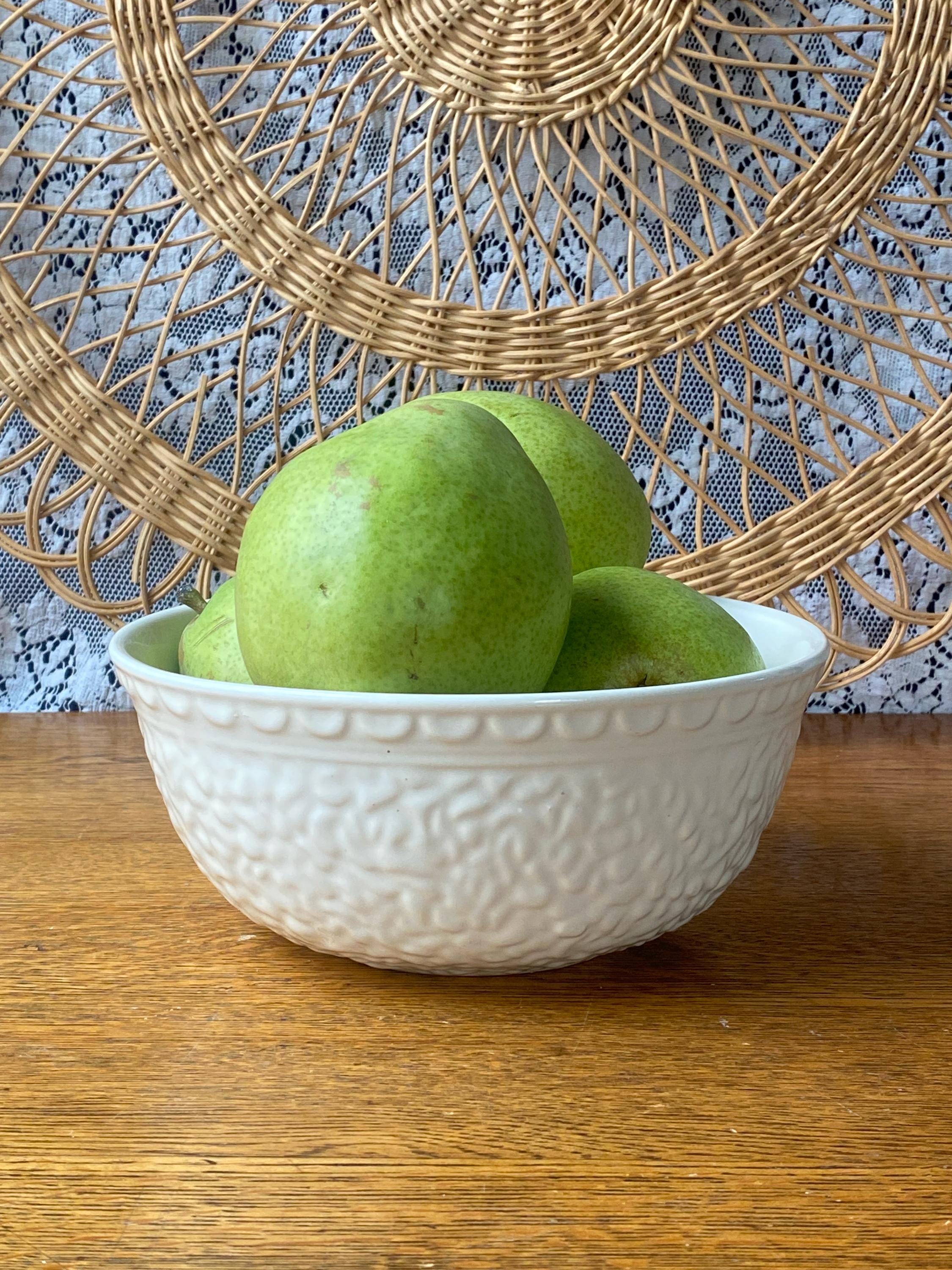 Vintage mid-century mixing or serving bowl, 7.5 inches across top, 3 inches tall. Beautiful filled with fruit and perfect in a farm or country style kitchen. All items in my shop are vintage or handmade and may have signs of use, wear, or variation consistent with age or hand production. Please review the photos and video carefully and message me with any questions on condition.
