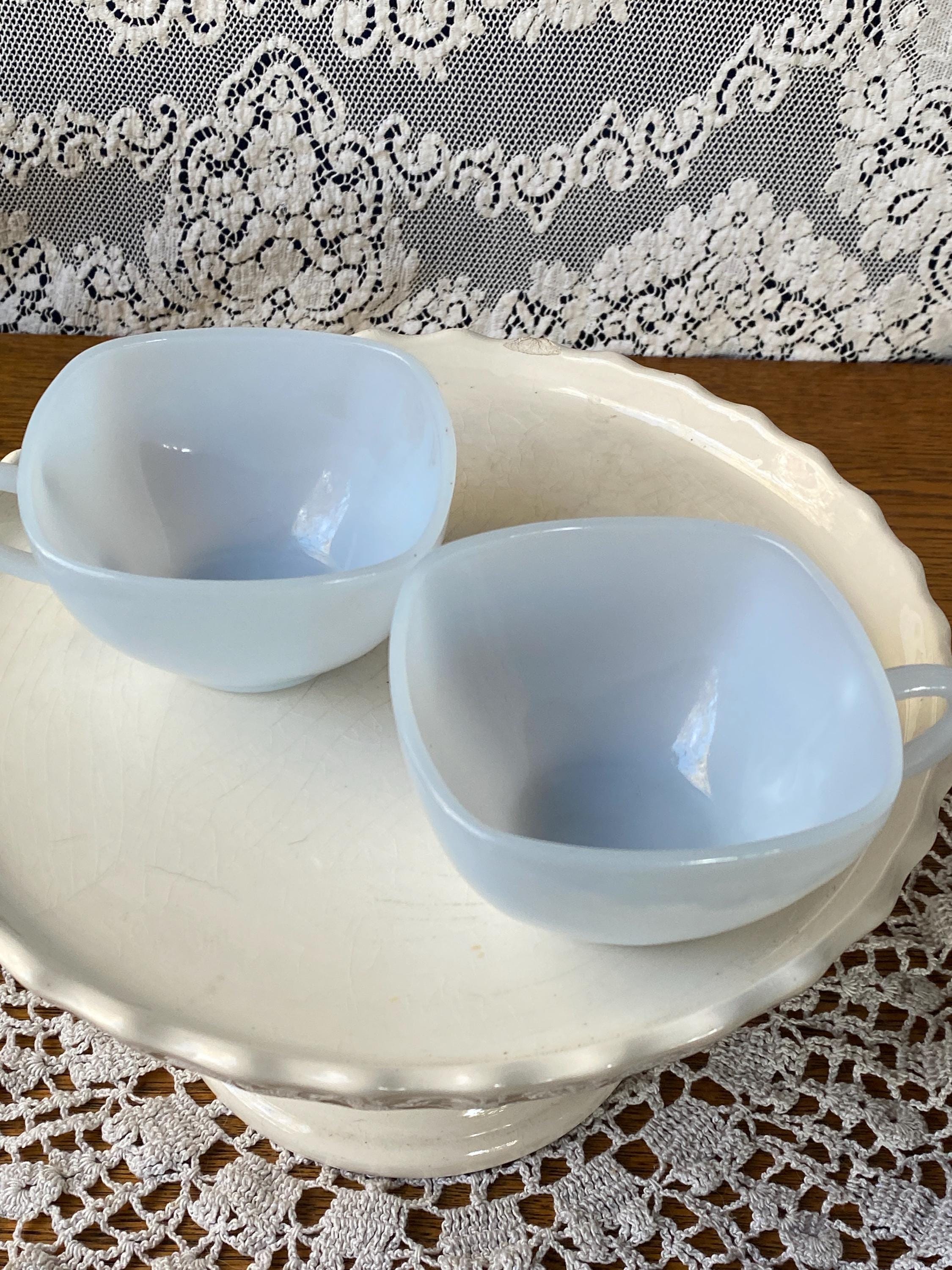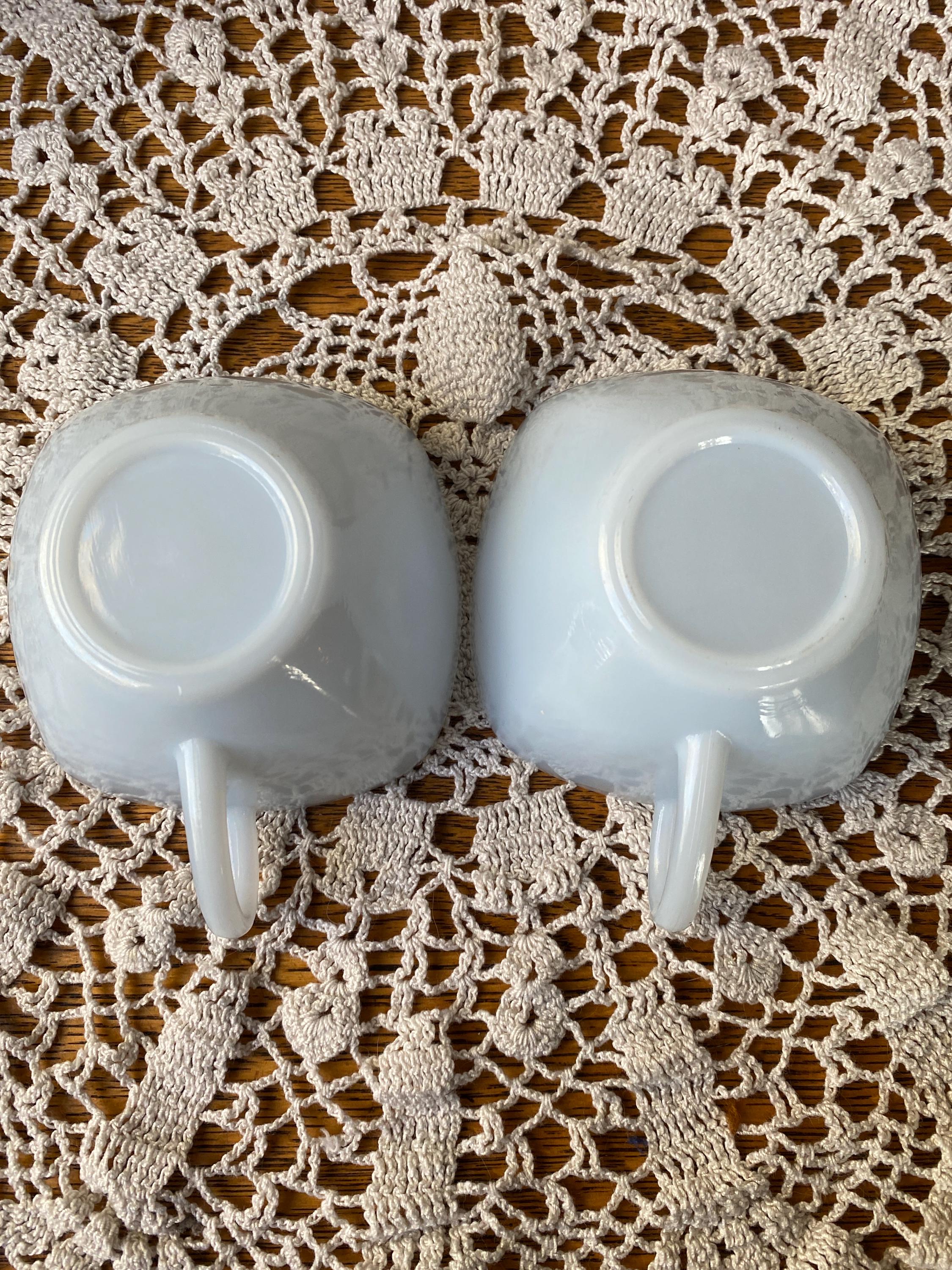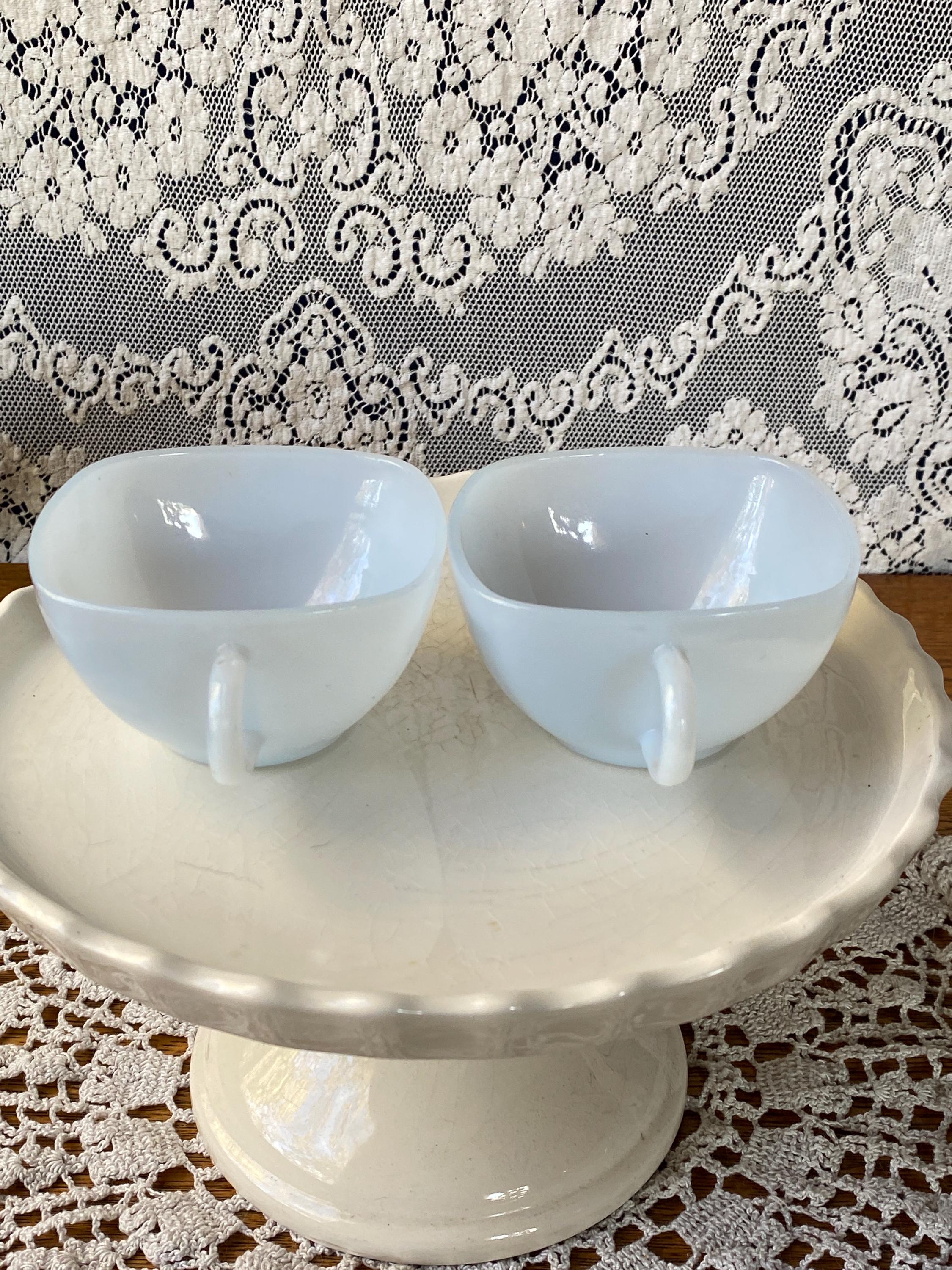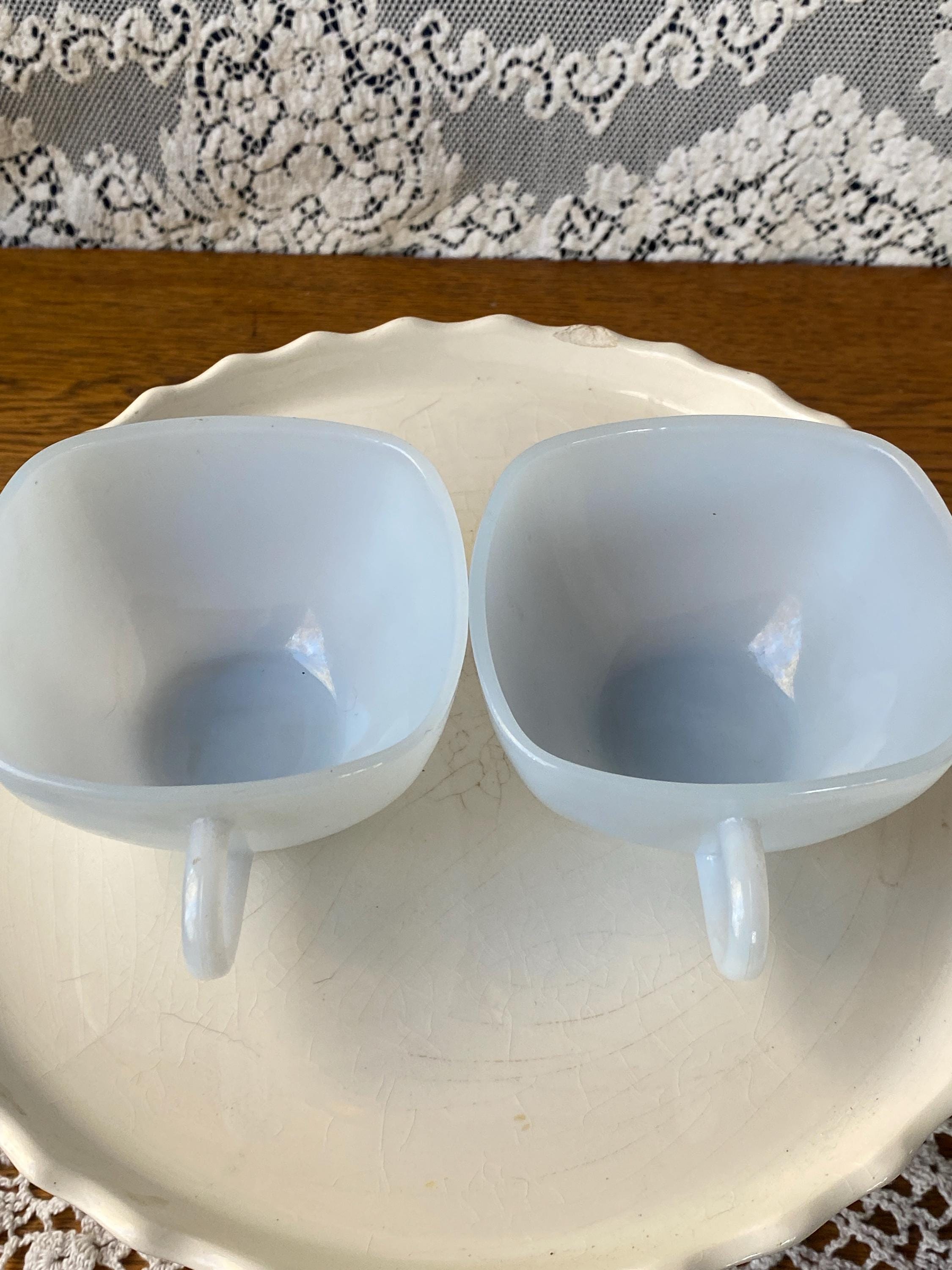 These two are the cutest! From their square shape to the light blue color, they have all the vintage charm. Perfect for coffee or tea. 3.75X4.5X2 inches each. Good vintage condition.