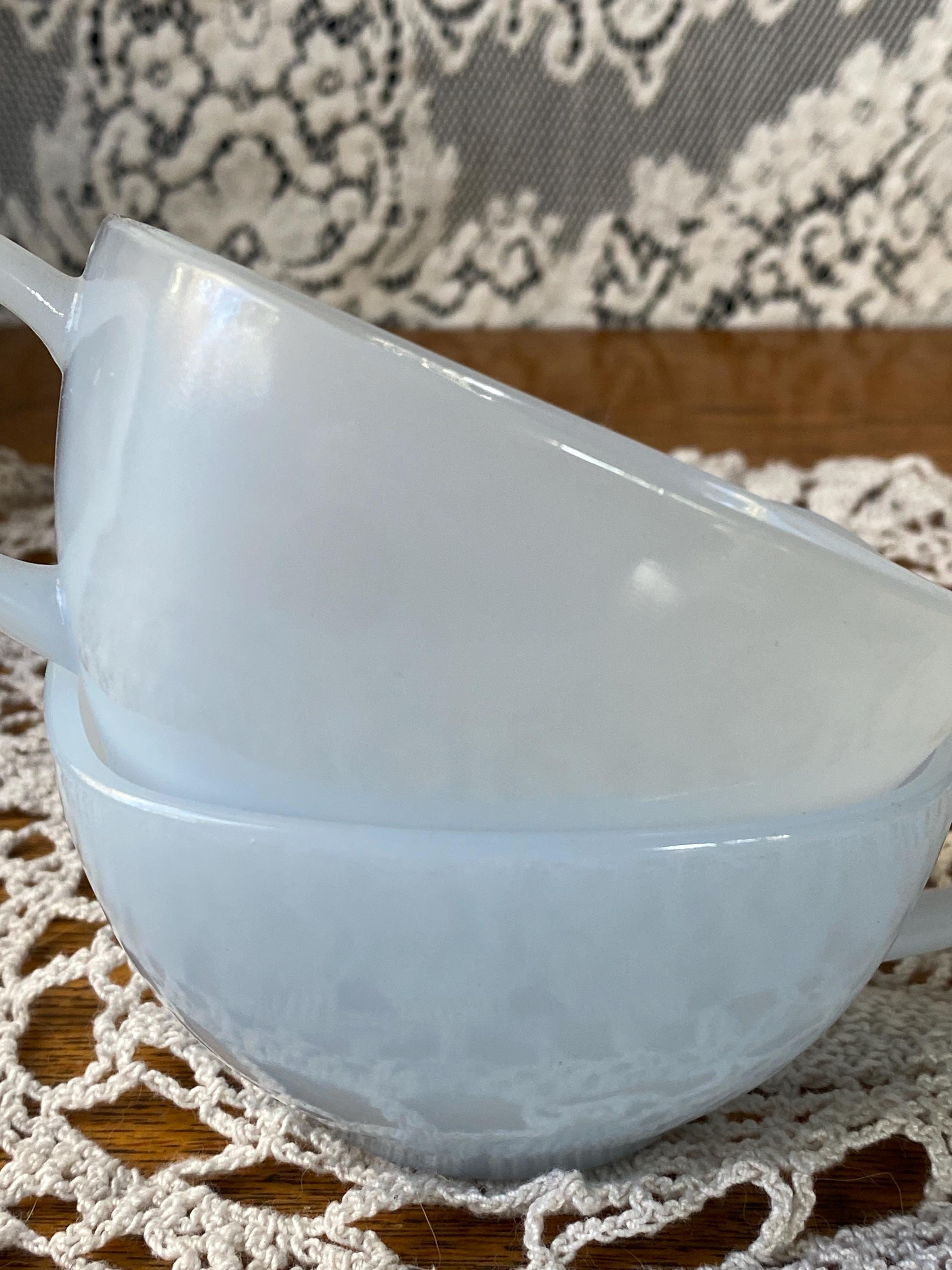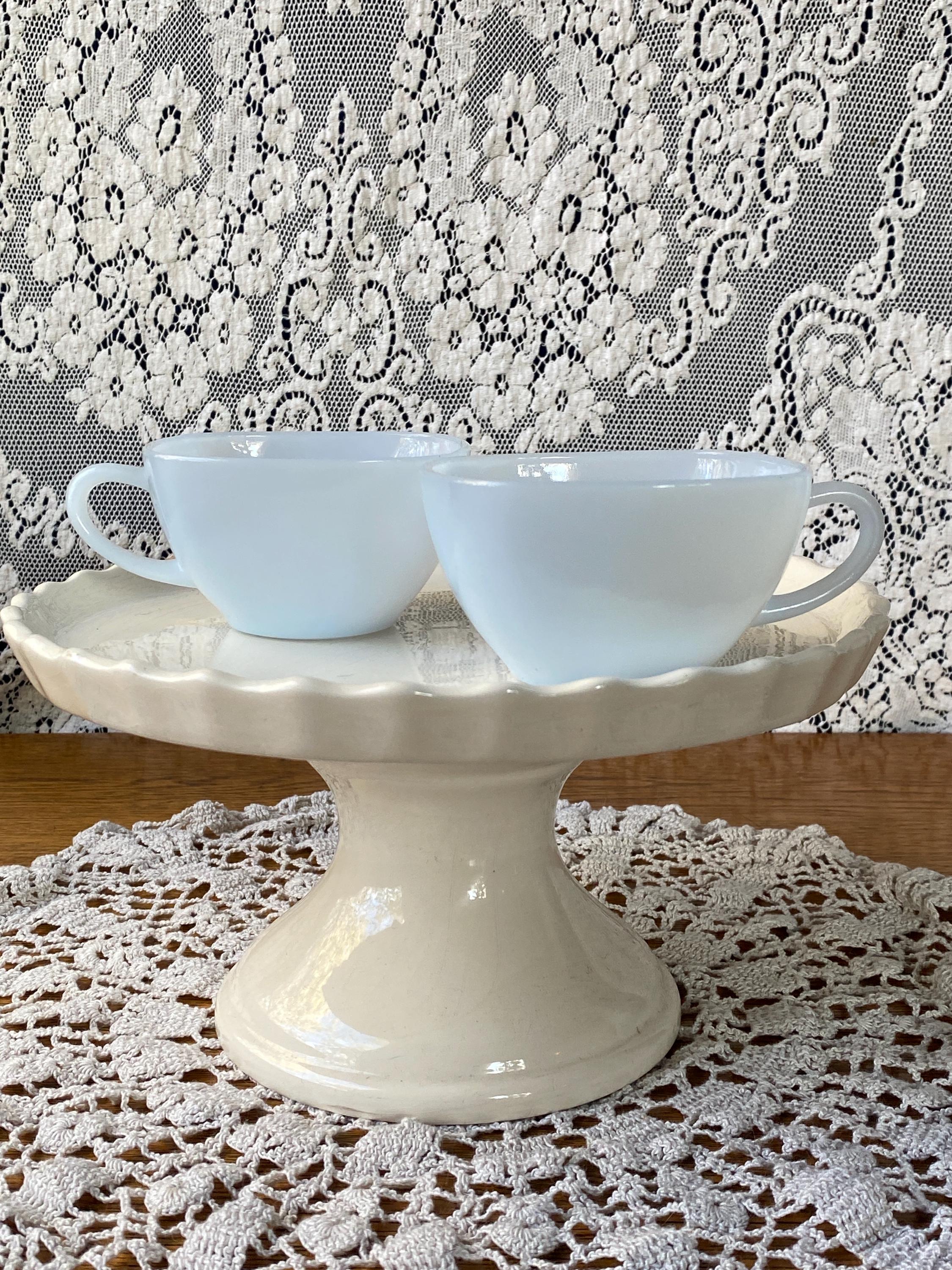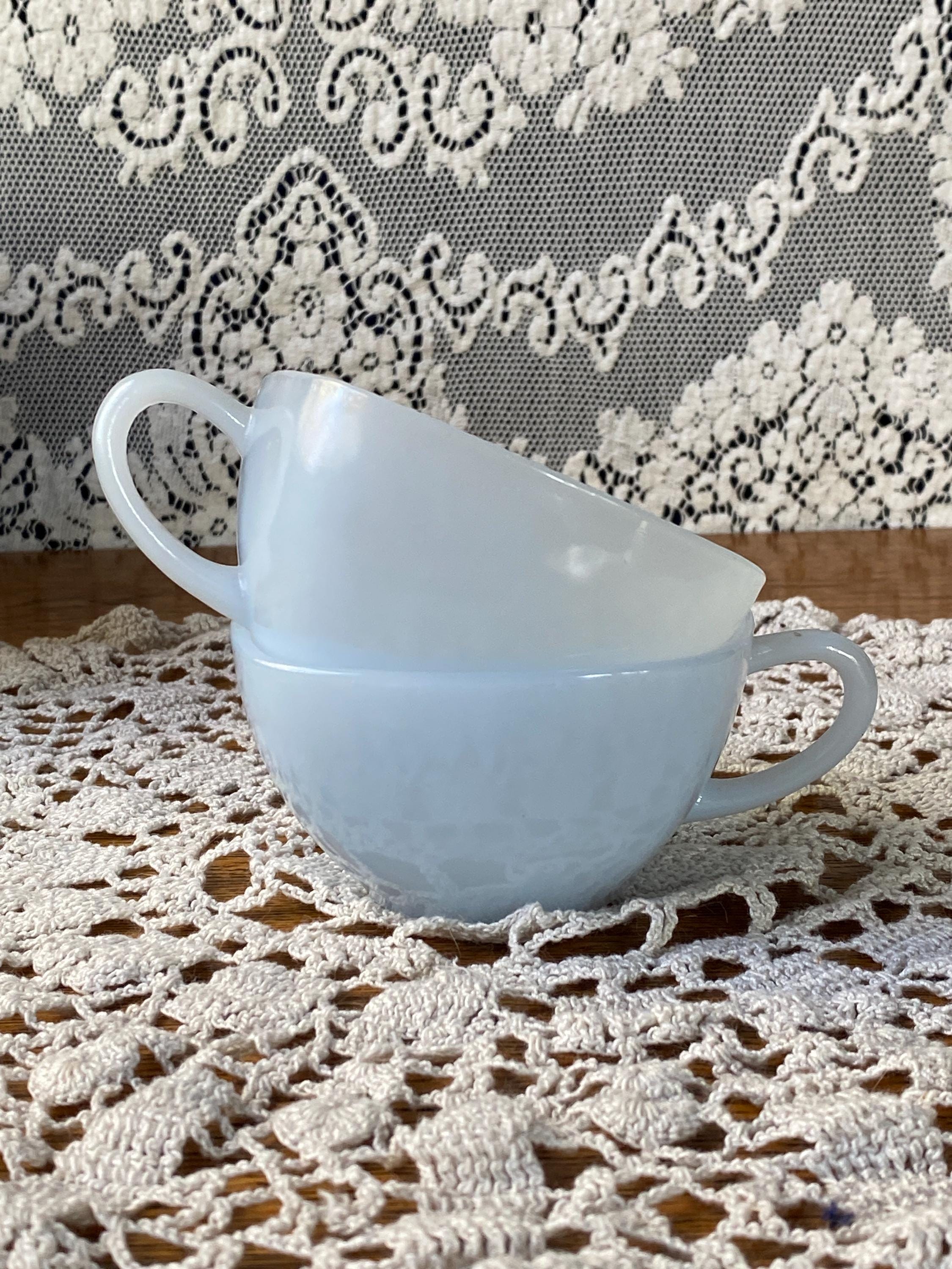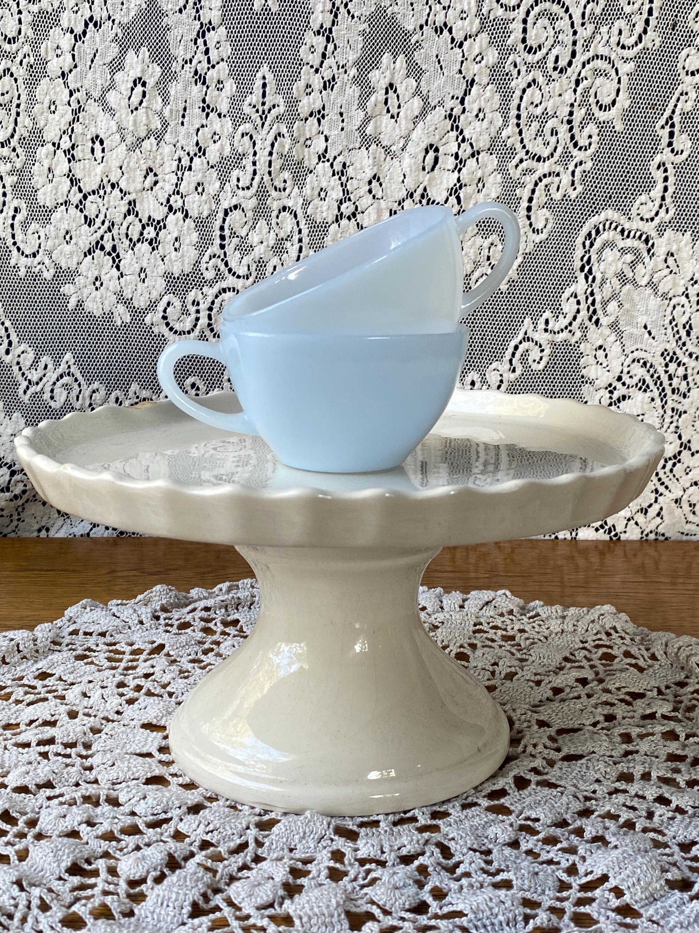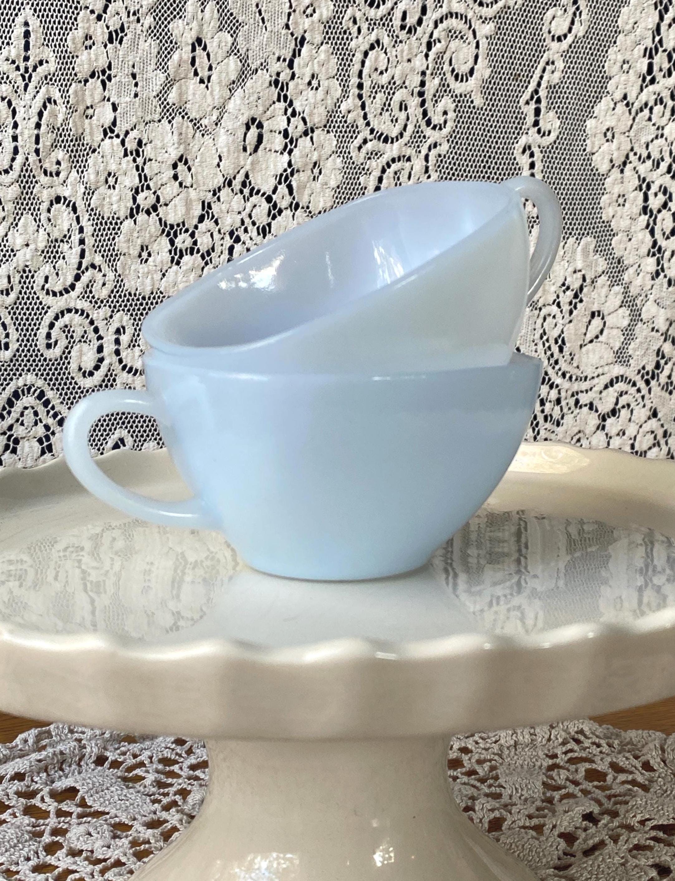 These two are the cutest! From their square shape to the light blue color, they have all the vintage charm. Perfect for coffee or tea. 3.75X4.5X2 inches each. Good vintage condition.