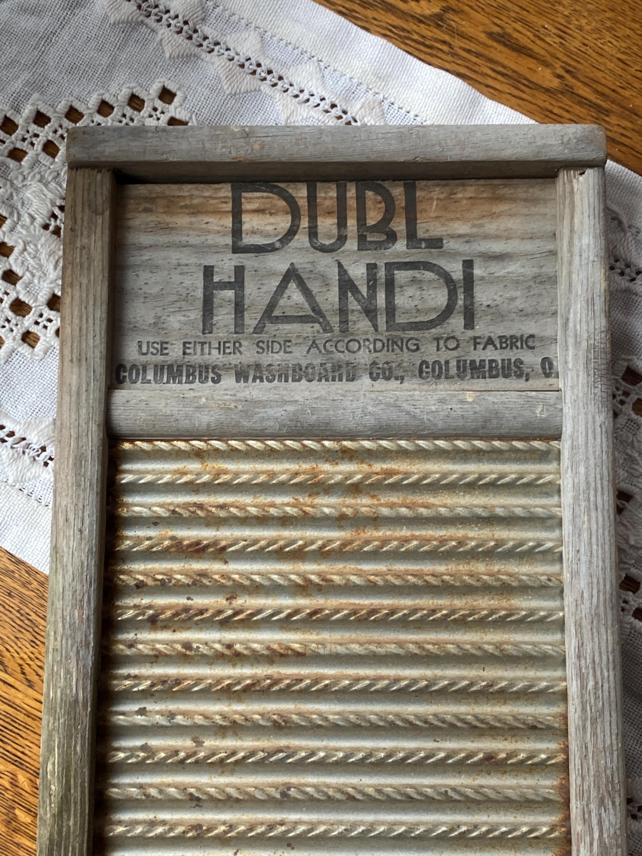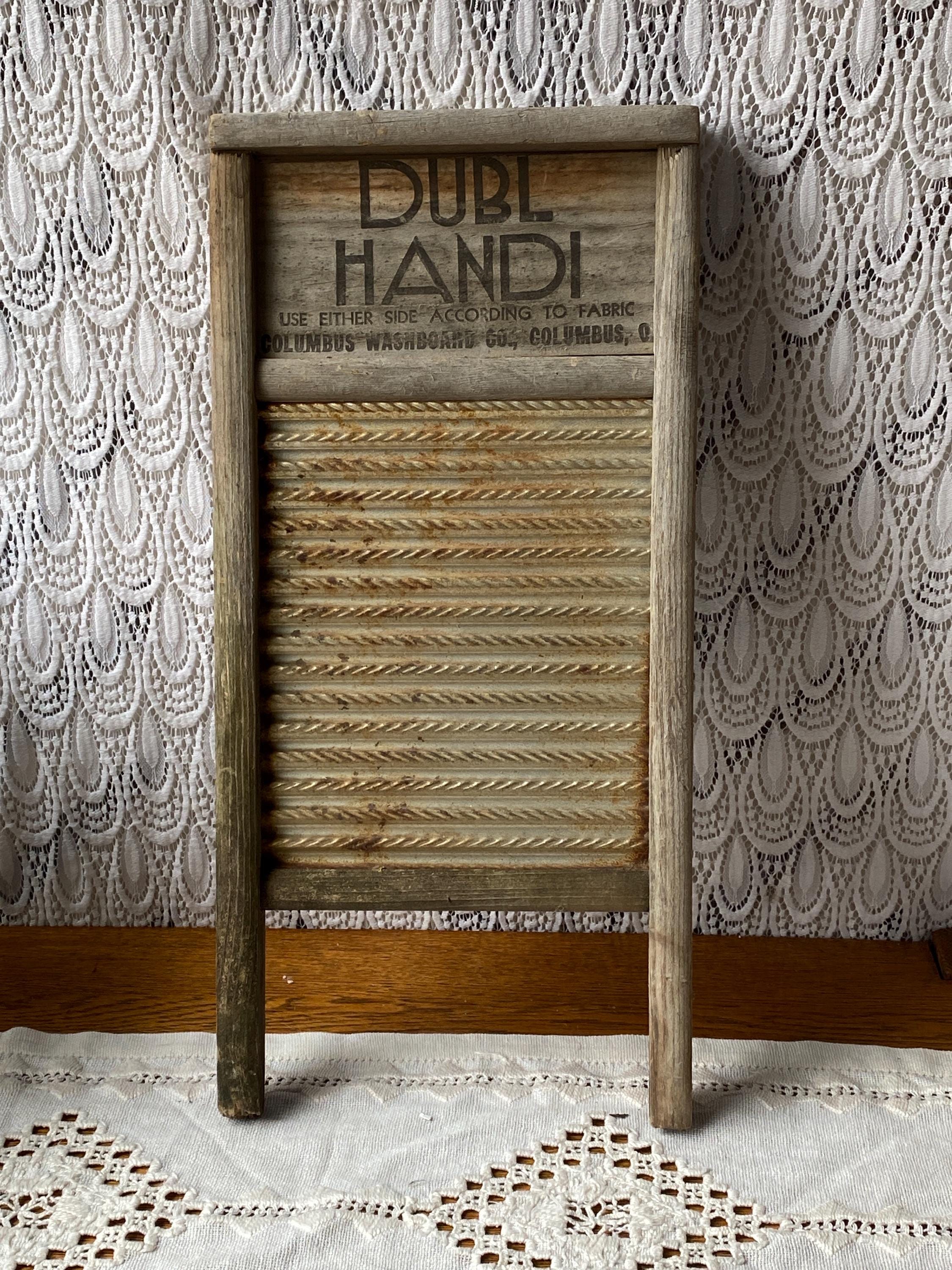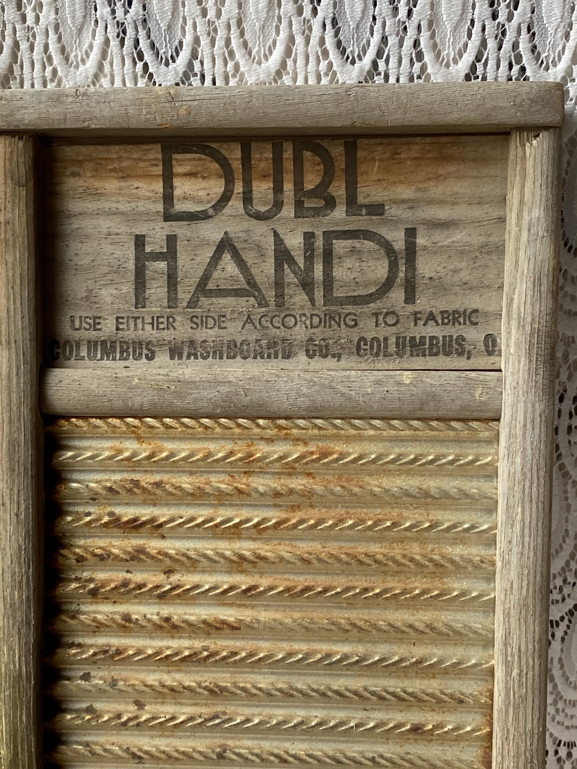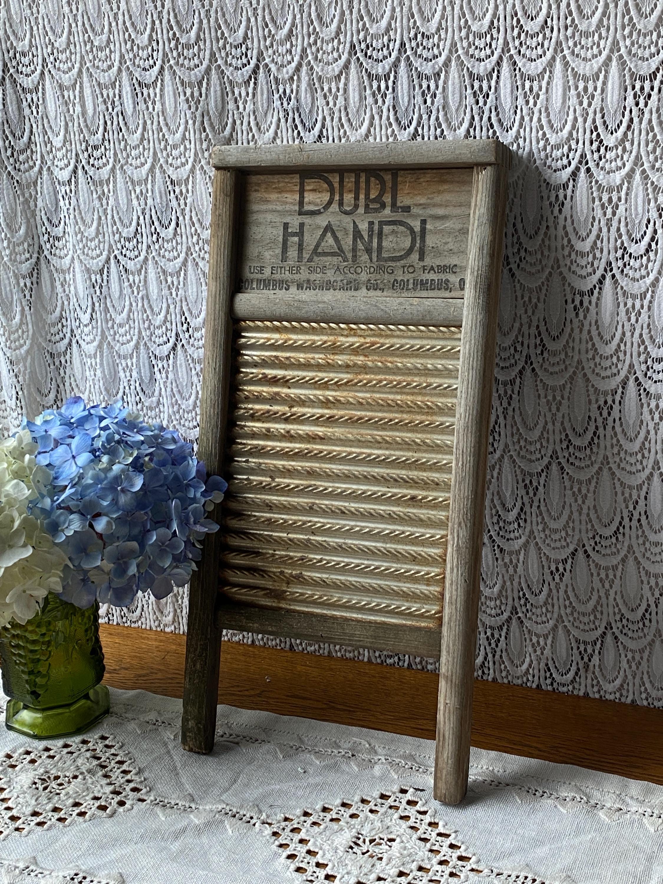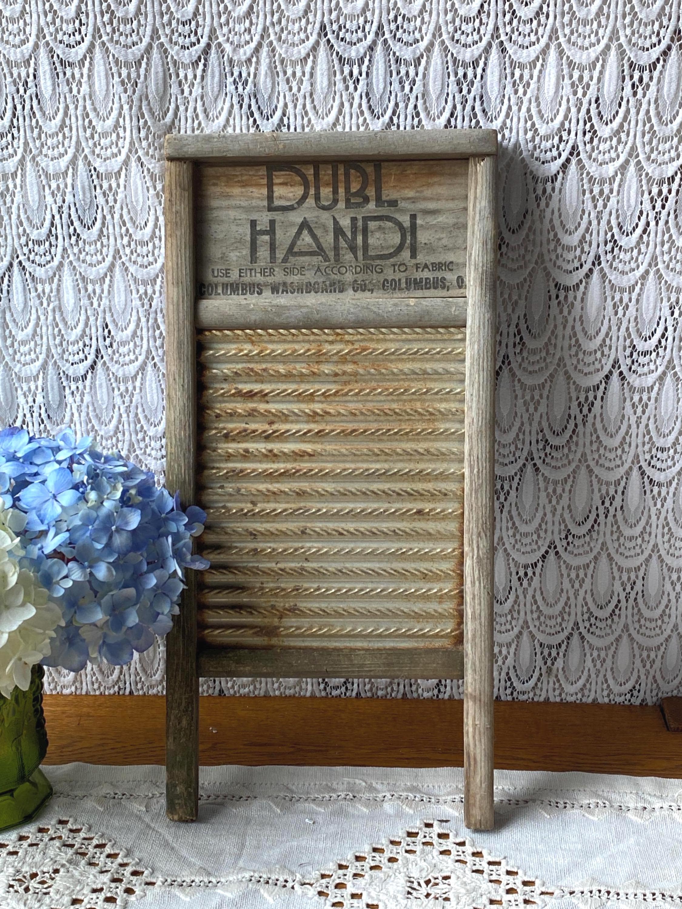 8.5X1X18 inches. Great rustic/ primitive decor piece made from a wooden frame with a metal scrubbing surface. Duble Handi brand. Perfect vintage aging! See photos for examples of use and wear.