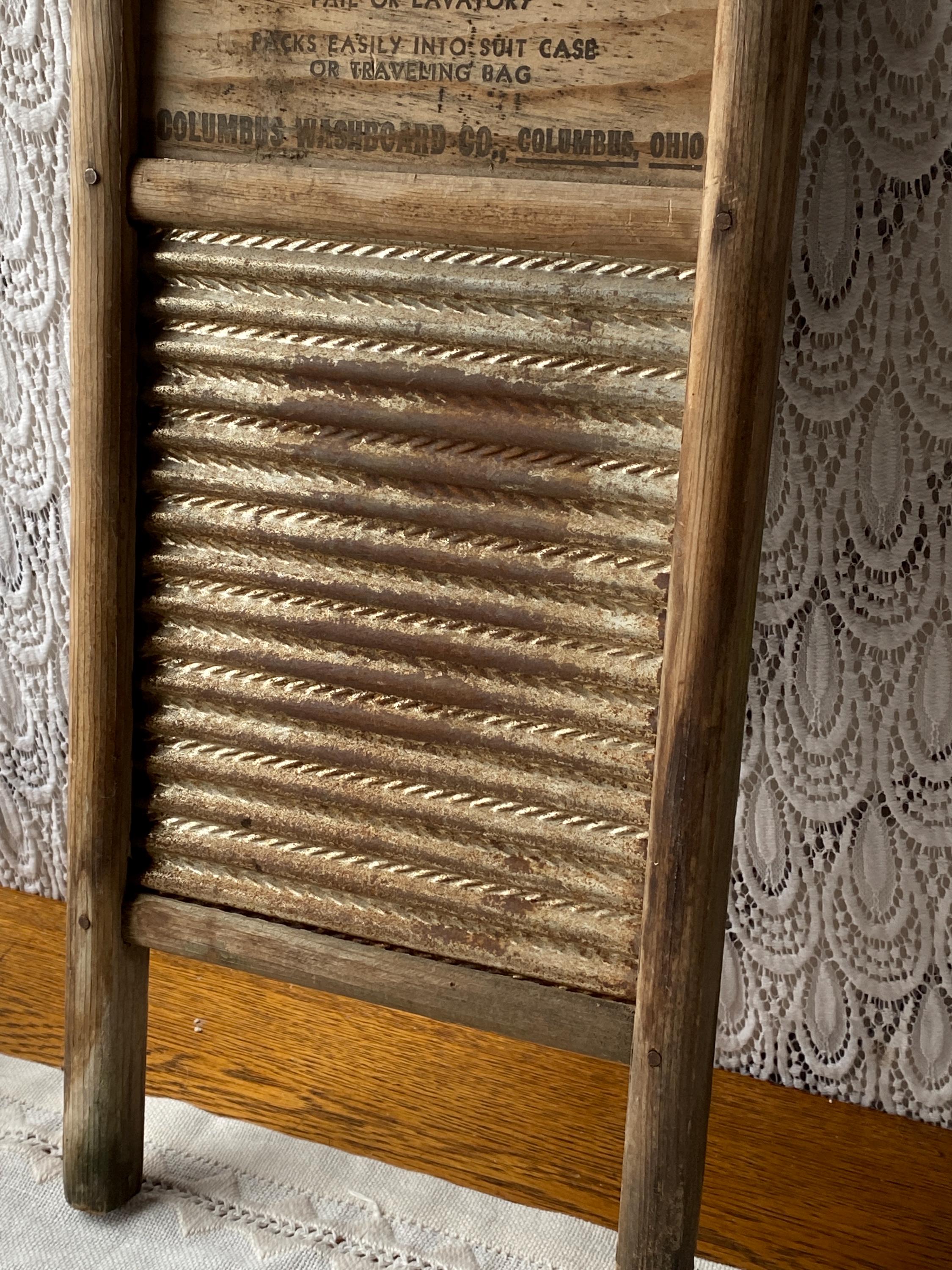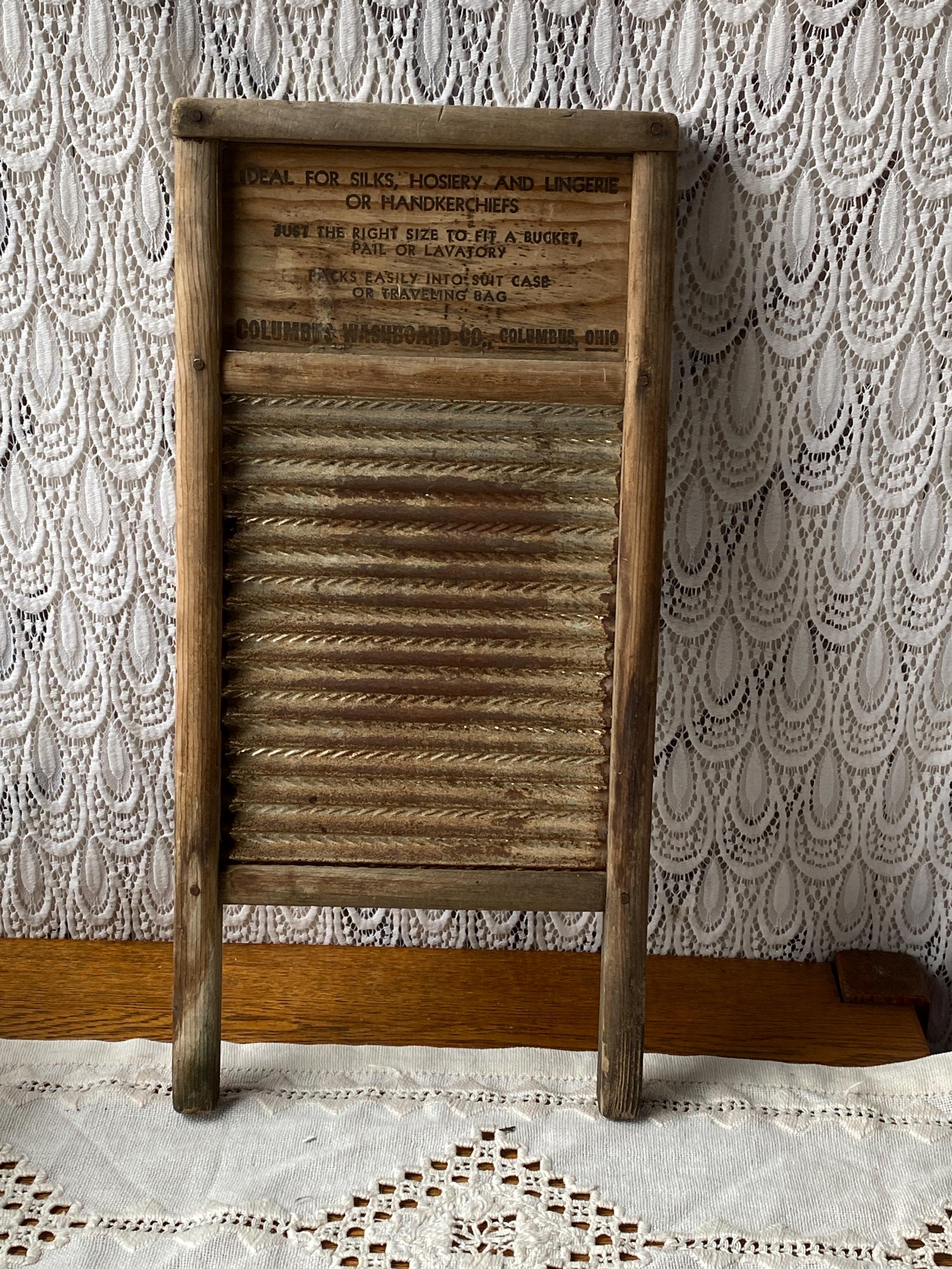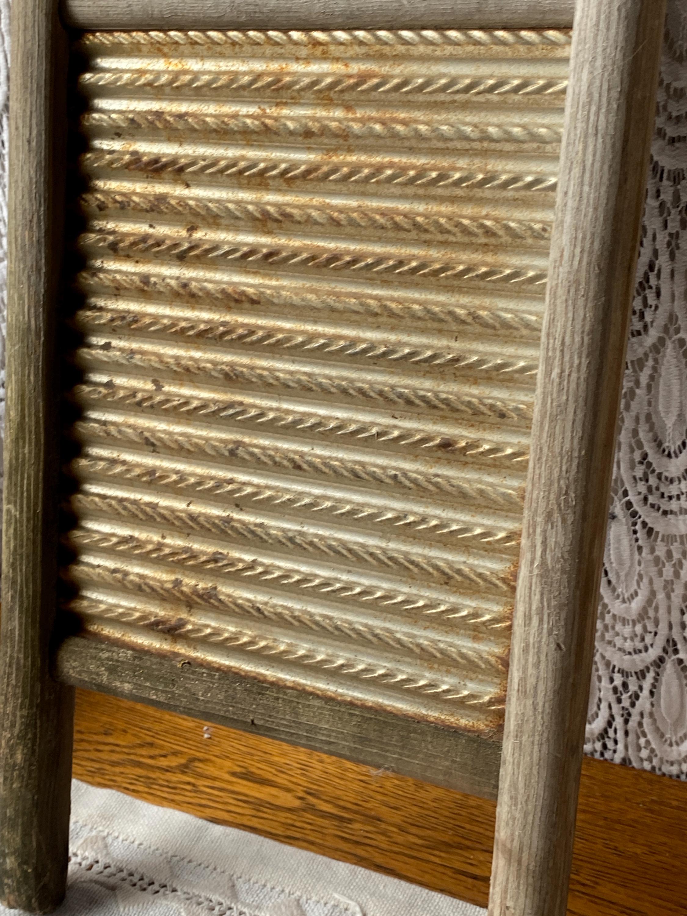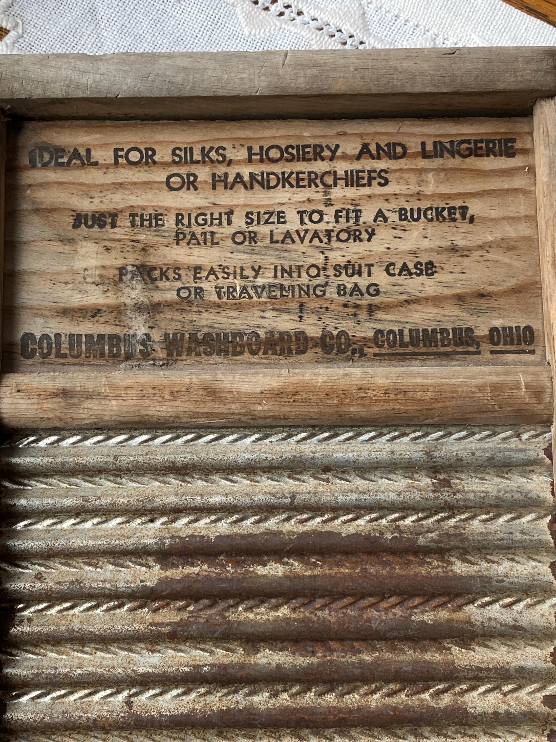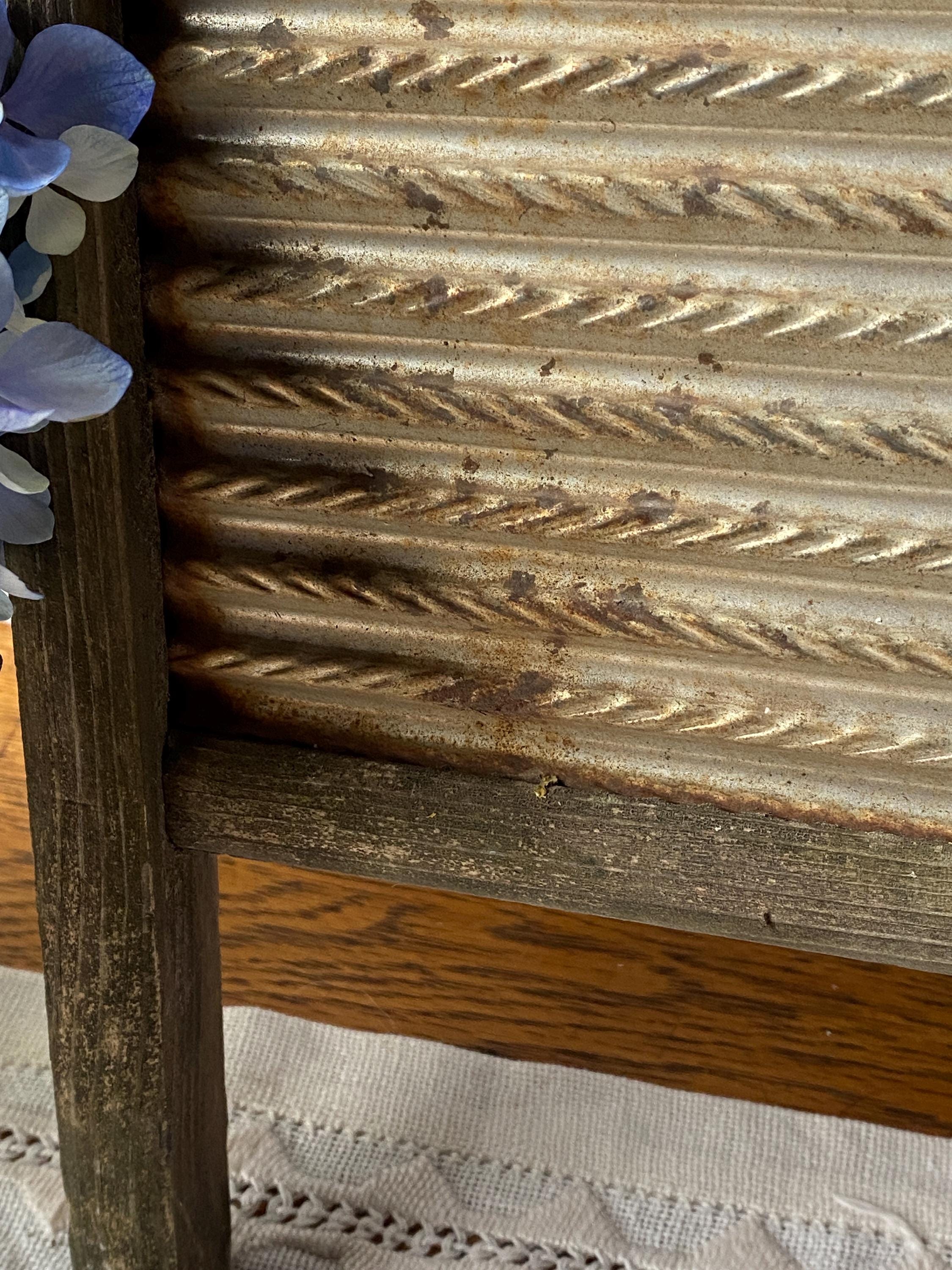 8.5X1X18 inches. Great rustic/ primitive decor piece made from a wooden frame with a metal scrubbing surface. Duble Handi brand. Perfect vintage aging! See photos for examples of use and wear.