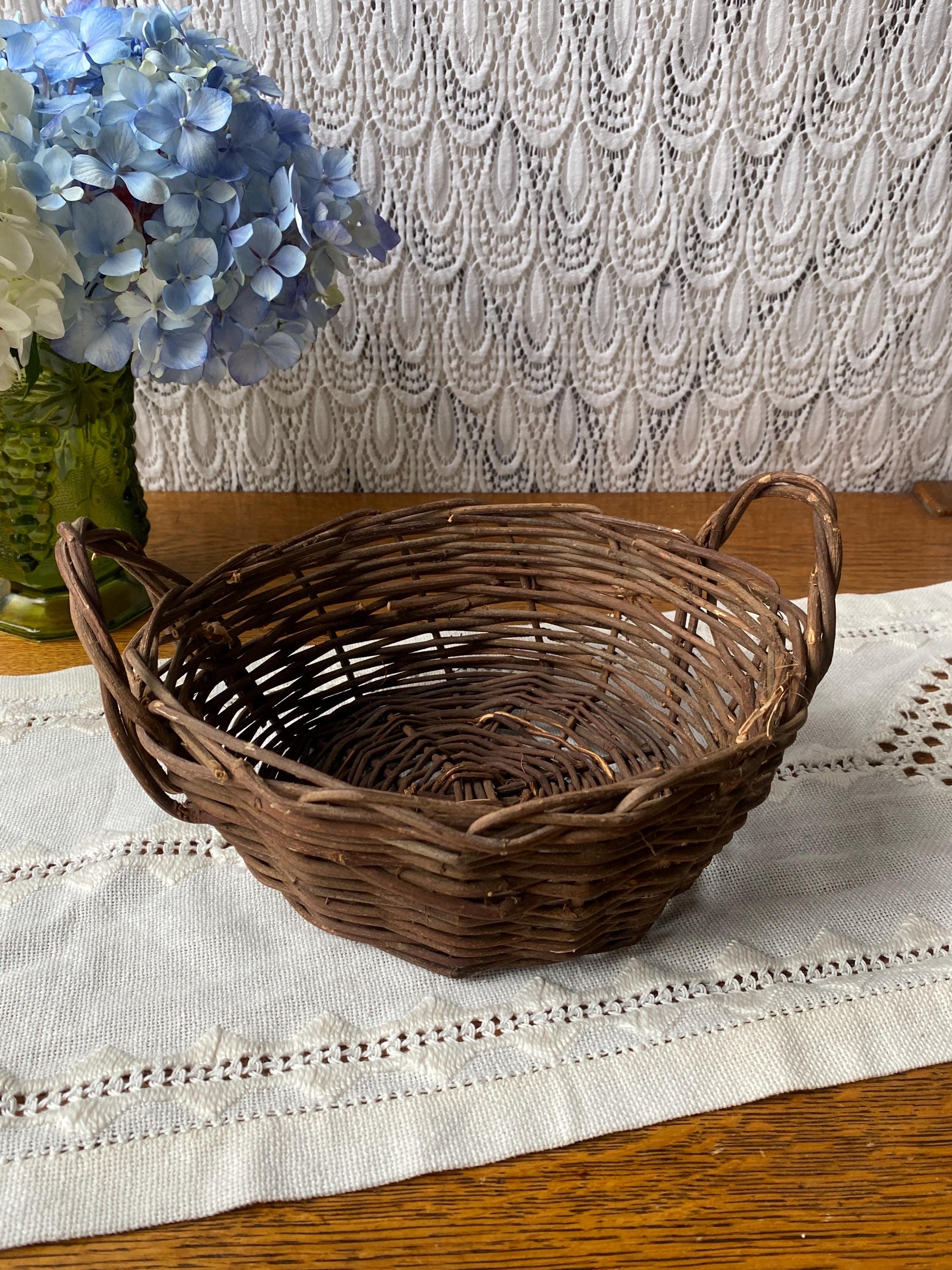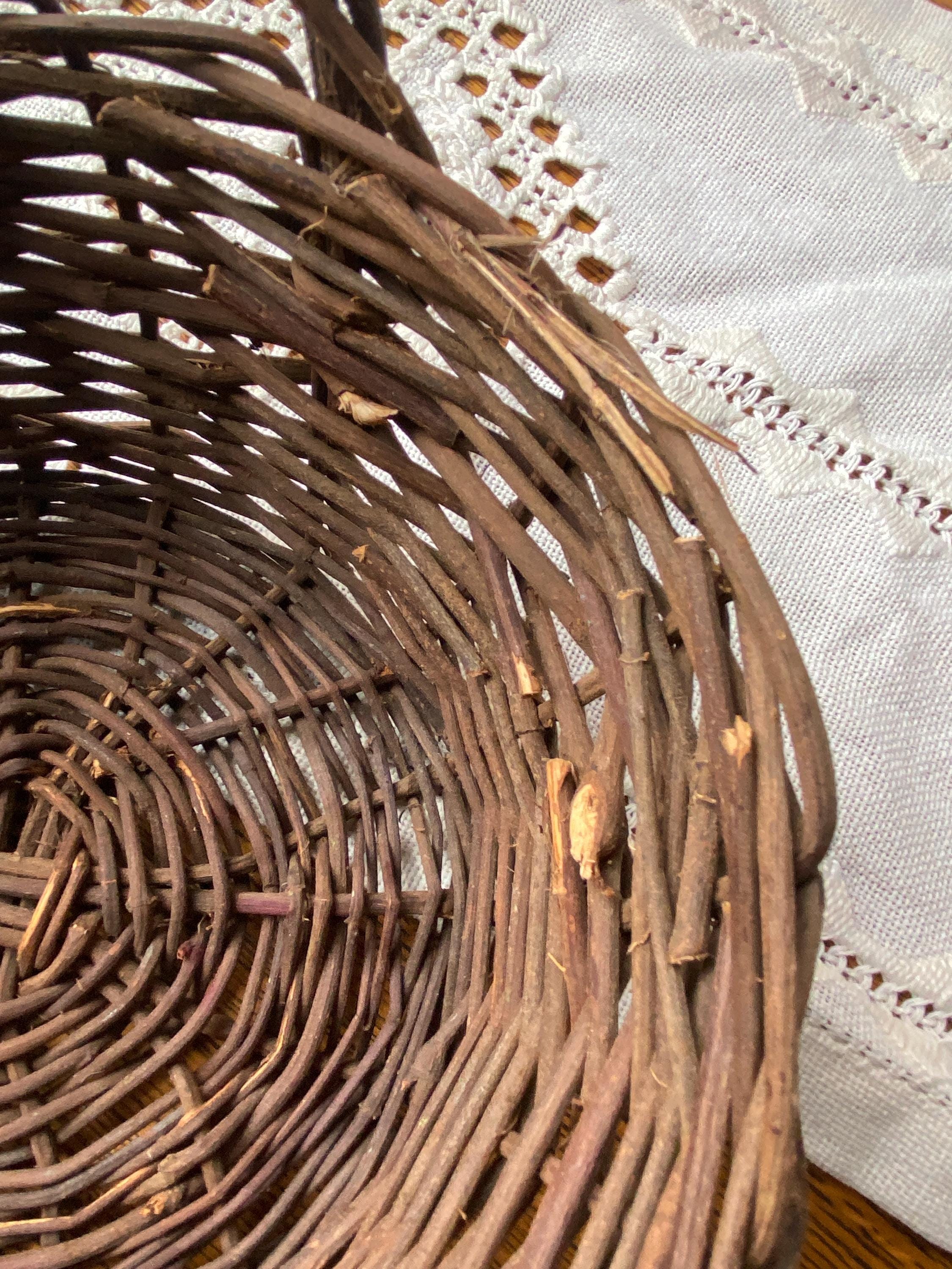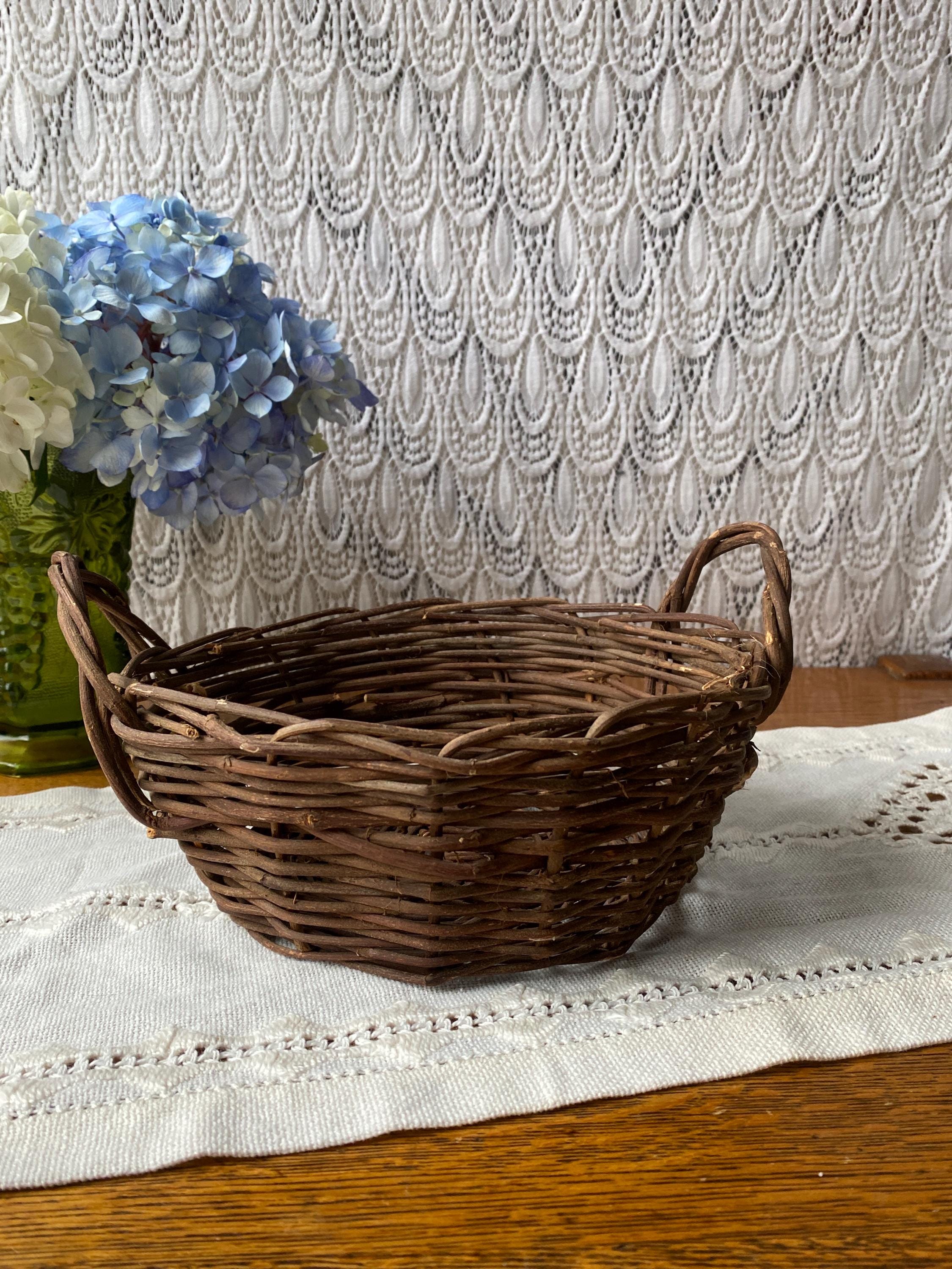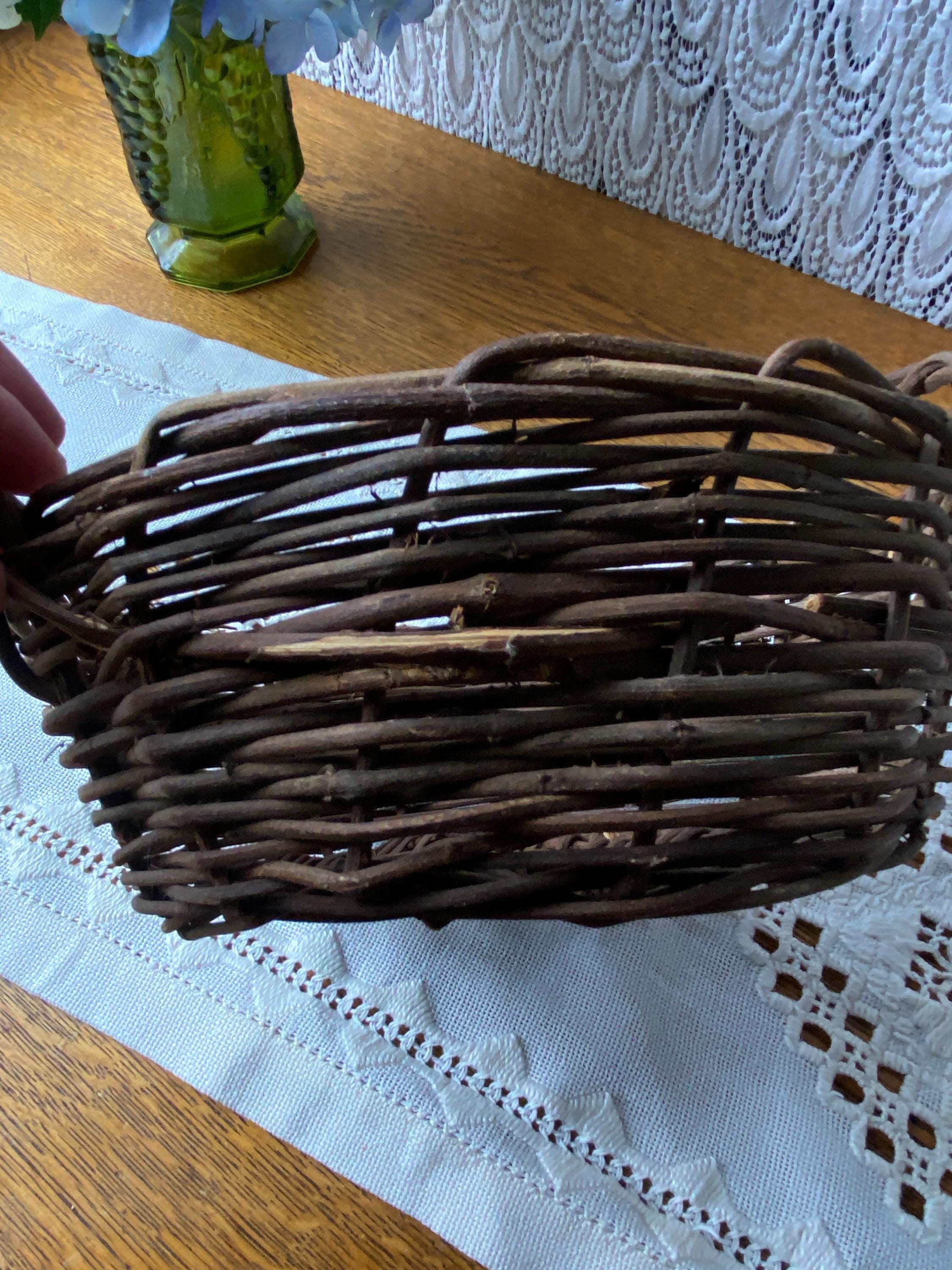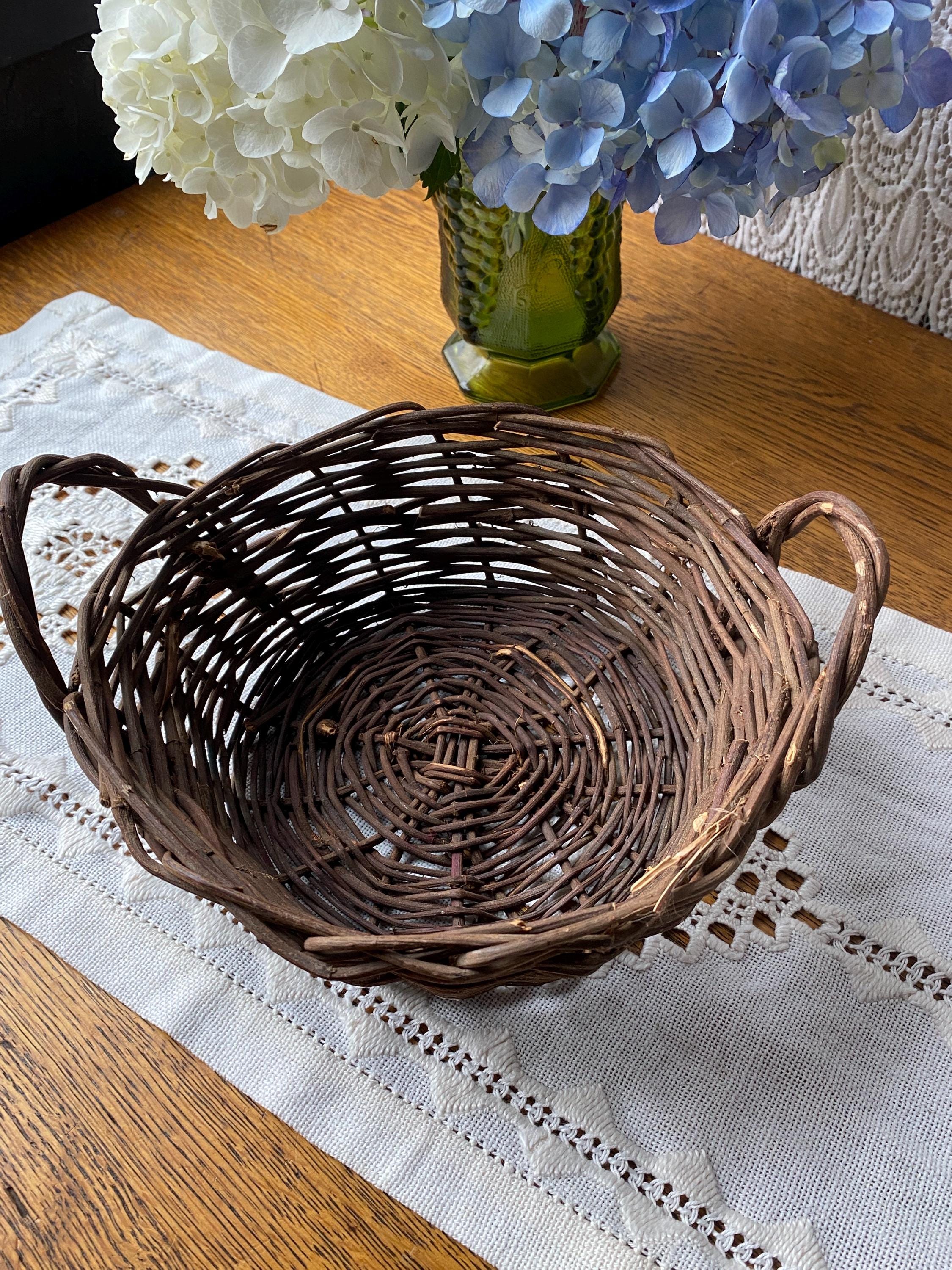 9.5X8X3.5 inches, perfect for displaying fruit or flowers or as a catch-all or organizer. Woven small sticks in a deep brown color. Some wear on stick as shown in photos. All items in my shop are vintage or handmade and may have signs of use, wear, or variation consistent with age or hand production. Please review the photos and video carefully and message me with any questions on condition.