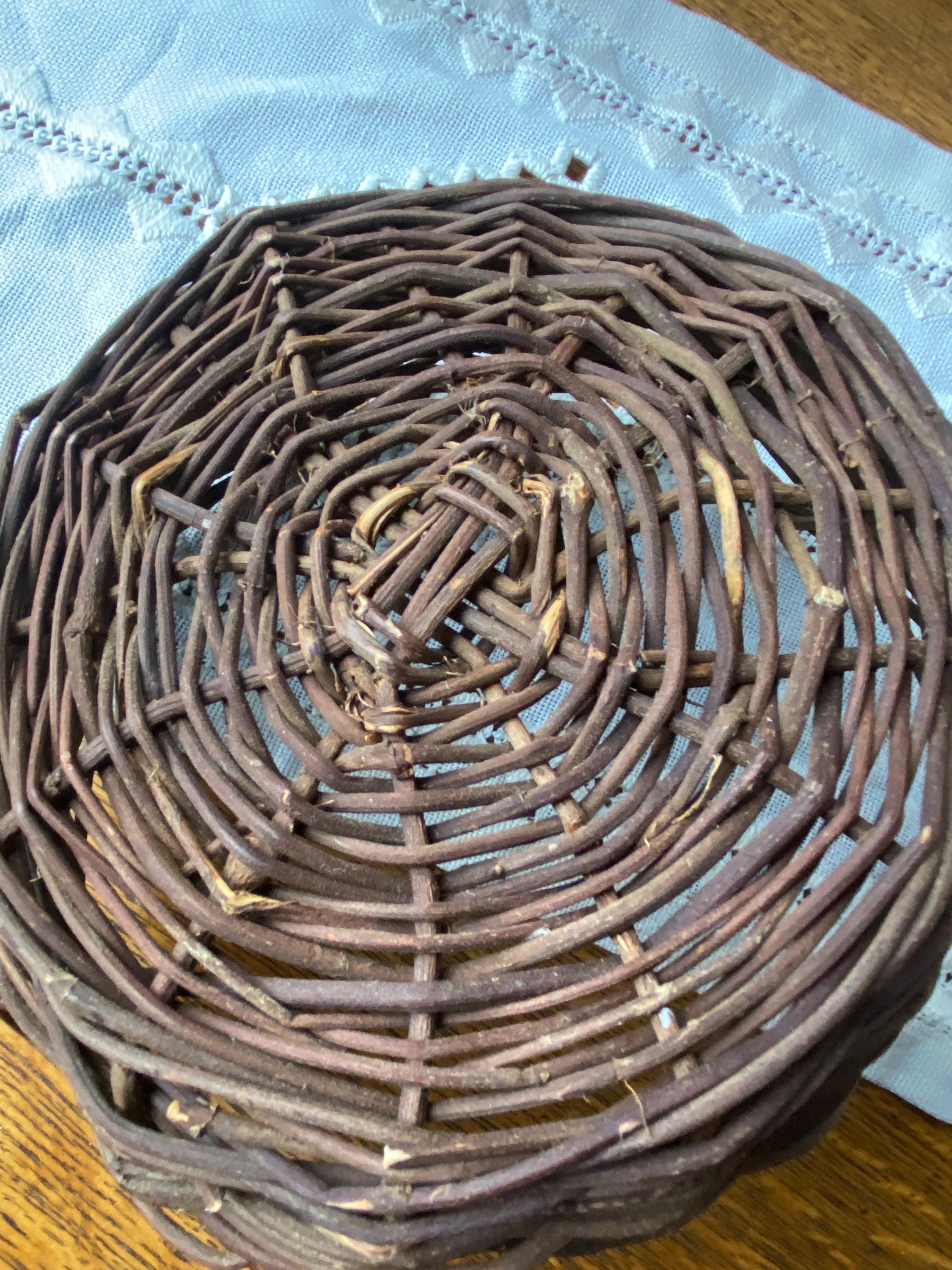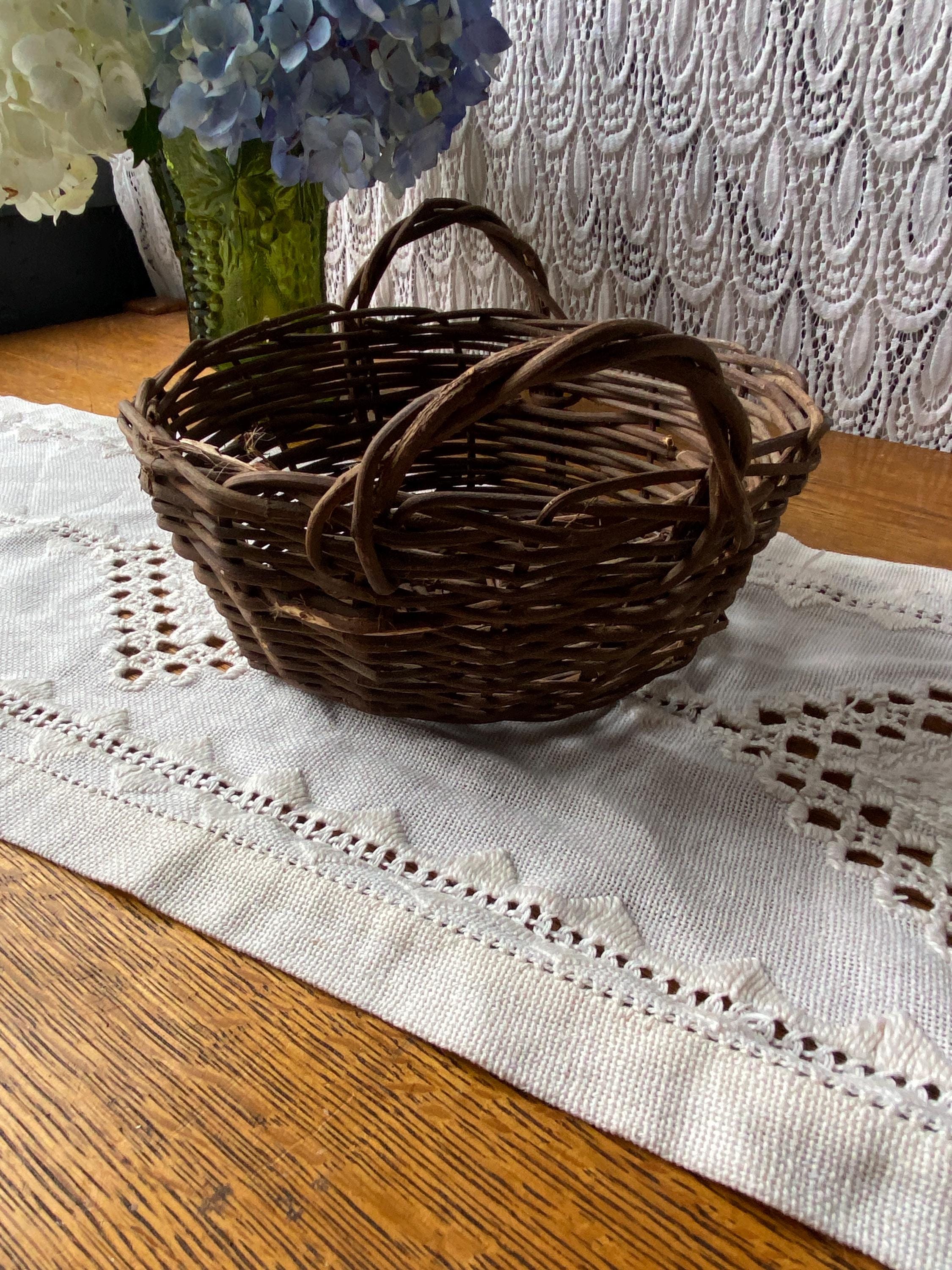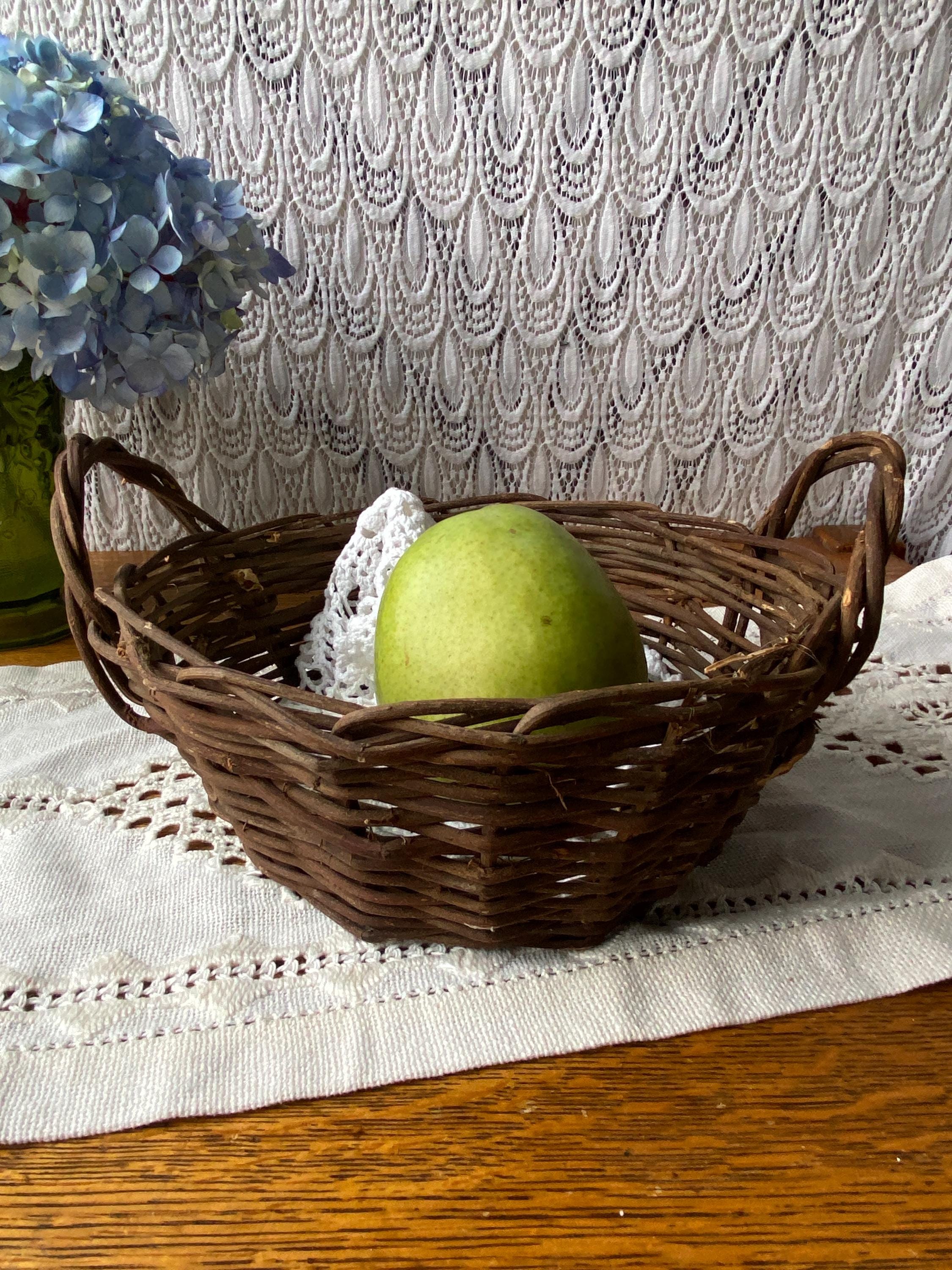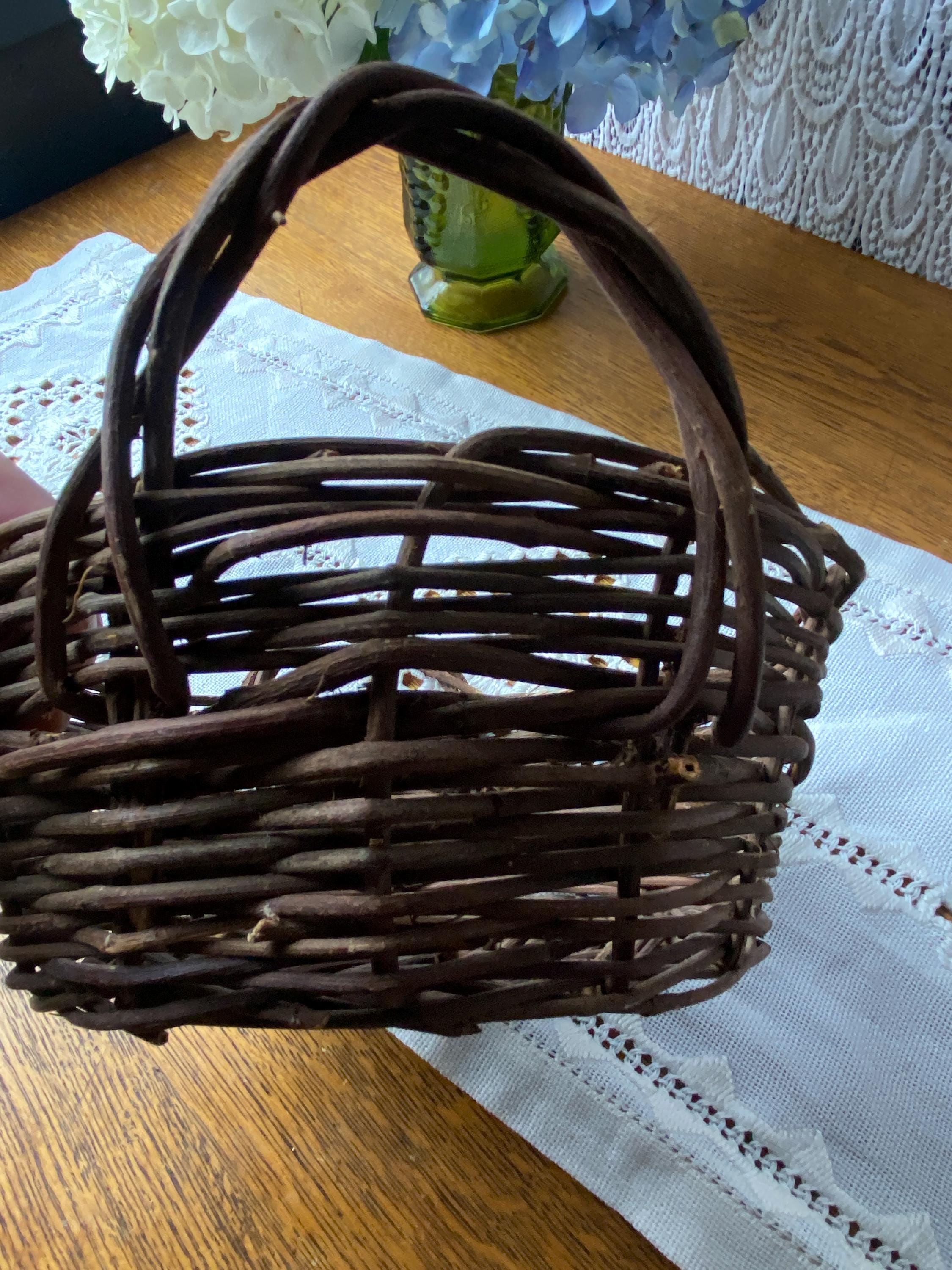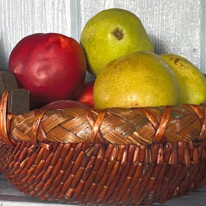 9.5X8X3.5 inches, perfect for displaying fruit or flowers or as a catch-all or organizer. Woven small sticks in a deep brown color. Some wear on stick as shown in photos. All items in my shop are vintage or handmade and may have signs of use, wear, or variation consistent with age or hand production. Please review the photos and video carefully and message me with any questions on condition.