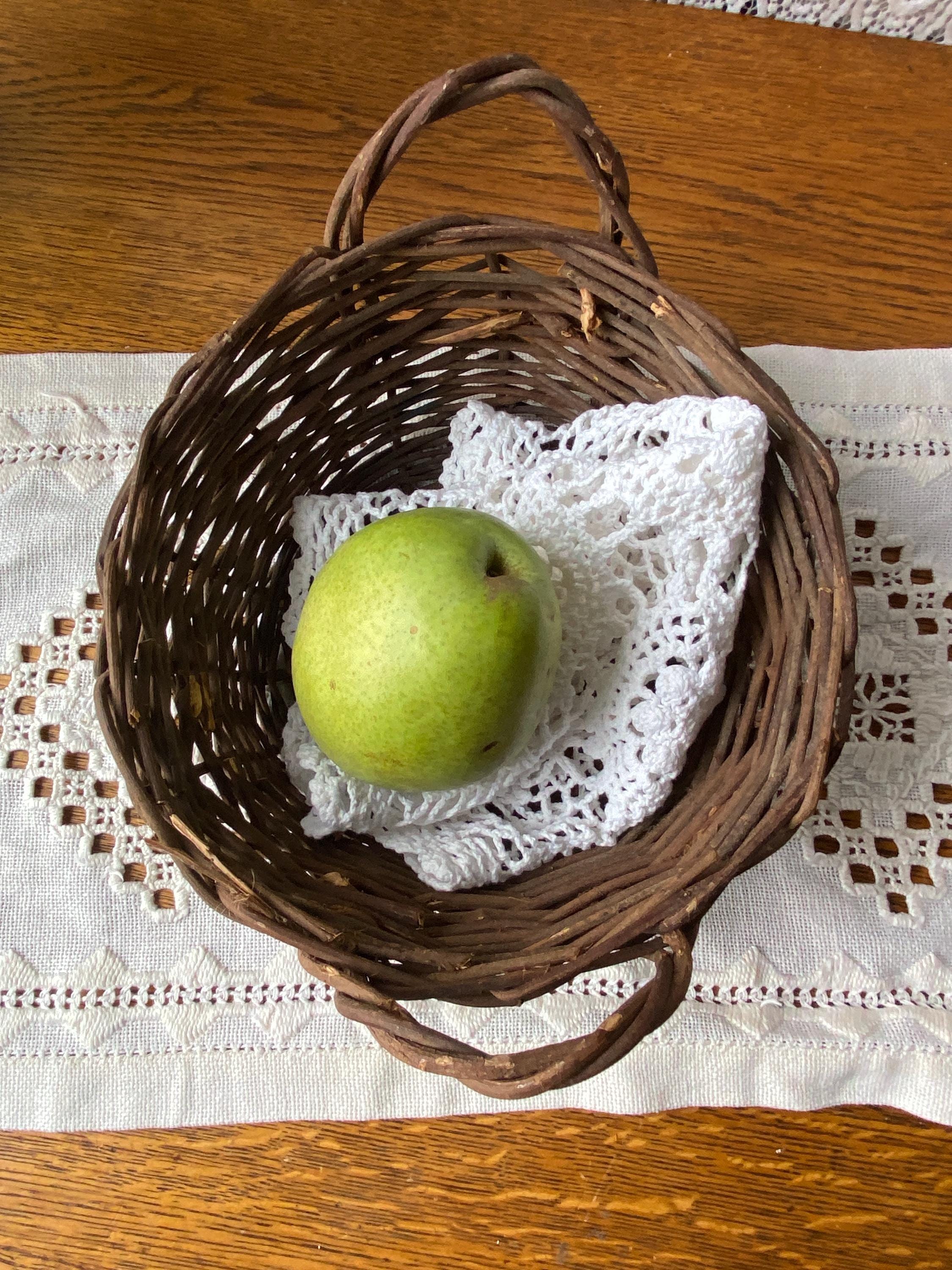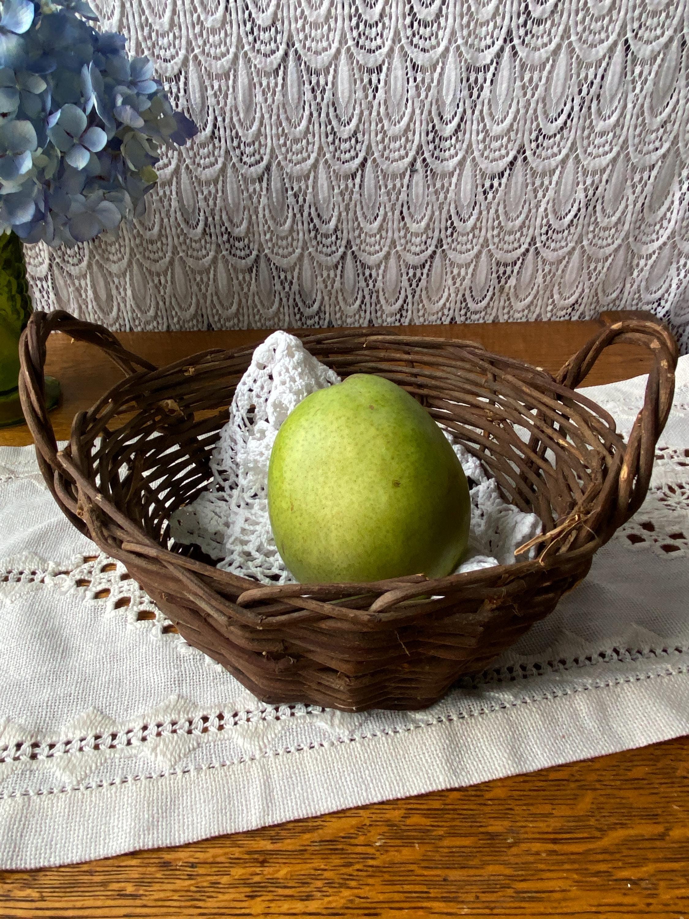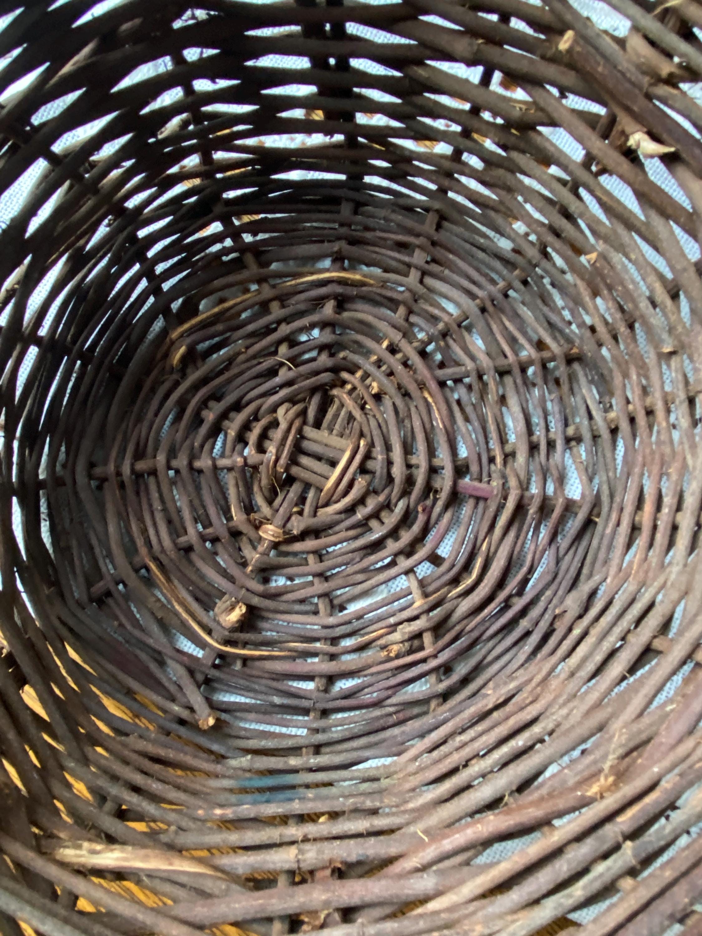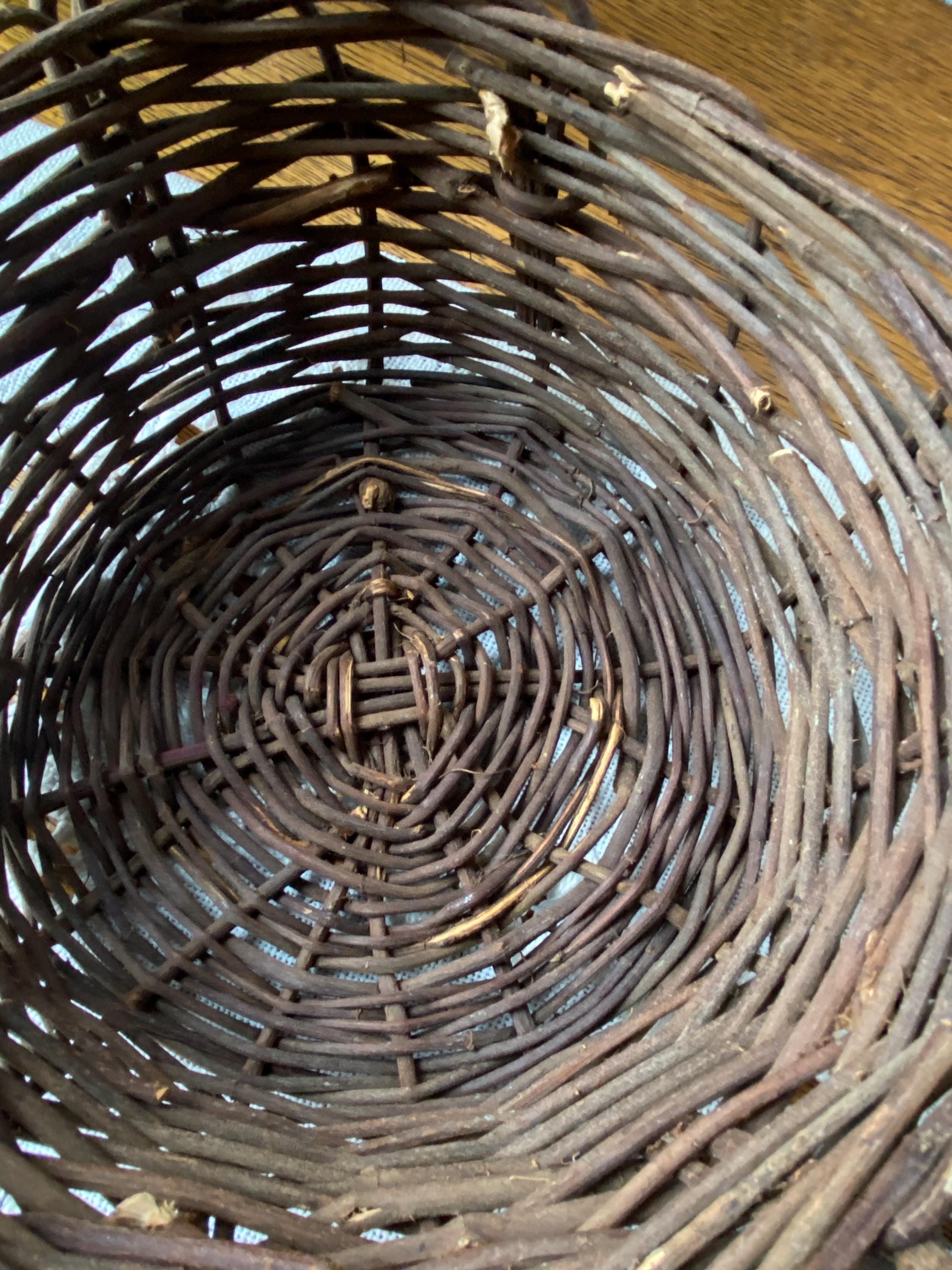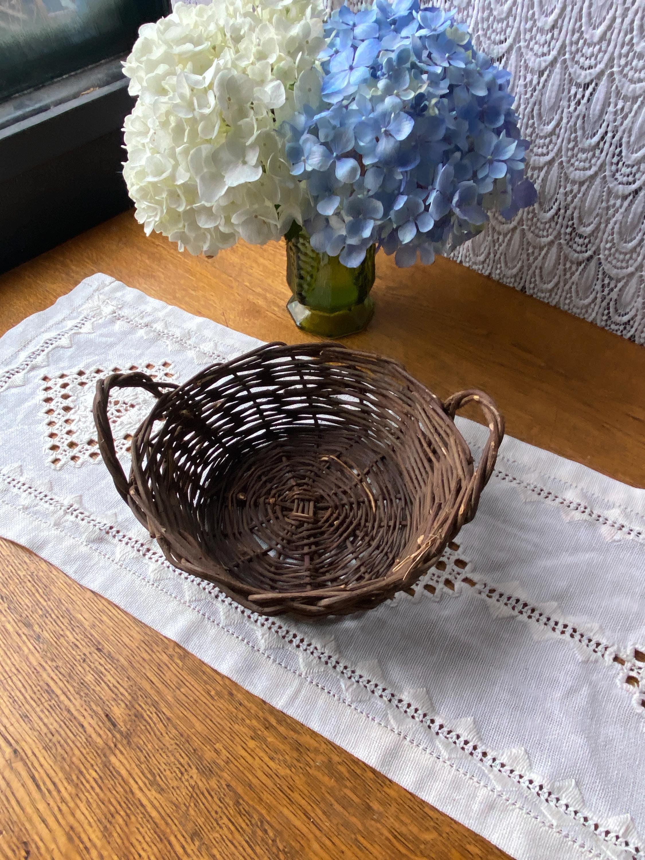 9.5X8X3.5 inches, perfect for displaying fruit or flowers or as a catch-all or organizer. Woven small sticks in a deep brown color. Some wear on stick as shown in photos. All items in my shop are vintage or handmade and may have signs of use, wear, or variation consistent with age or hand production. Please review the photos and video carefully and message me with any questions on condition.