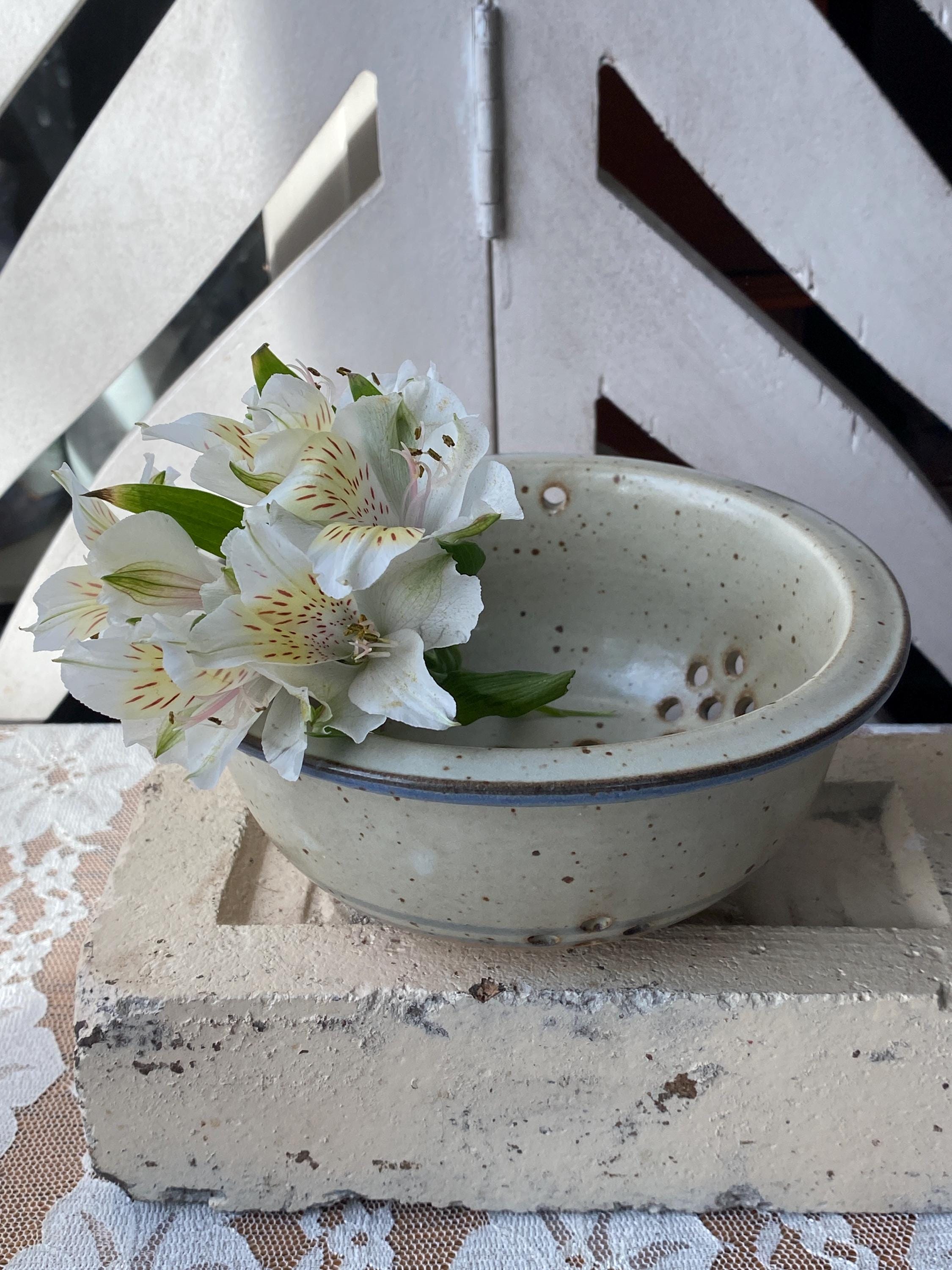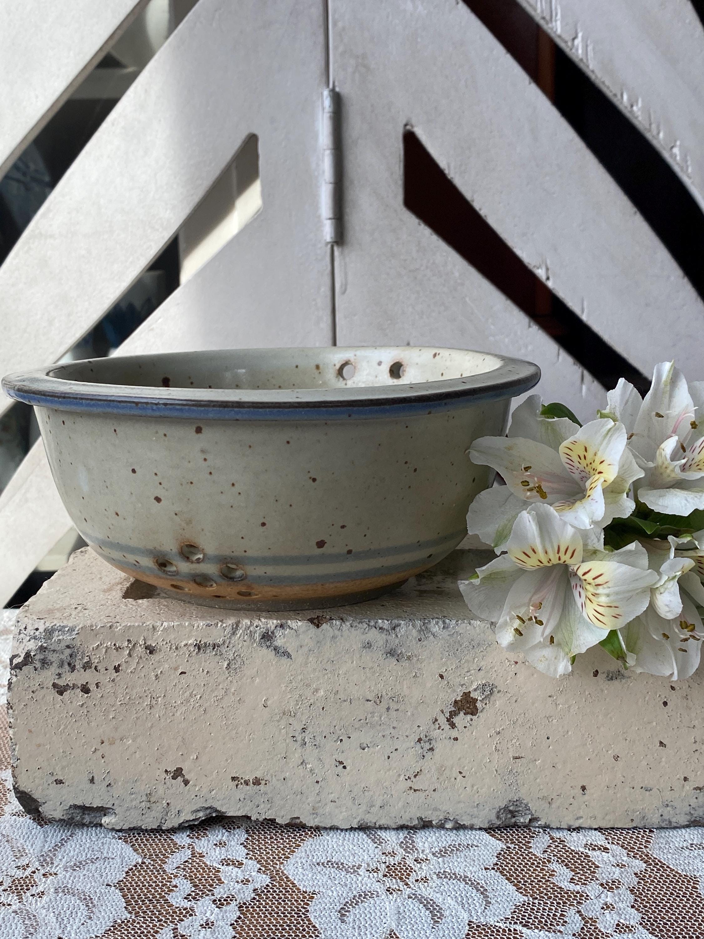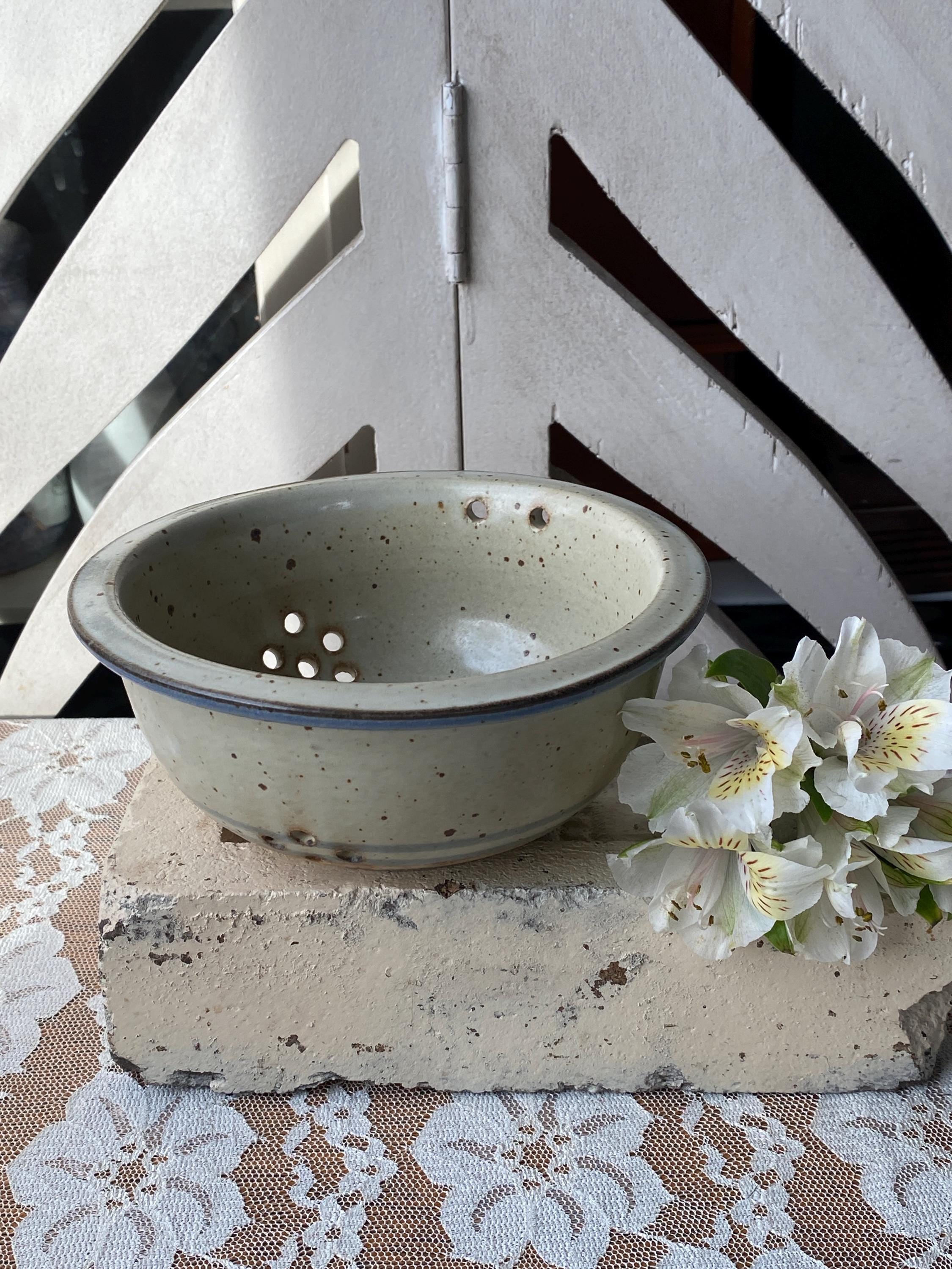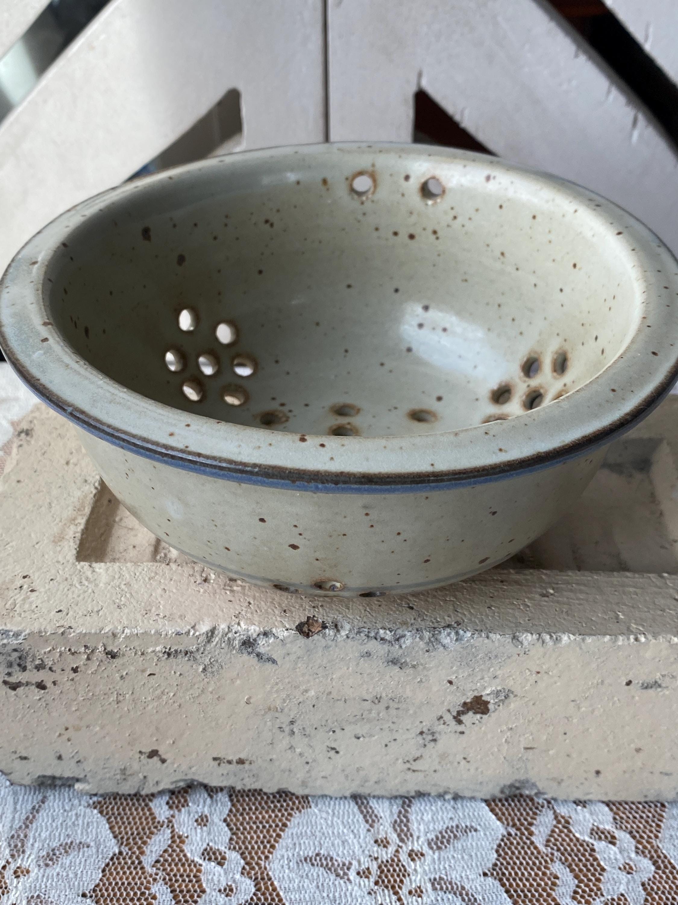 Pretty little pottery piece, perfectly sized for rinsing fresh berries or other small produce items. 6X2.5 inches. Beige/tan speckled background with blue rim. Good pre-loved condition.
