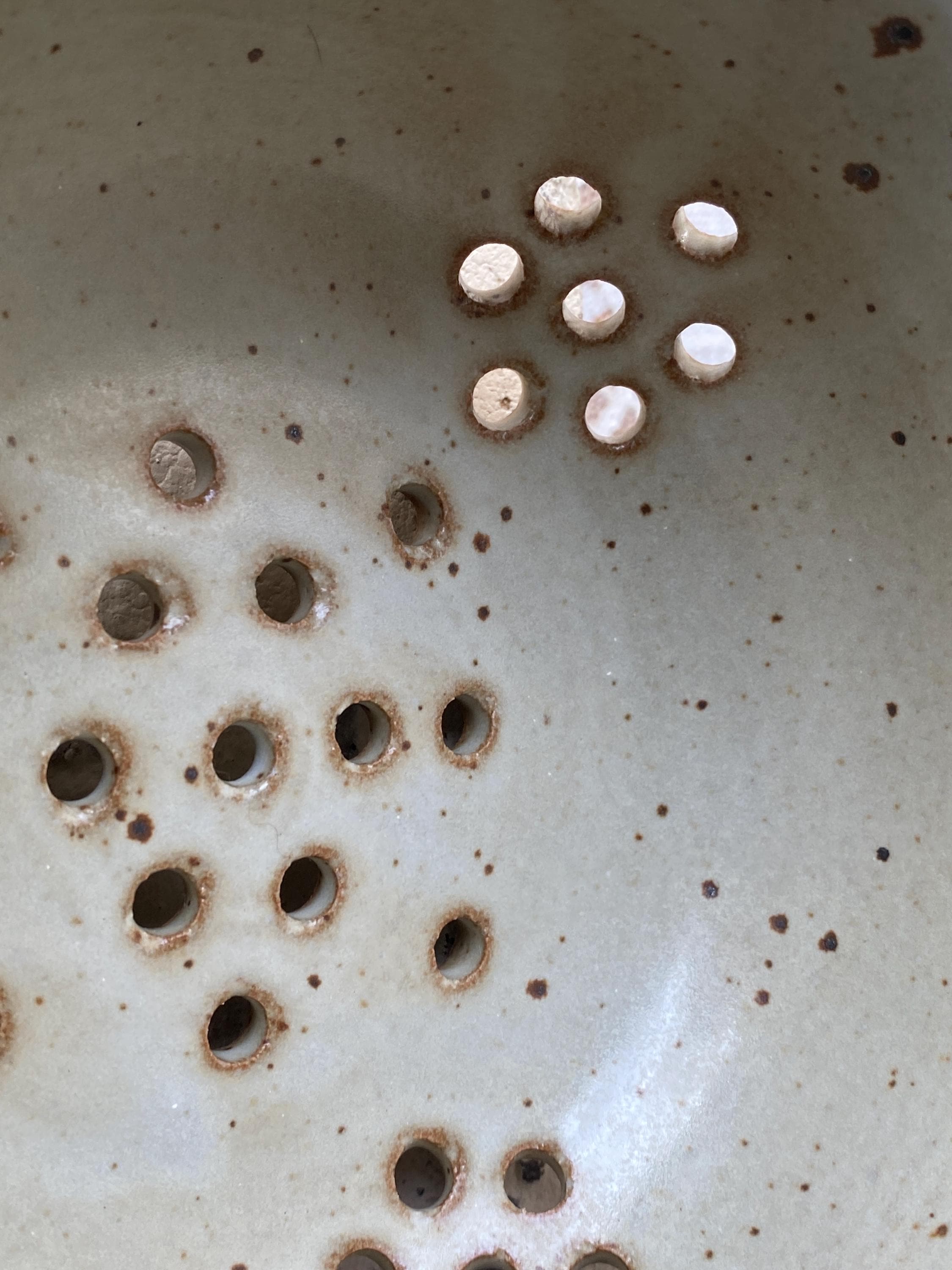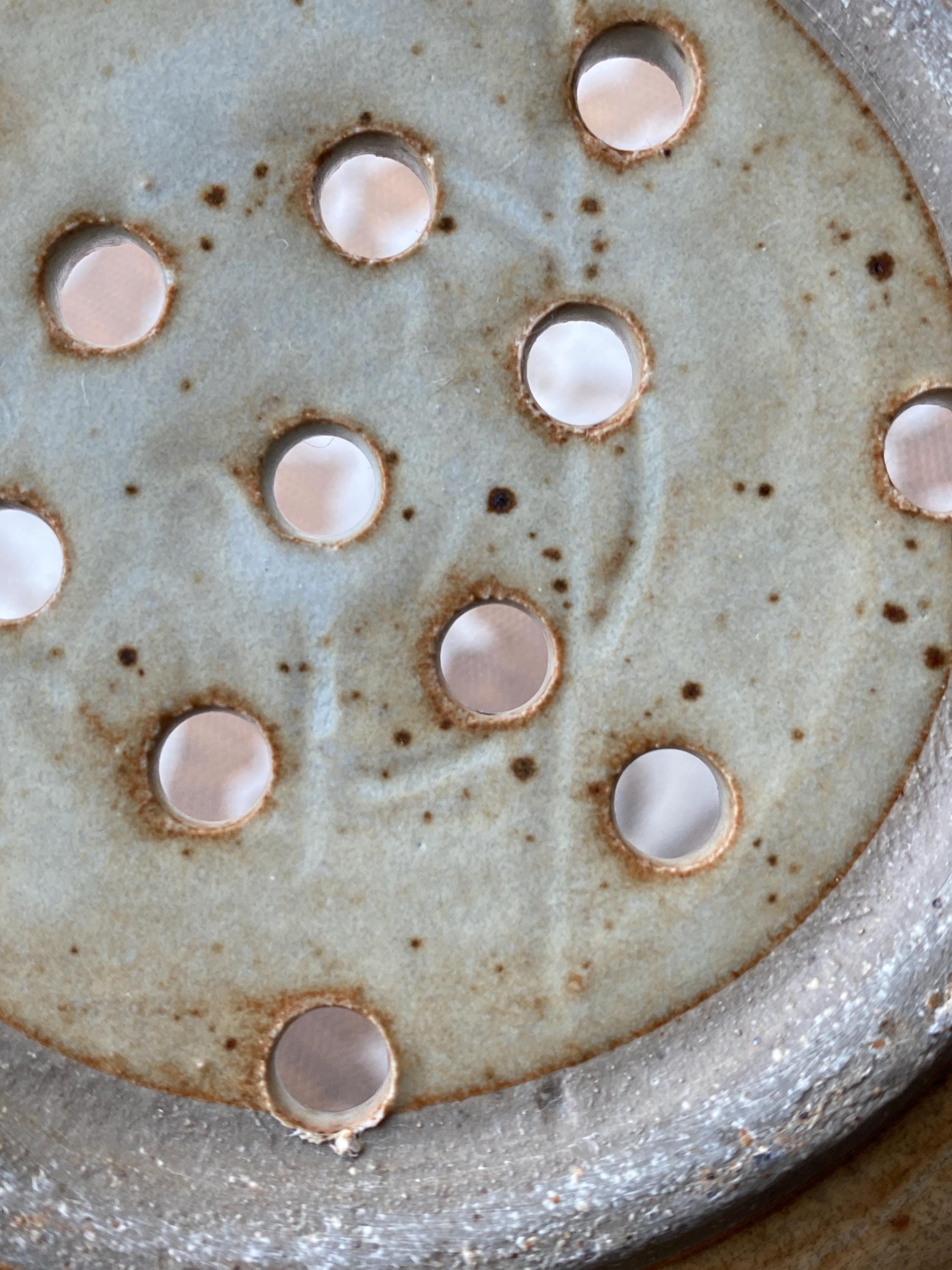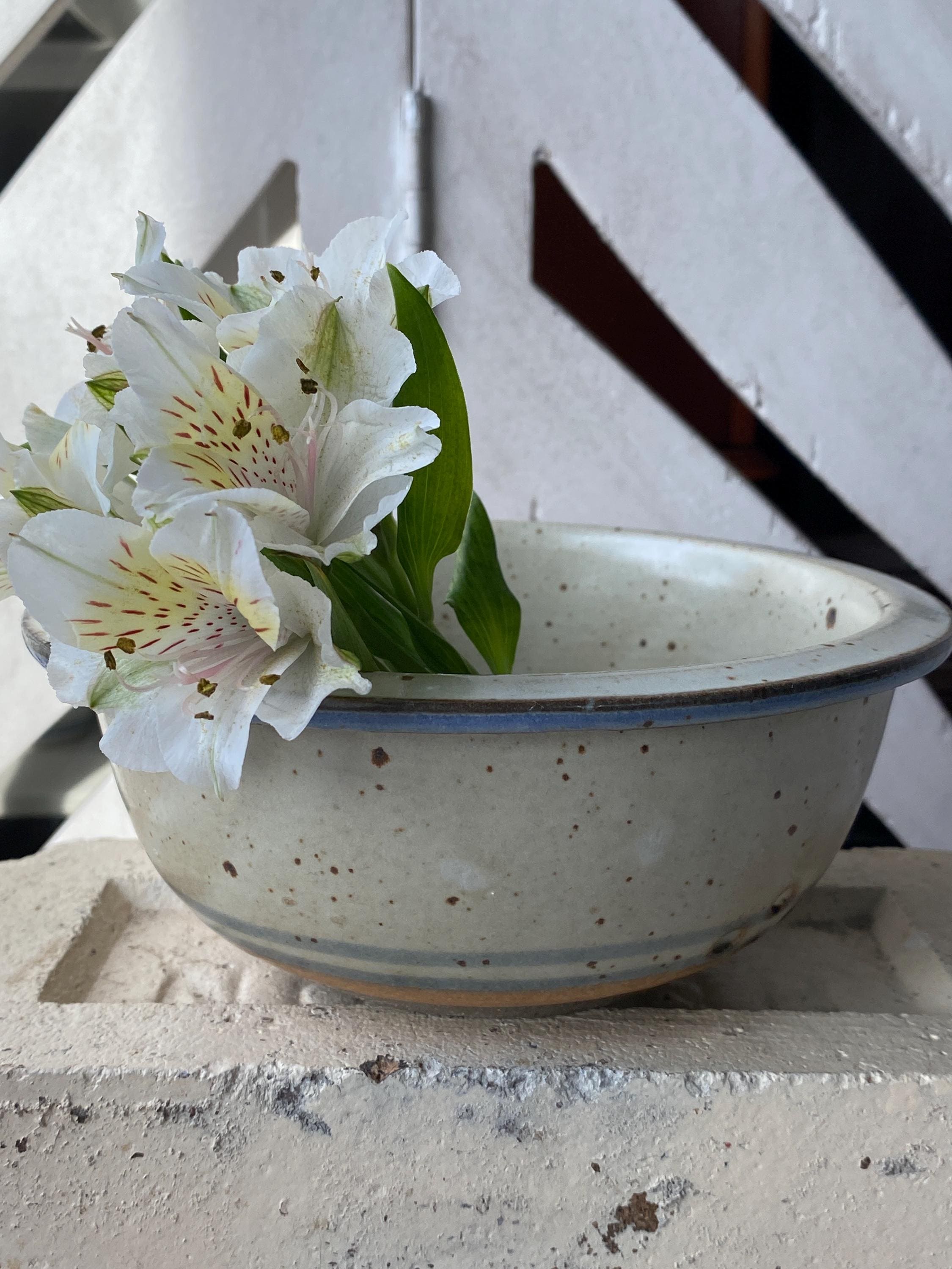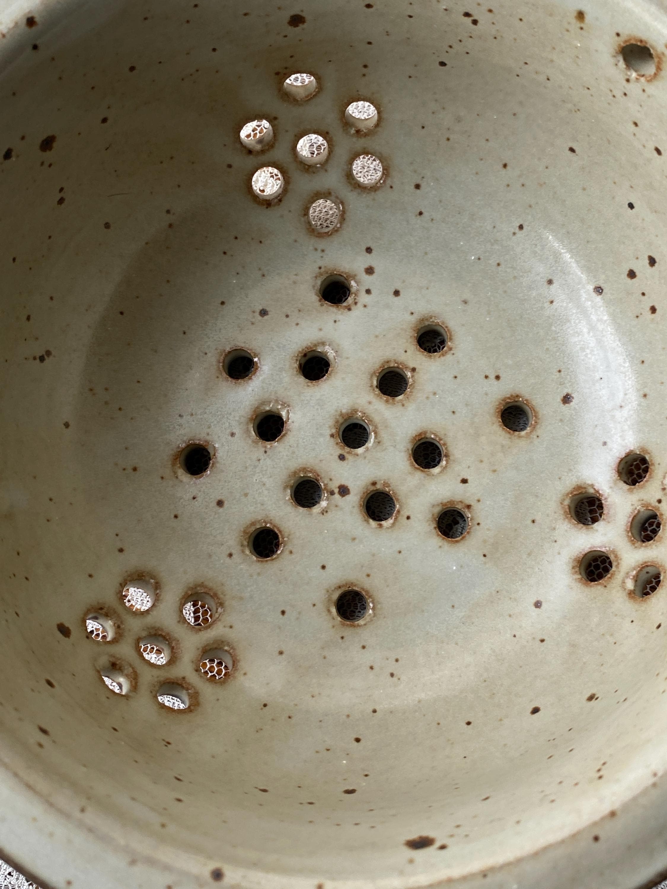 Pretty little pottery piece, perfectly sized for rinsing fresh berries or other small produce items. 6X2.5 inches. Beige/tan speckled background with blue rim. Good pre-loved condition.