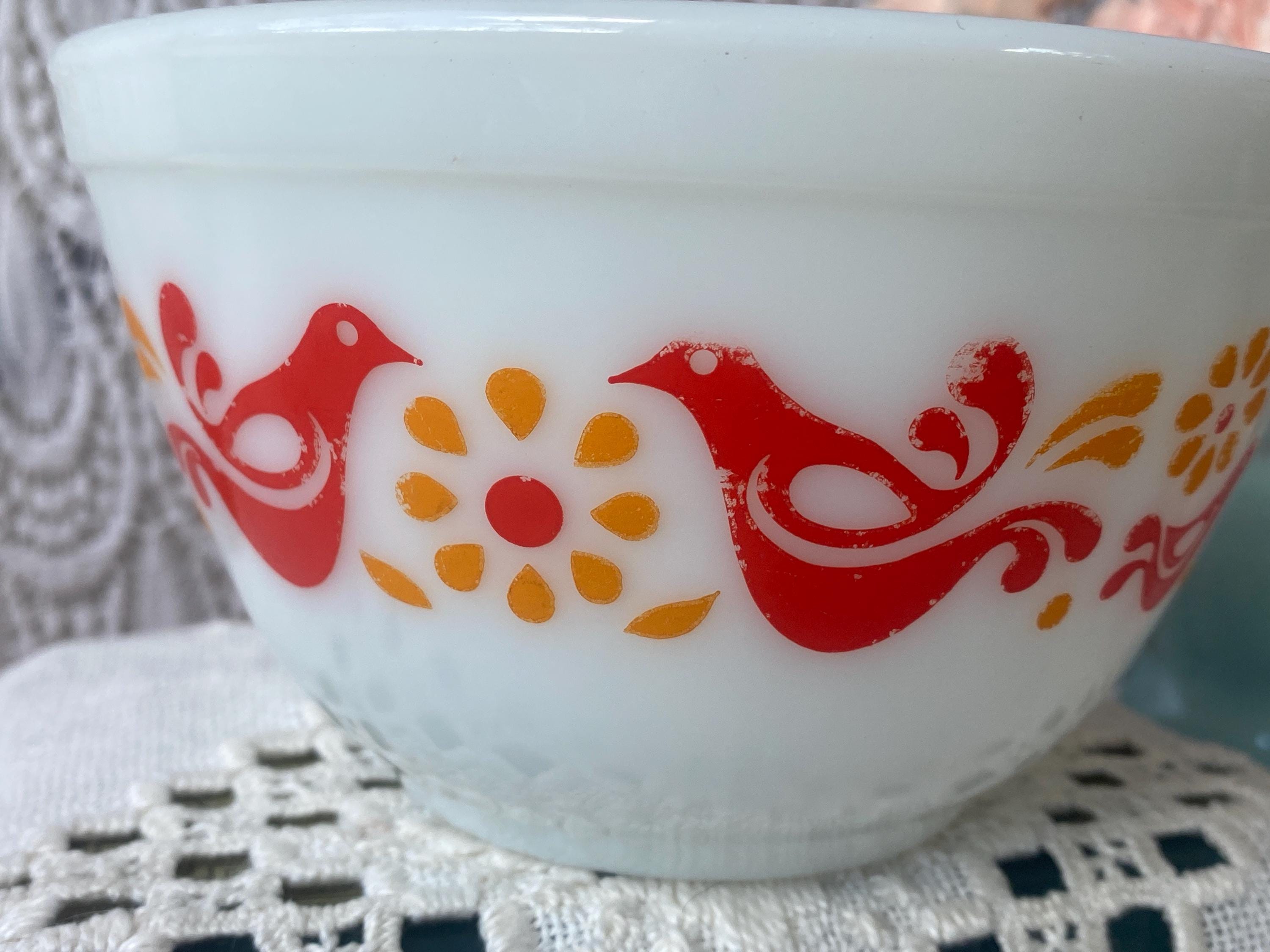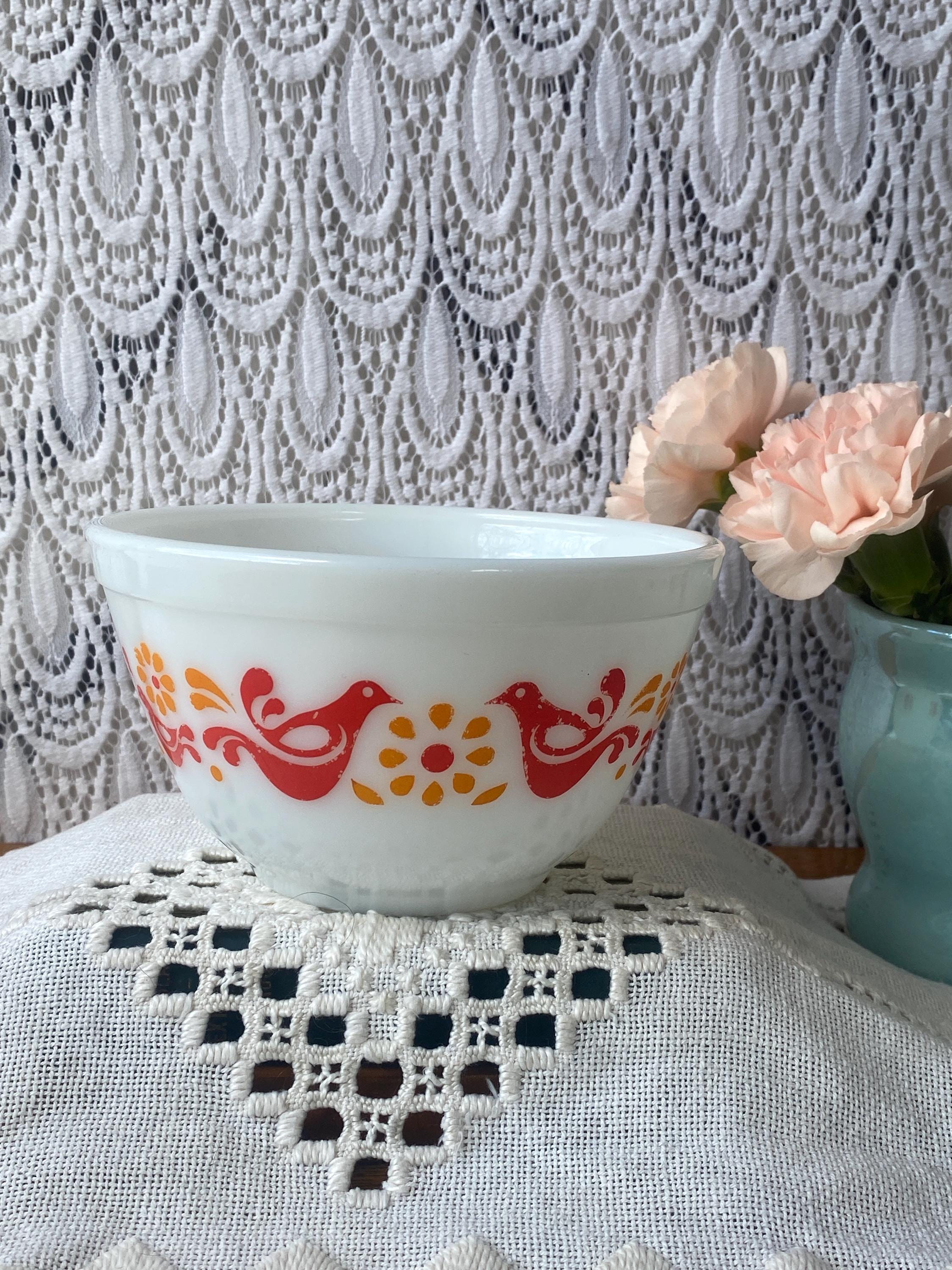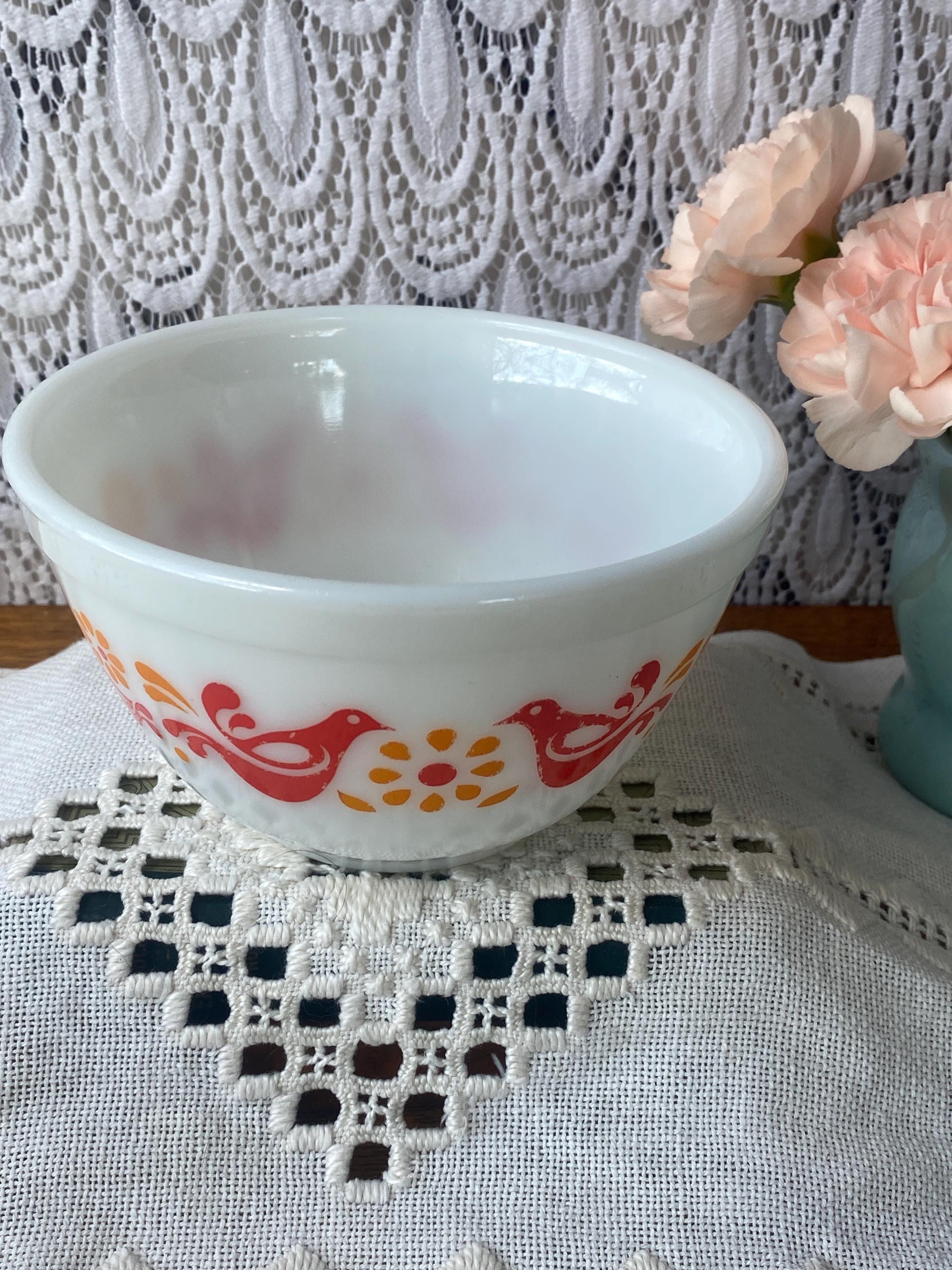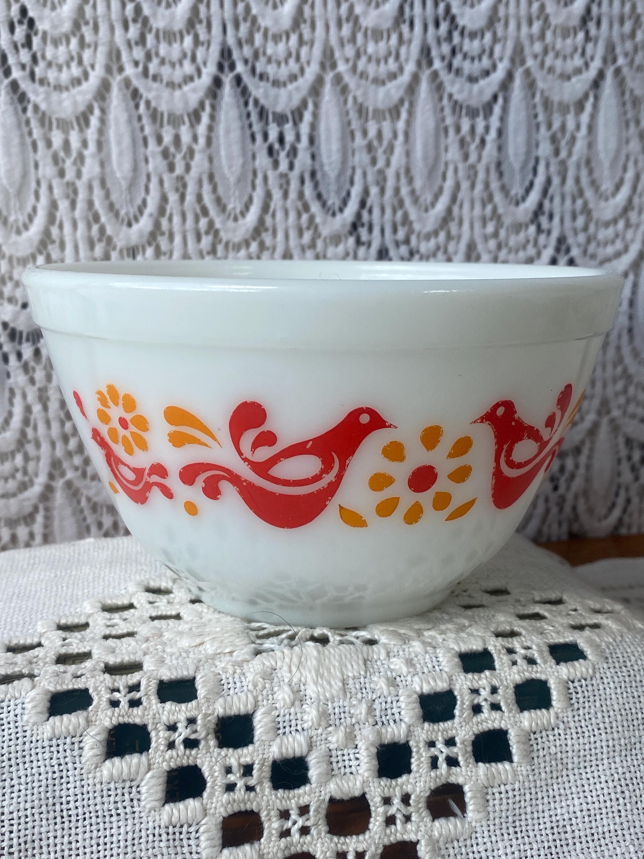 5.5X3 inches, cute red birds and yellow flowers. Some wear on pattern. Perfect for storage, serving, or mixing. All items in my shop are vintage or handmade and may have signs of use, wear, or variation consistent with age or hand production. Please review the photos and video carefully and message me with any questions on condition.
