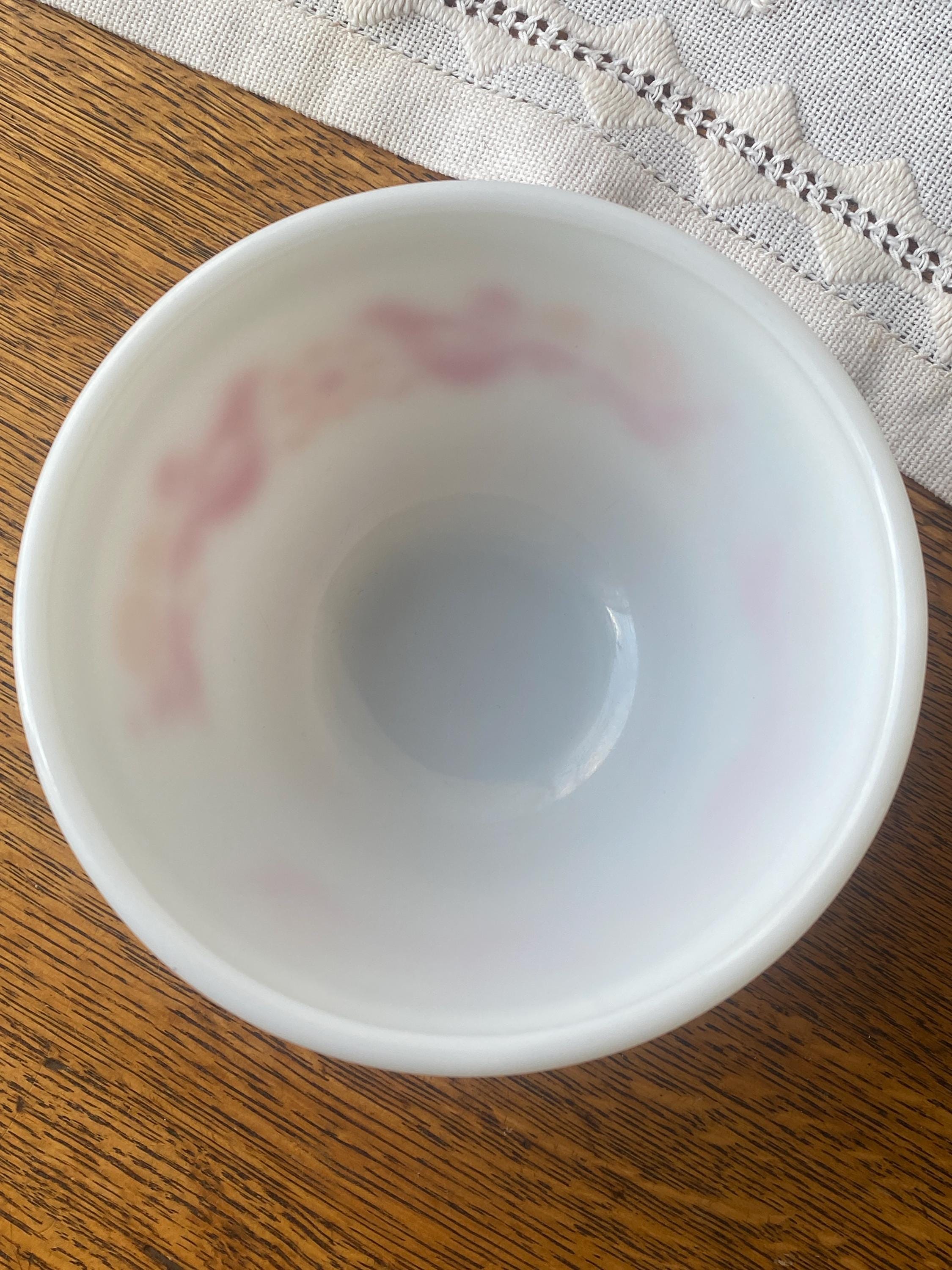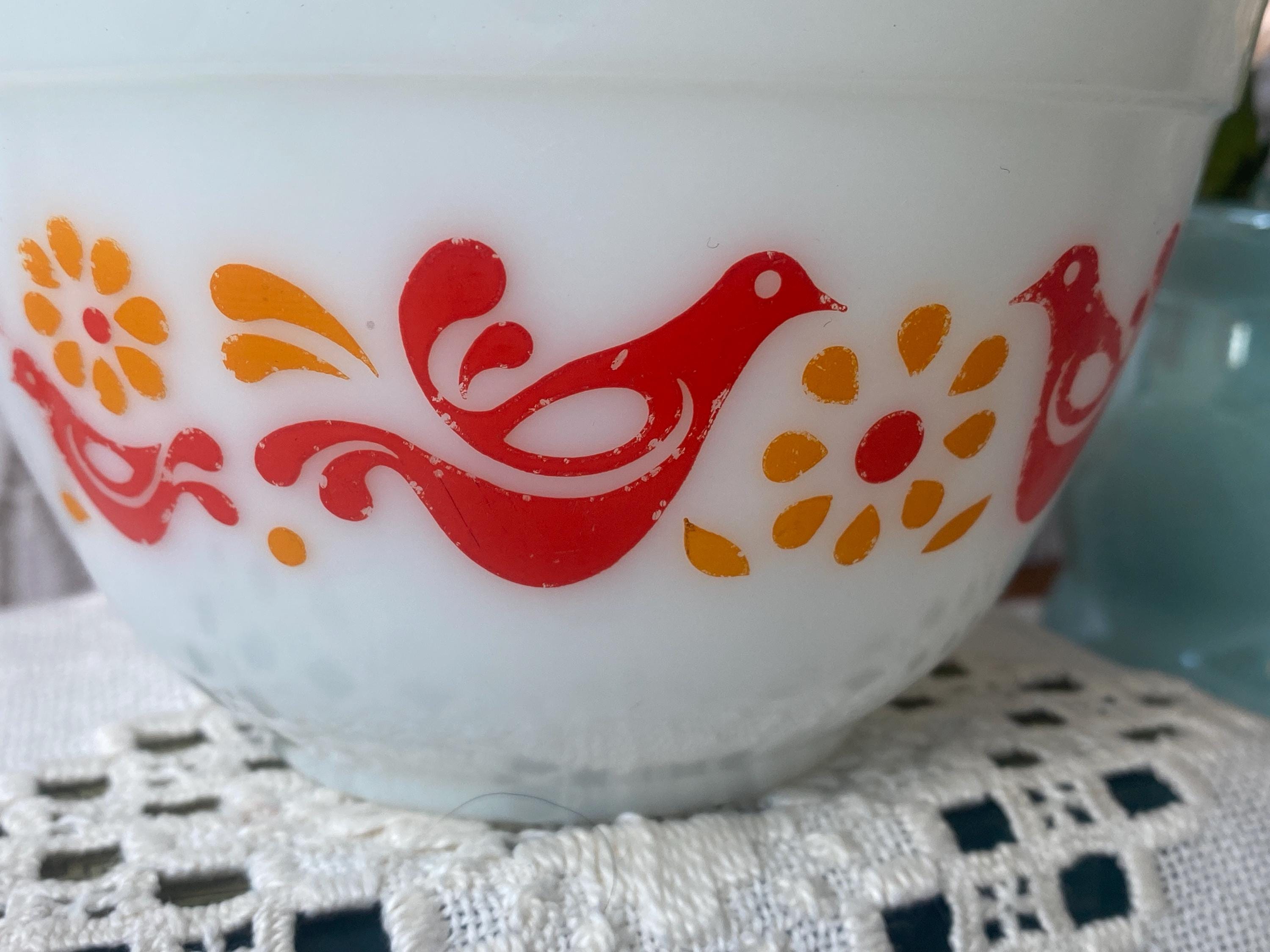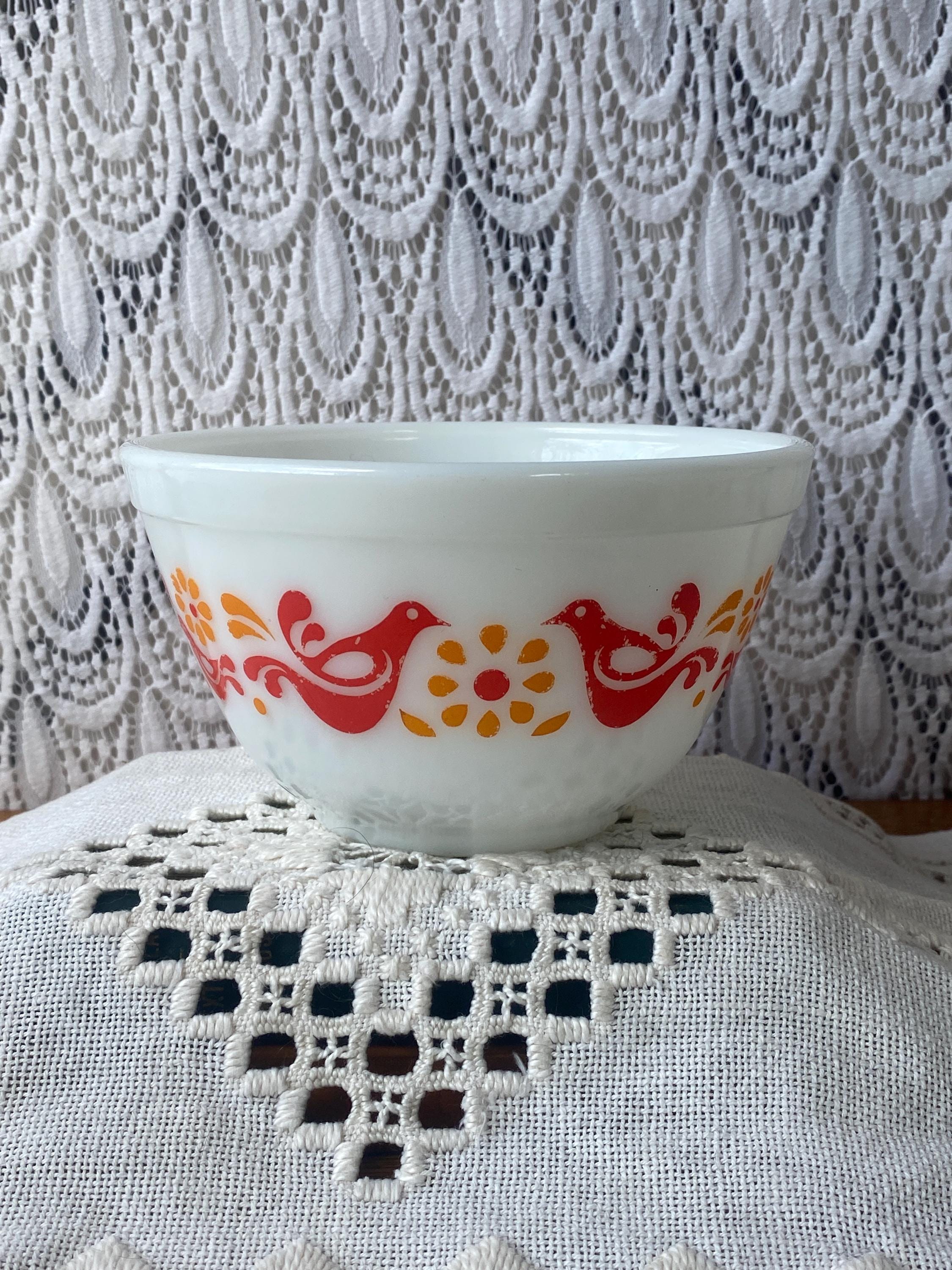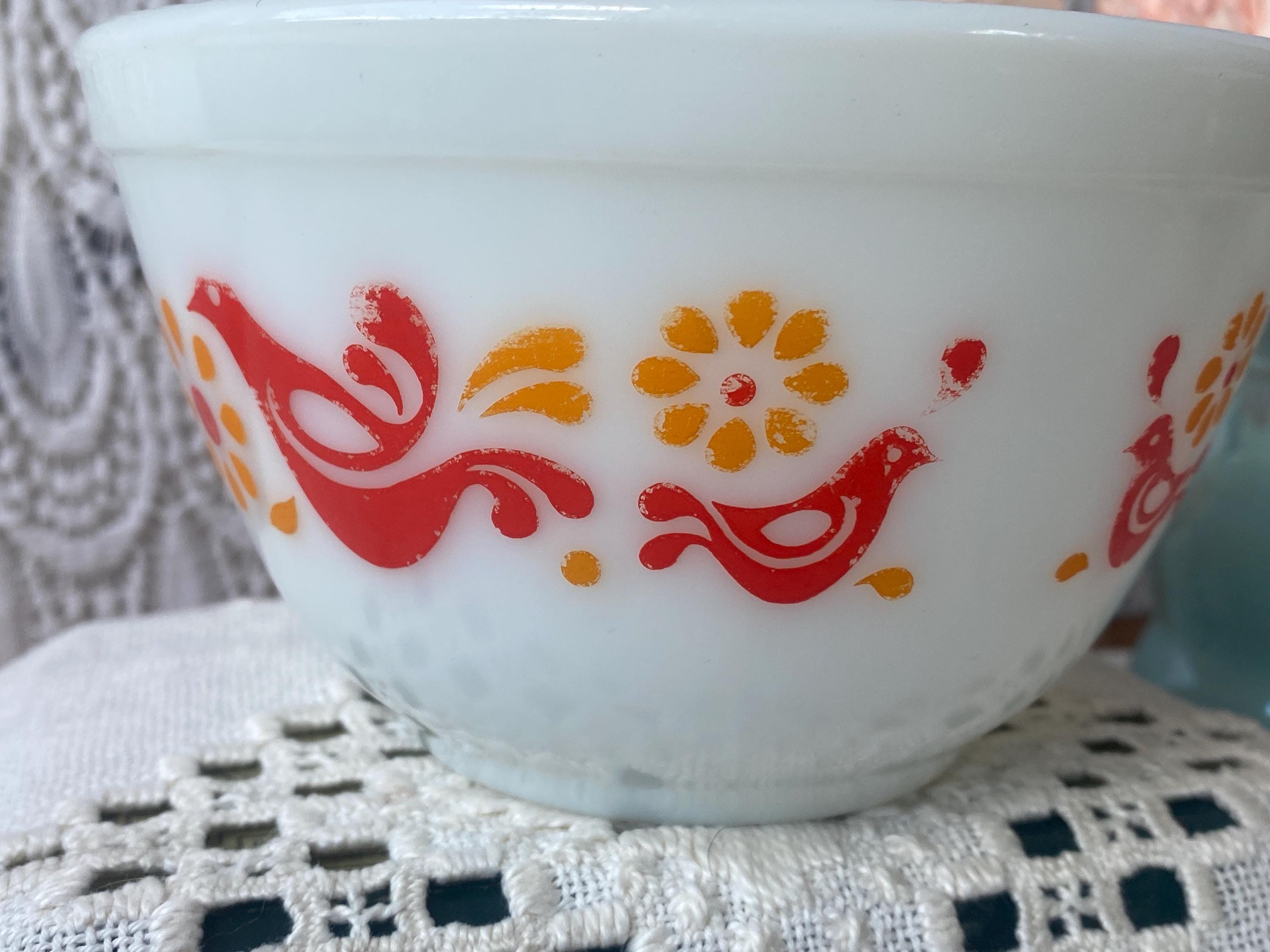 5.5X3 inches, cute red birds and yellow flowers. Some wear on pattern. Perfect for storage, serving, or mixing. All items in my shop are vintage or handmade and may have signs of use, wear, or variation consistent with age or hand production. Please review the photos and video carefully and message me with any questions on condition.