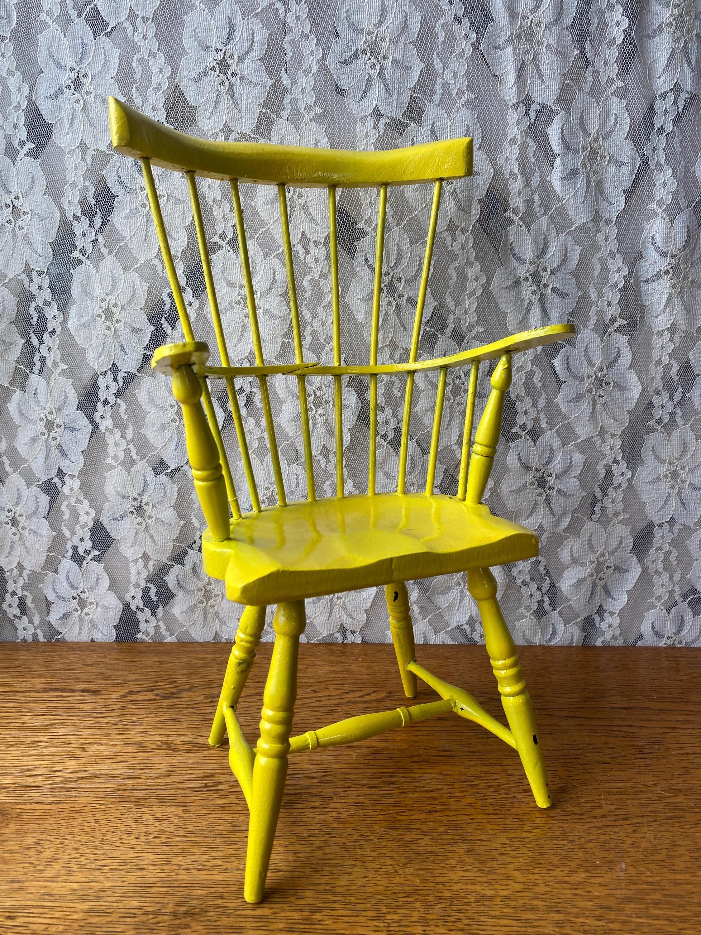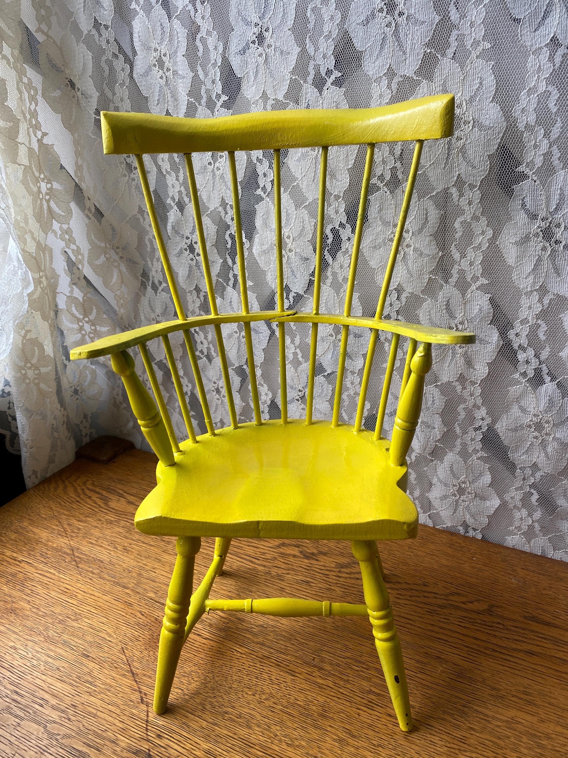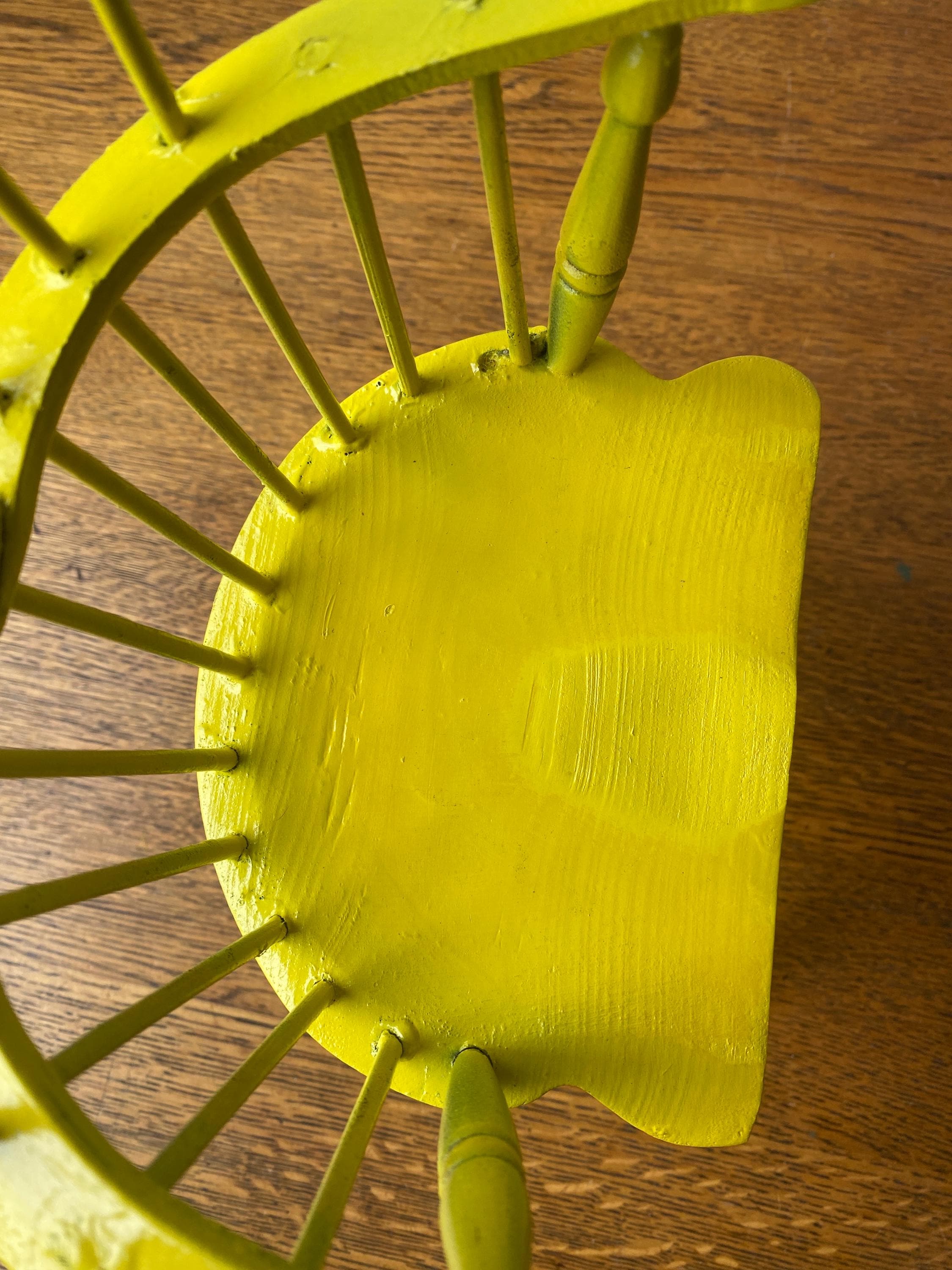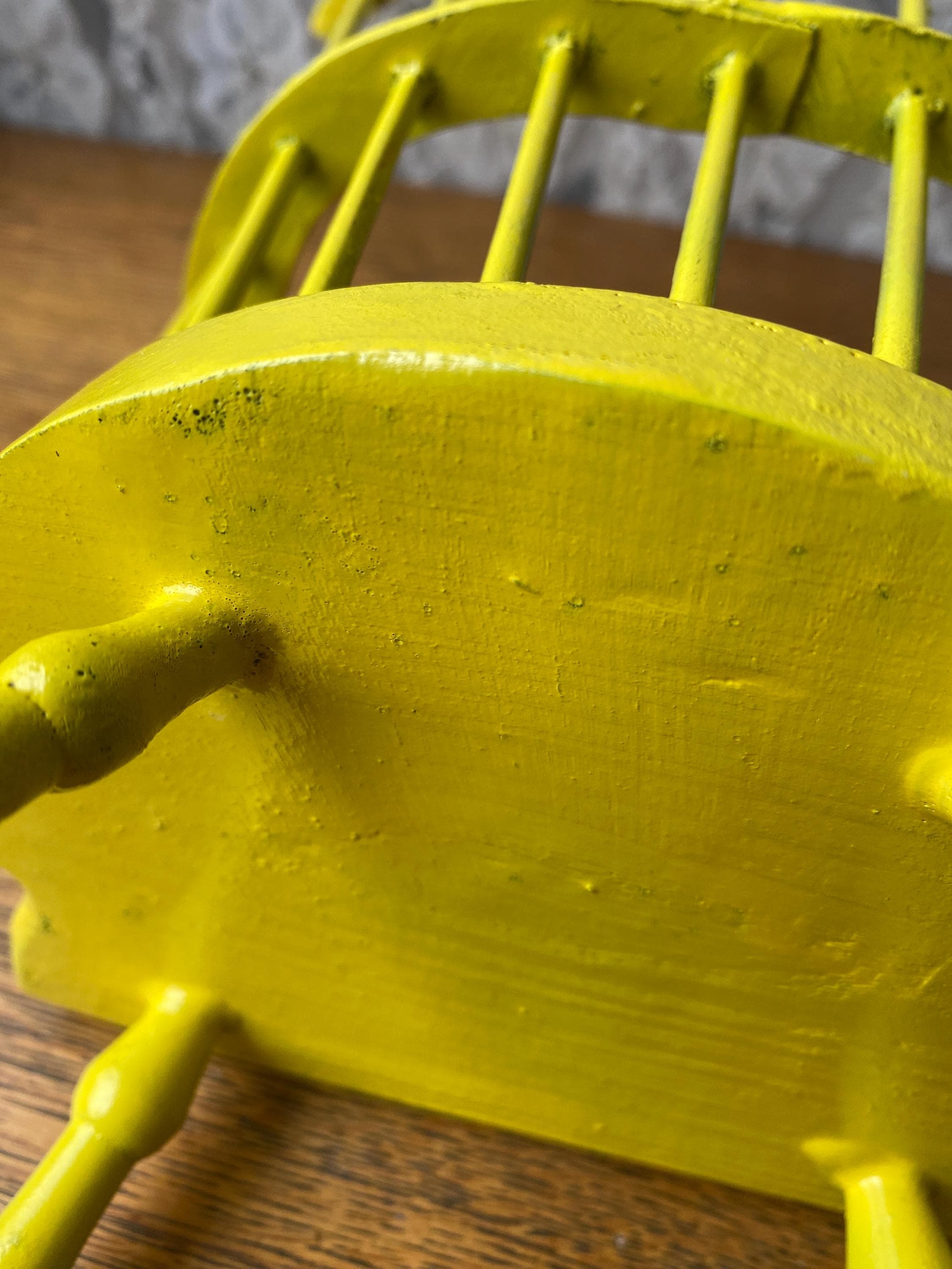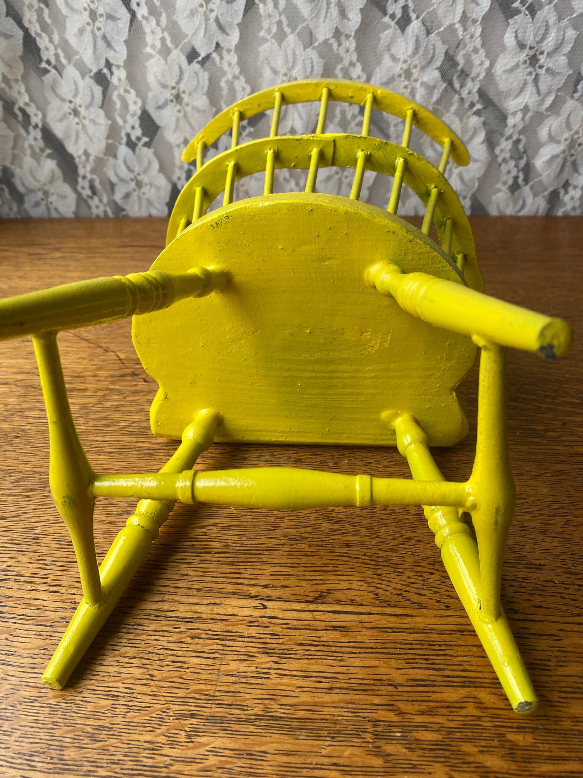6X4 seat, 13 inches tall. Yellow, shiny paint, lightweight wood. This item has been hand-painted and shows signs of wear and use/ see photos. All items in my shop are vintage or handmade and may have signs of use, wear, or variation consistent with age or hand production. Please review the photos and video carefully and message me with any questions on condition.