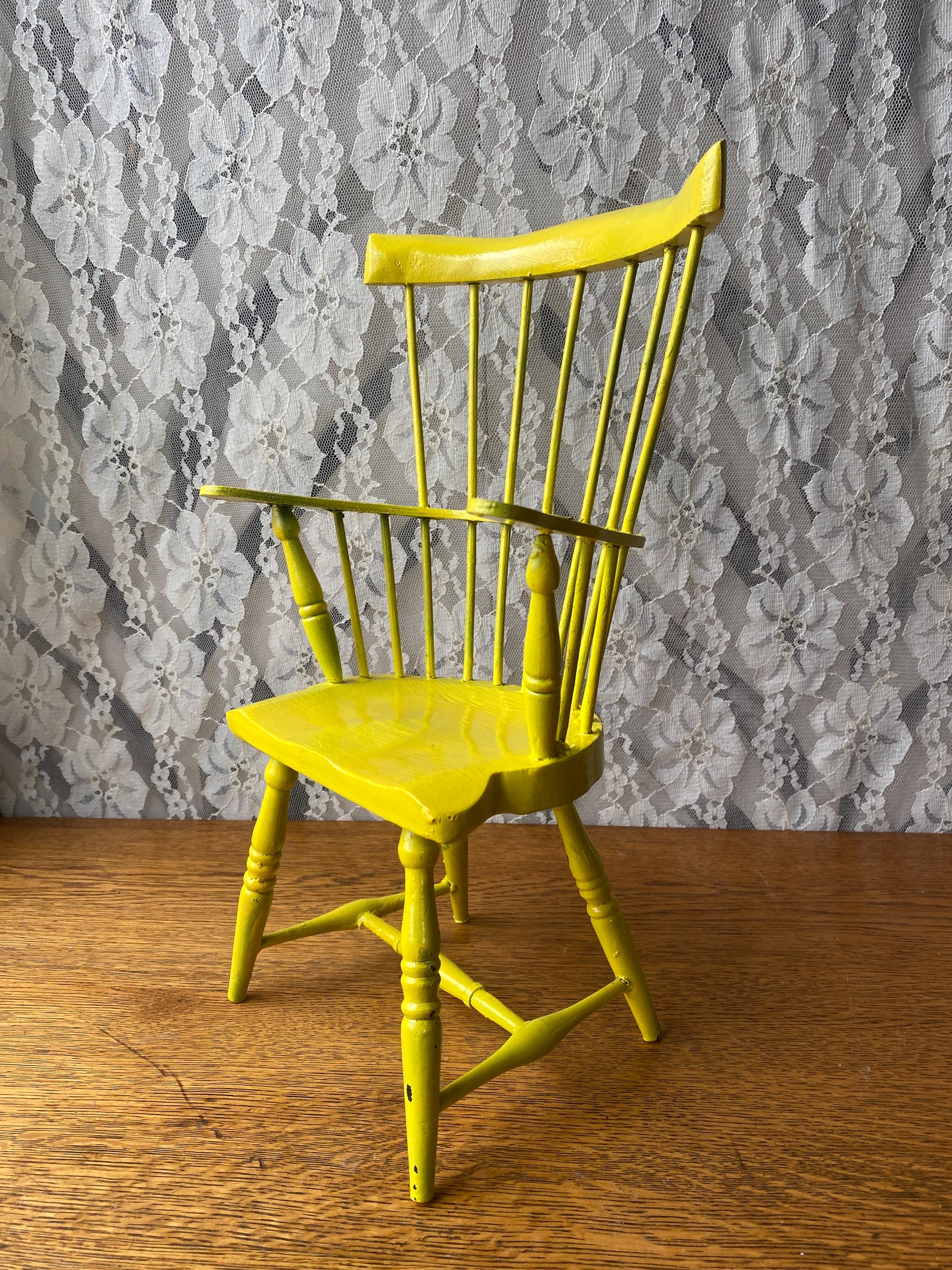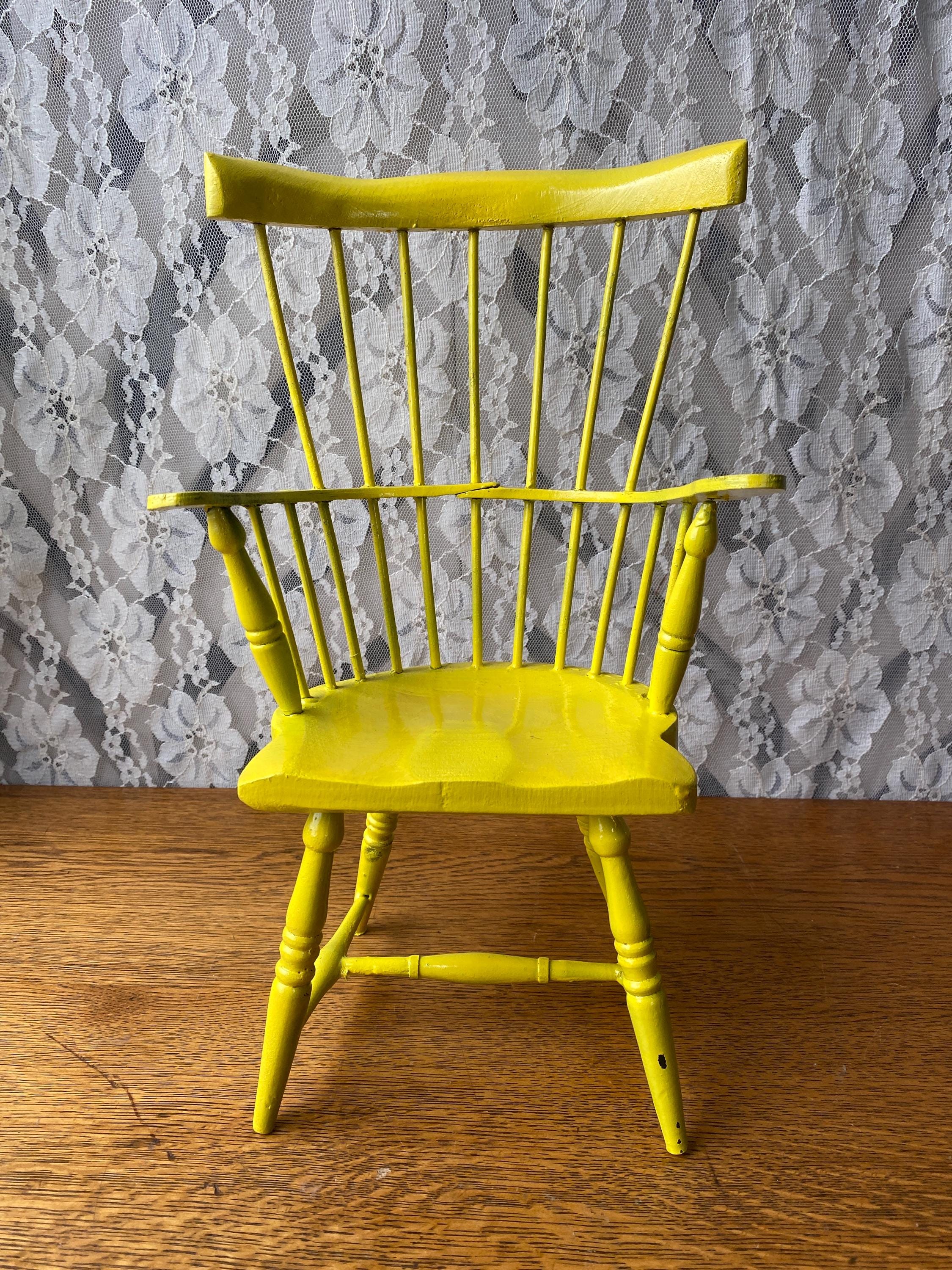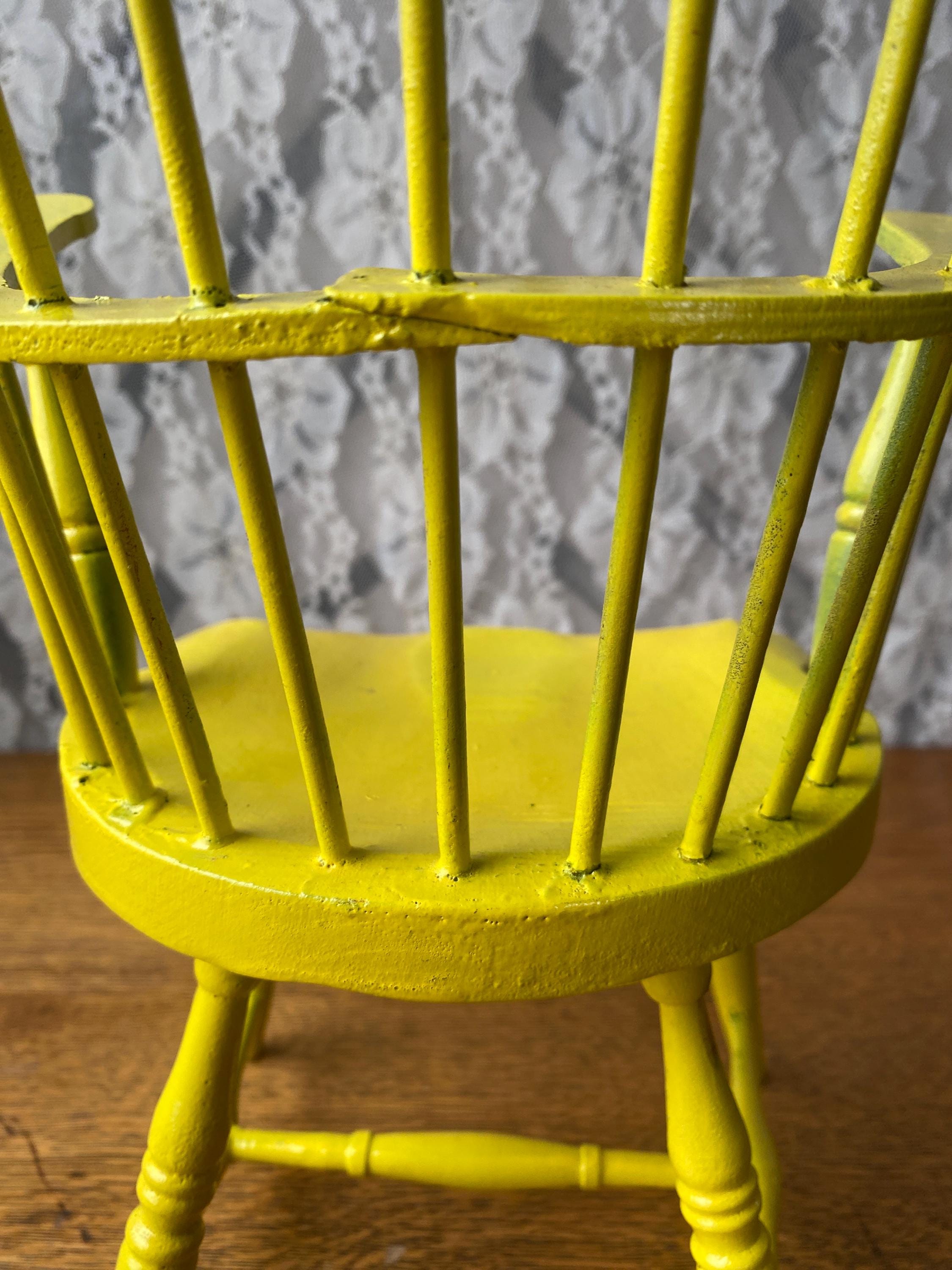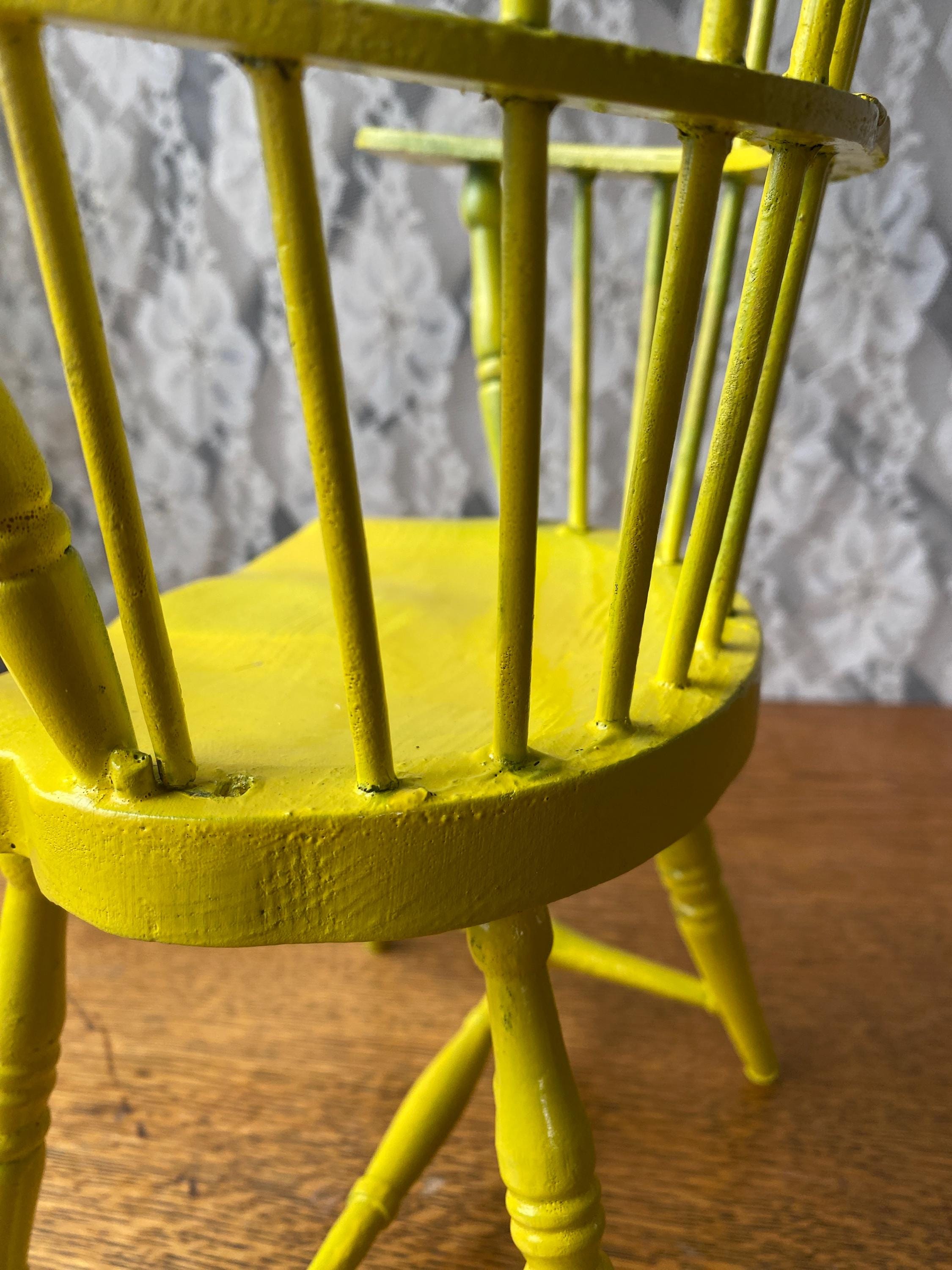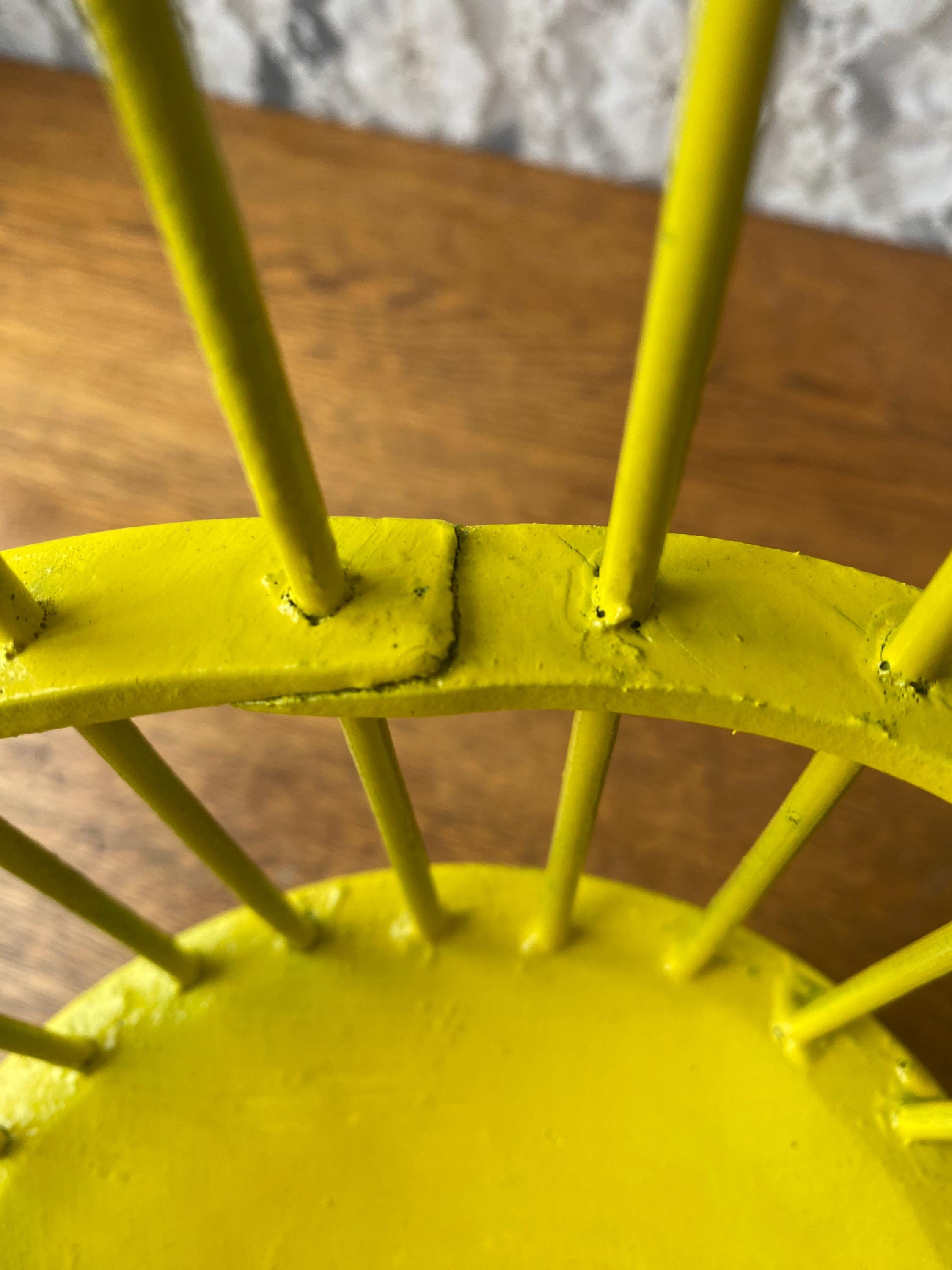 6X4 seat, 13 inches tall. Yellow, shiny paint, lightweight wood. This item has been hand-painted and shows signs of wear and use/ see photos. All items in my shop are vintage or handmade and may have signs of use, wear, or variation consistent with age or hand production. Please review the photos and video carefully and message me with any questions on condition.