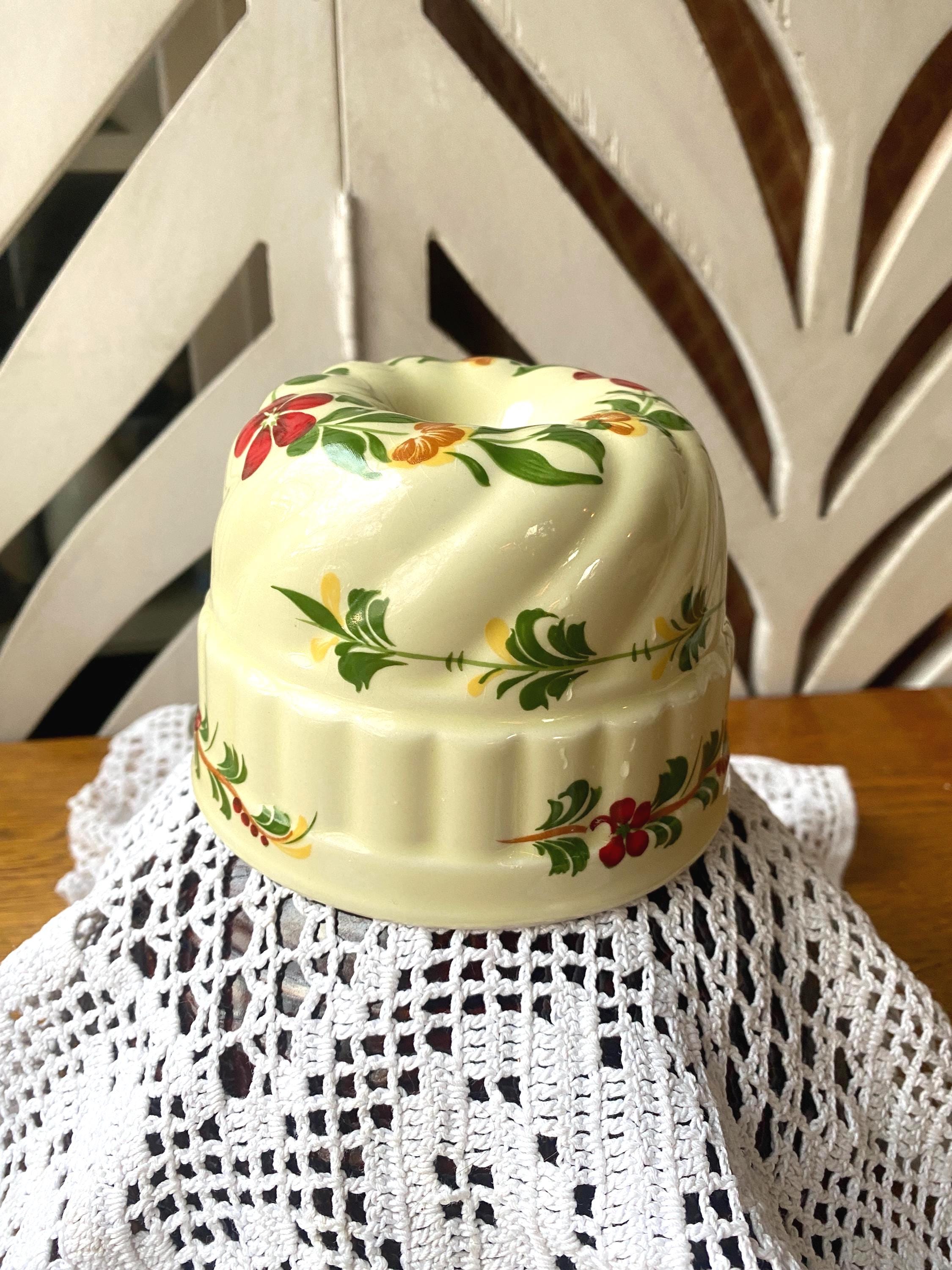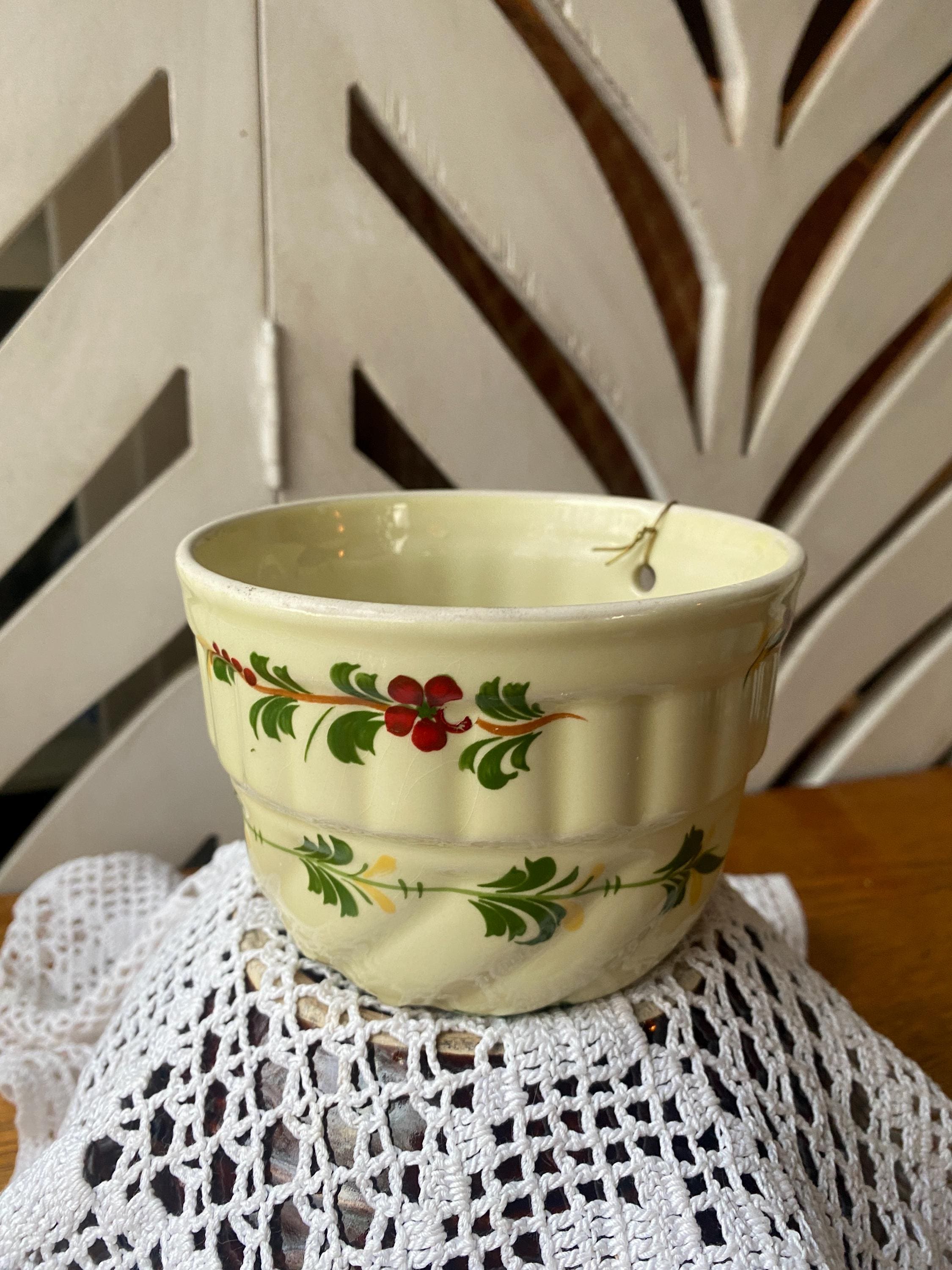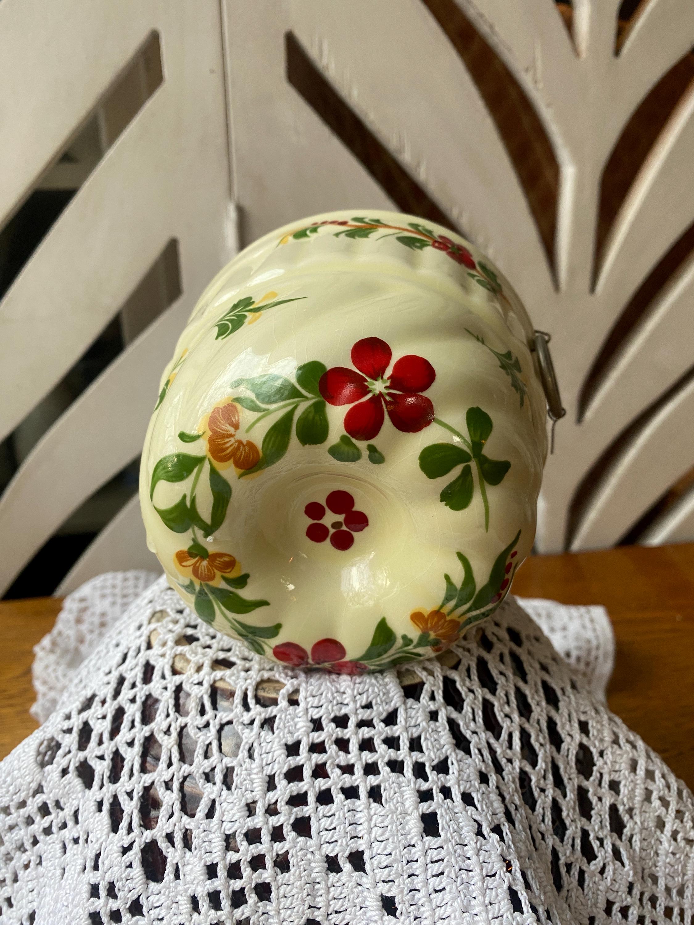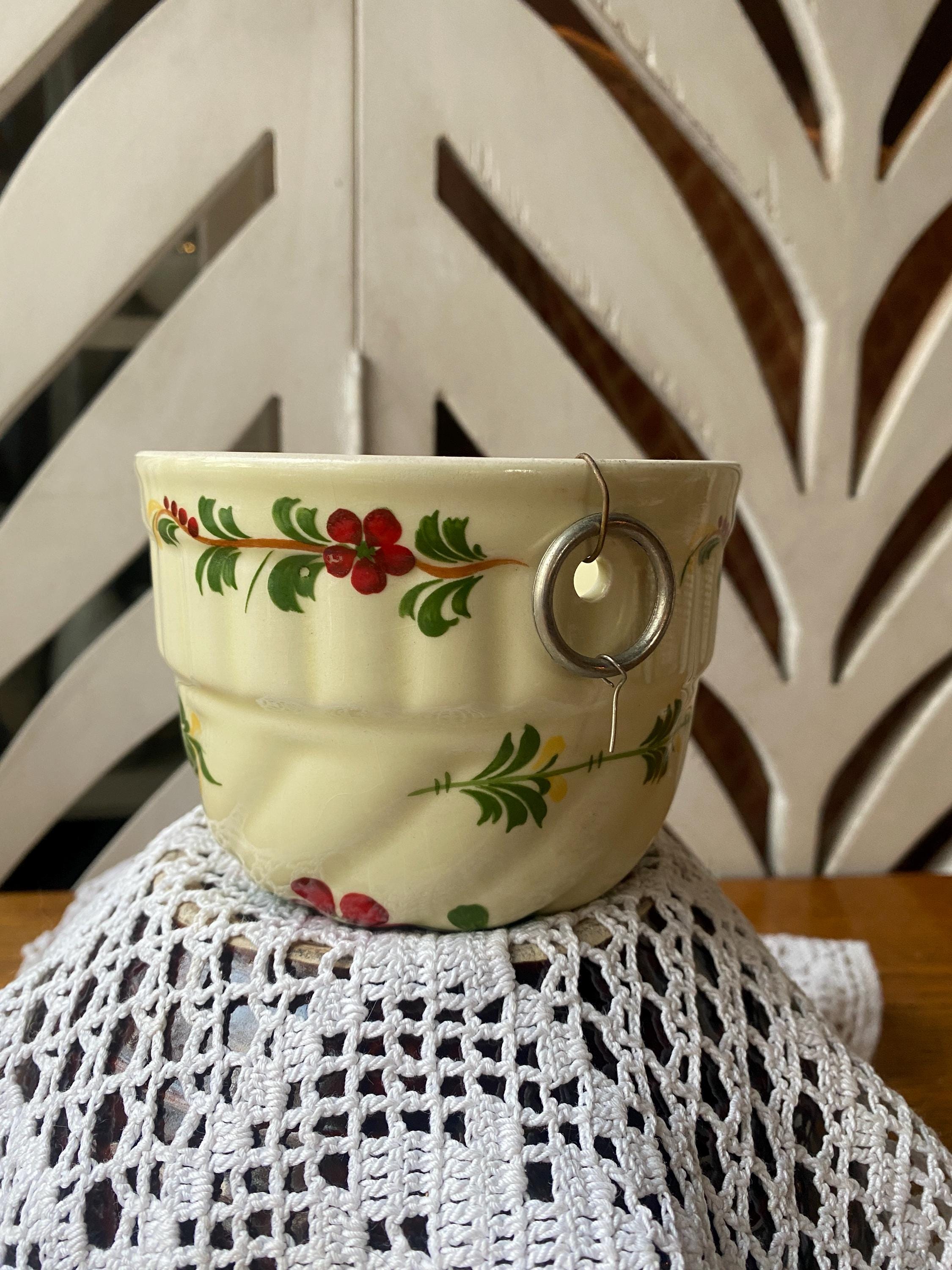 4.5X3 inches, little ring for hanging as wall decor. Vintage floral pattern makes this a perfect fit in a cozy, country or cottage style kitchen. Some wear etc. consistent with age.