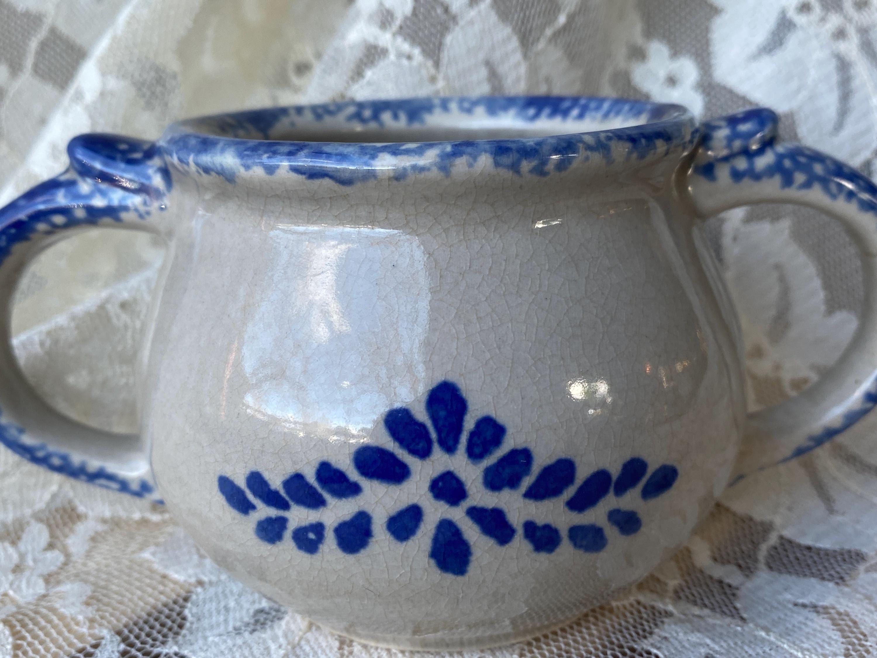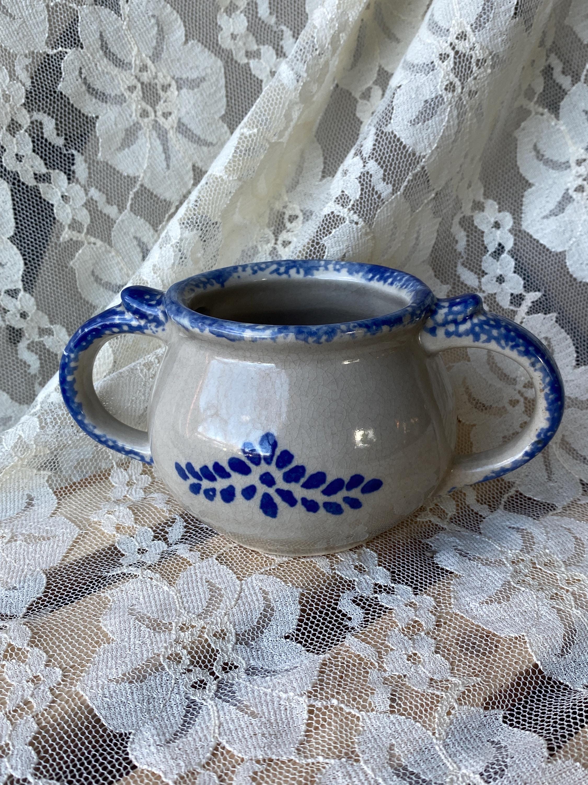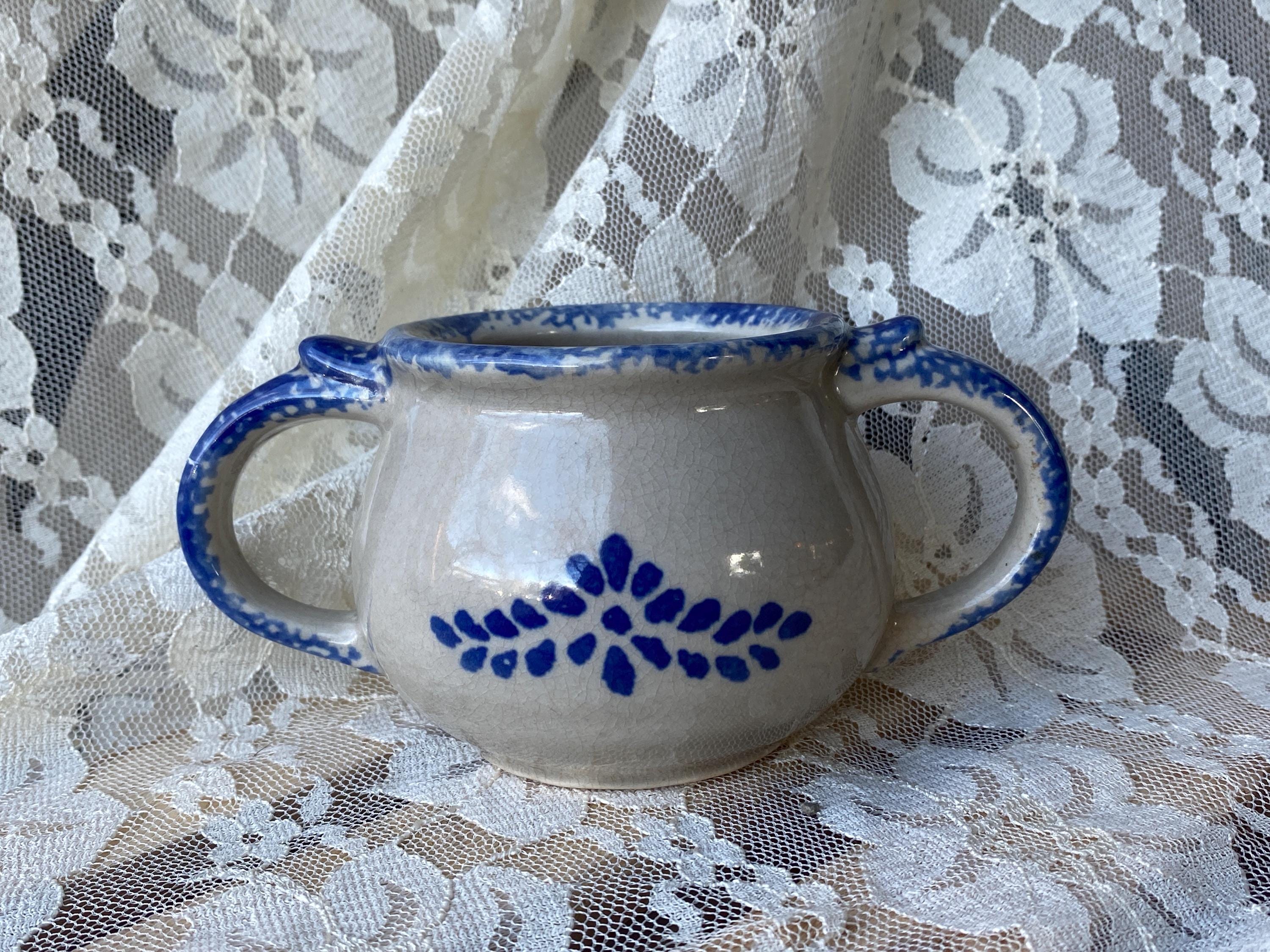 6X3X3 inches, sturdy stoneware handled bowl or mug with a blue spongeware folk art pattern. Good vintage condition.
