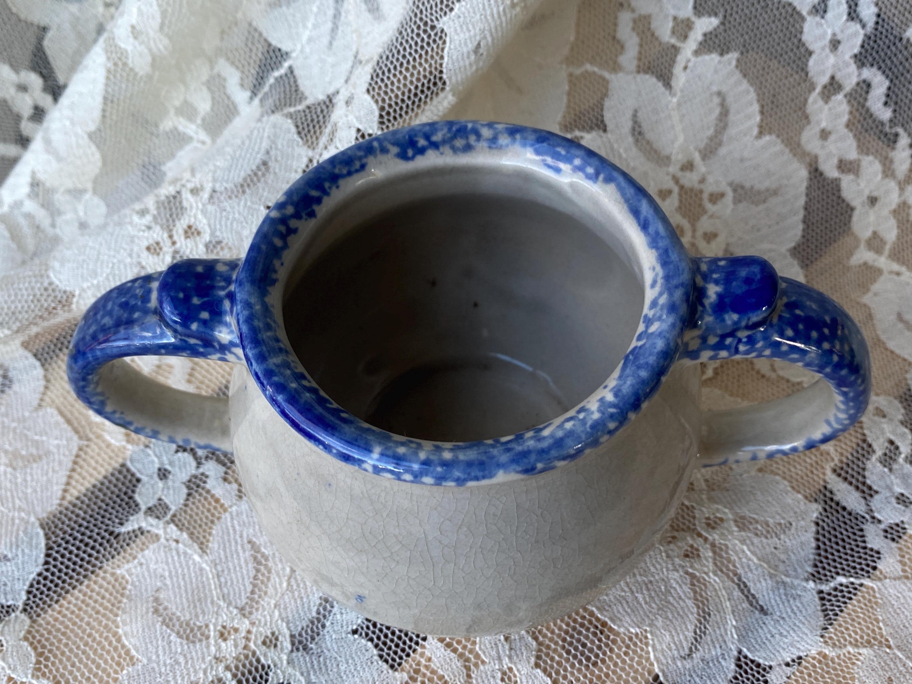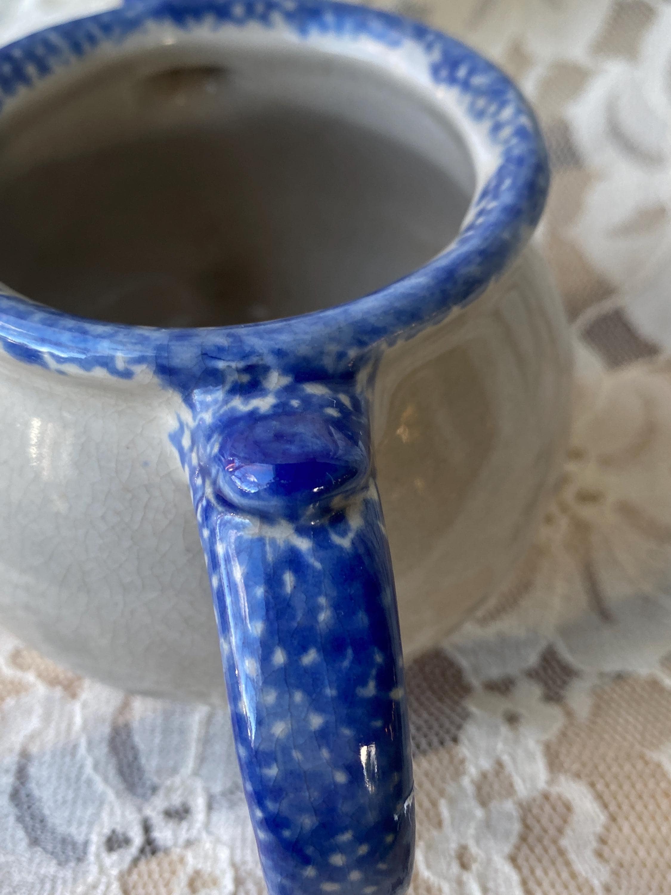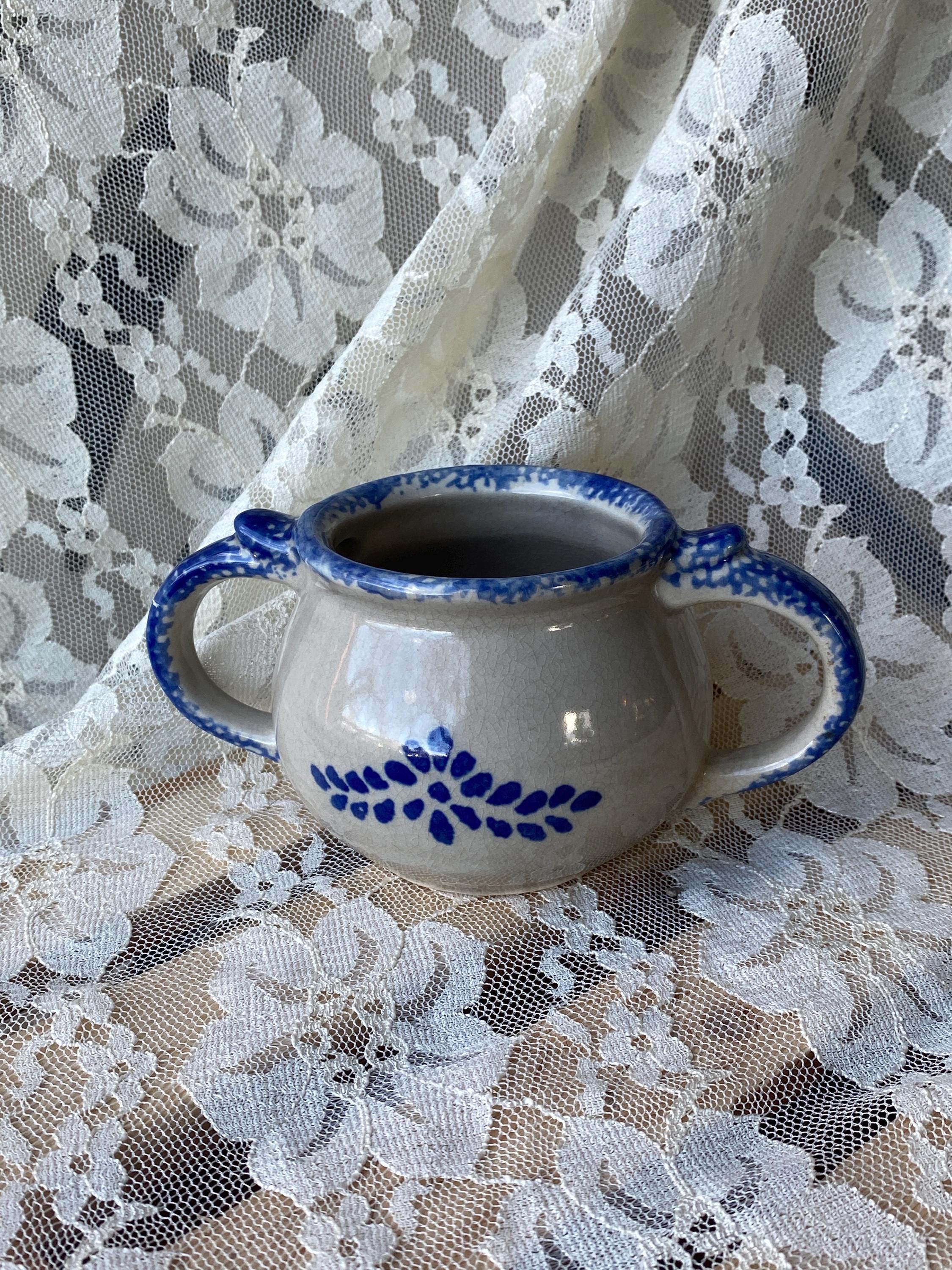 6X3X3 inches, sturdy stoneware handled bowl or mug with a blue spongeware folk art pattern. Good vintage condition.