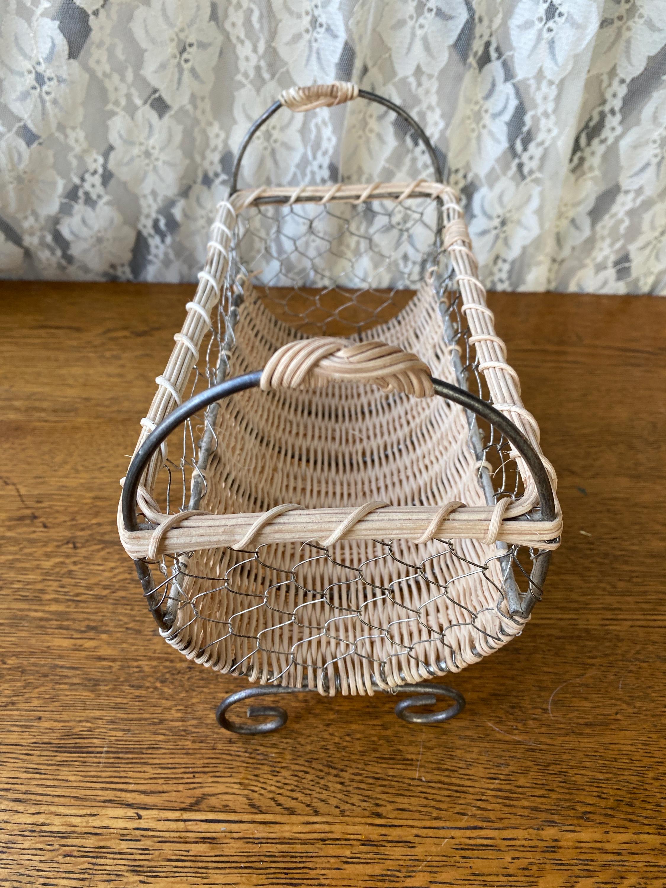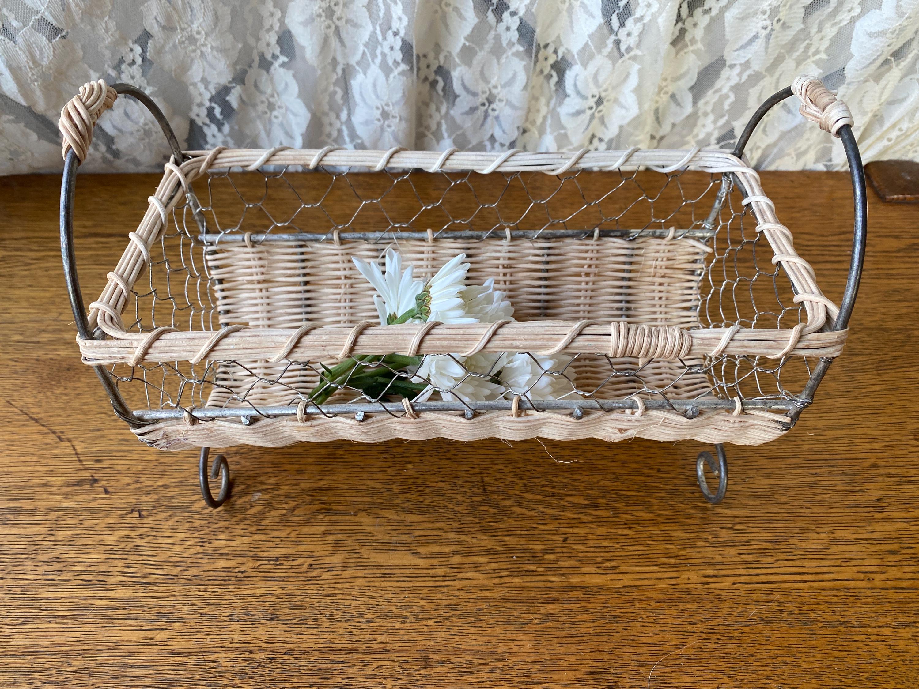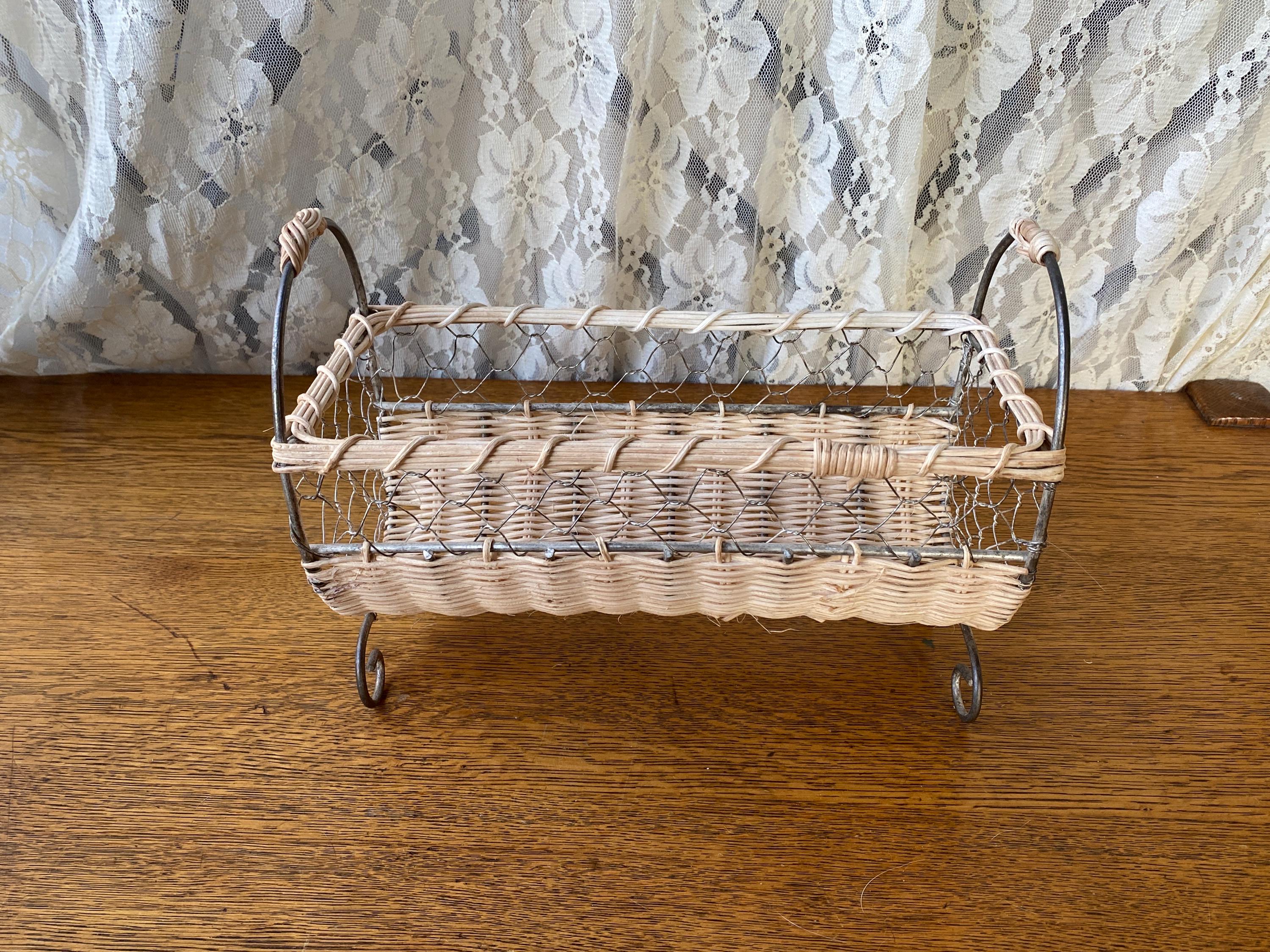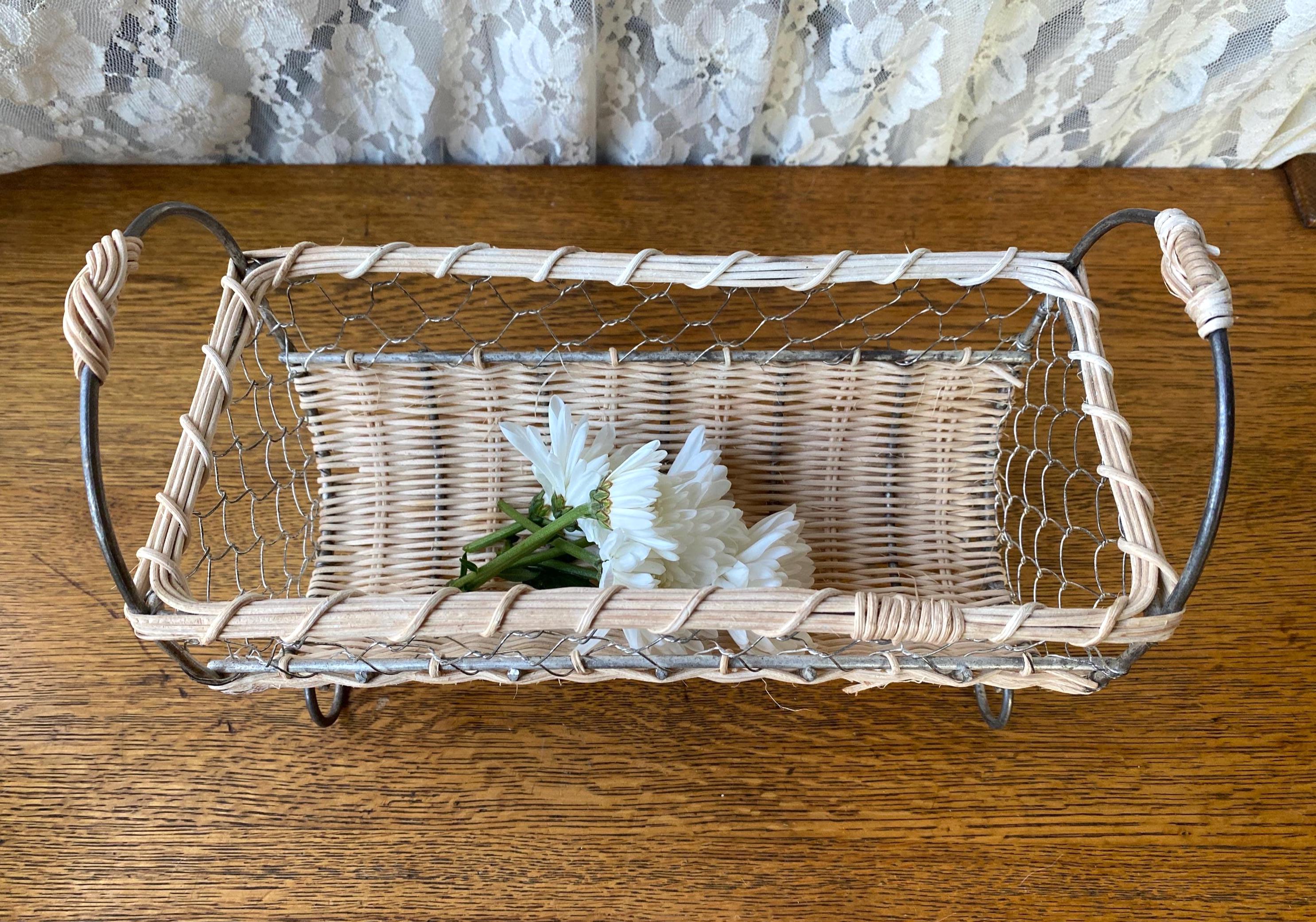 10X5X7 inches. Natural wicker, wire handles, and chicken wire sides. Such a cute piece in a country or cottage style home.