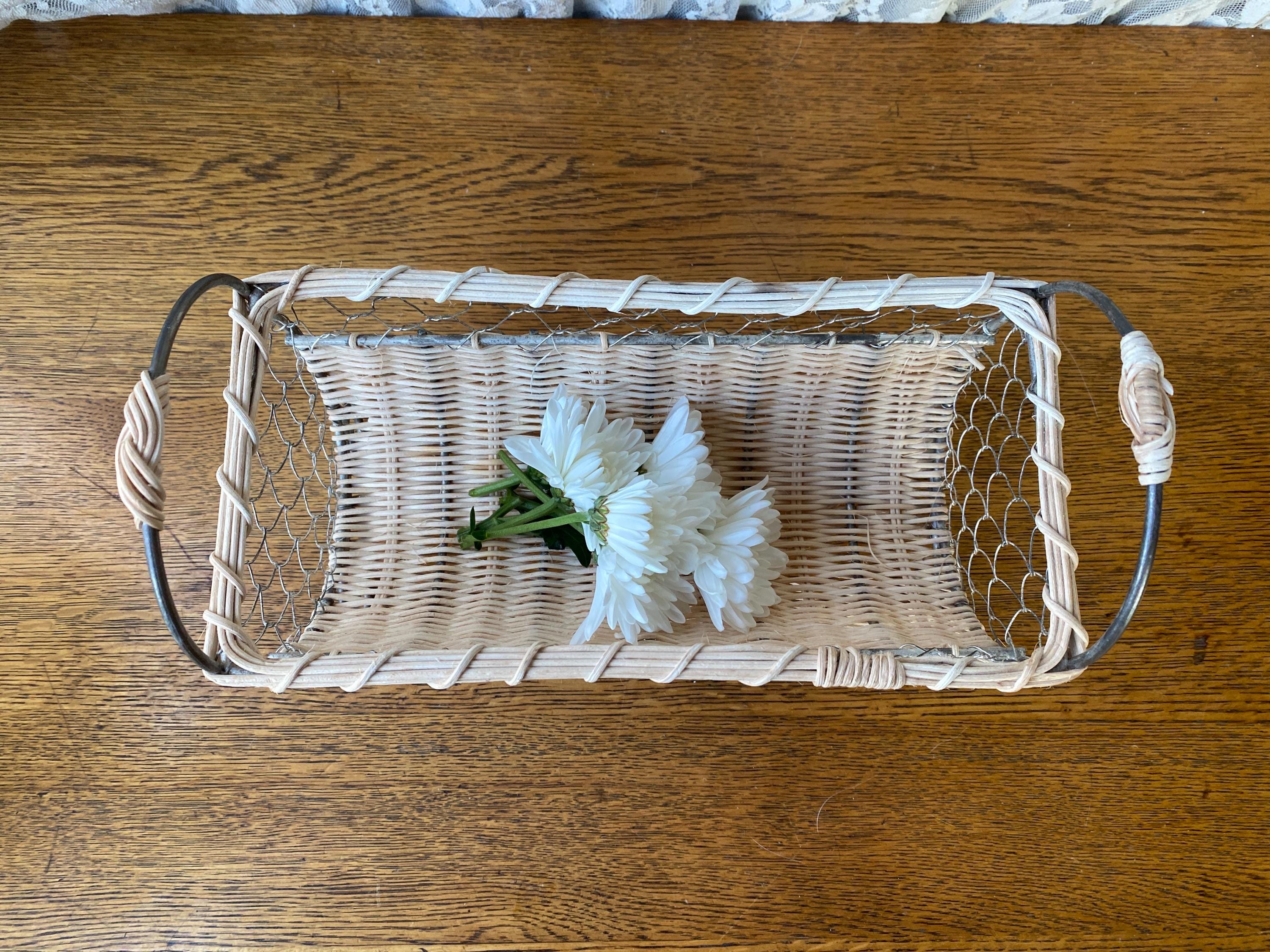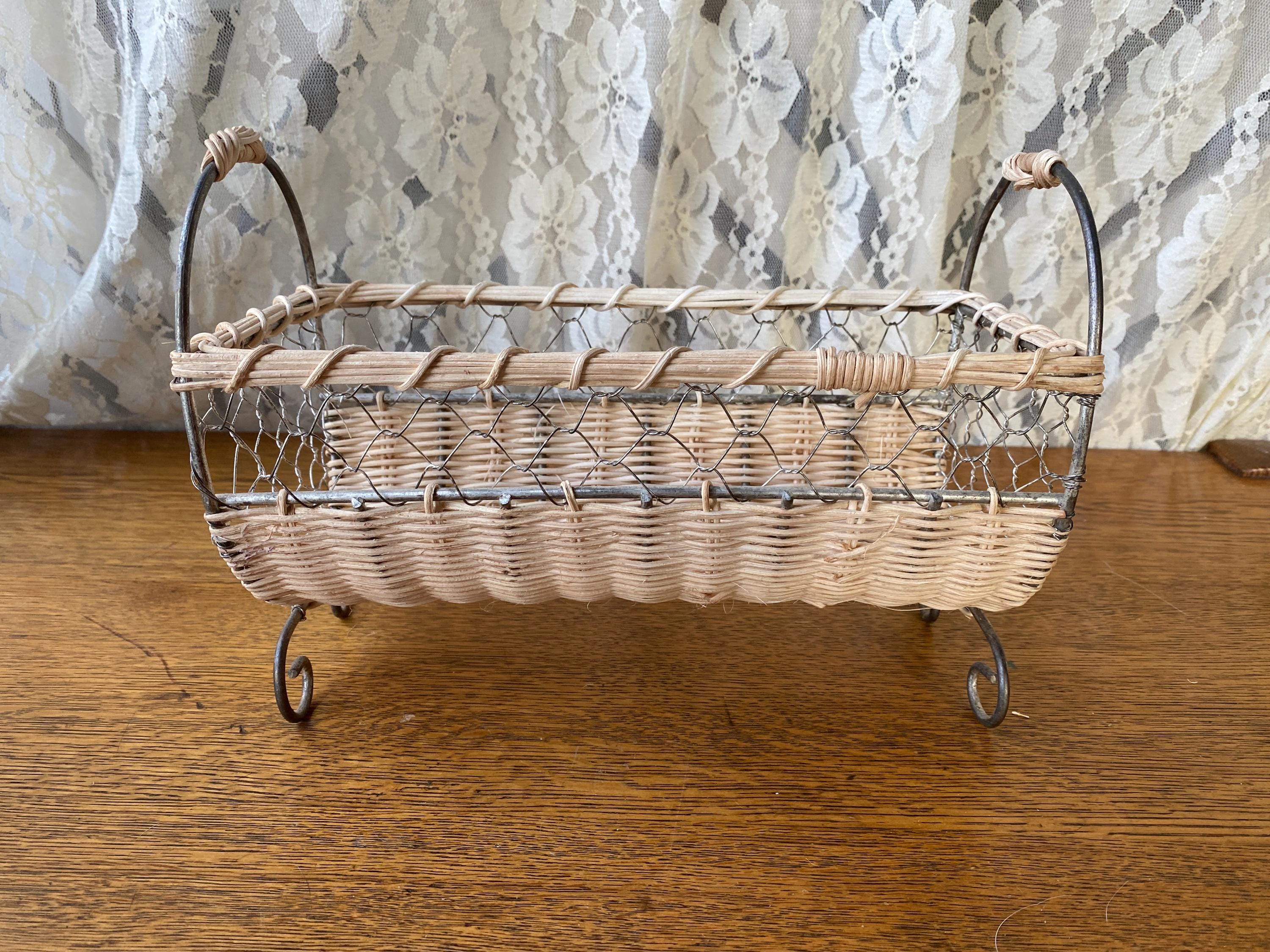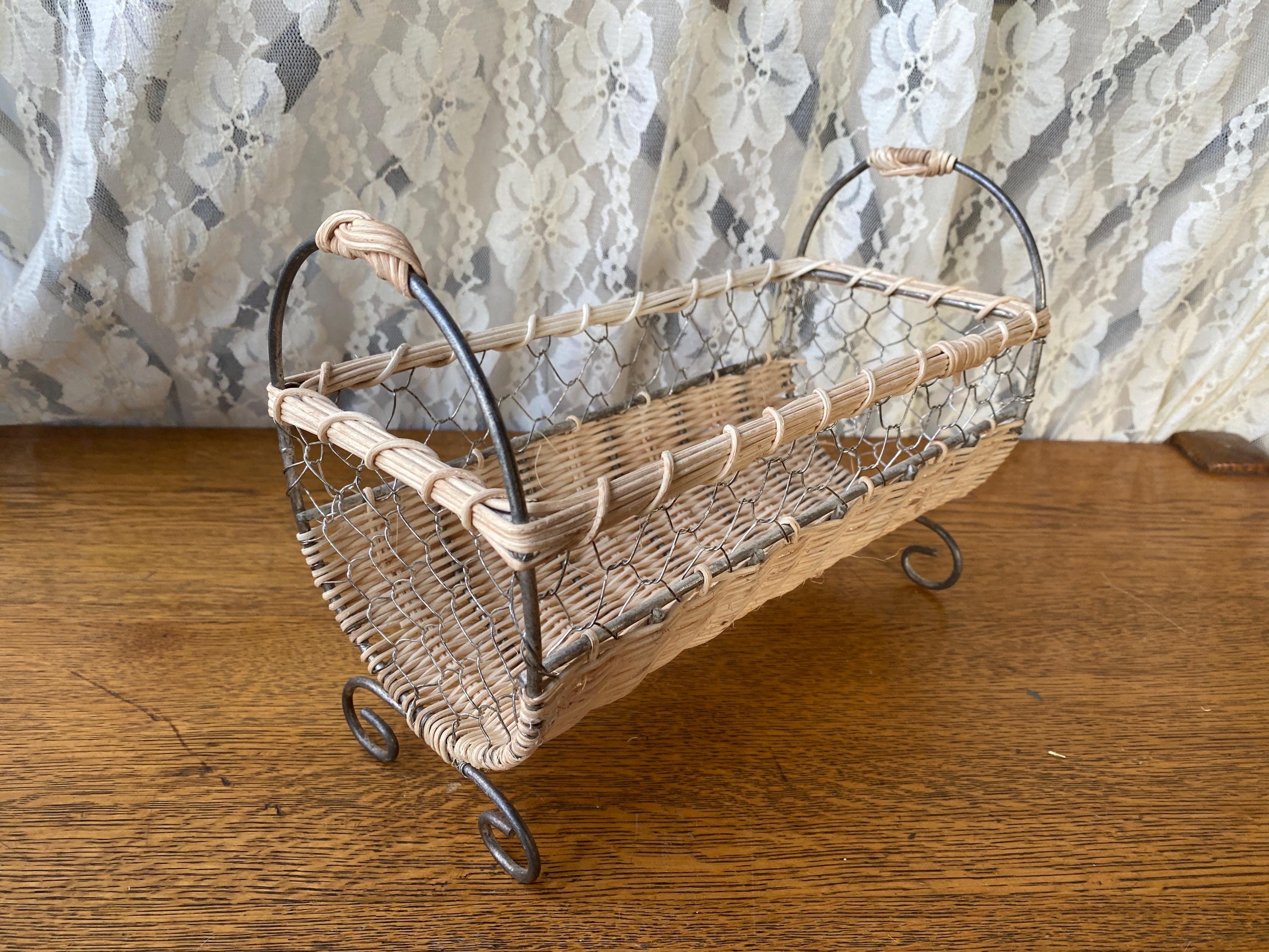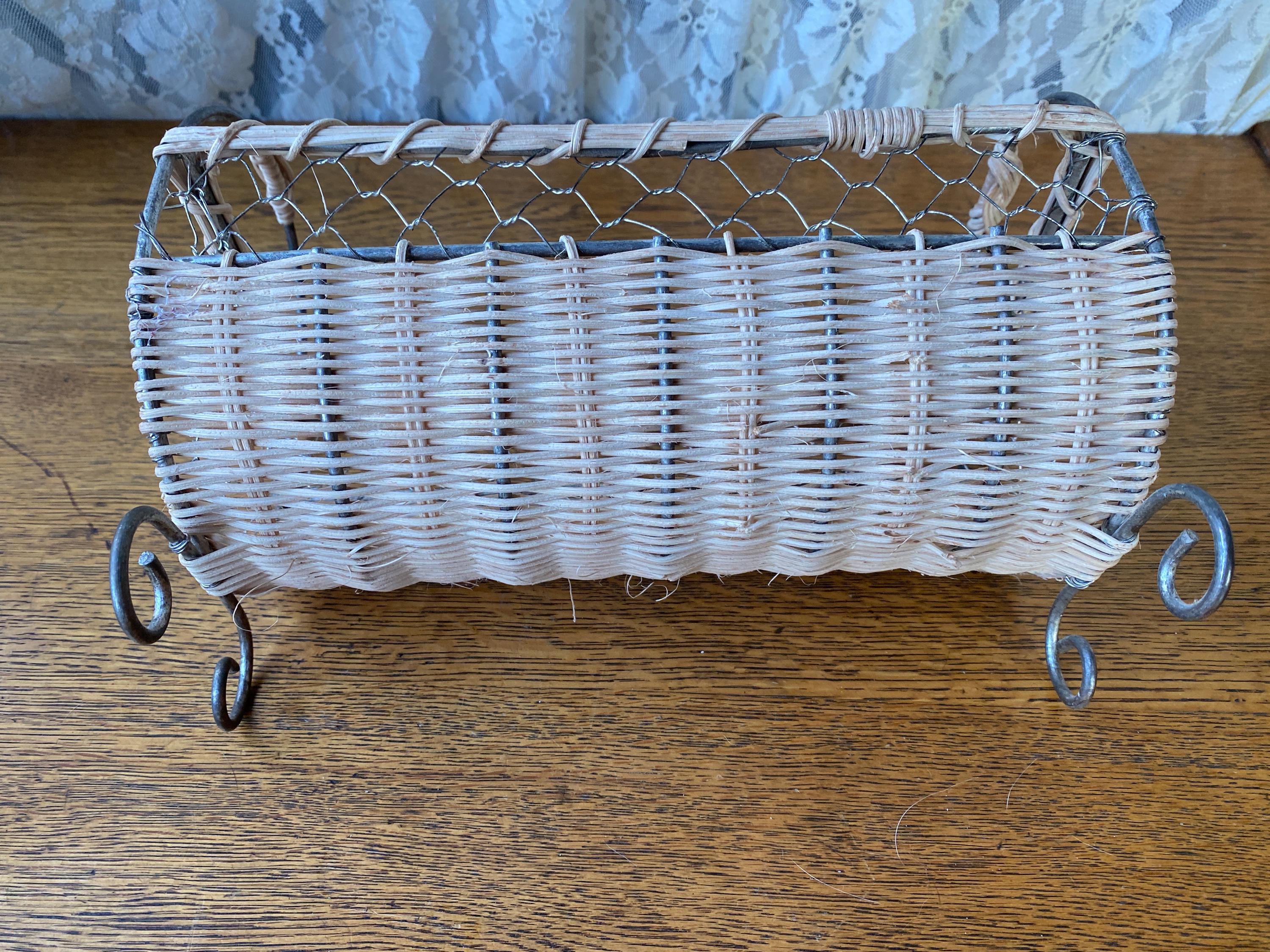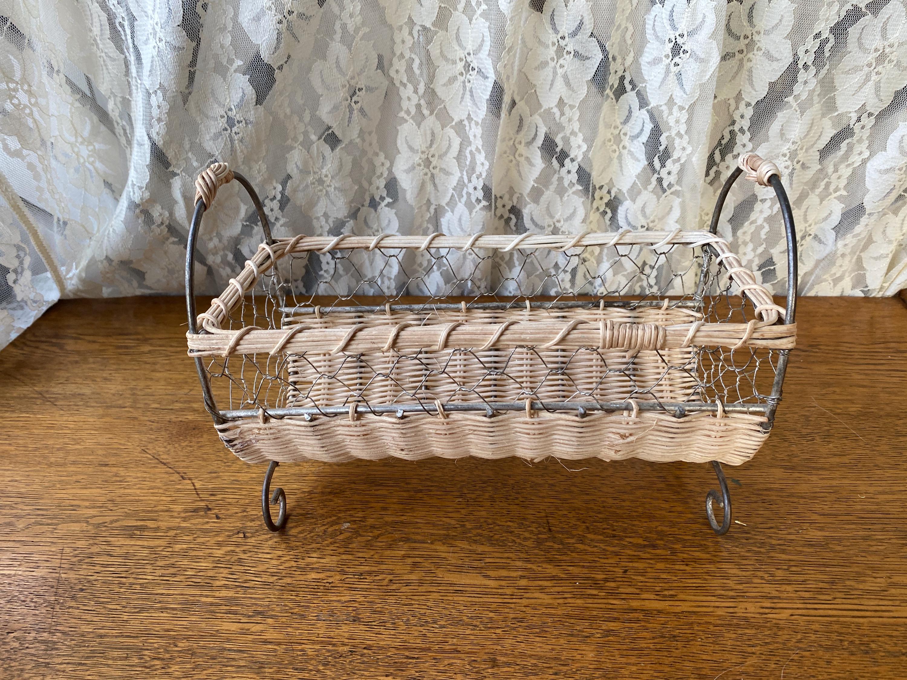 10X5X7 inches. Natural wicker, wire handles, and chicken wire sides. Such a cute piece in a country or cottage style home.