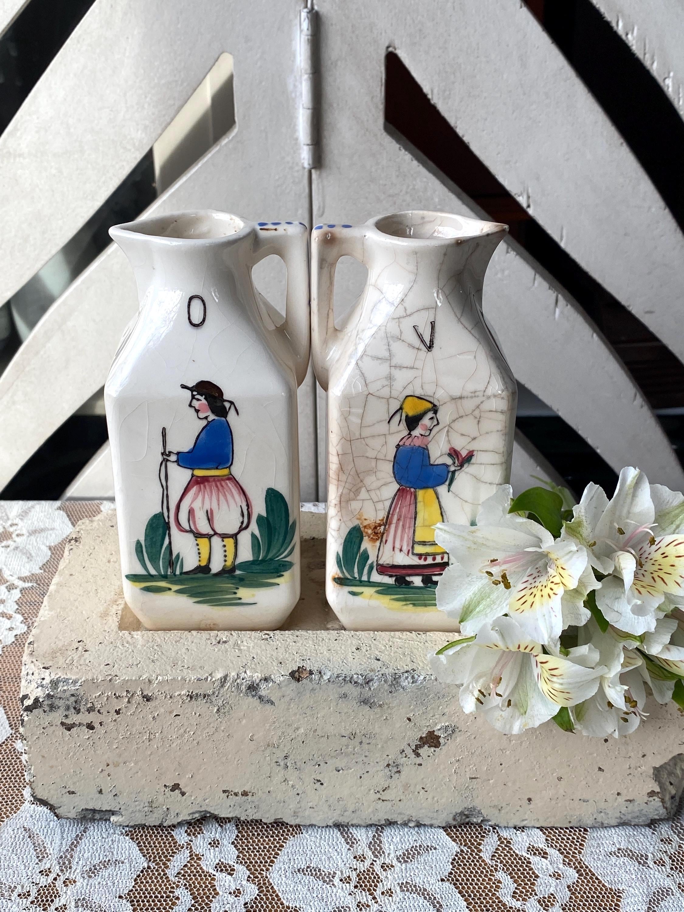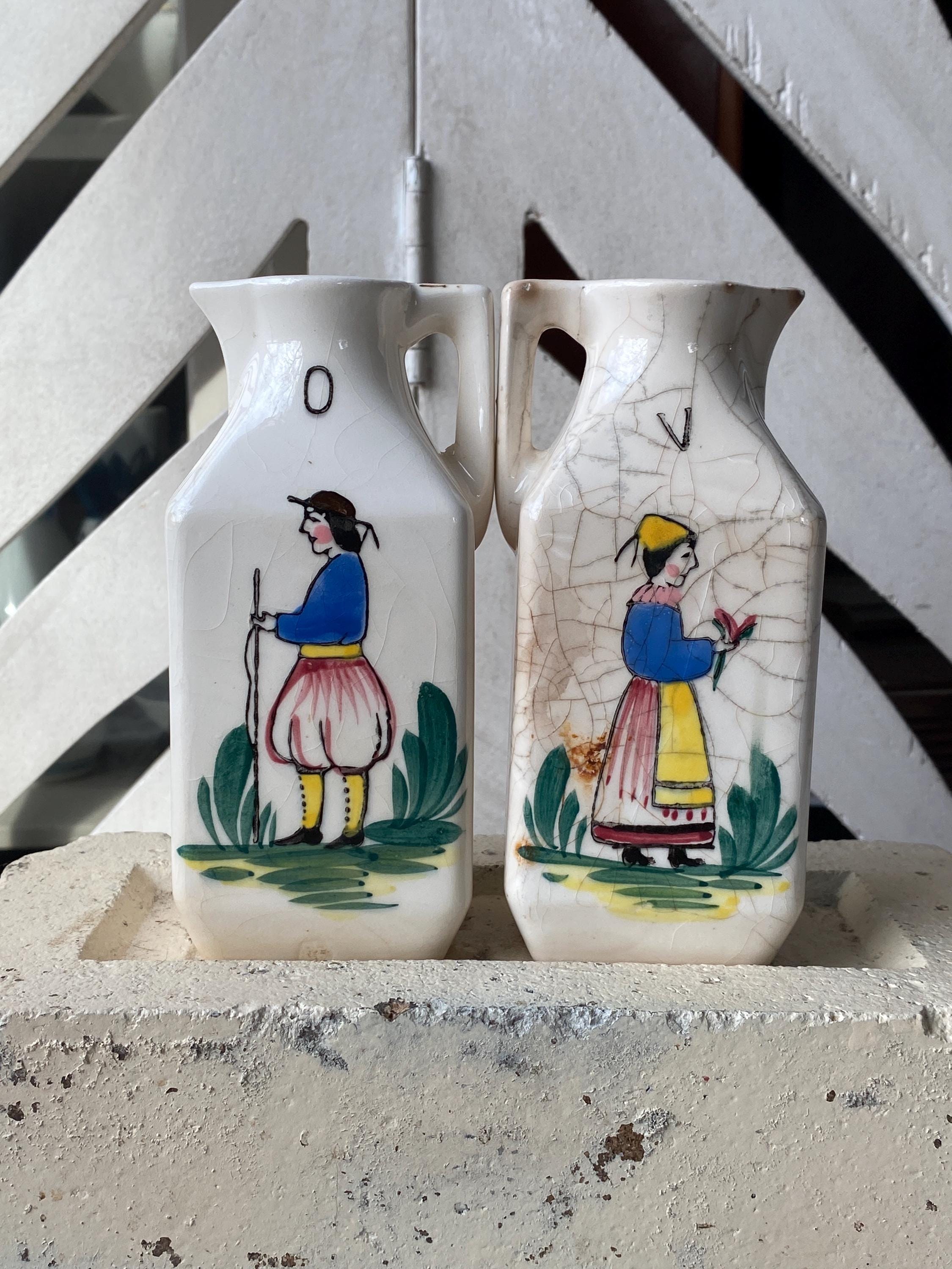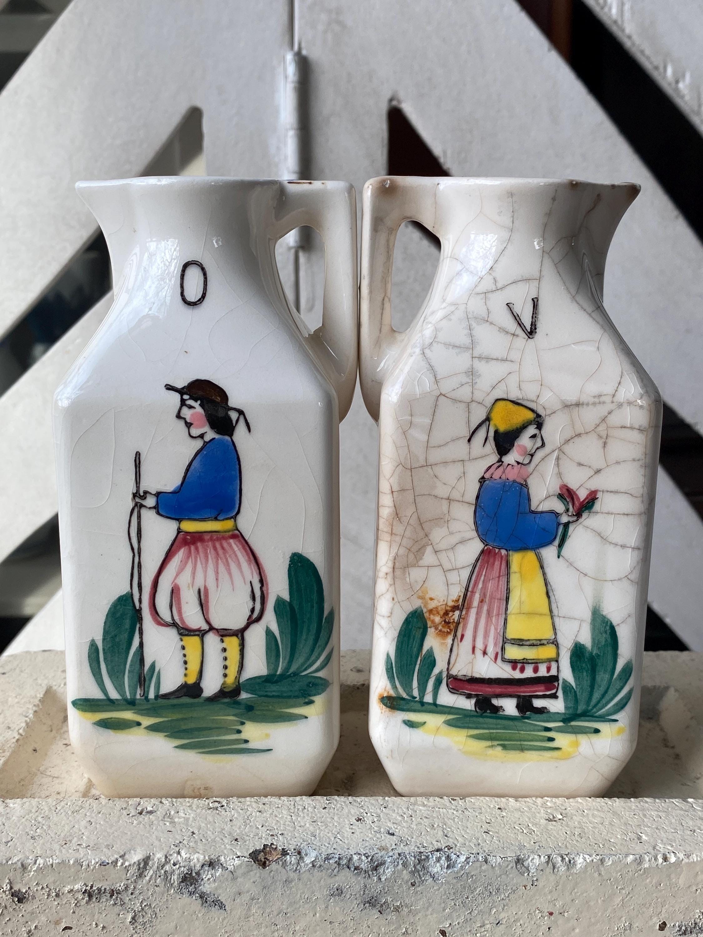 2X2X5 inches each. Made in Japan, this little set depicts a provincial style man and woman. ***Vintage condition, significant crazing, some cracks, chips etc.***