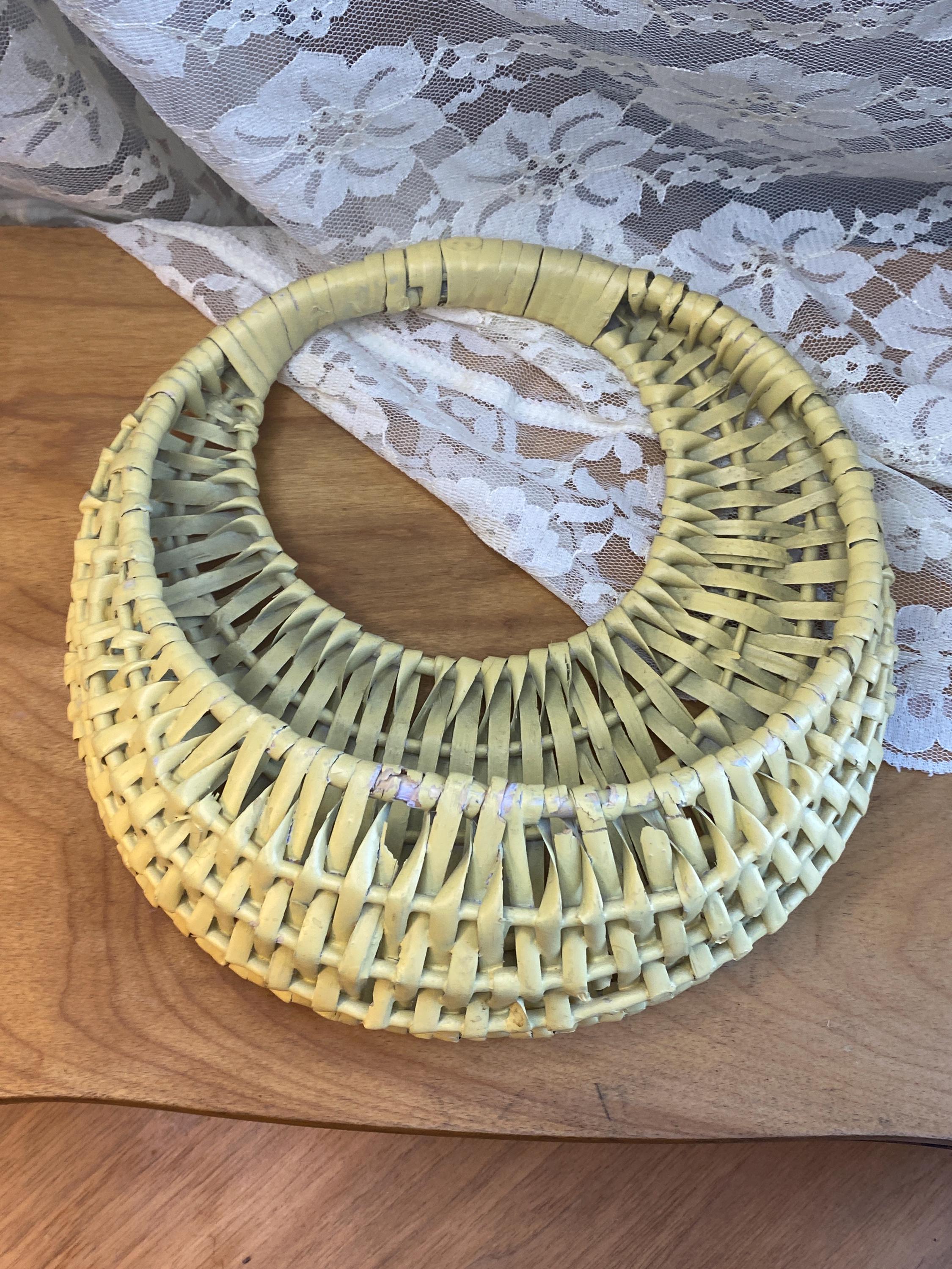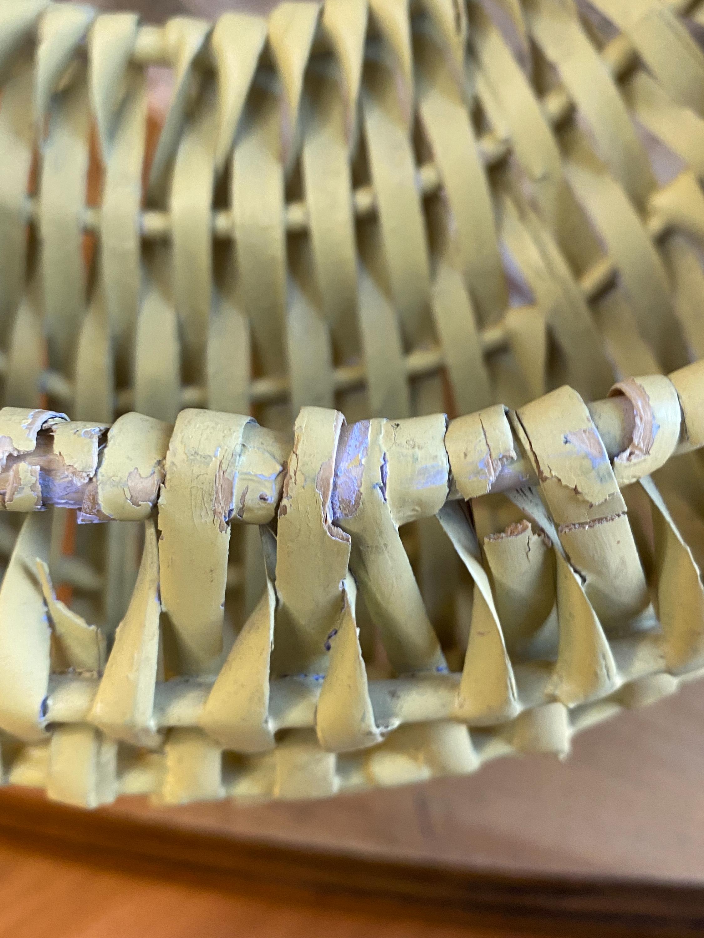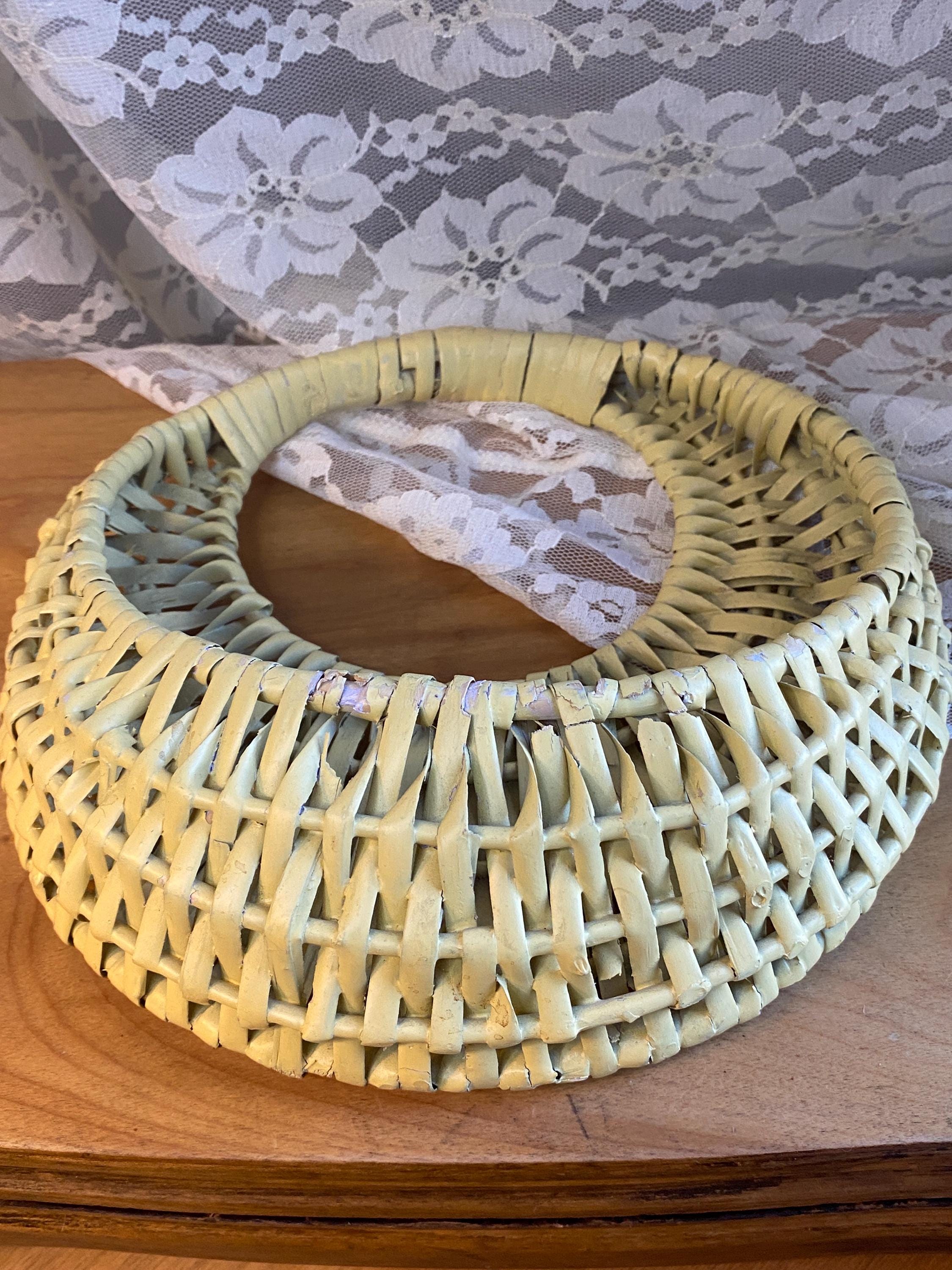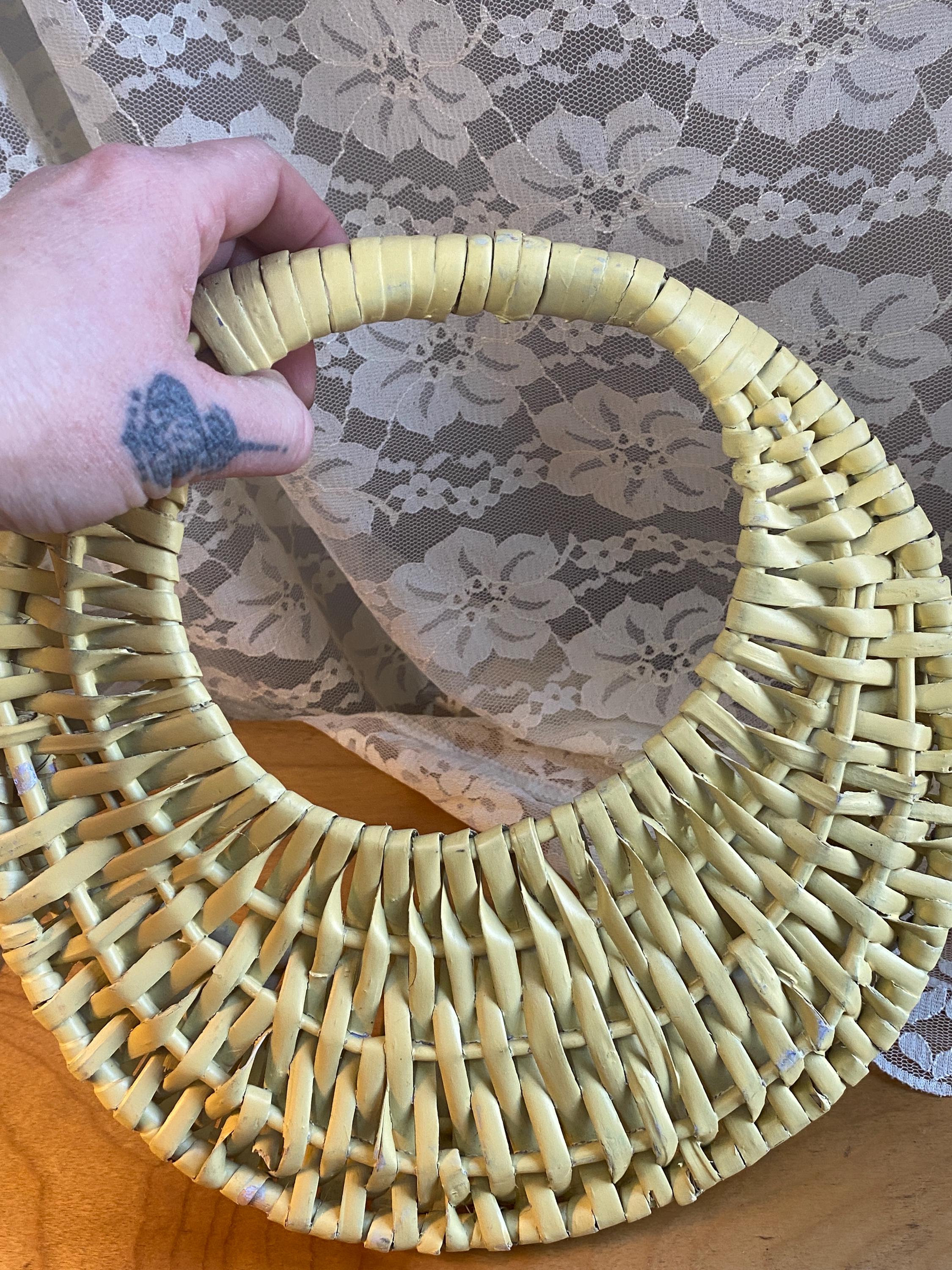 9X9.5 inches, soft buttery yellow, perfect for storing keys or mail or putting a small planter inside of. Some wear/ aging as shown in photos.