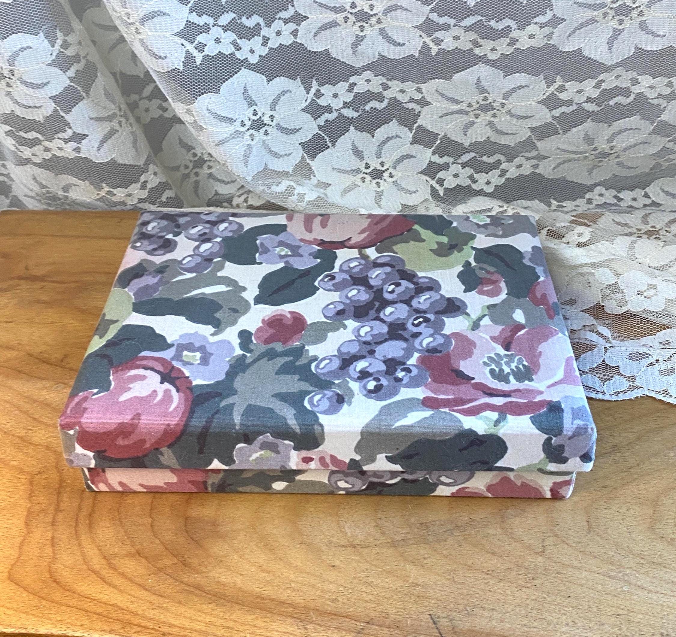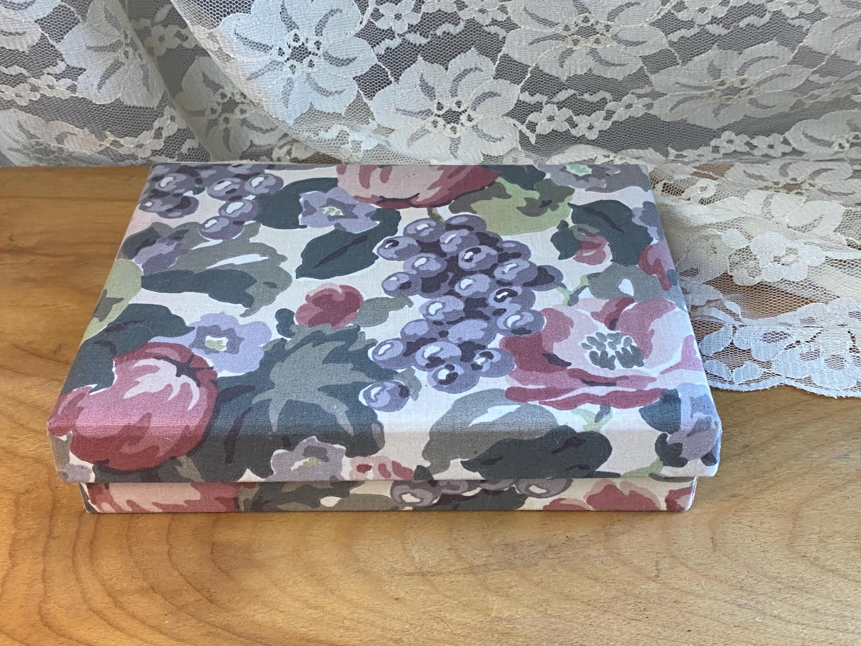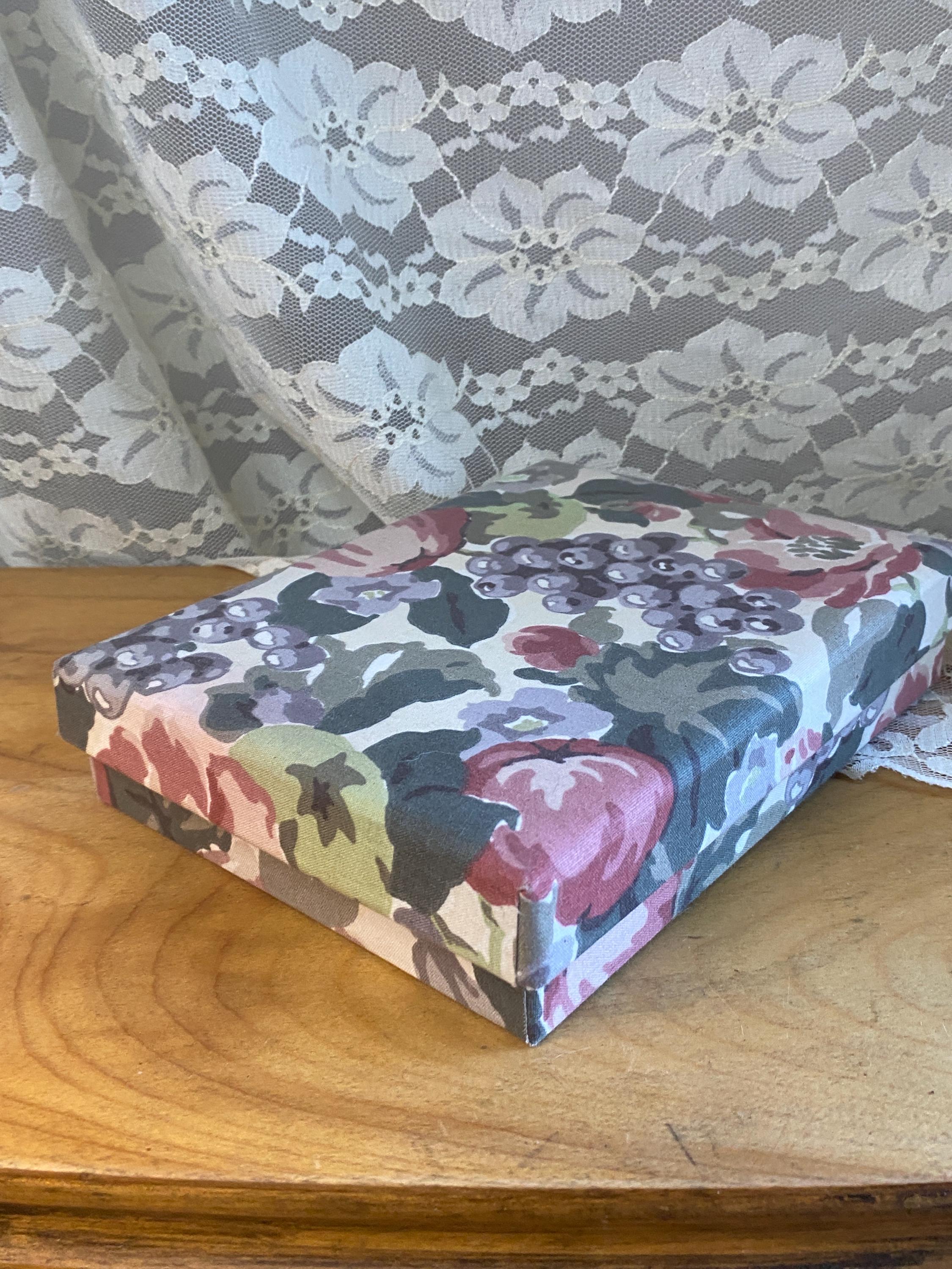 6X8X1.5 inches, perfect for storing letters, photos, or stationary. Does not contain stationary now. Some minor wear etc on fabric as shown in photos.