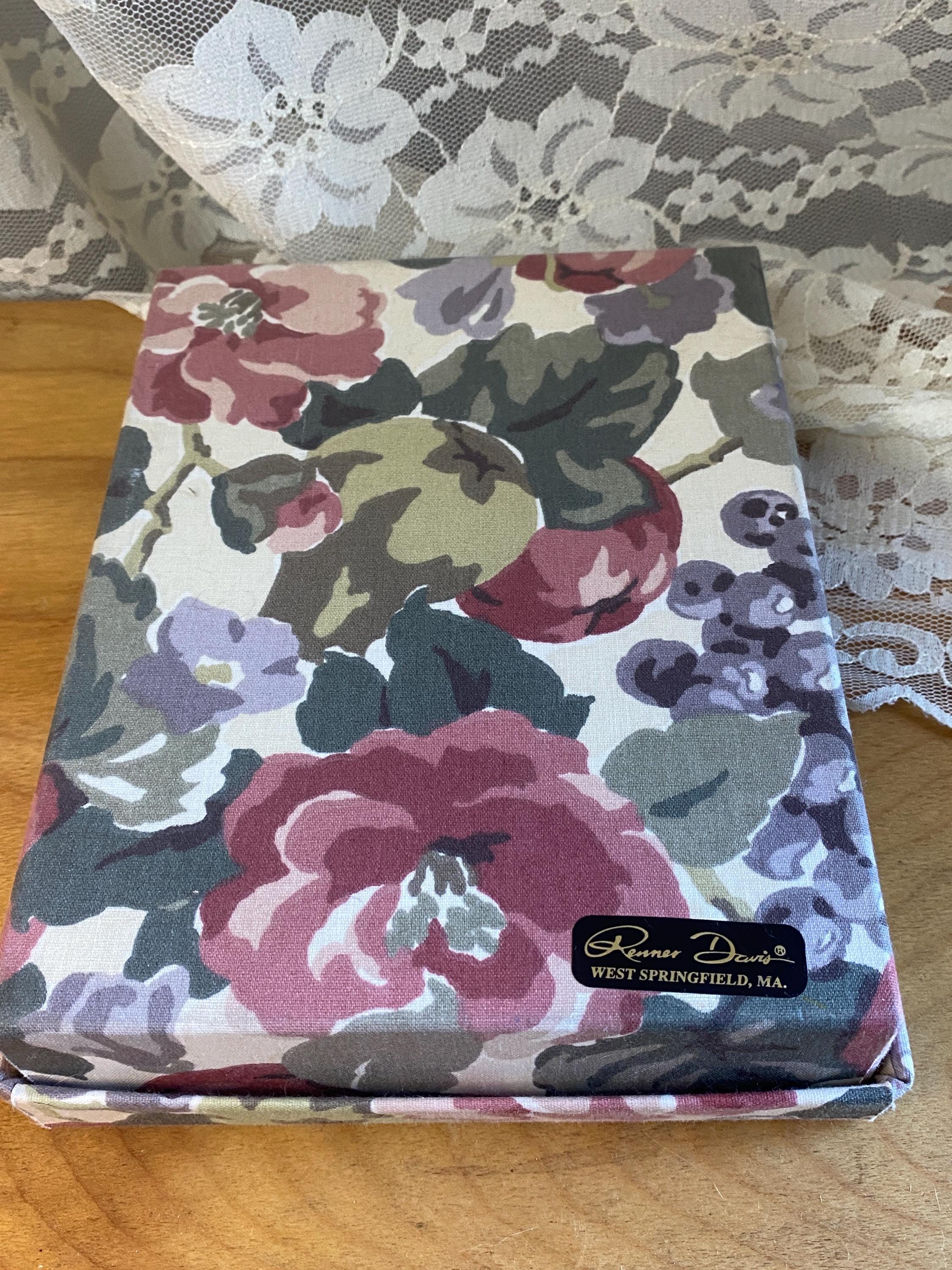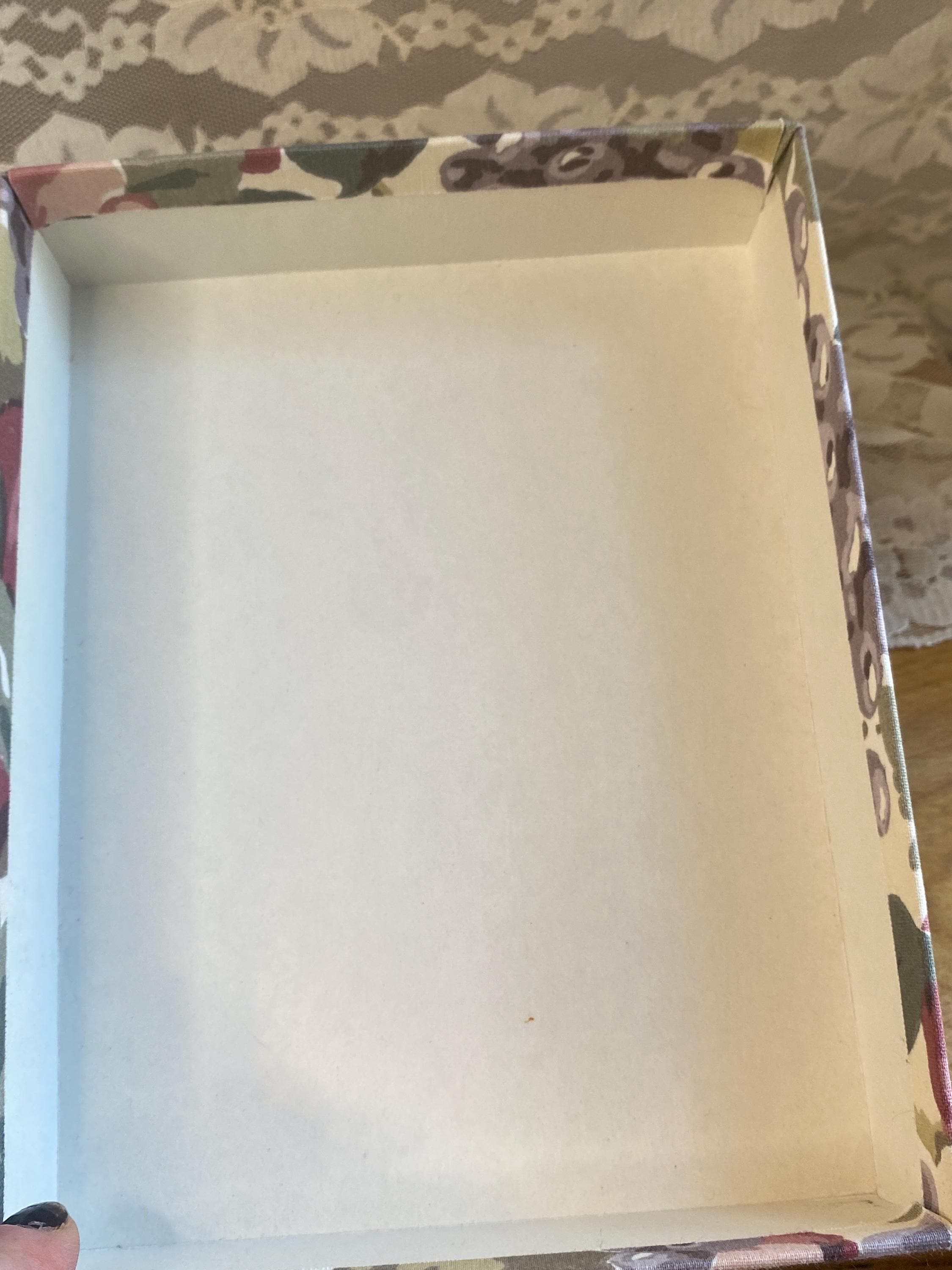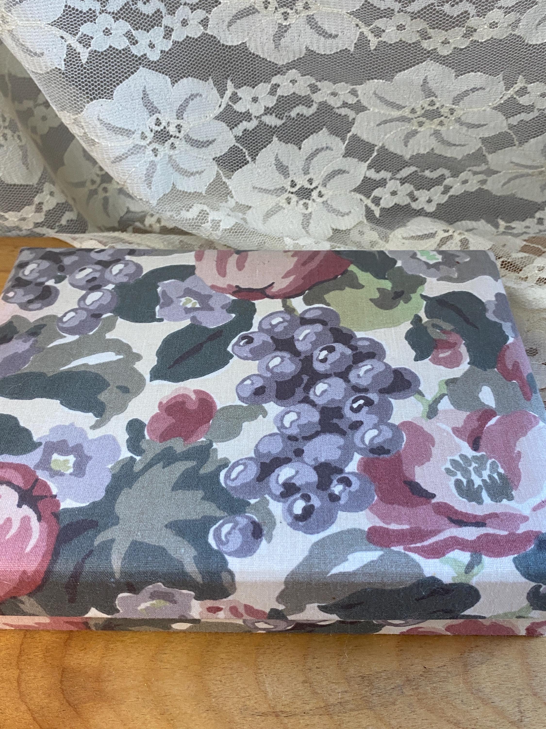 6X8X1.5 inches, perfect for storing letters, photos, or stationary. Does not contain stationary now. Some minor wear etc on fabric as shown in photos.