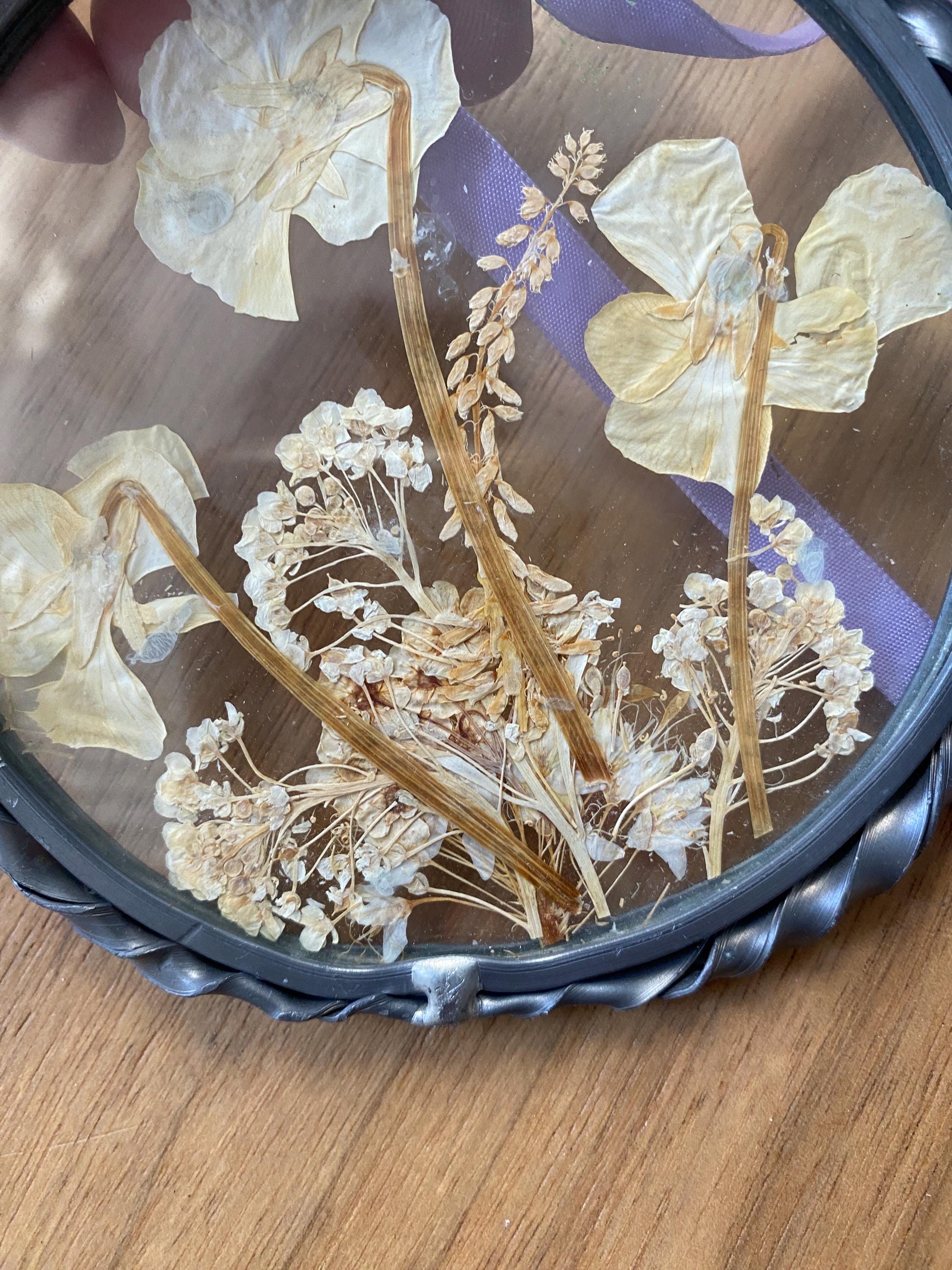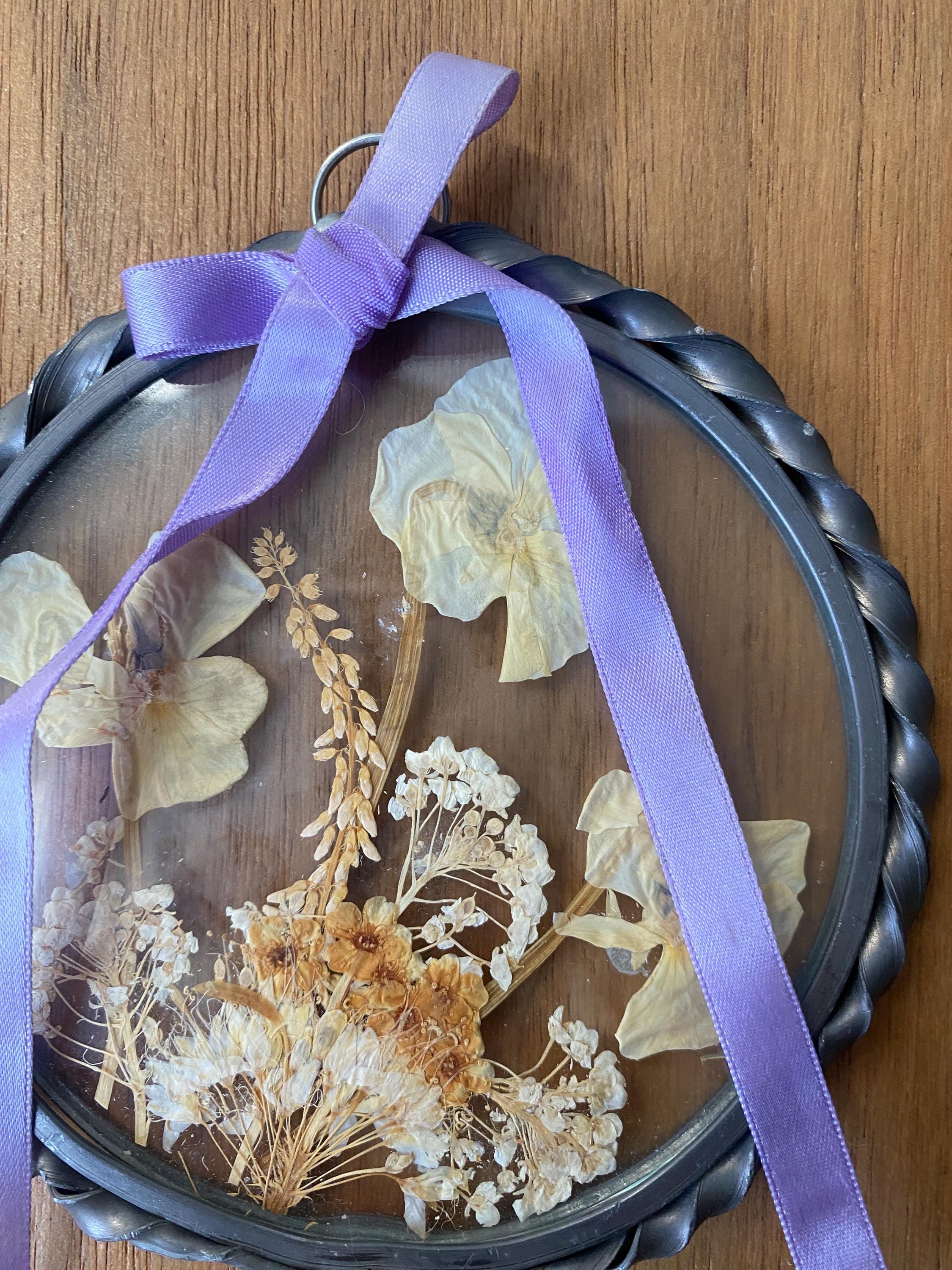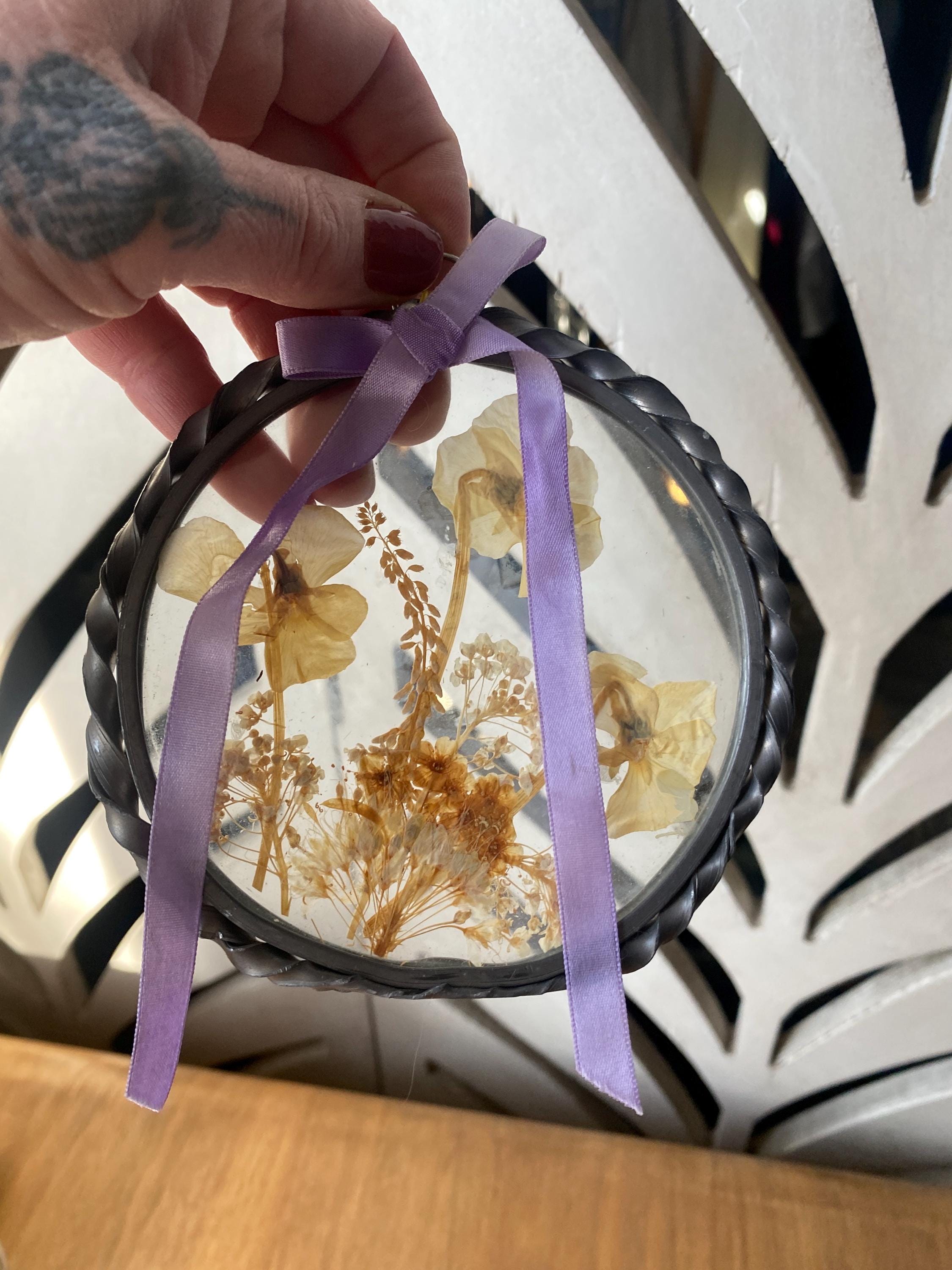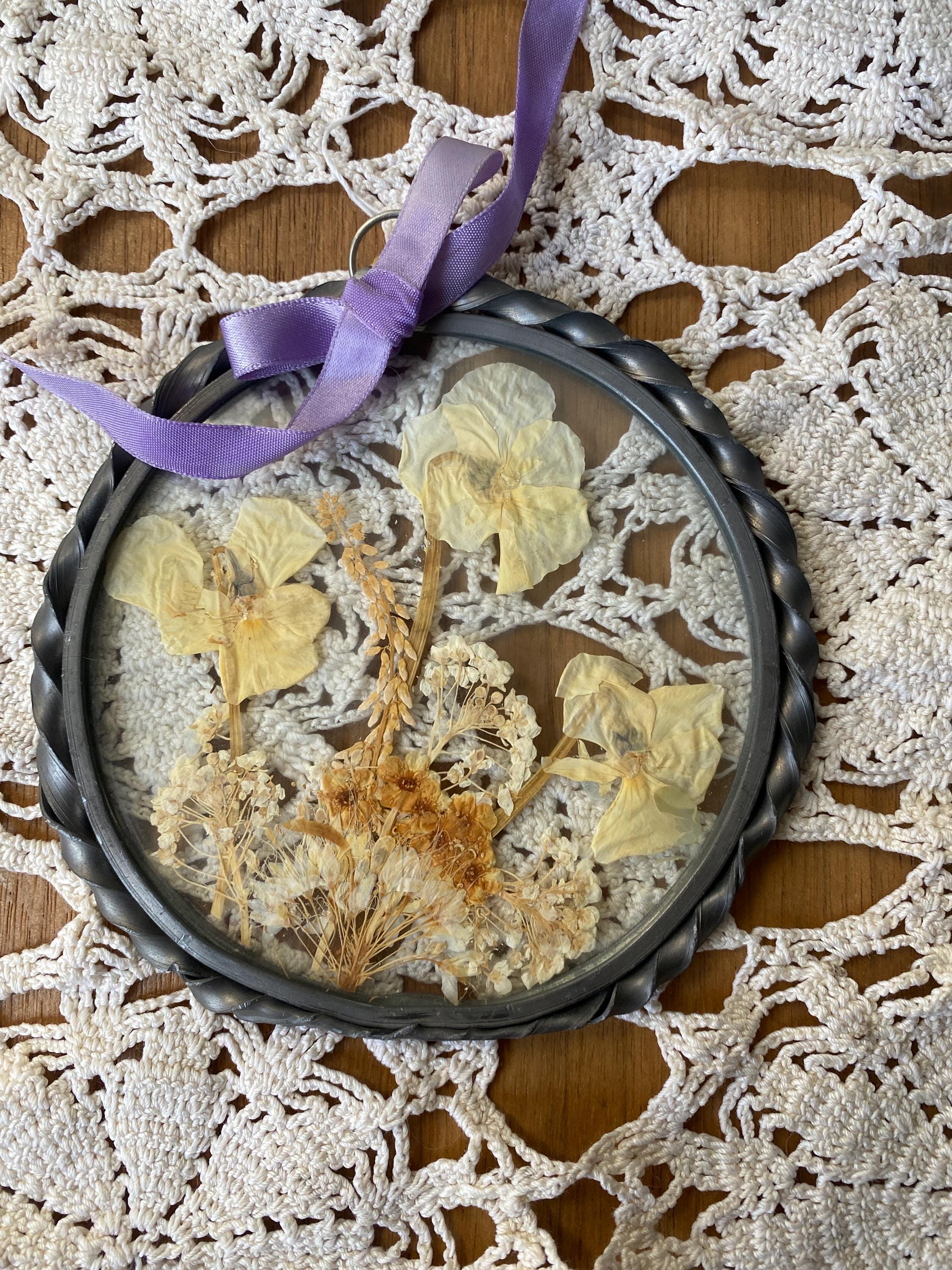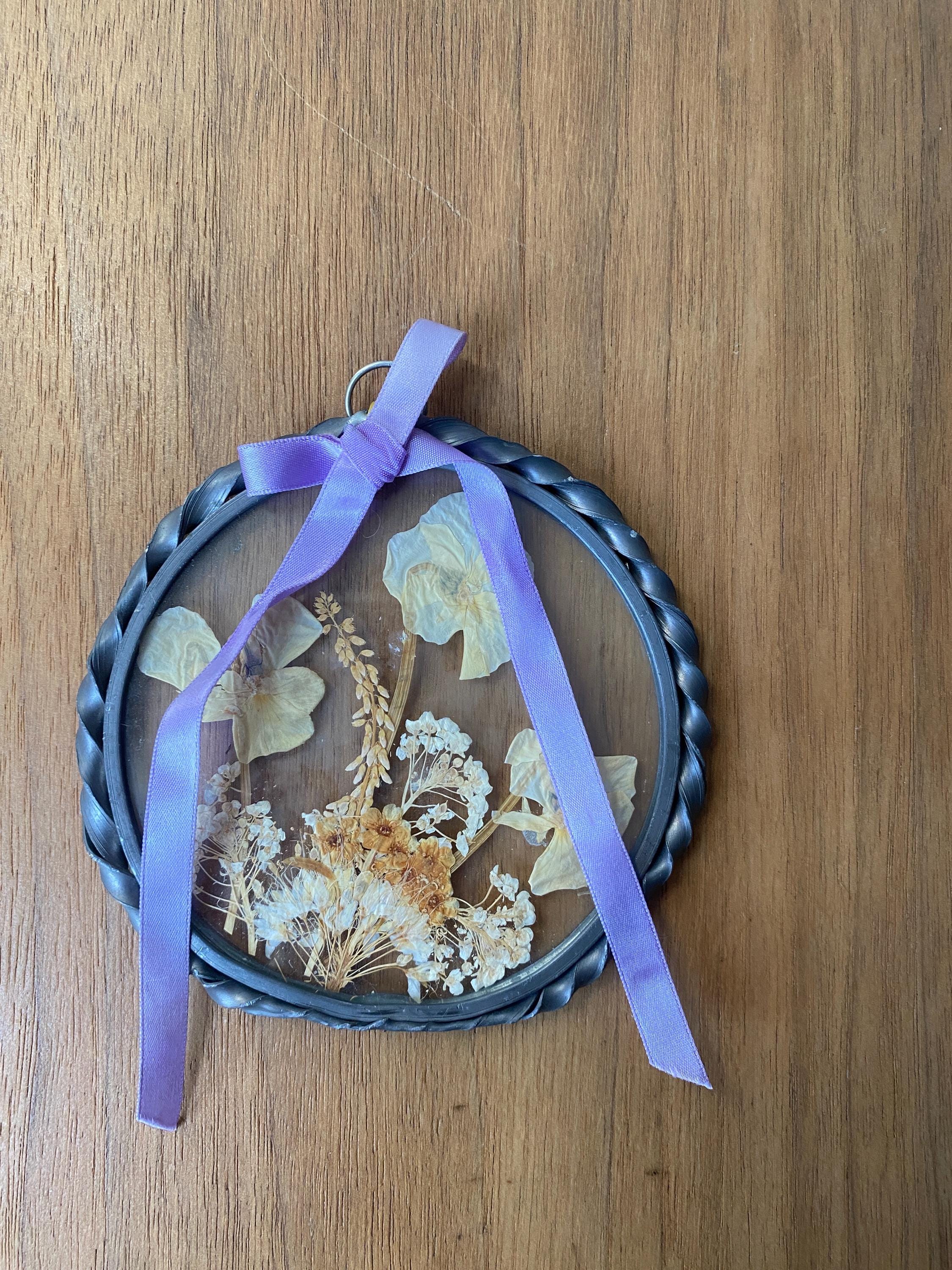 4.5 inches across. Pretty twisted metal frame and white tone pressed flowers with a lilac ribbon. Some wear on frame and ribbon consistent with age. All items in my shop are vintage or handmade and may have signs of use, wear, or variation consistent with age or hand production. Please review the photos and video carefully and message me with any questions on condition.
