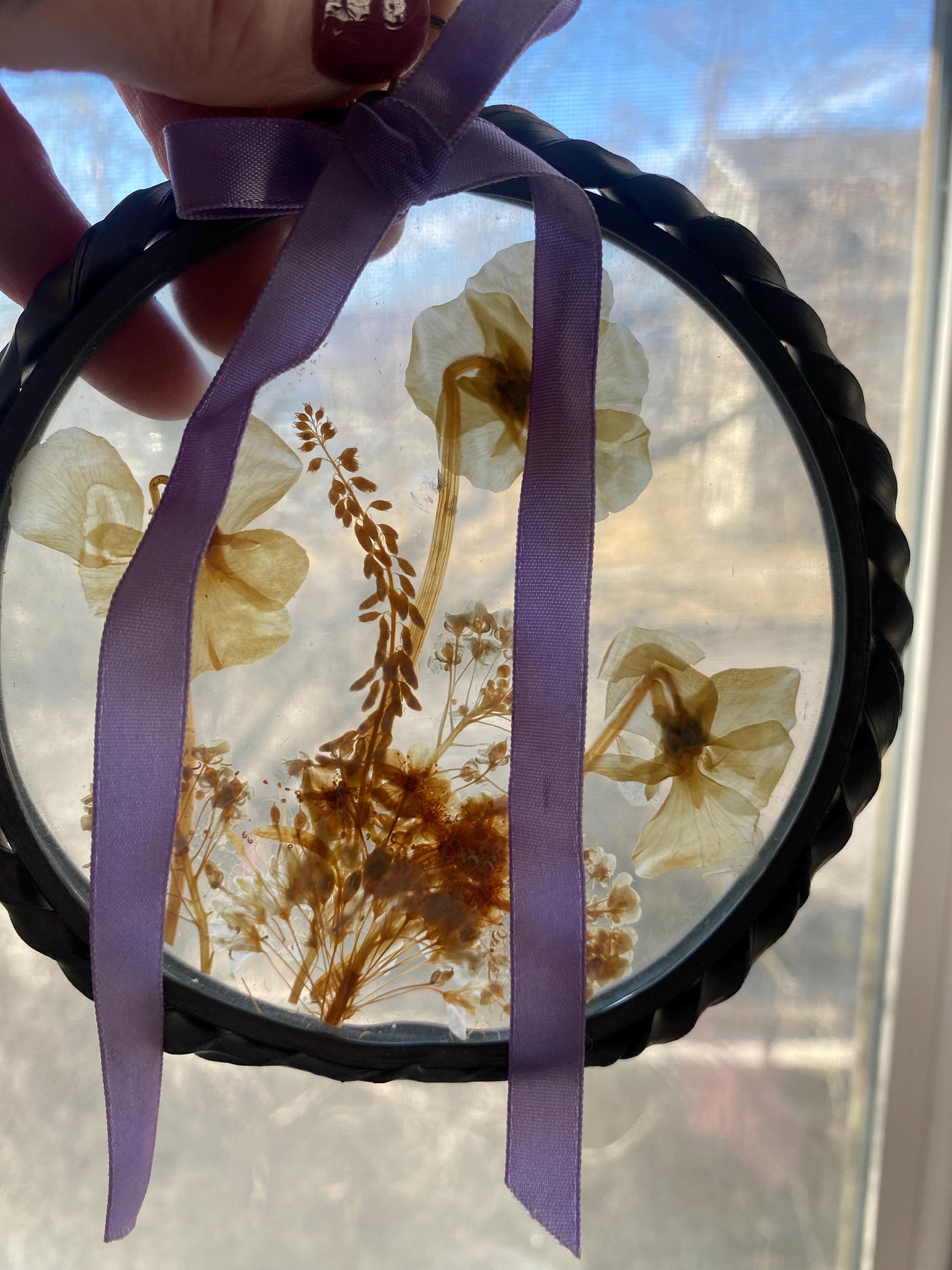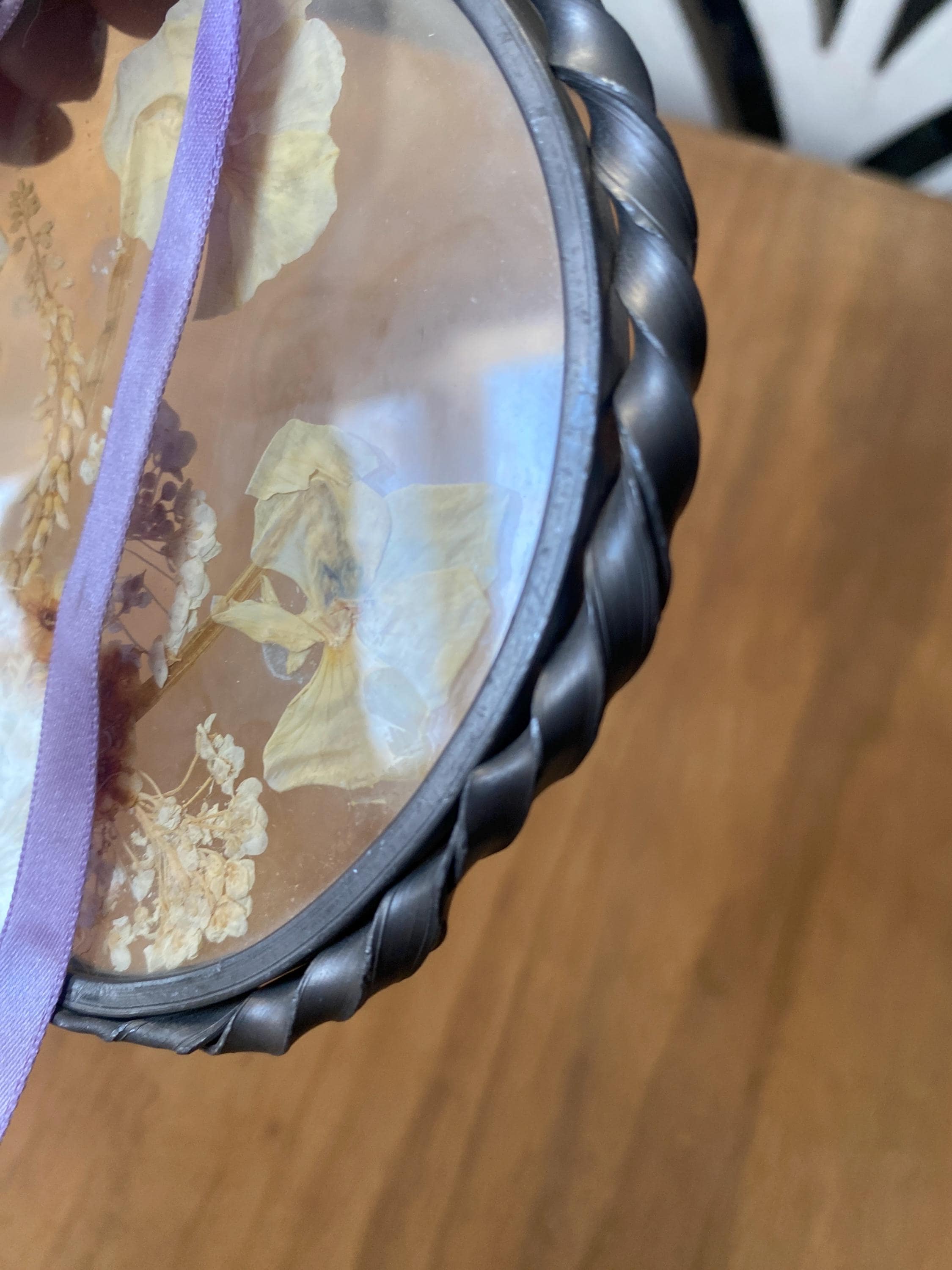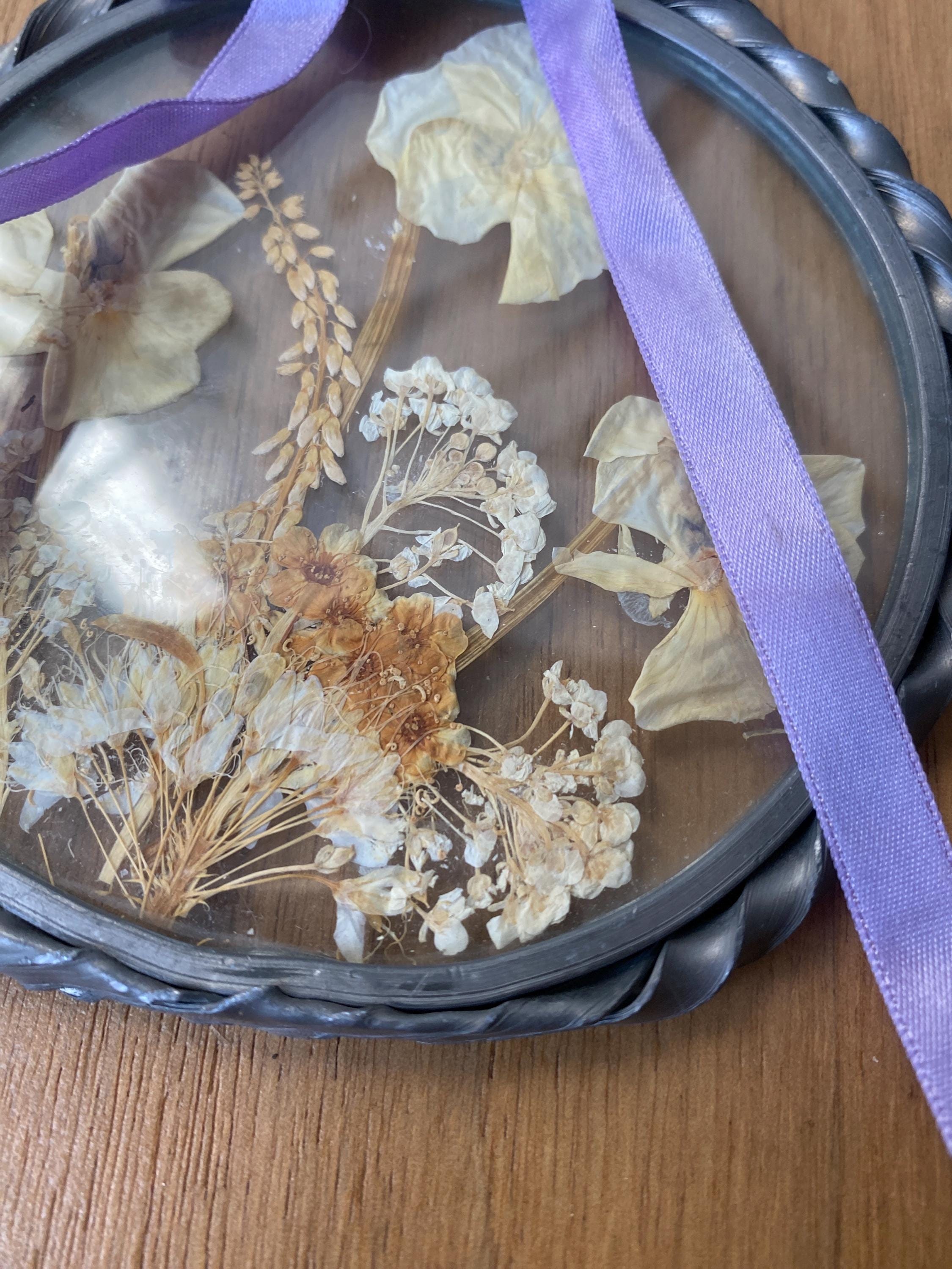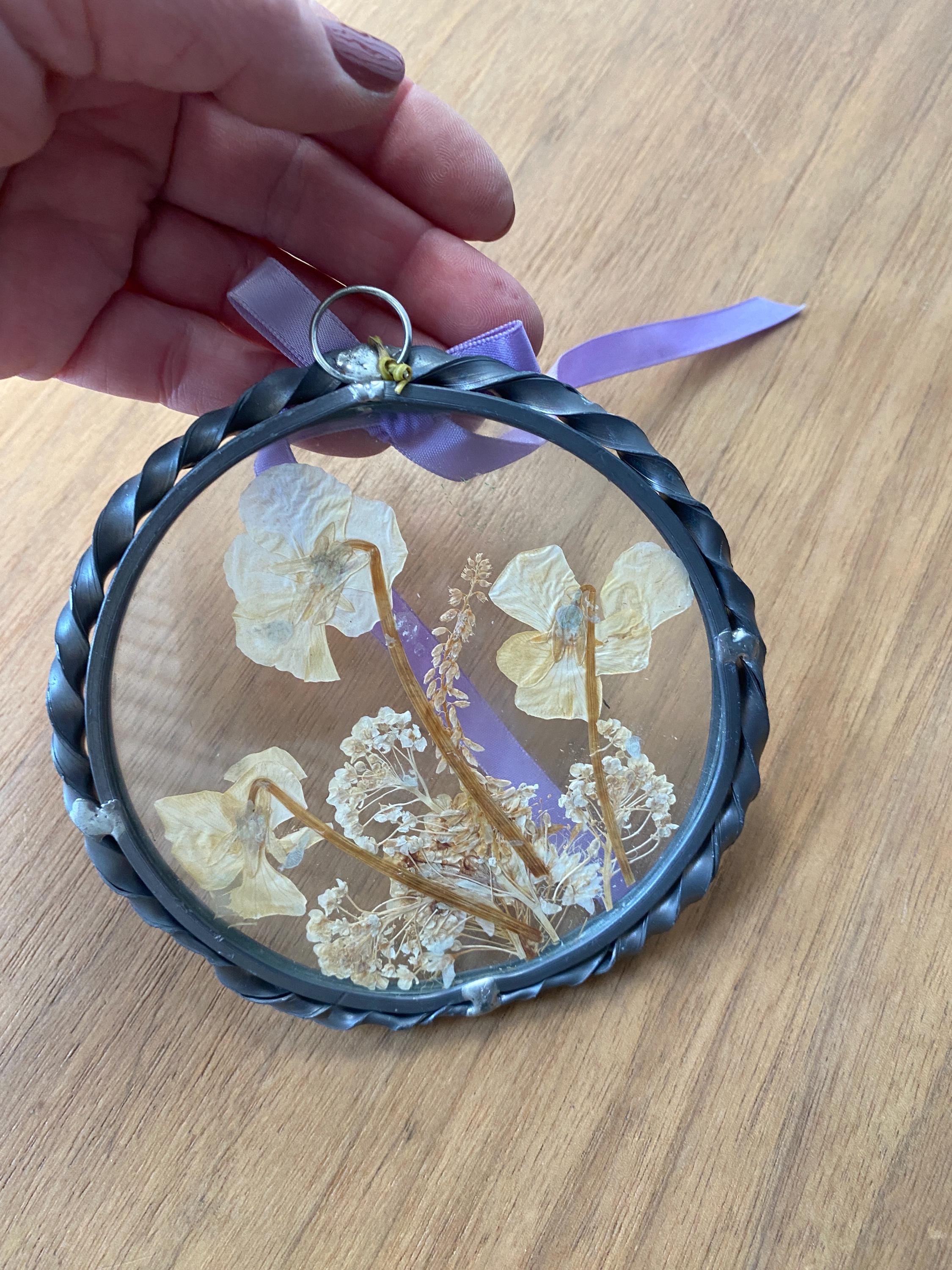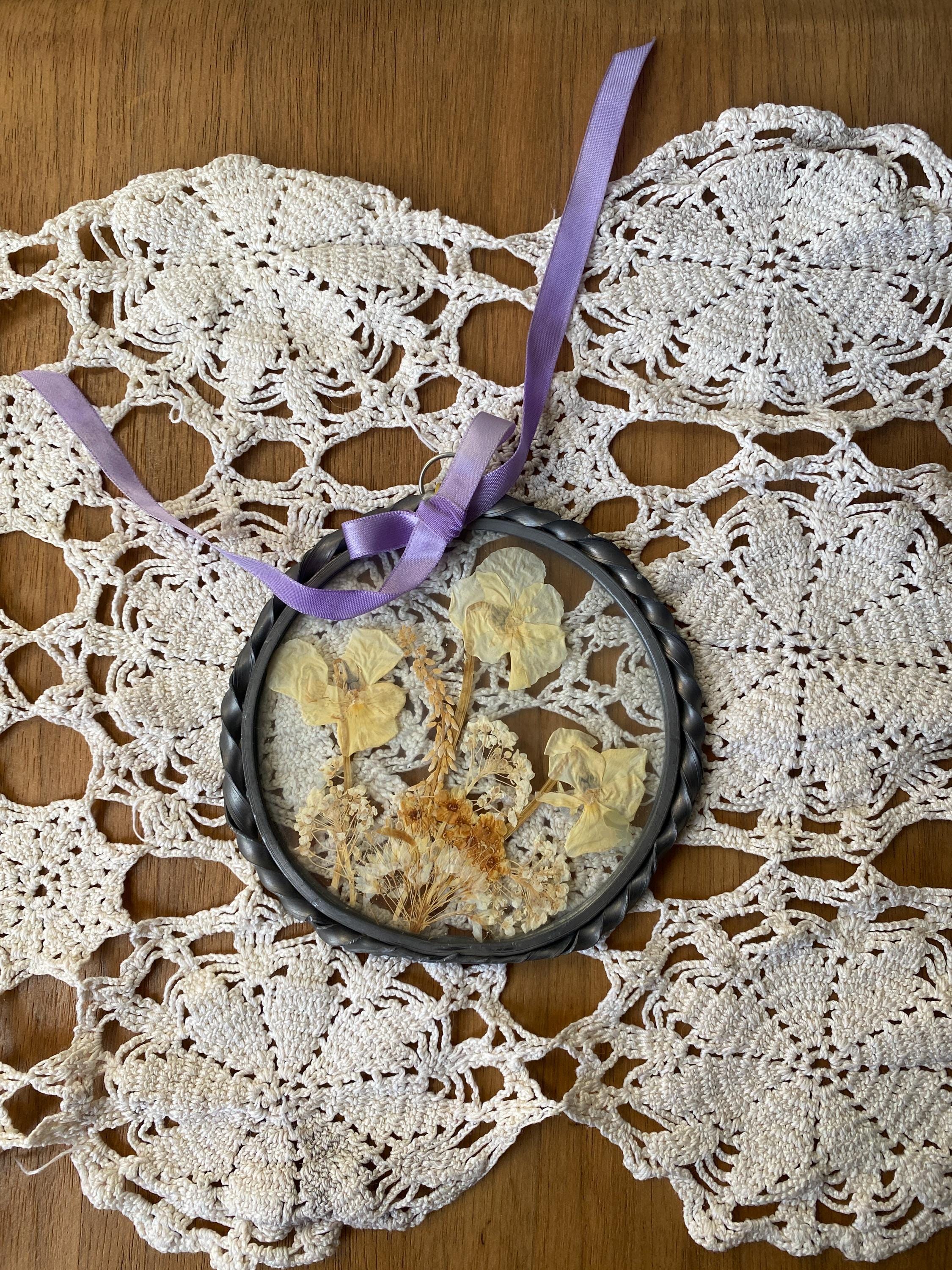 4.5 inches across. Pretty twisted metal frame and white tone pressed flowers with a lilac ribbon. Some wear on frame and ribbon consistent with age. All items in my shop are vintage or handmade and may have signs of use, wear, or variation consistent with age or hand production. Please review the photos and video carefully and message me with any questions on condition.