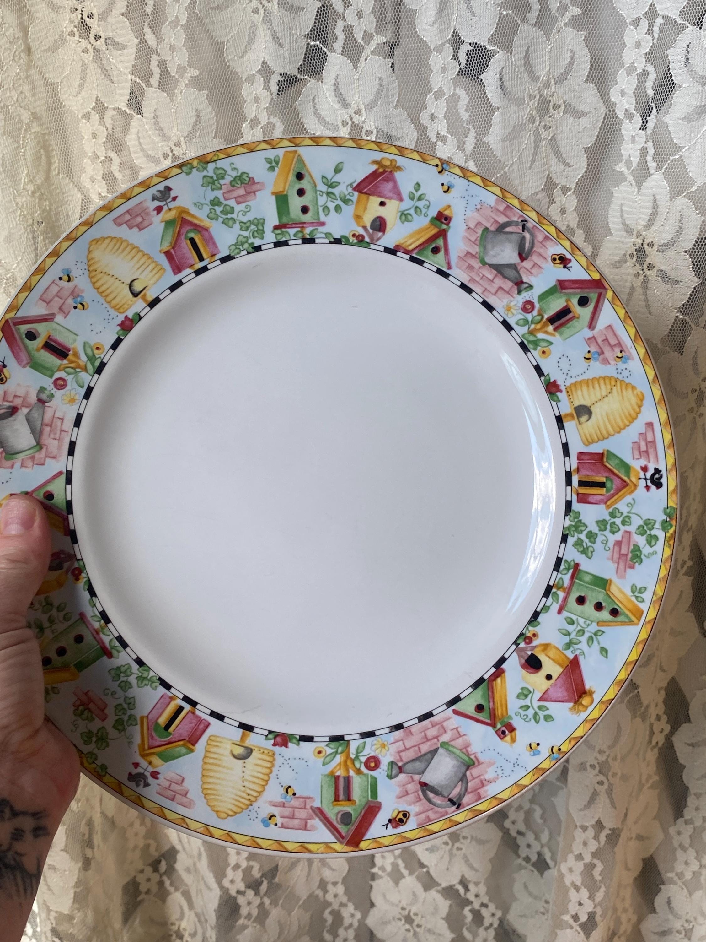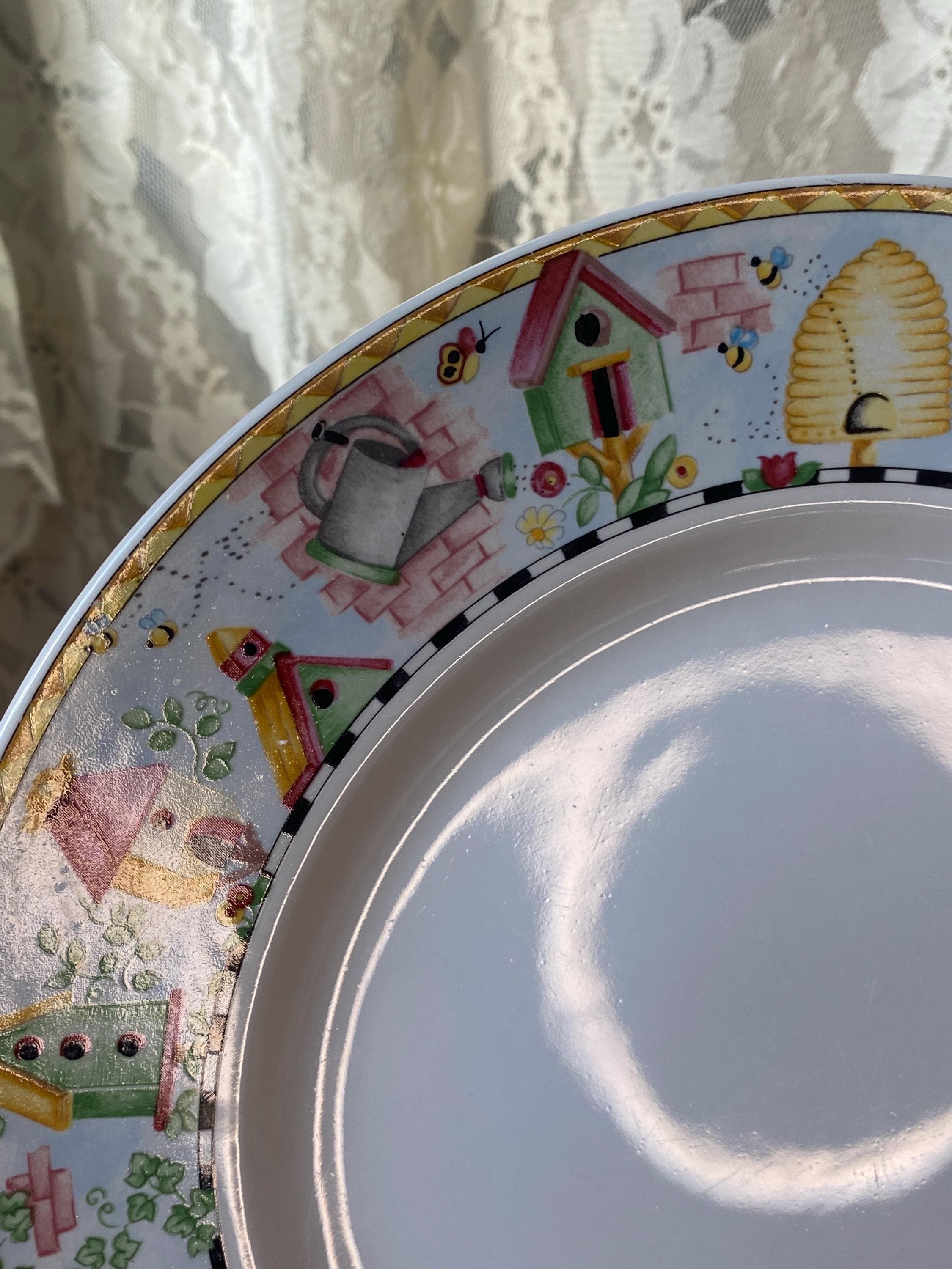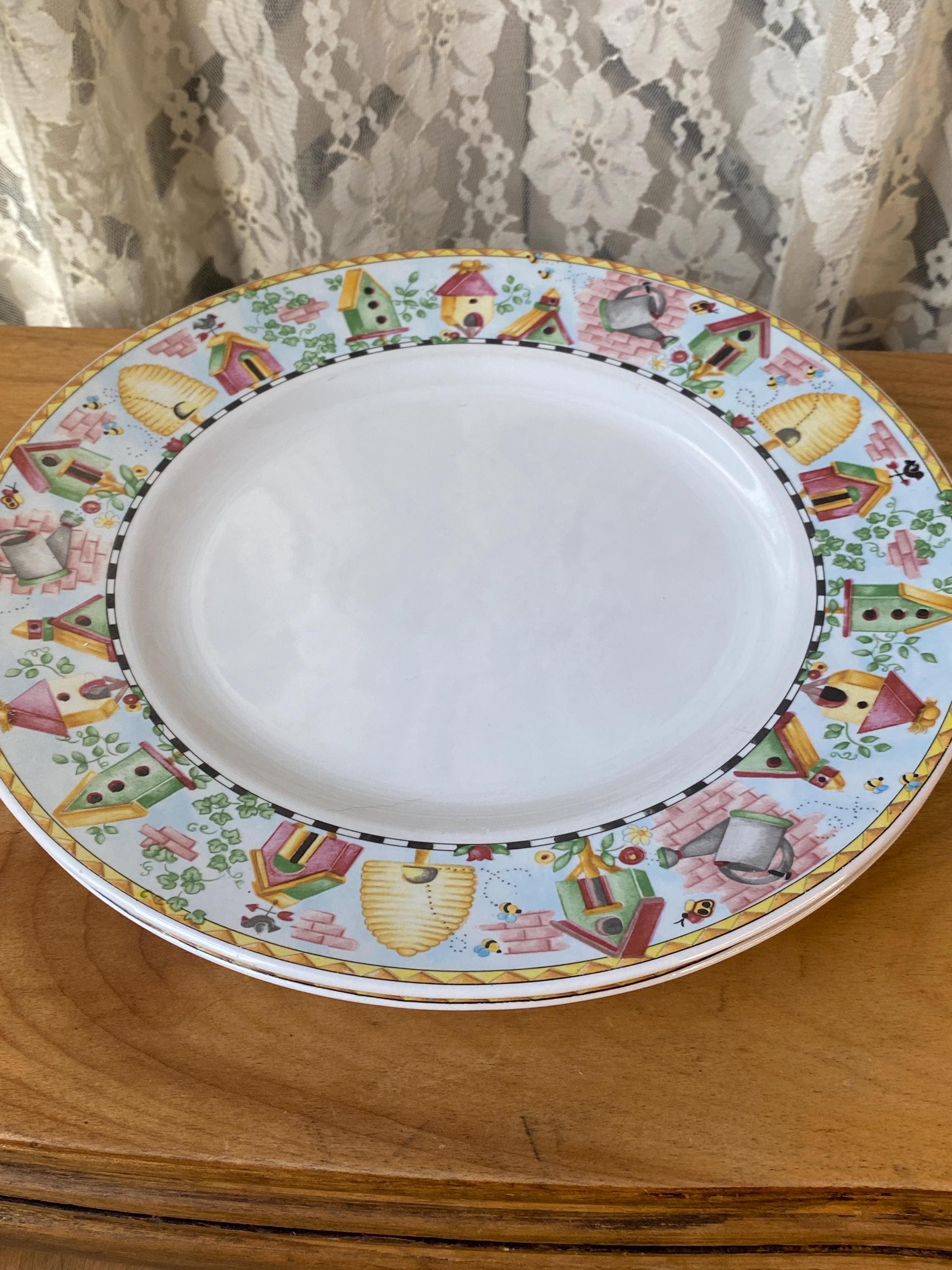 Bright, cheerful garden theme with birdhouses and beehives. Nice sturdy stoneware by Coventry. 10.5 inches across. All items in my shop are vintage or handmade and may have signs of use, wear, or variation consistent with age or hand production. Please review the photos and video carefully and message me with any questions on condition.