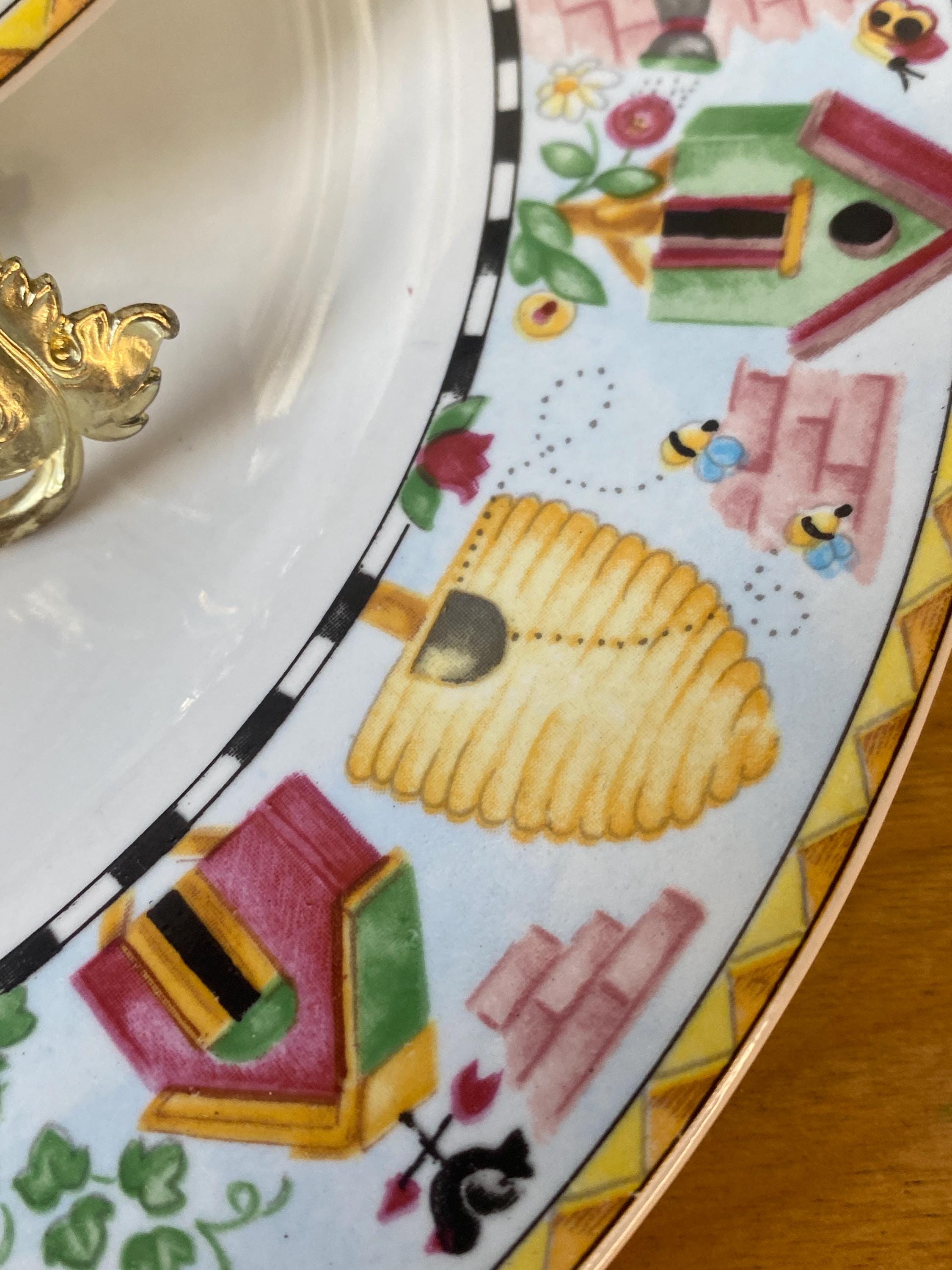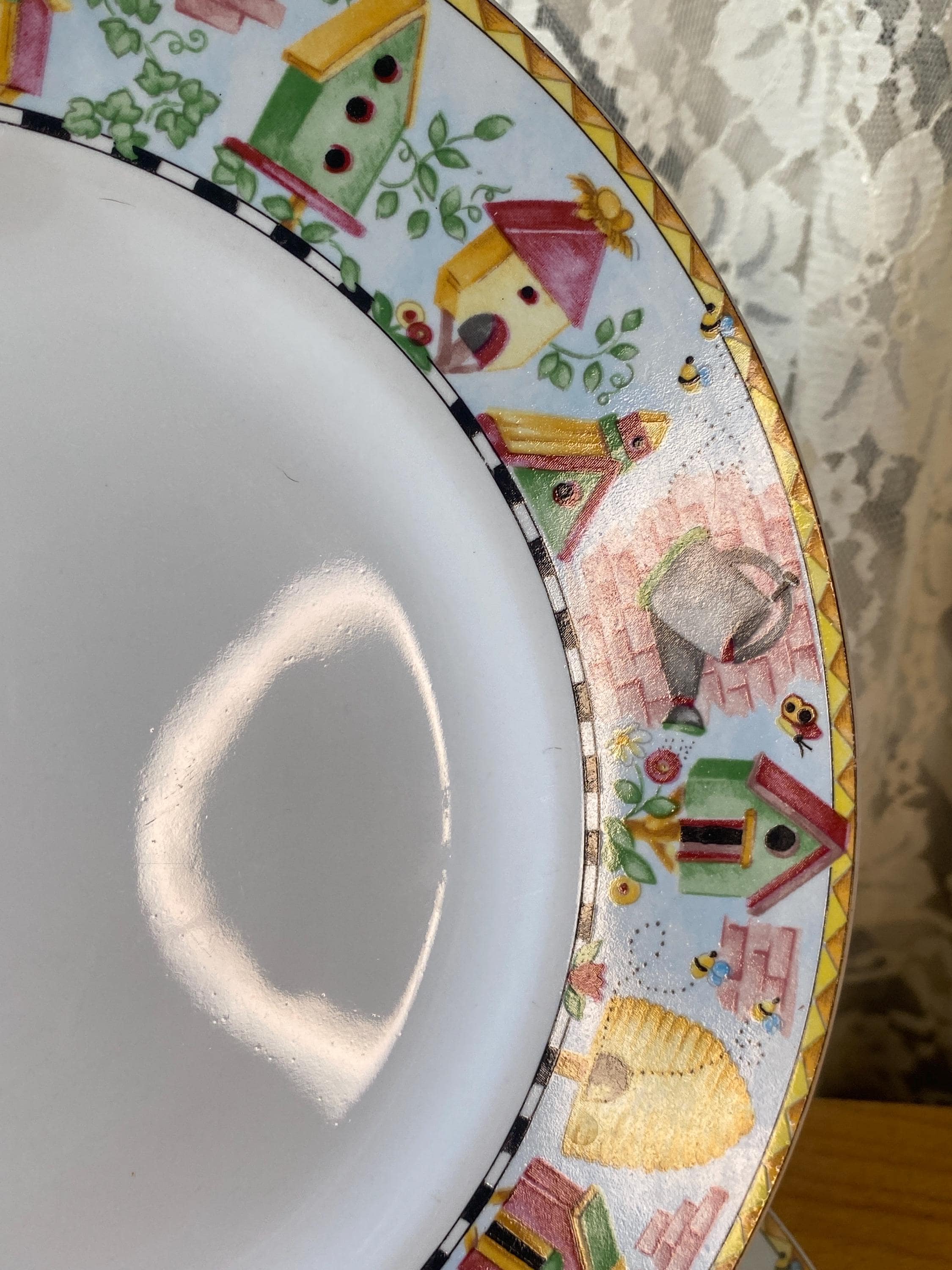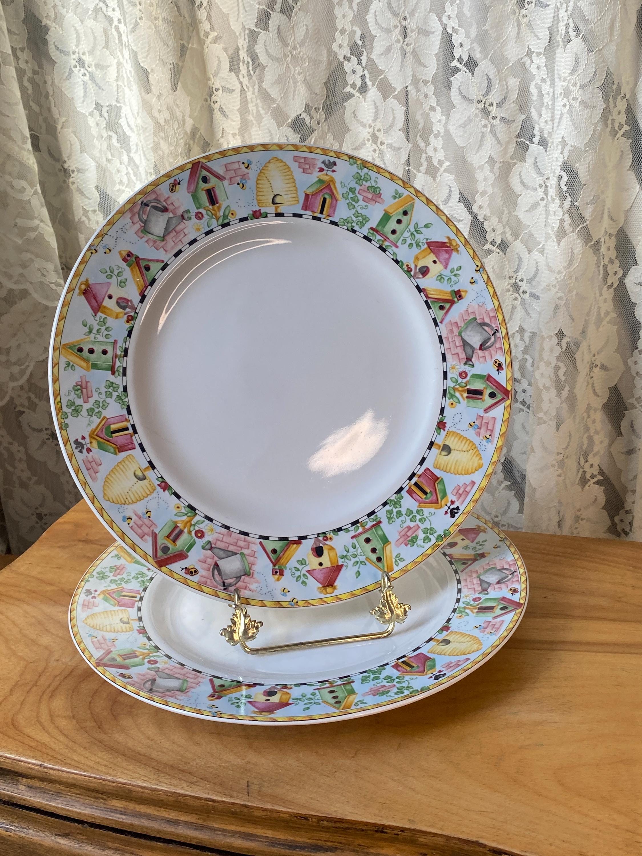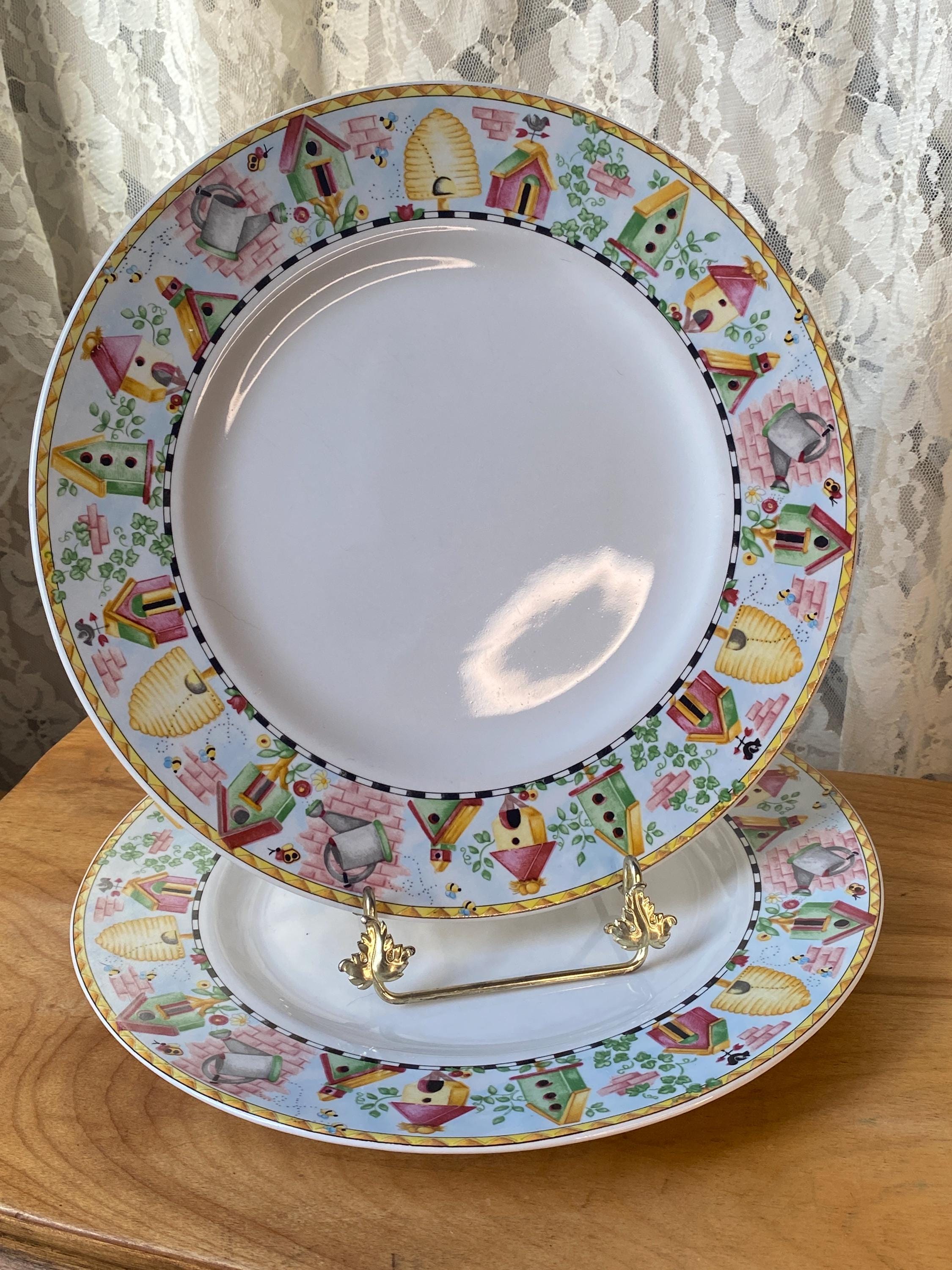 Bright, cheerful garden theme with birdhouses and beehives. Nice sturdy stoneware by Coventry. 10.5 inches across. All items in my shop are vintage or handmade and may have signs of use, wear, or variation consistent with age or hand production. Please review the photos and video carefully and message me with any questions on condition.
