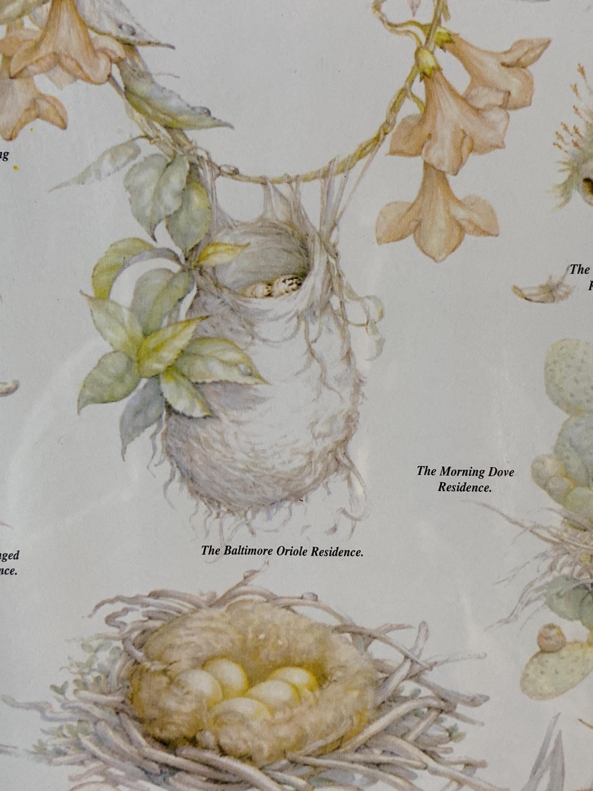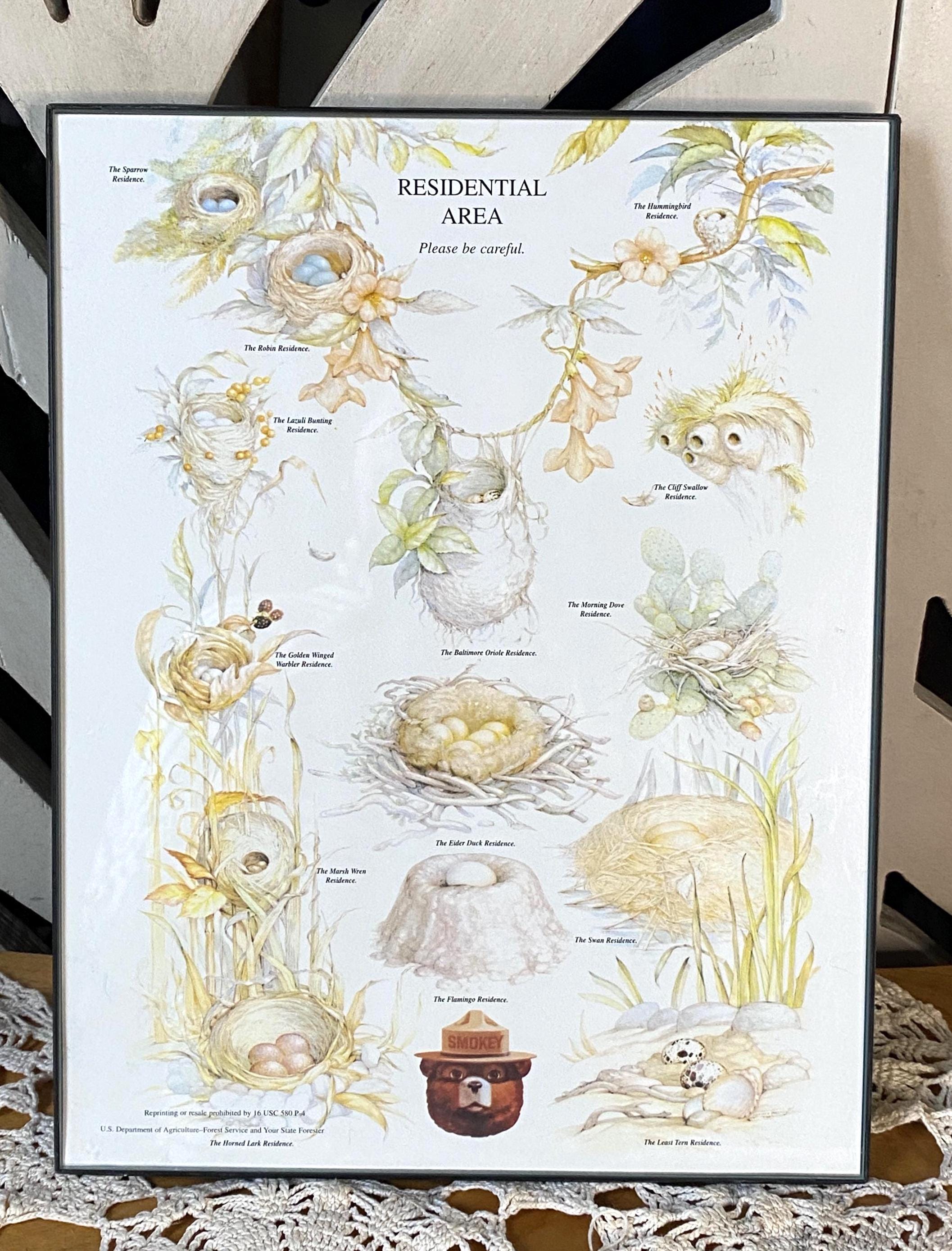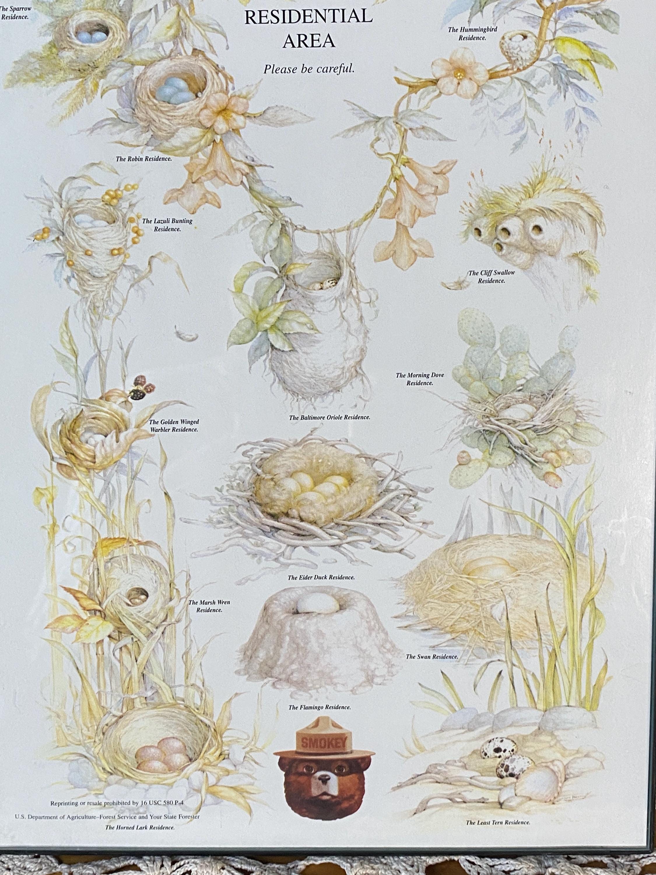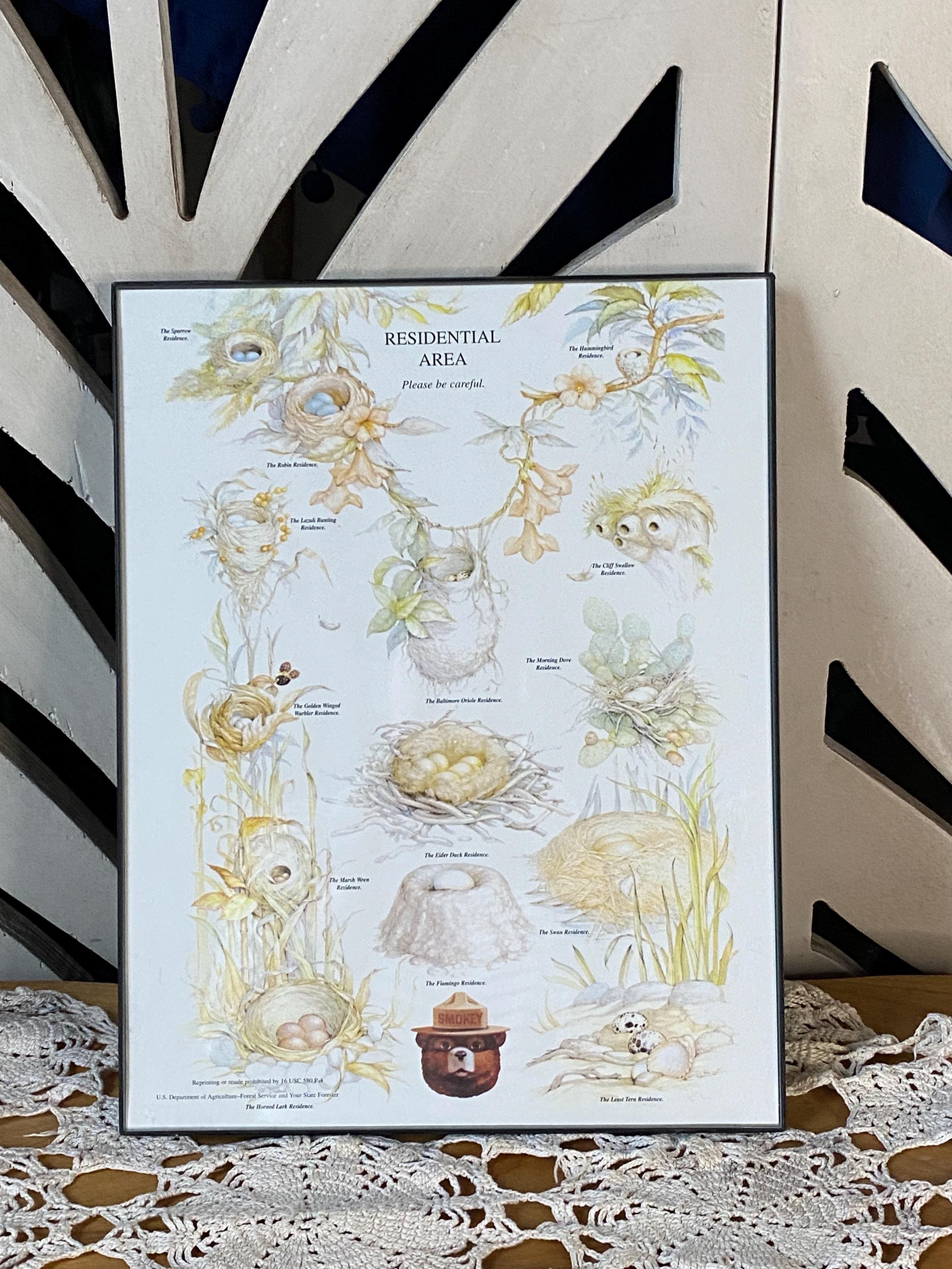 11X8.5 inches. Beautiful illustrations of bird nests. Frame is plastic. Paper is slightly warped but it is difficult to see. All items in my shop are vintage or handmade and may have signs of use, wear, or variation consistent with age or hand production. Please review the photos and video carefully and message me with any questions on condition.