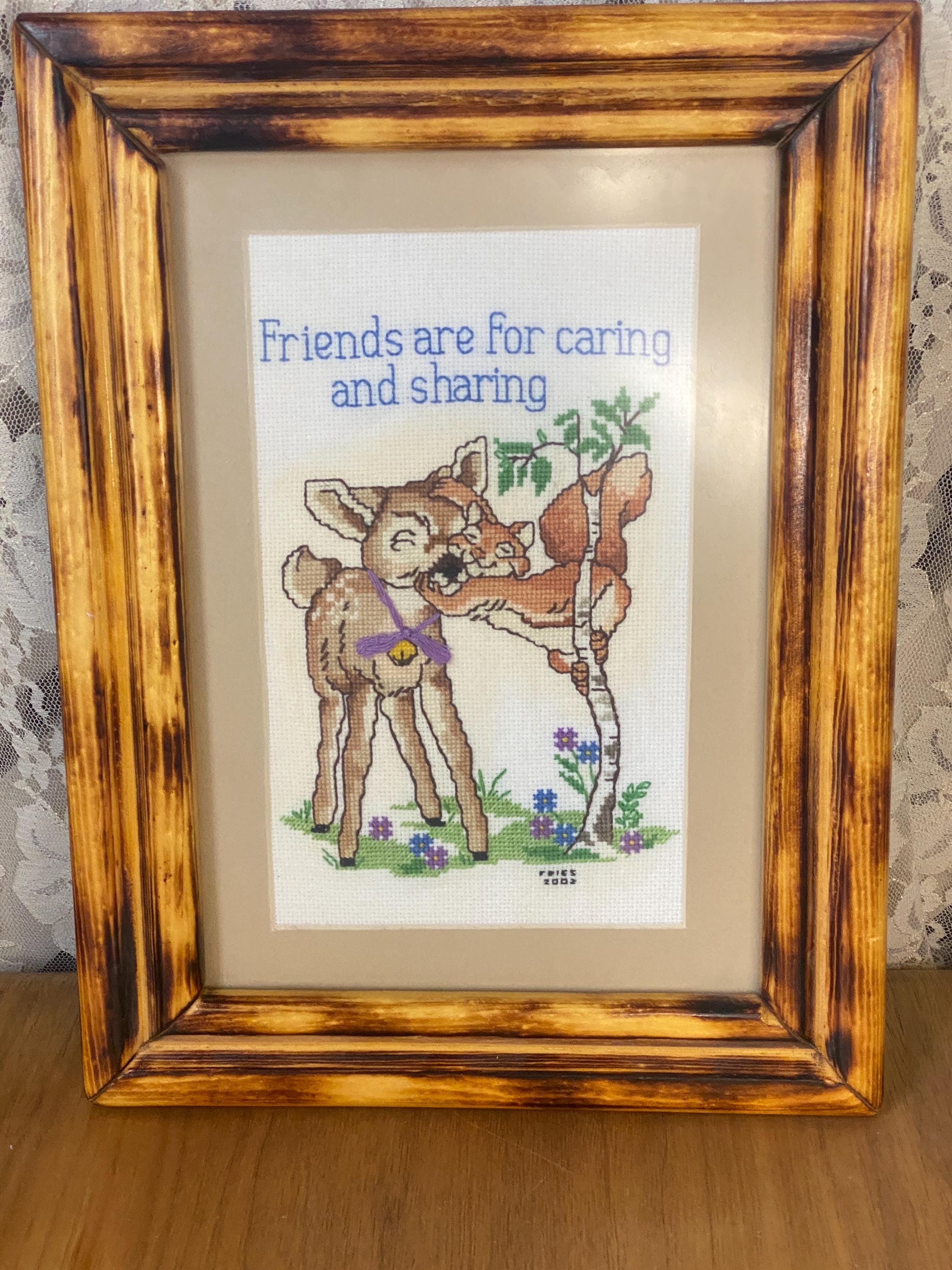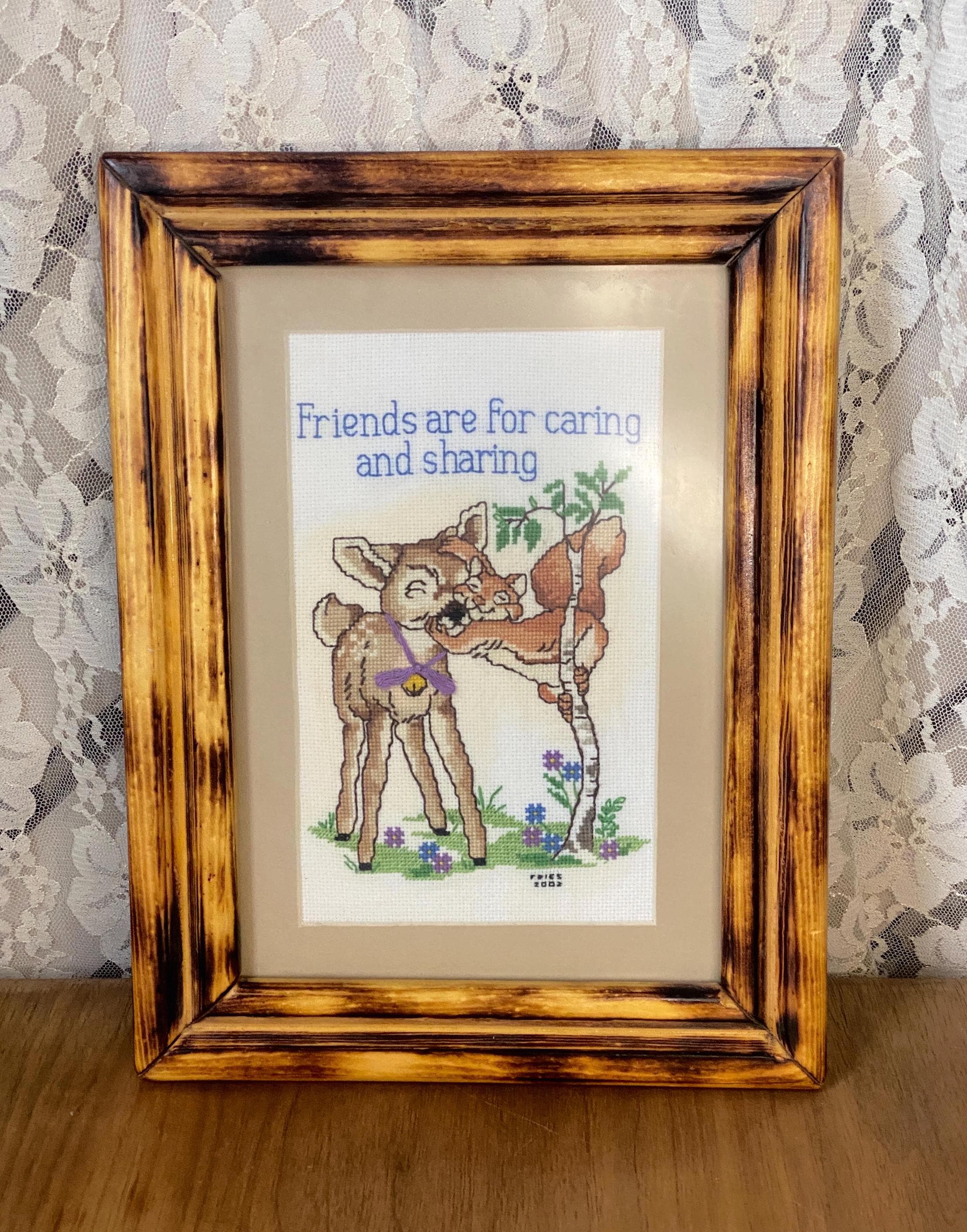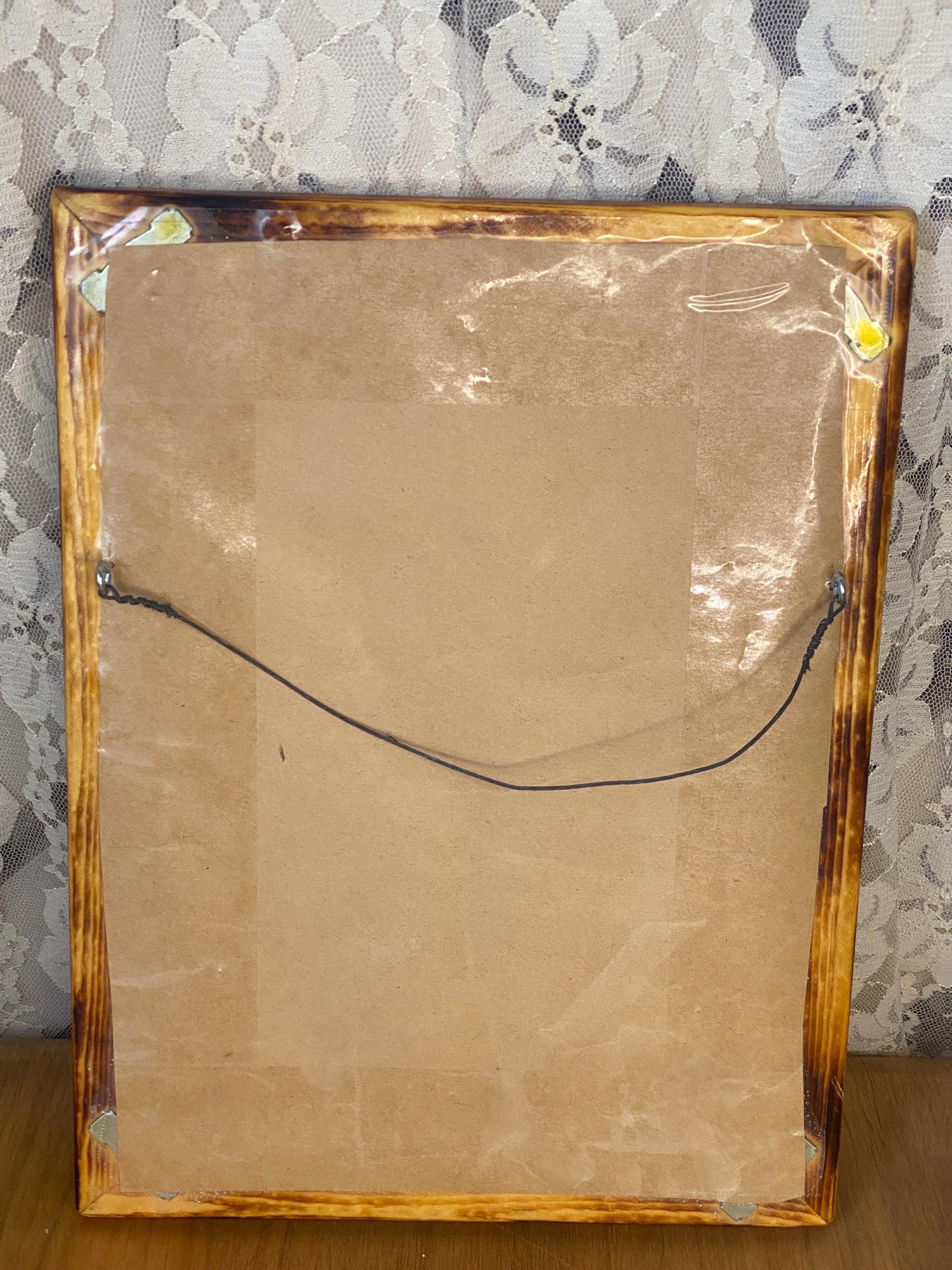 12.5X9.5 inches. Pretty pastel blue and green with little deer and squirrel friends. This would make such cute nursery decor. The frame is just as beautiful as the art. All items in my shop are vintage or handmade and may have signs of use, wear, or variation consistent with age or hand production. Please review the photos and video carefully and message me with any questions on condition.