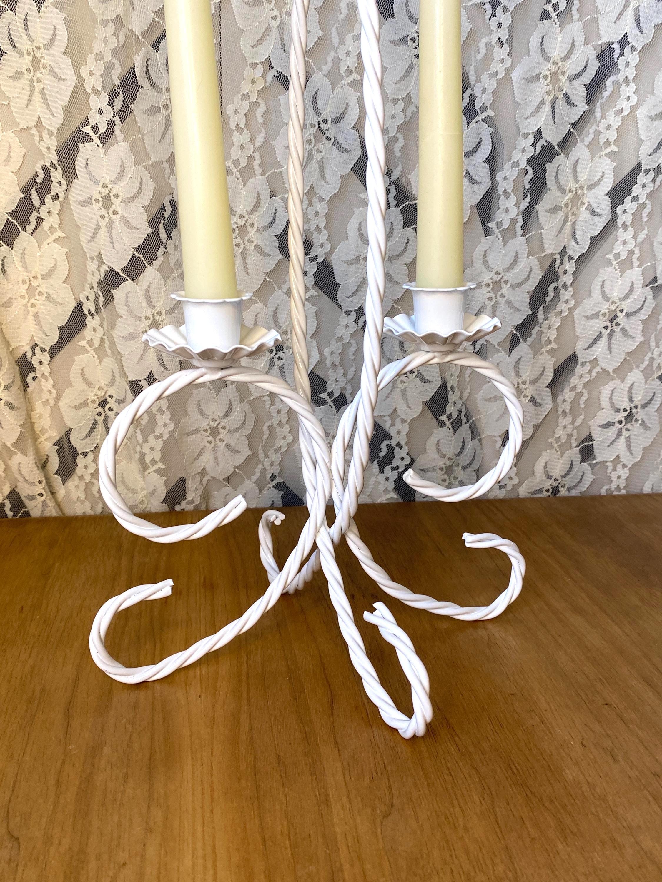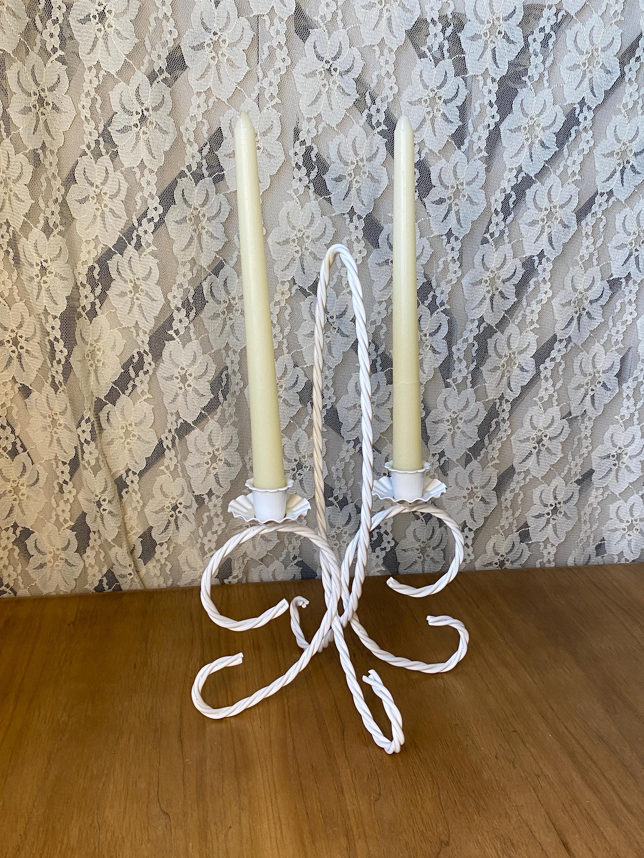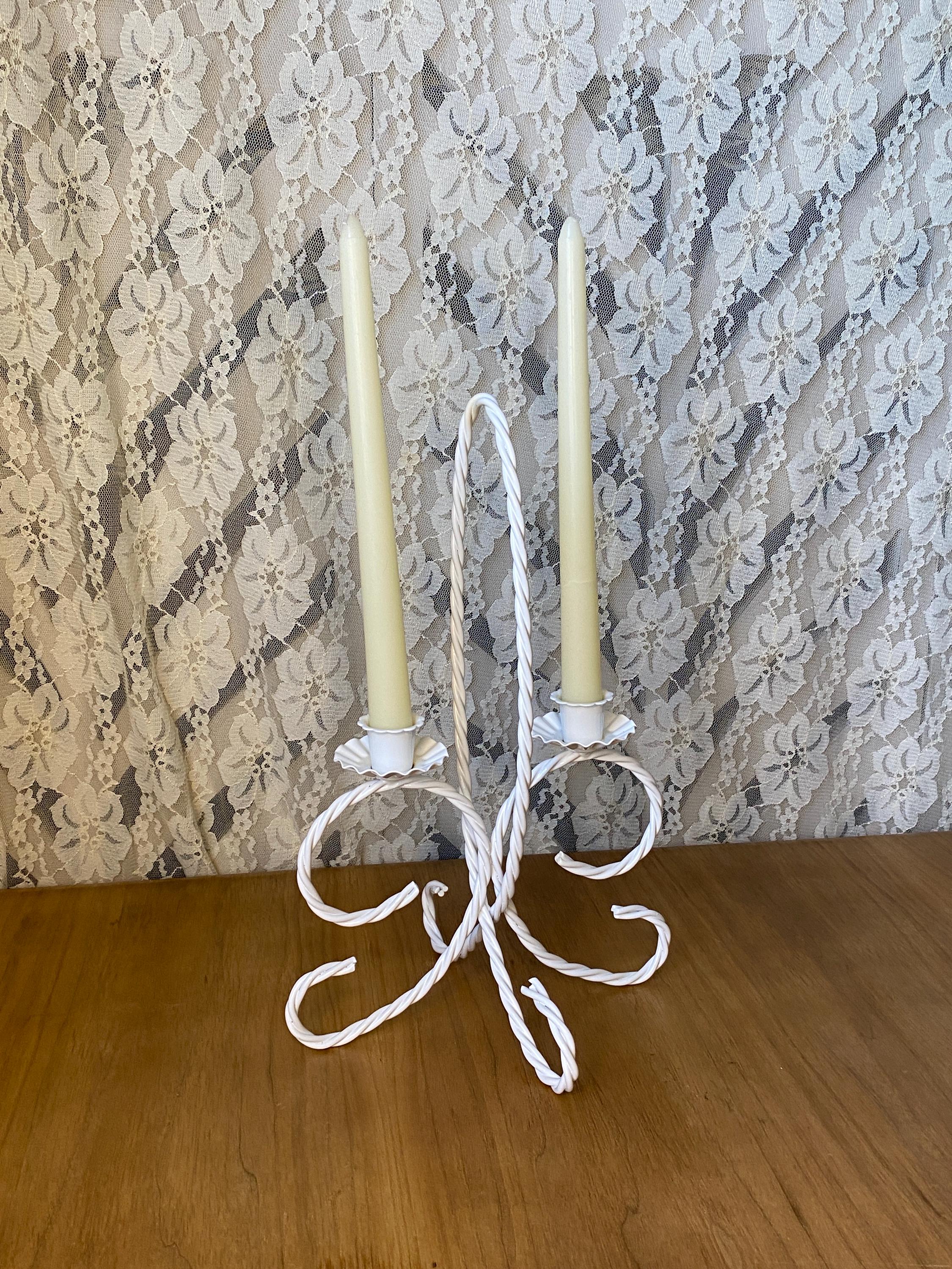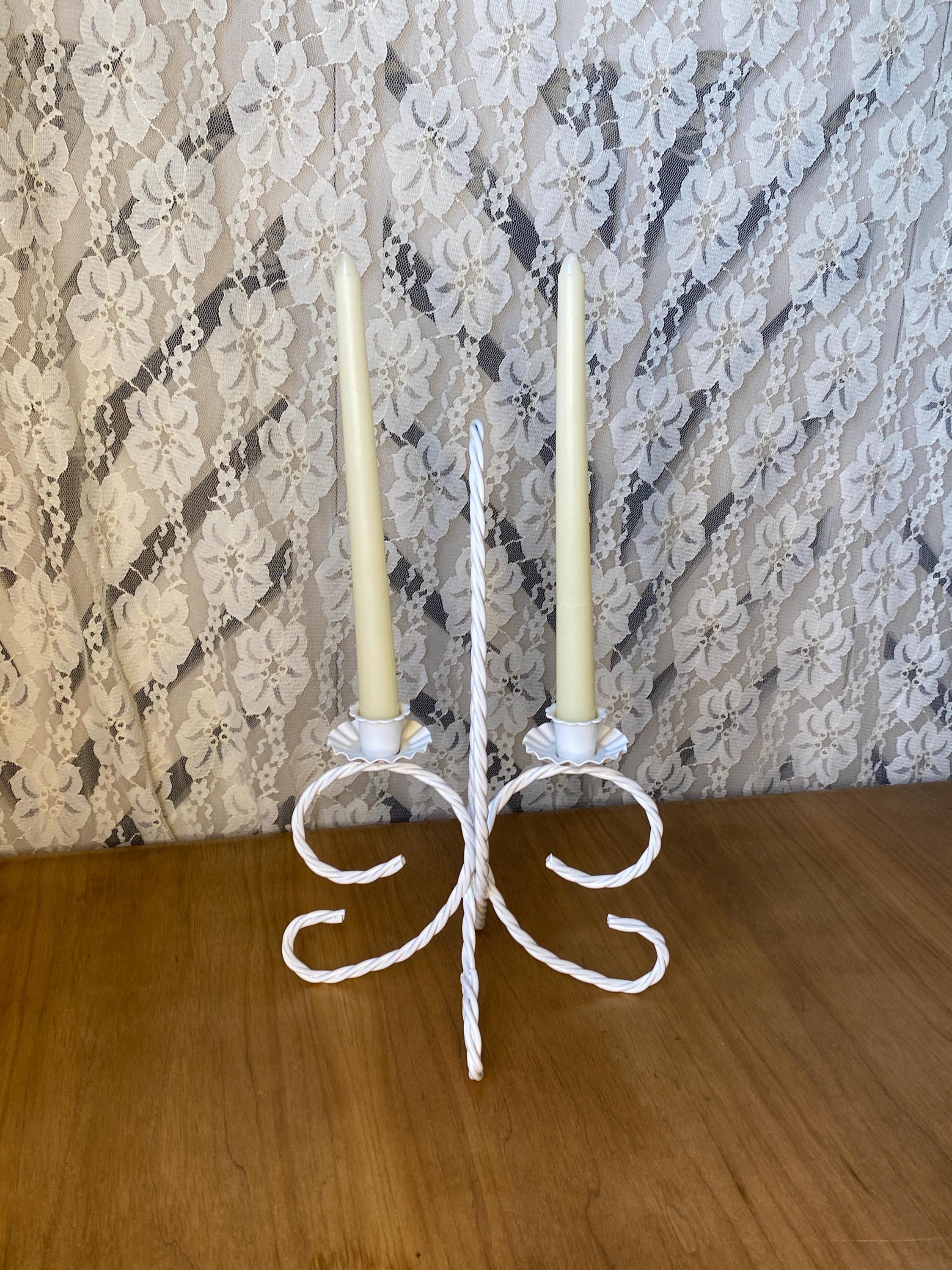 13 inches tall, 7.5X8.5 inches wide. Such a versatile piece that would fit with so many decor themes. Holds two taper candles. A couple of small stains around one rim and a few scratches/ see photos. All items in my shop are vintage or handmade and may have signs of use, wear, or variation consistent with age or hand production. Please review the photos and video carefully and message me with any questions on condition.