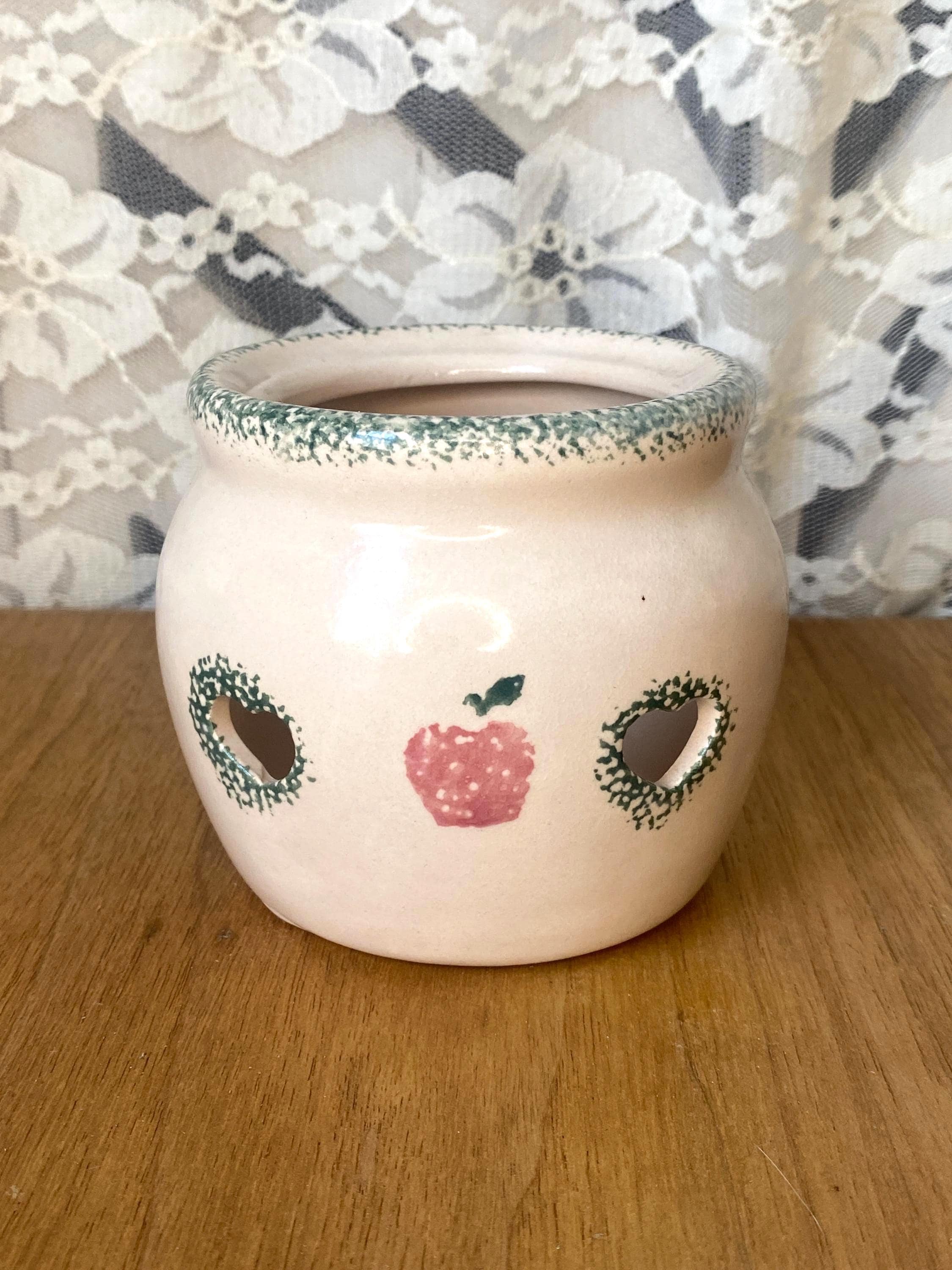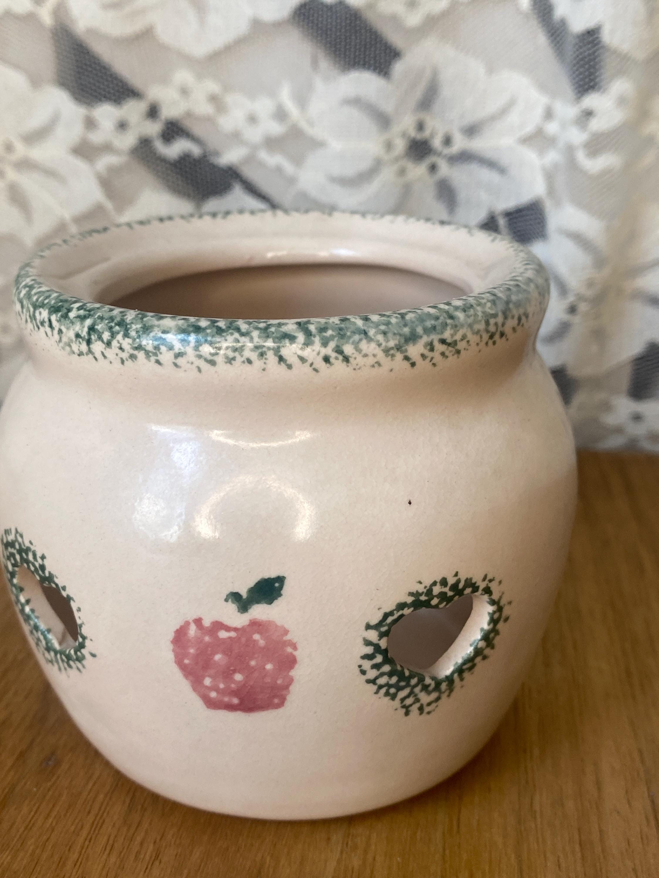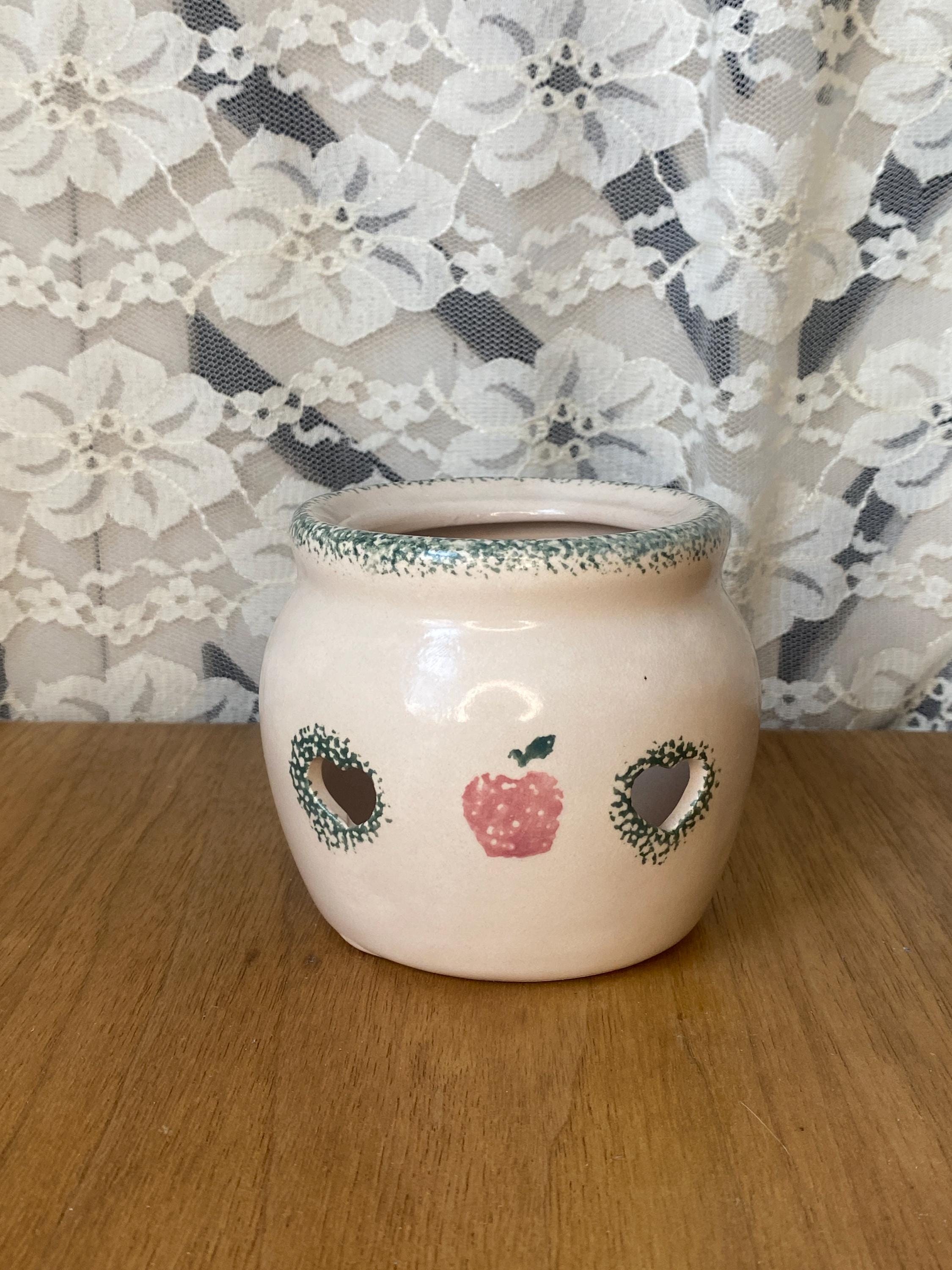 3.5X3.5 inches. Holds a small candle and looks perfect in a country style home. Made by Loomco. Good vintage condition, no lid. All items in my shop are vintage or handmade and may have signs of use, wear, or variation consistent with age or hand production. Please review the photos and video carefully and message me with any questions on condition.