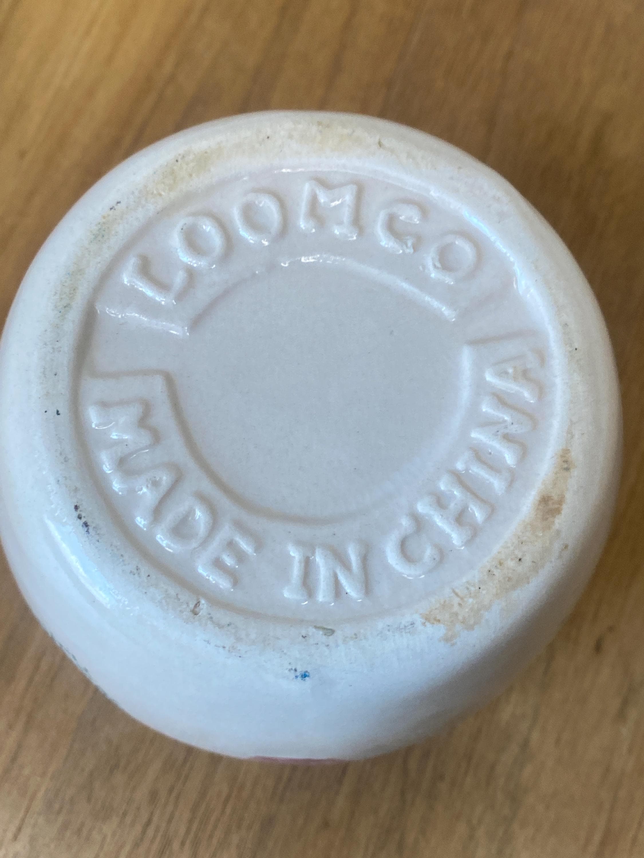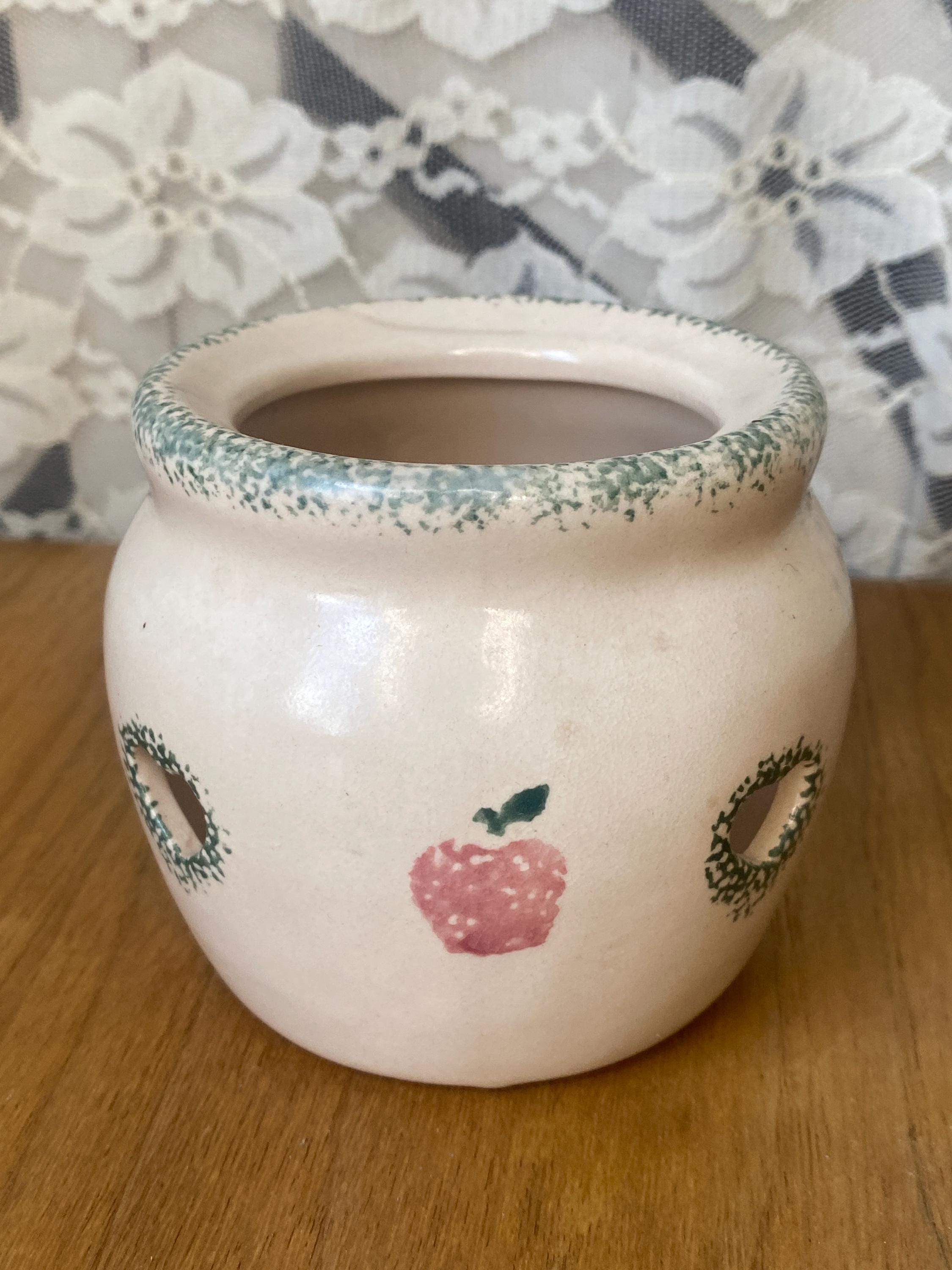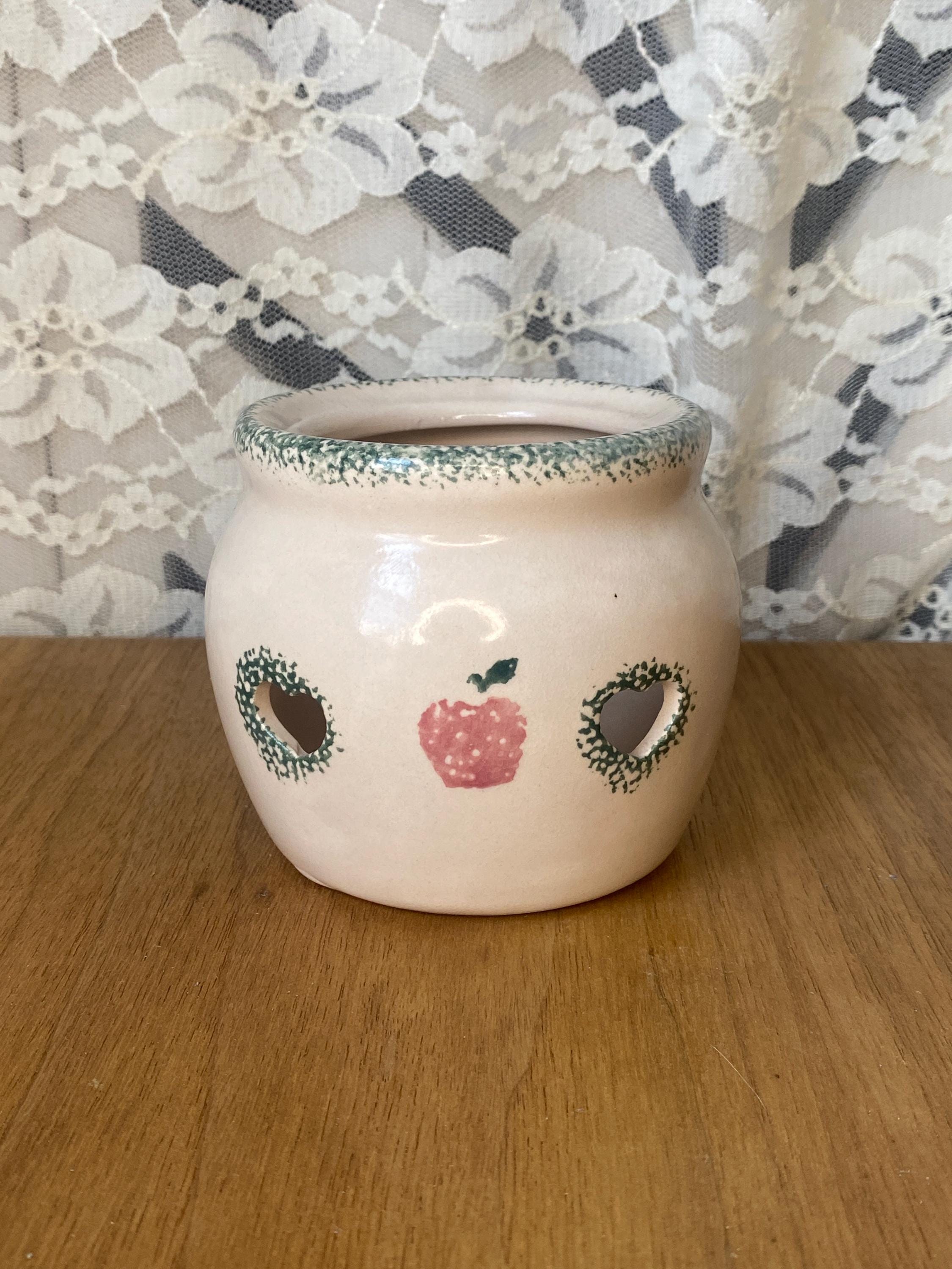 3.5X3.5 inches. Holds a small candle and looks perfect in a country style home. Made by Loomco. Good vintage condition, no lid. All items in my shop are vintage or handmade and may have signs of use, wear, or variation consistent with age or hand production. Please review the photos and video carefully and message me with any questions on condition.