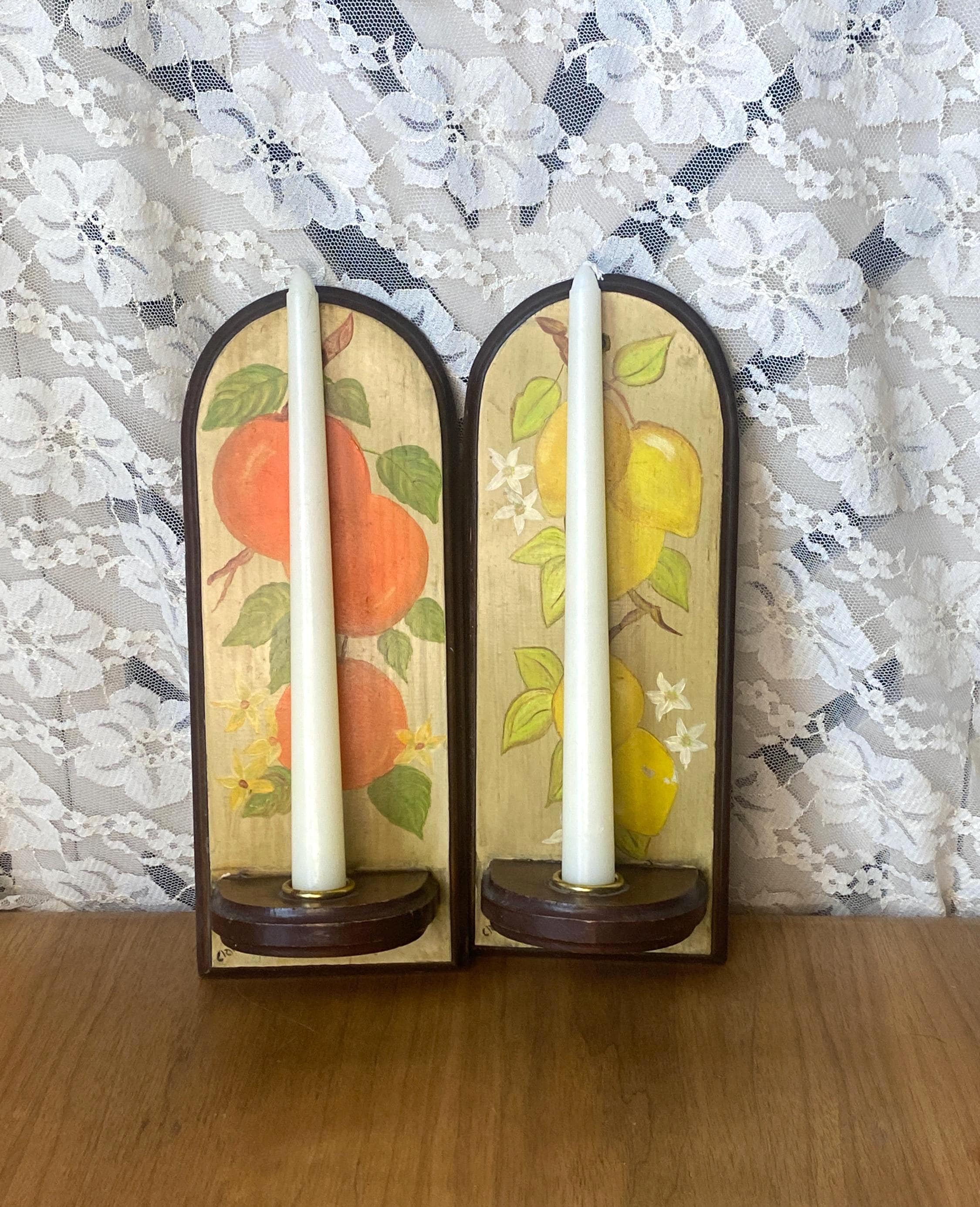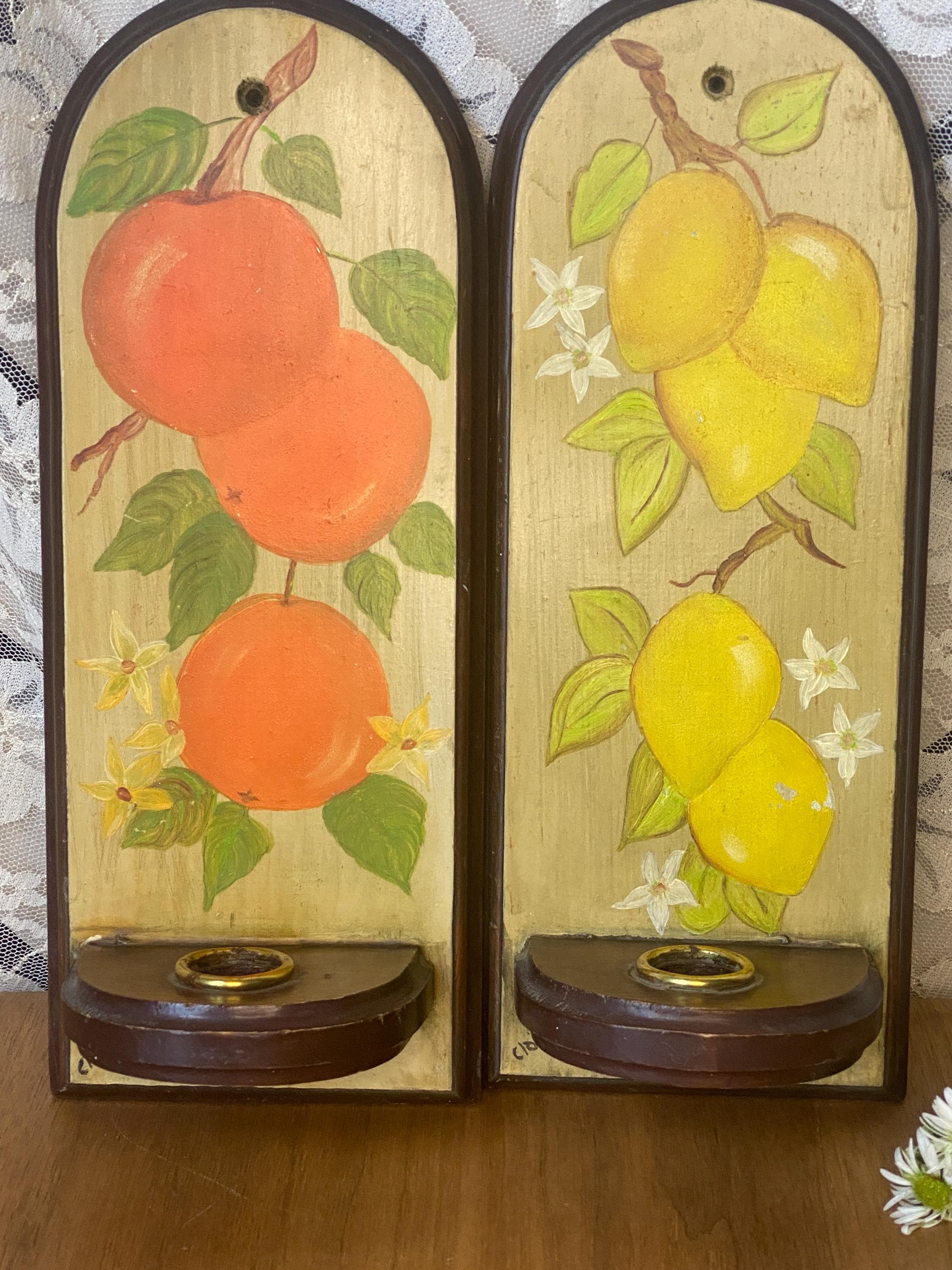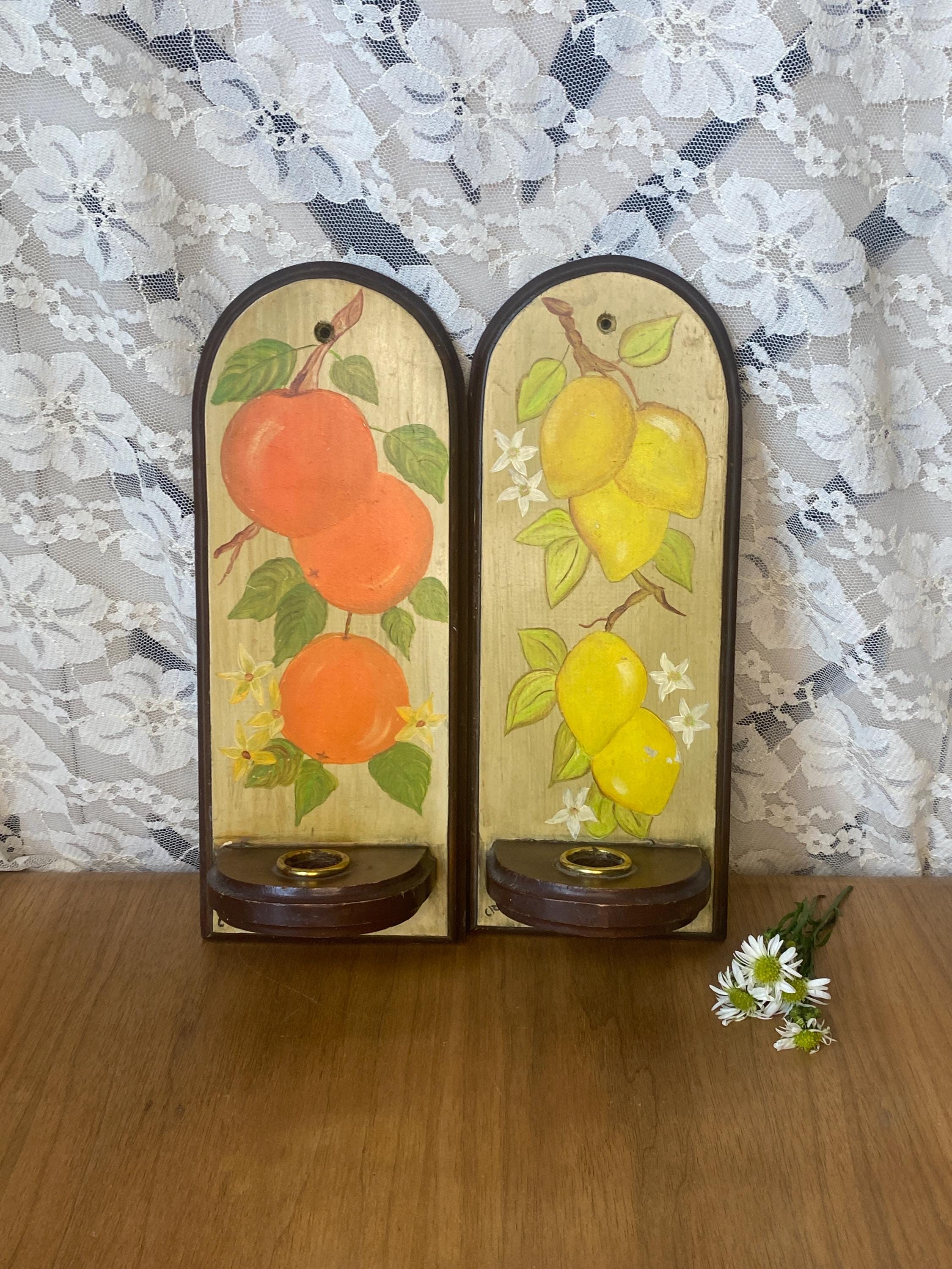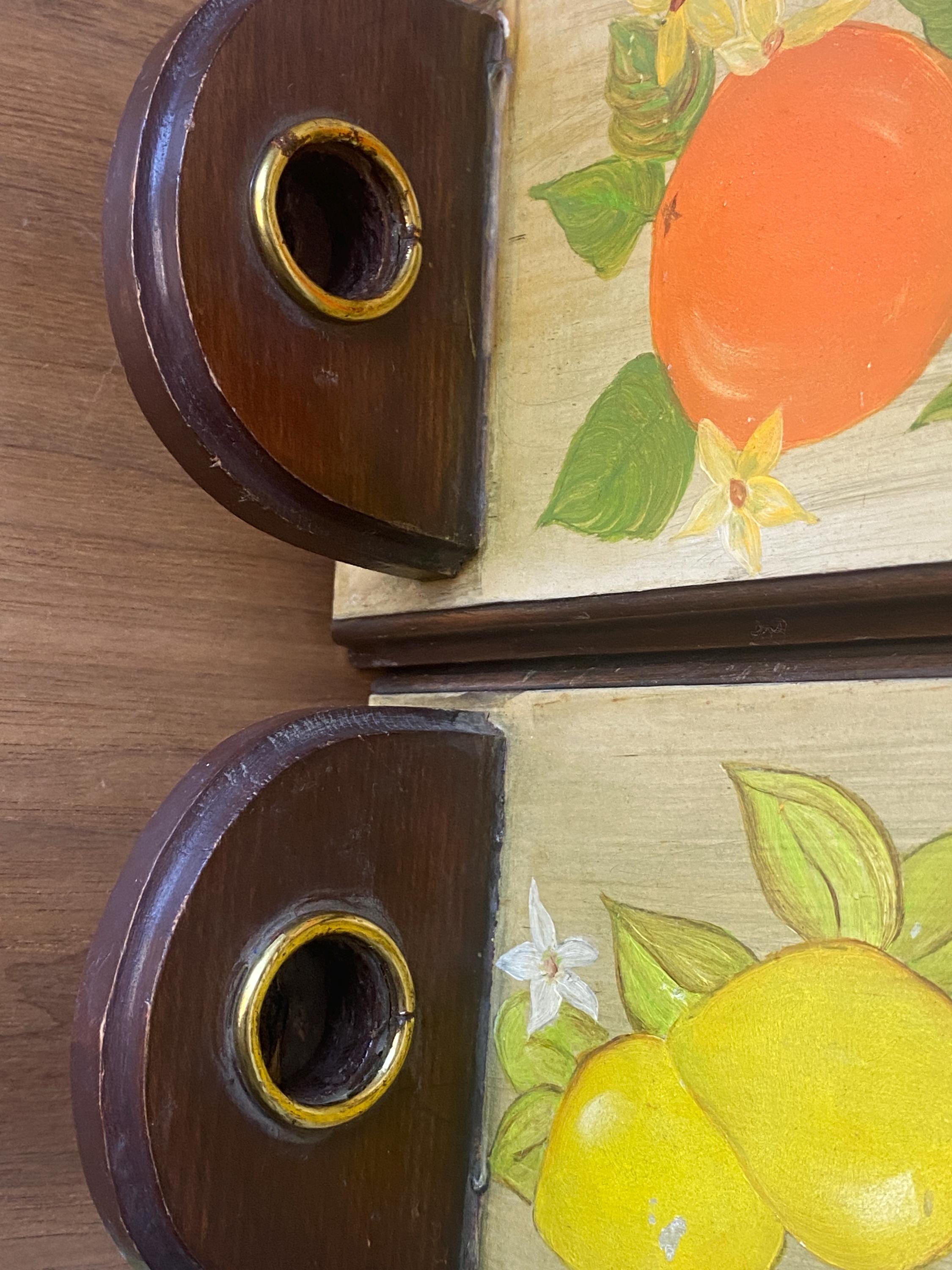 4.25X11 inches. Great little retro pieces with cheerful orange and yellow hand-painted fruit. Some scratches on wood/ wear consistent with condition. All items in my shop are vintage or handmade and may have signs of use, wear, or variation consistent with age or hand production. Please review the photos and video carefully and message me with any questions on condition.