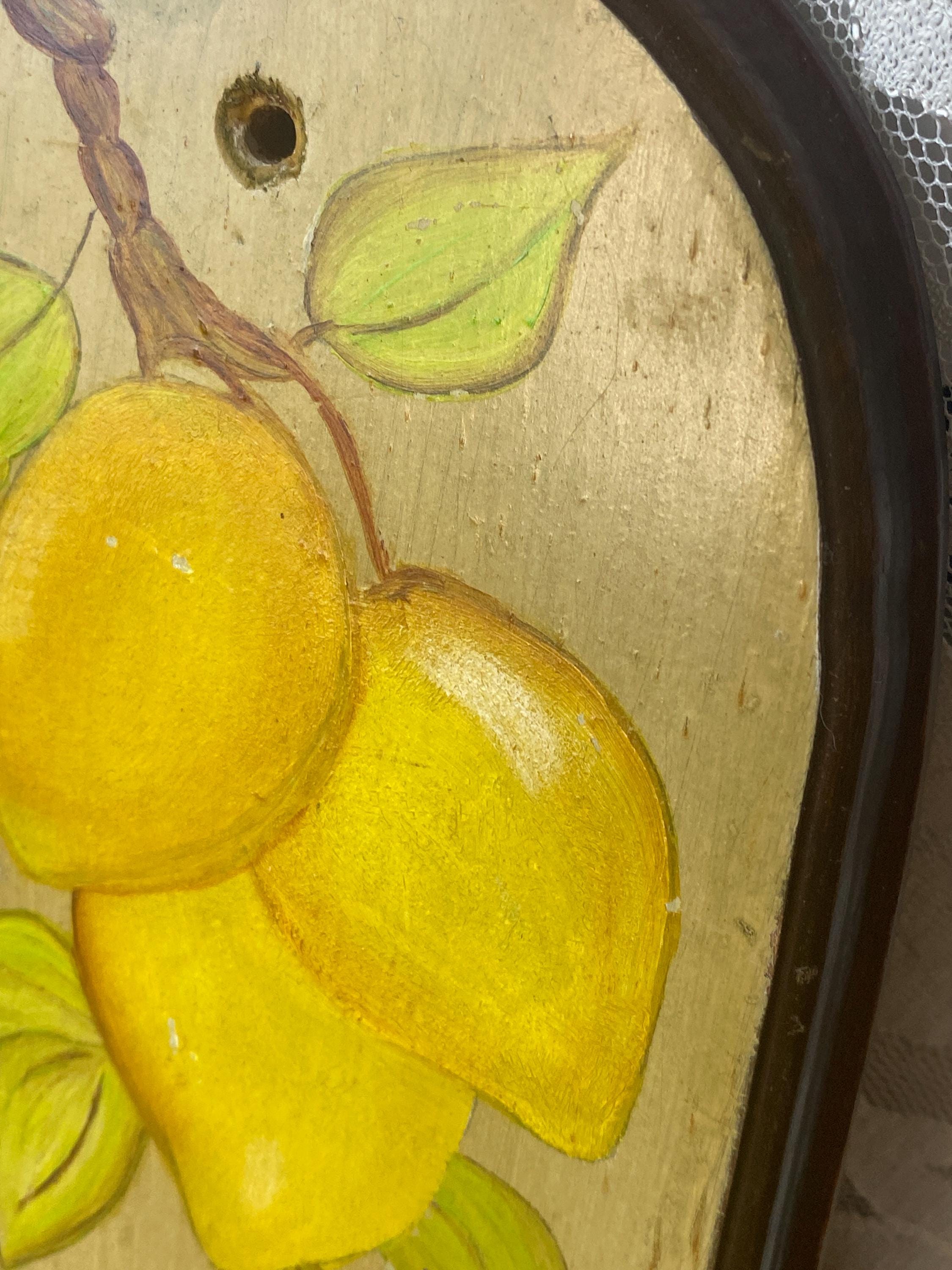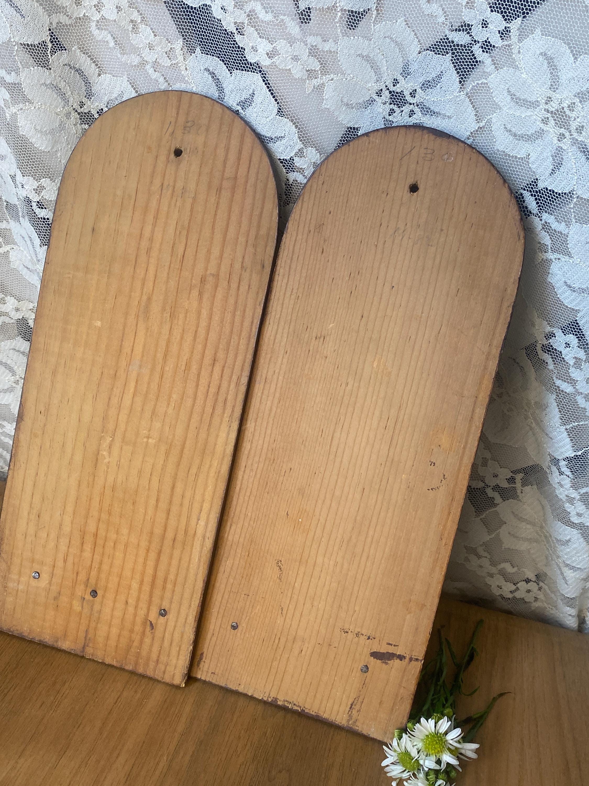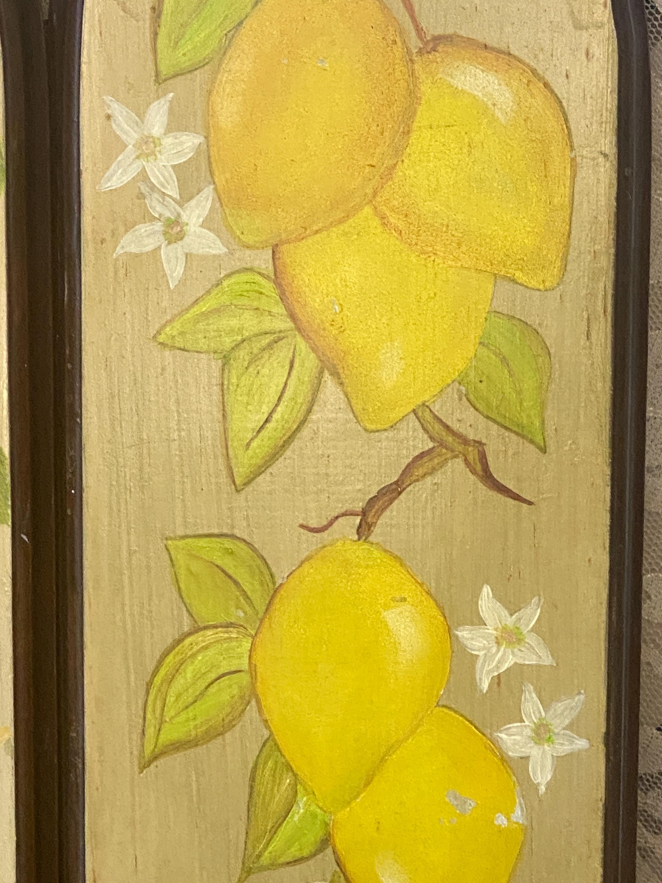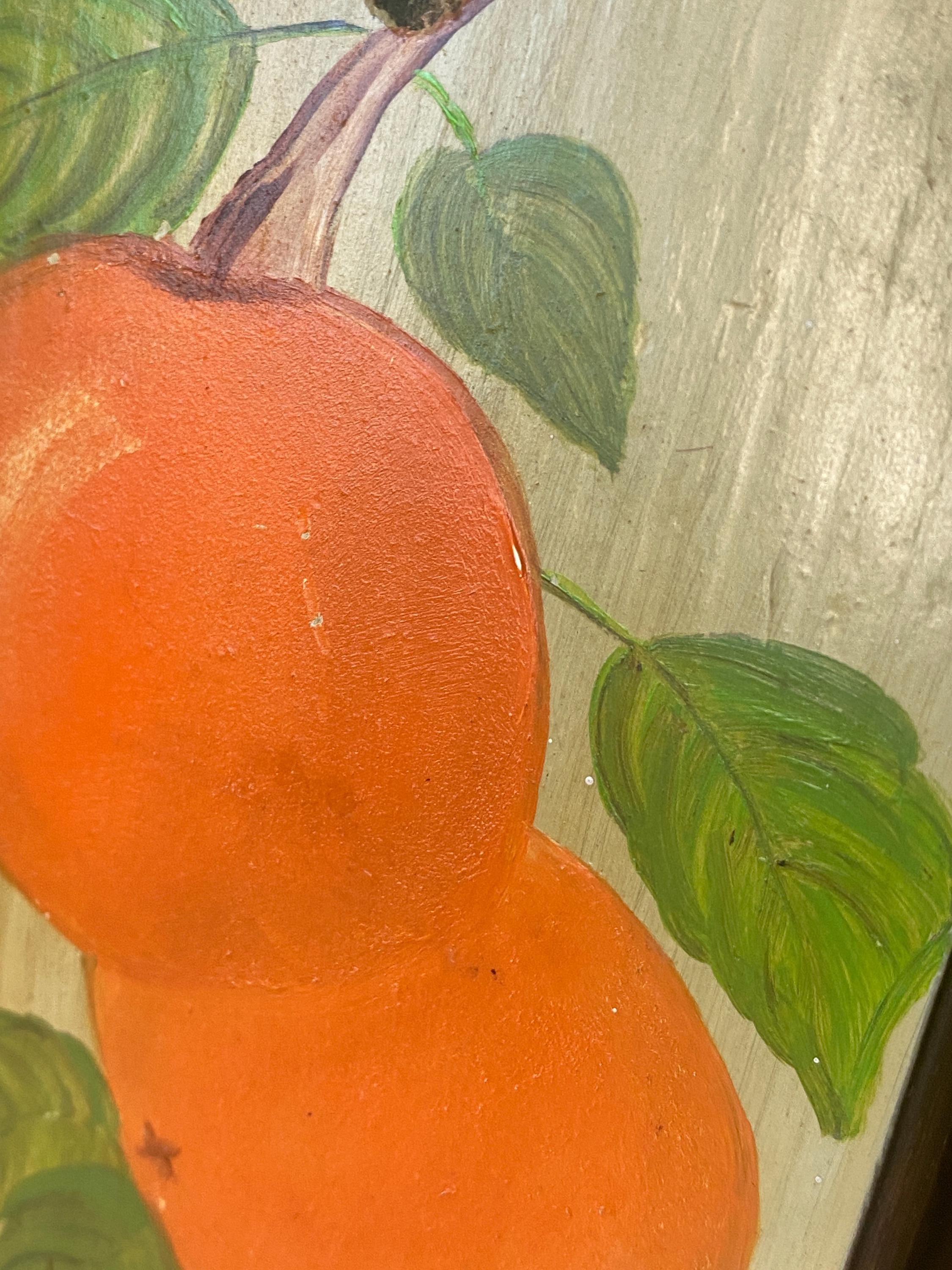 4.25X11 inches. Great little retro pieces with cheerful orange and yellow hand-painted fruit. Some scratches on wood/ wear consistent with condition. All items in my shop are vintage or handmade and may have signs of use, wear, or variation consistent with age or hand production. Please review the photos and video carefully and message me with any questions on condition.