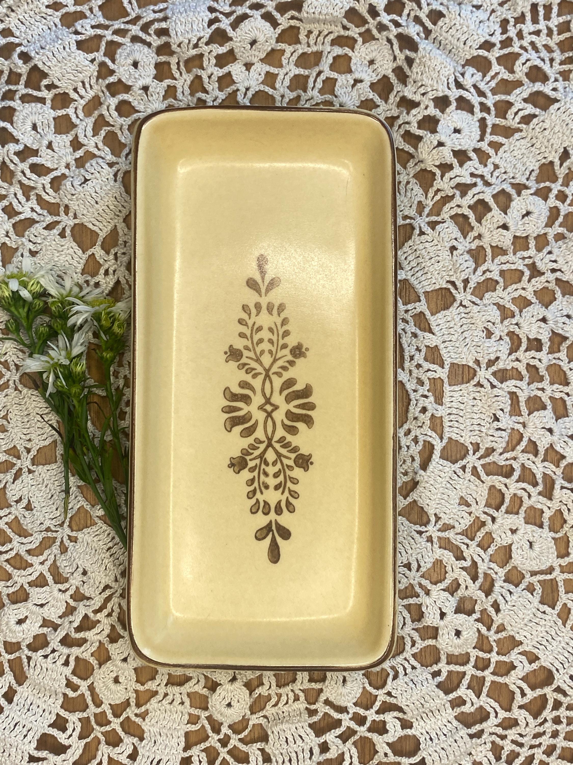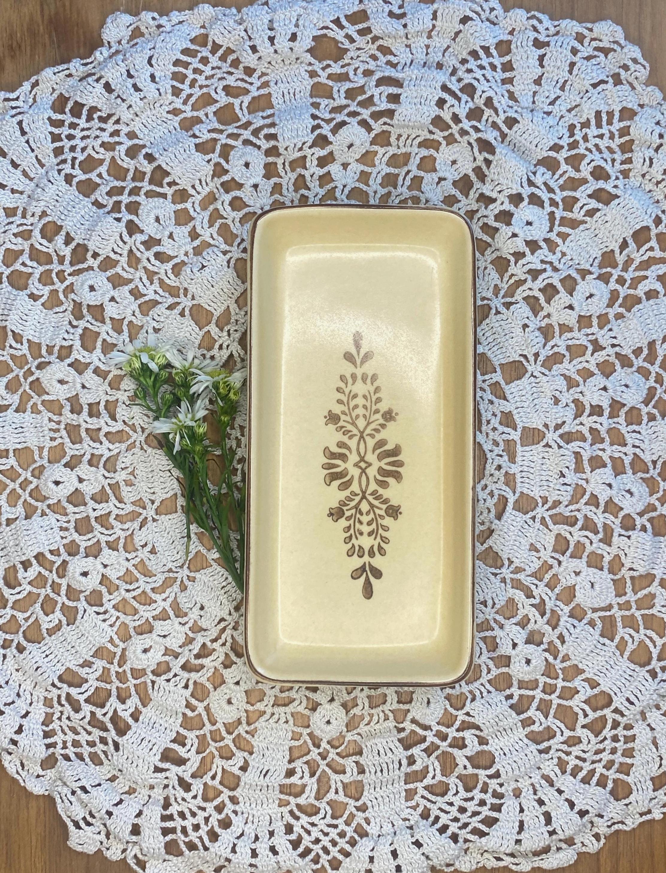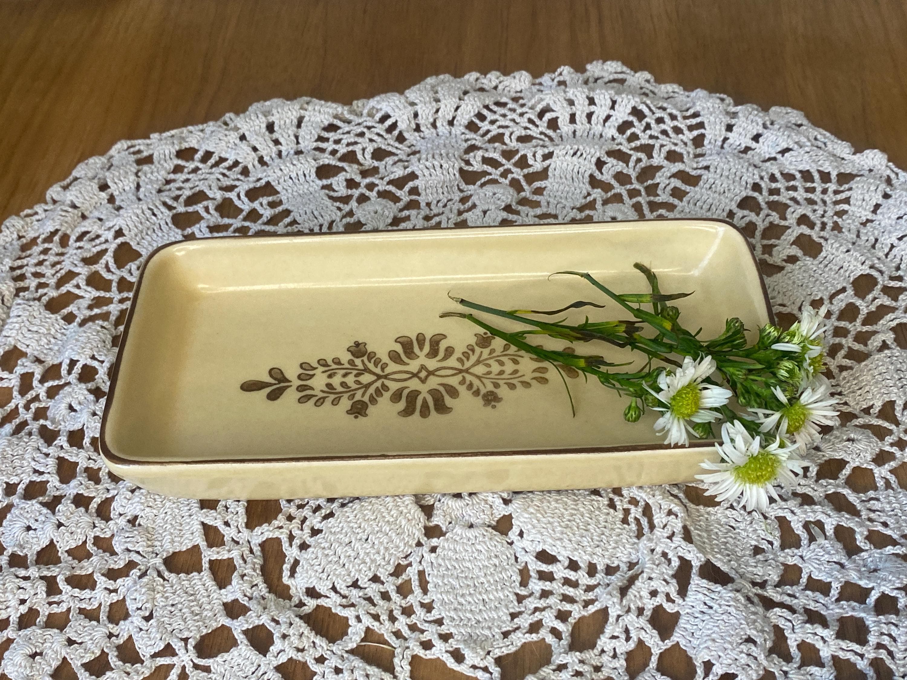 3.5X7.5X1 inches. Perfect size for serving appetizers, butter, or condiments. Good vintage condition, a couple of very small rub marks. All items in my shop are vintage or handmade and may have signs of use, wear, or variation consistent with age or hand production. Please review the photos and video carefully and message me with any questions on condition.