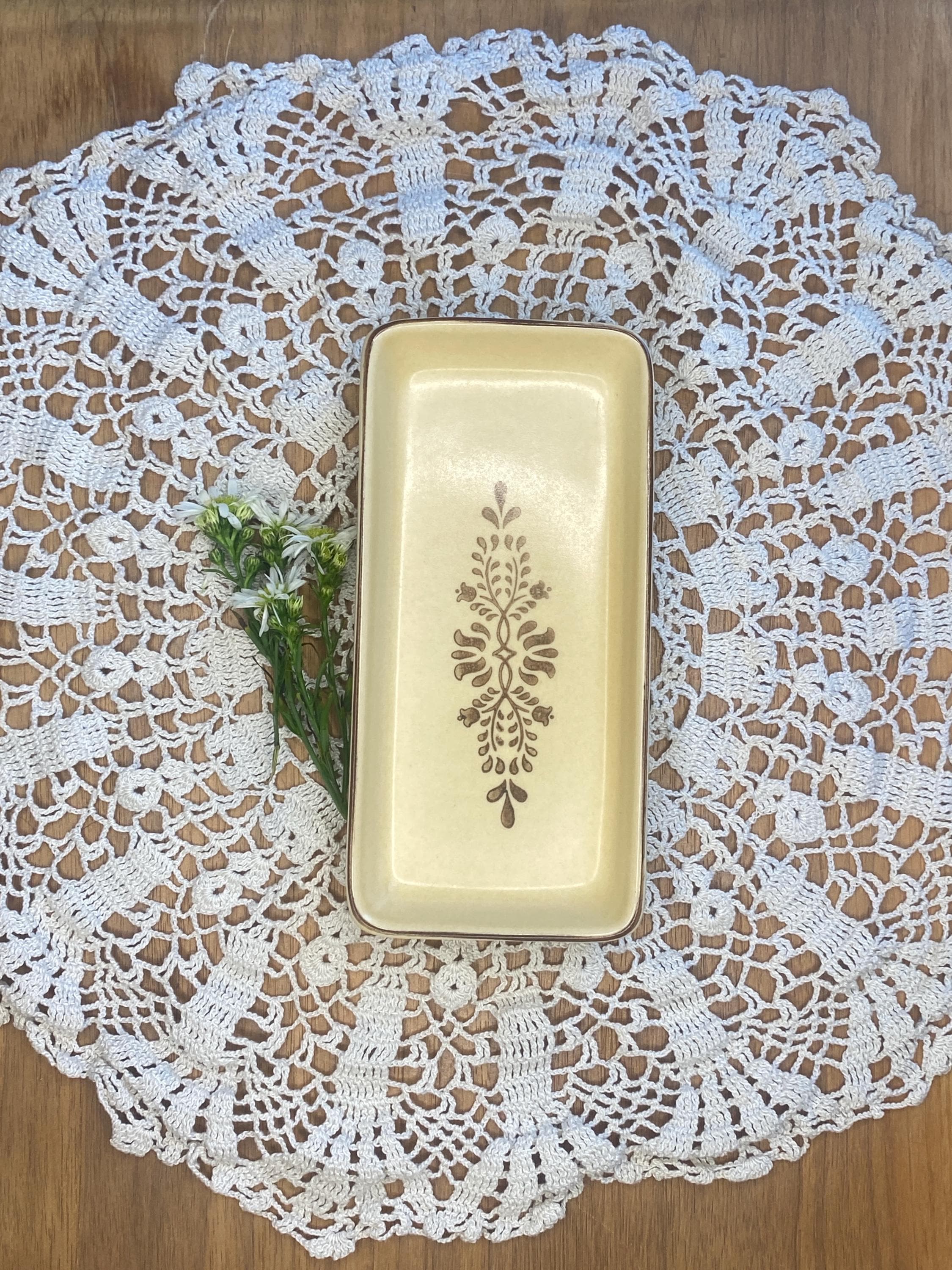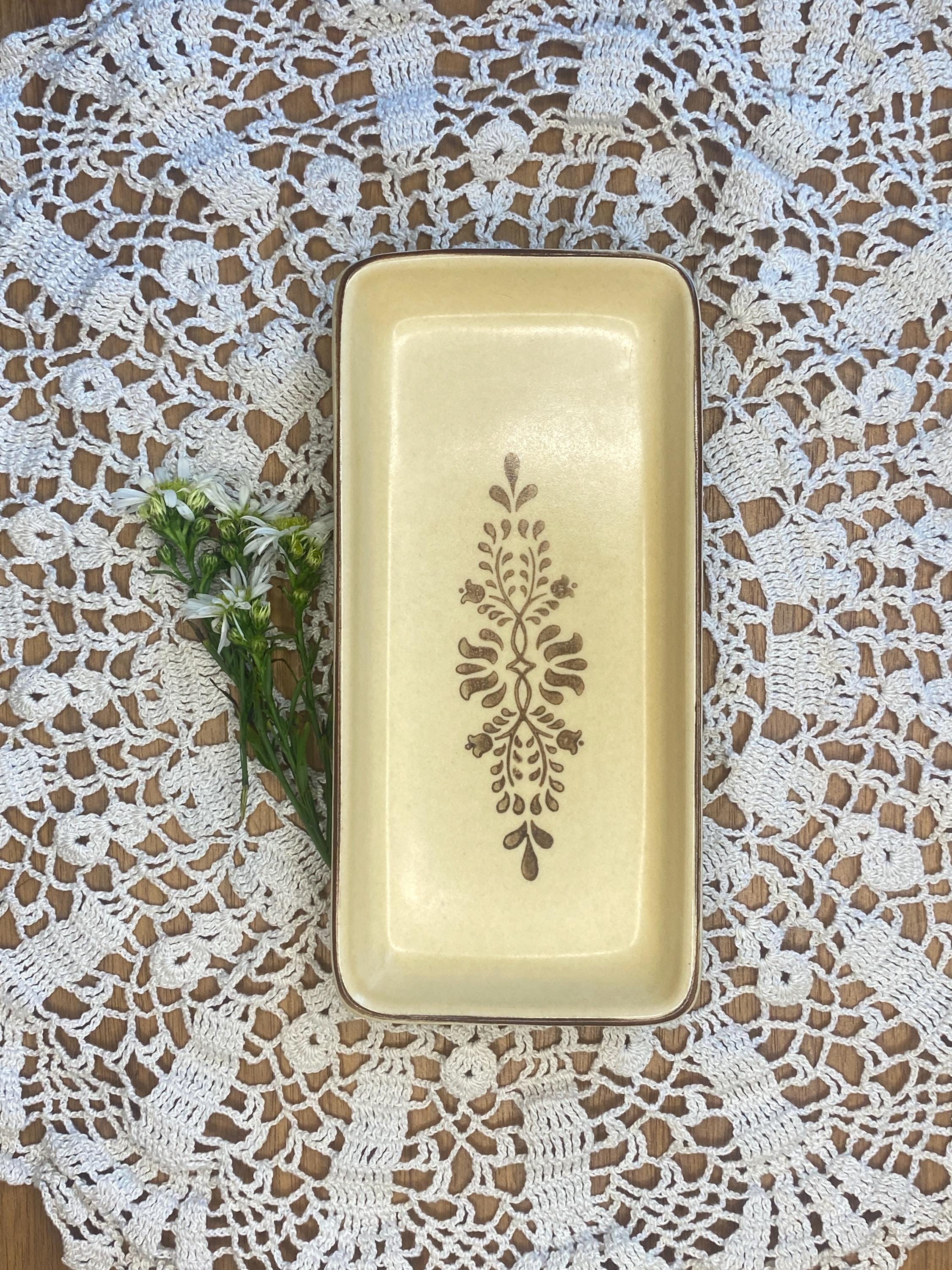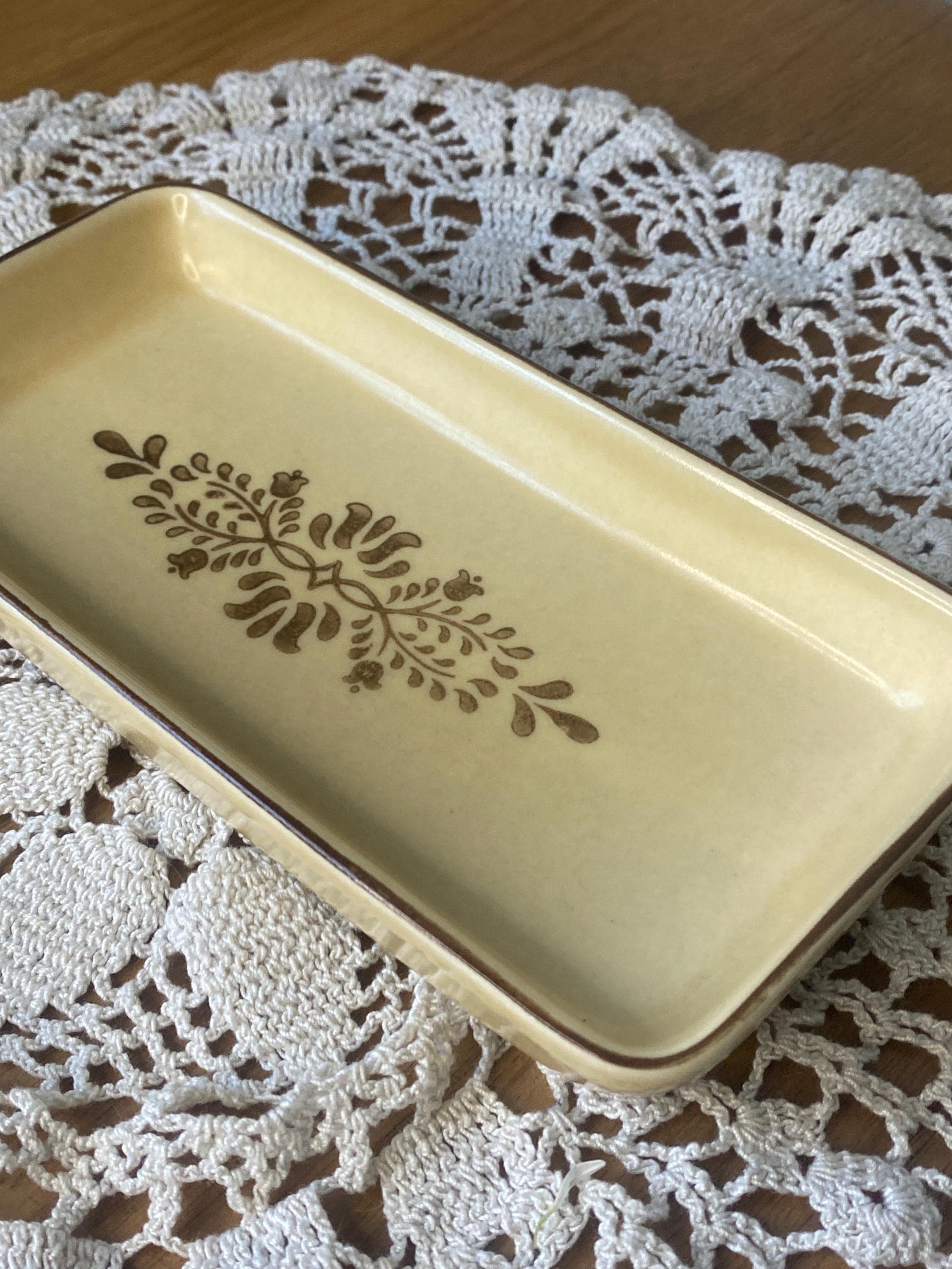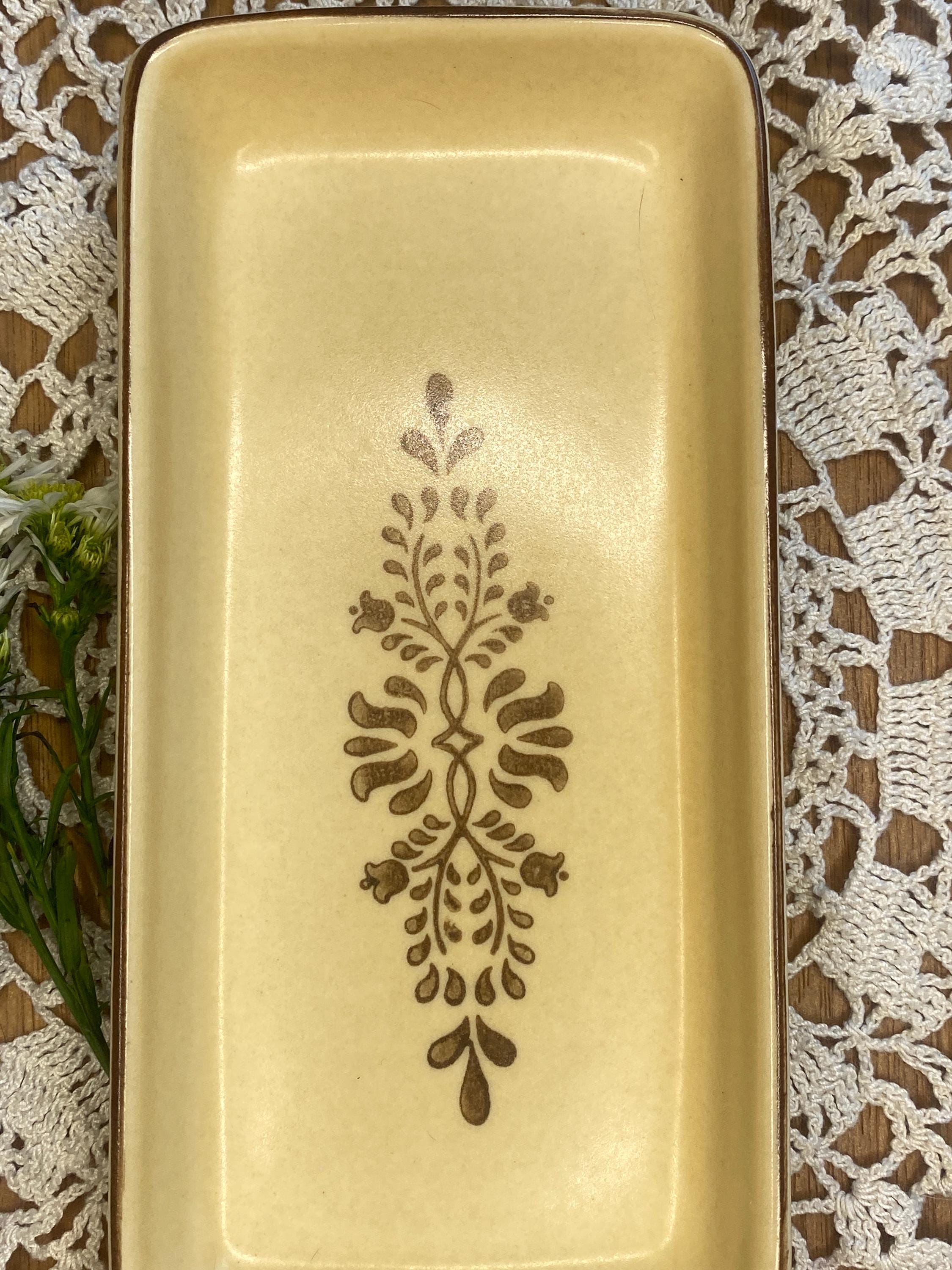 3.5X7.5X1 inches. Perfect size for serving appetizers, butter, or condiments. Good vintage condition, a couple of very small rub marks. All items in my shop are vintage or handmade and may have signs of use, wear, or variation consistent with age or hand production. Please review the photos and video carefully and message me with any questions on condition.